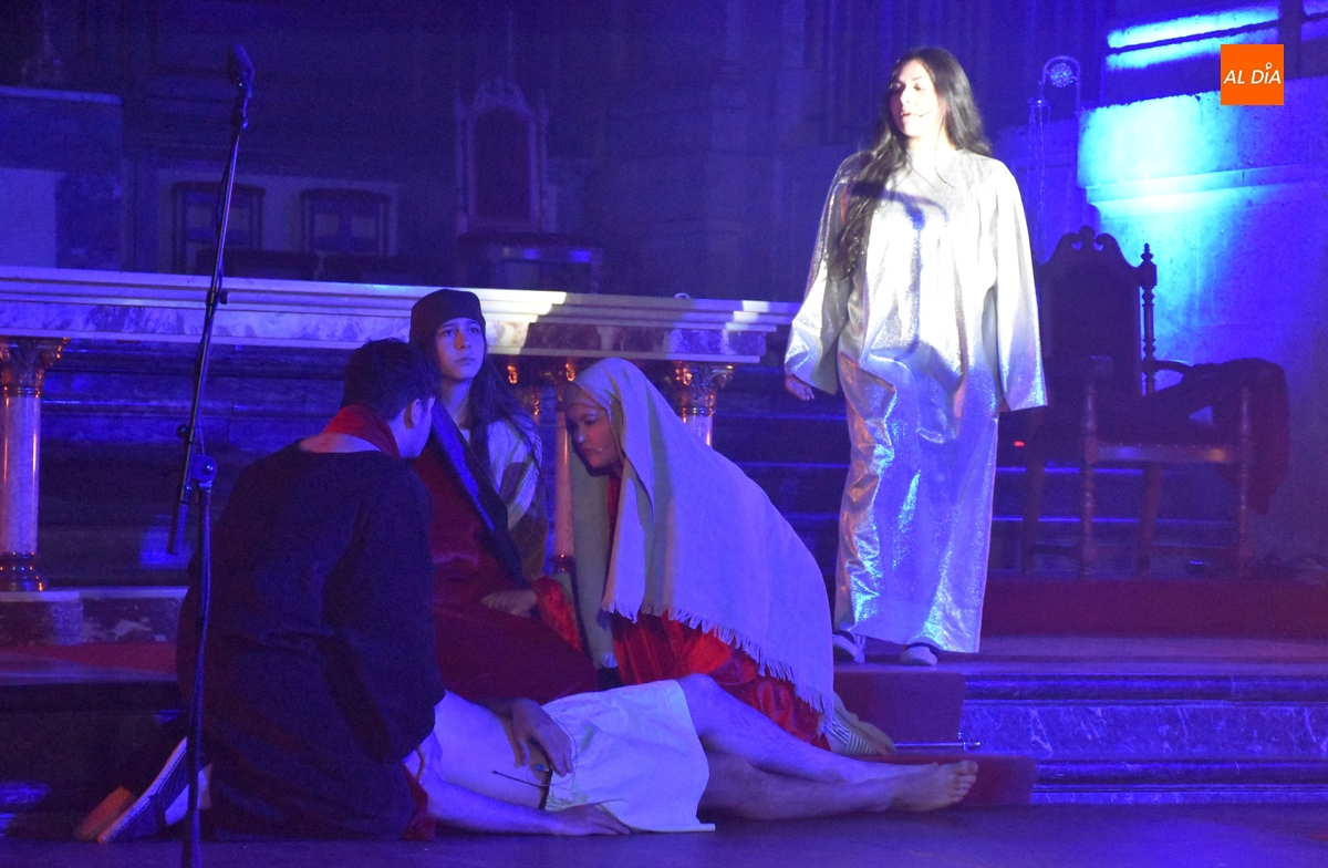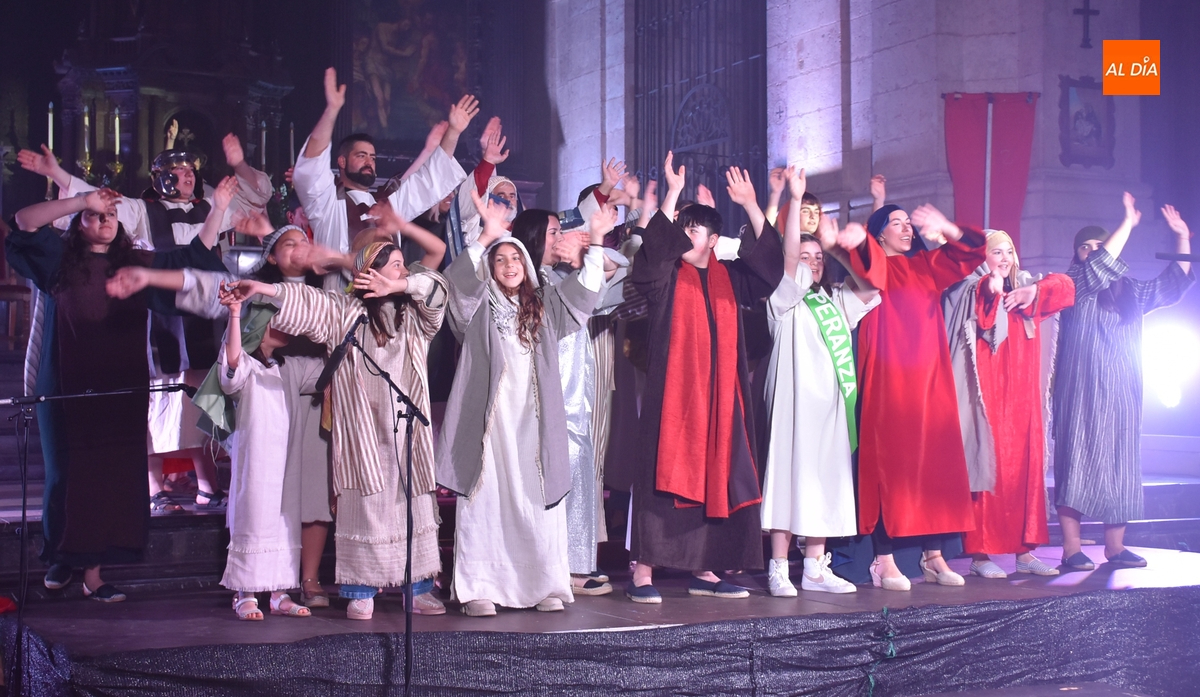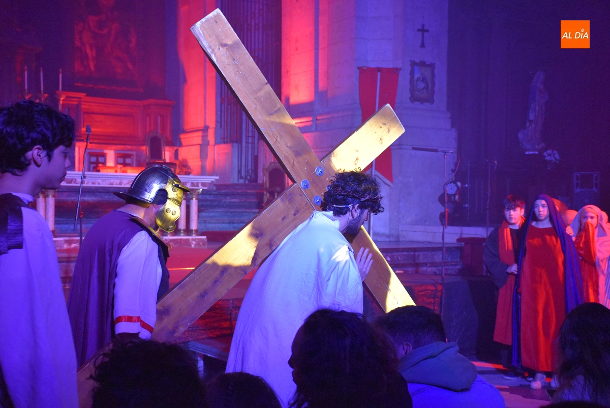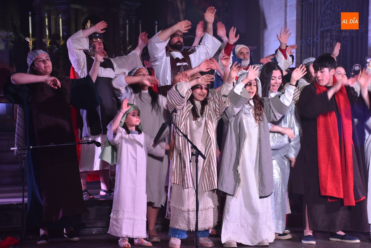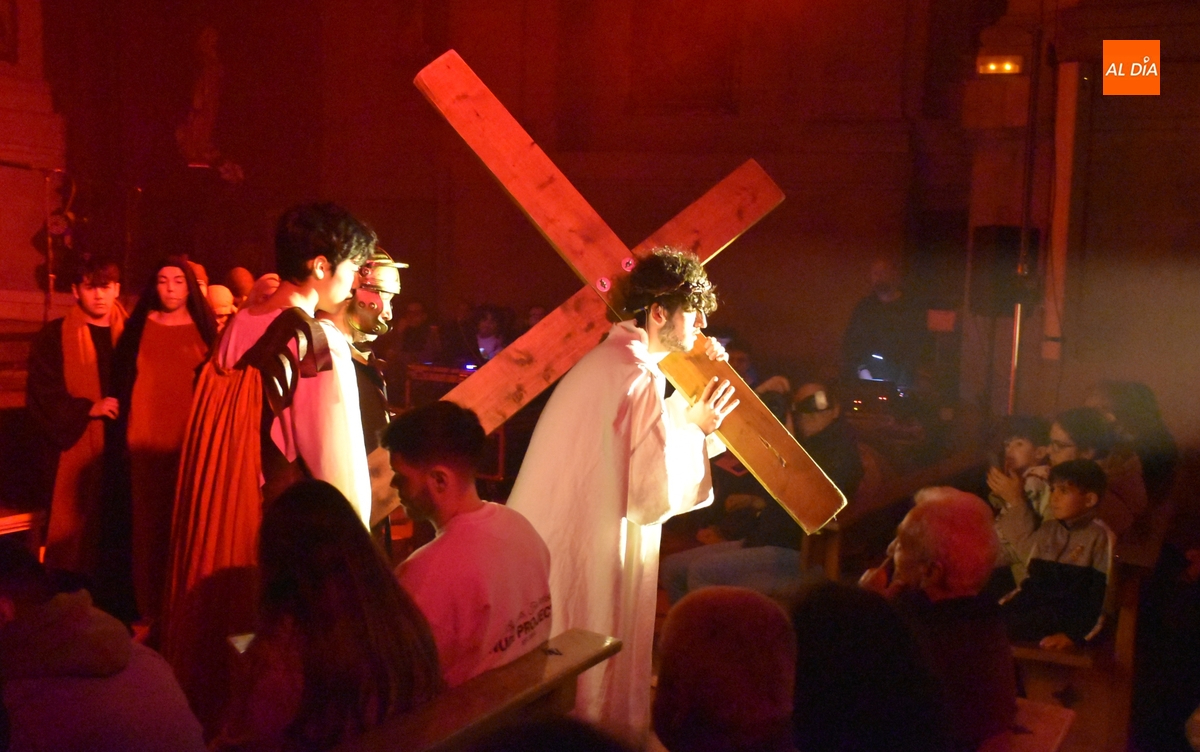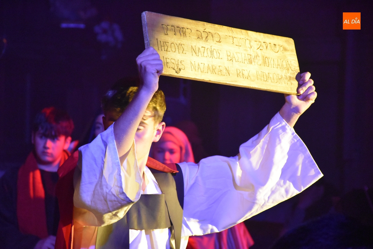 En los instantes finales de la representación también se contó con música en directo, cantando y tocando en el escenario colocado junto a las escaleras del altar de la Iglesia de Cerralbo, por la que se fueron moviendo los actores en las distintas escenas (se utilizaron todos los lugares visibles), con el momento culmen de la crucifixión en el centro de la Iglesia, tras el cual todavía quedó la parte correspondiente a la resurrección.