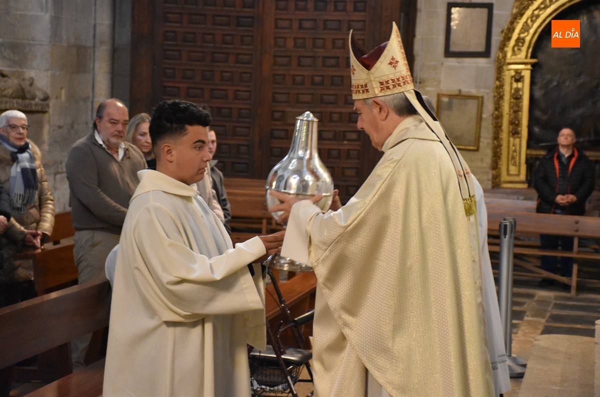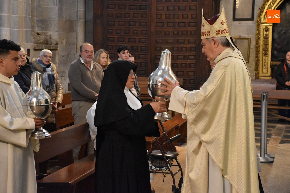 Como es costumbre, los óleos fueron acercados al altar –junto al pan y al vino- por tres personas de tres carismas diferentes para proceder a su bendición o consagración, como fue relatando el presidente del Cabildo Catedralicio, Ángel Martín Carballo. Por un lado, un joven que ejerció como monaguillo durante la Misa acercó el ánfora que contenía el óleo para catecúmenos, que será usado en los bautismos.