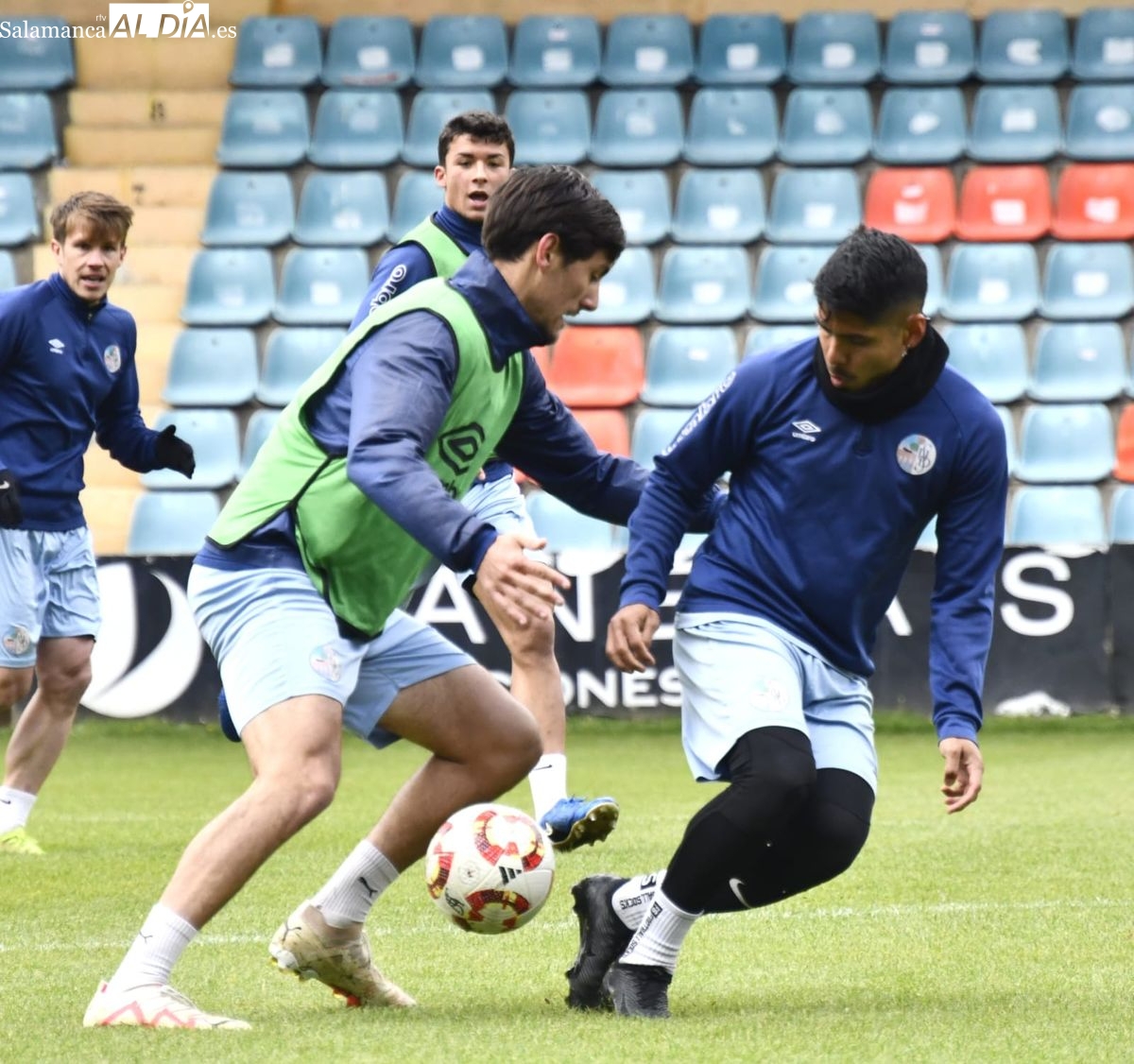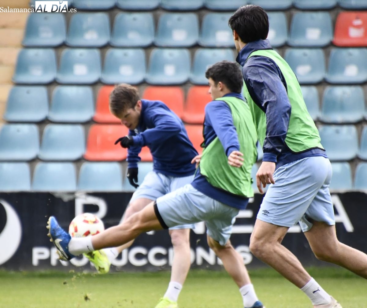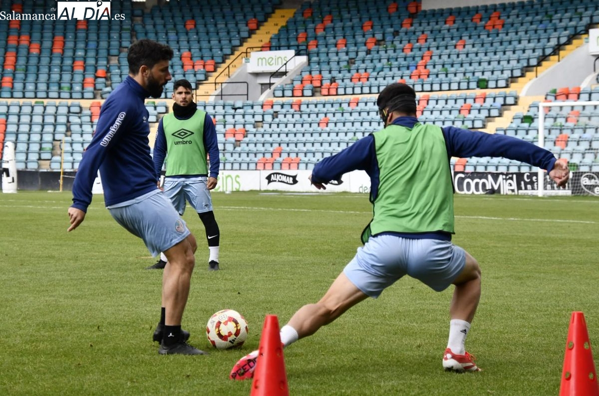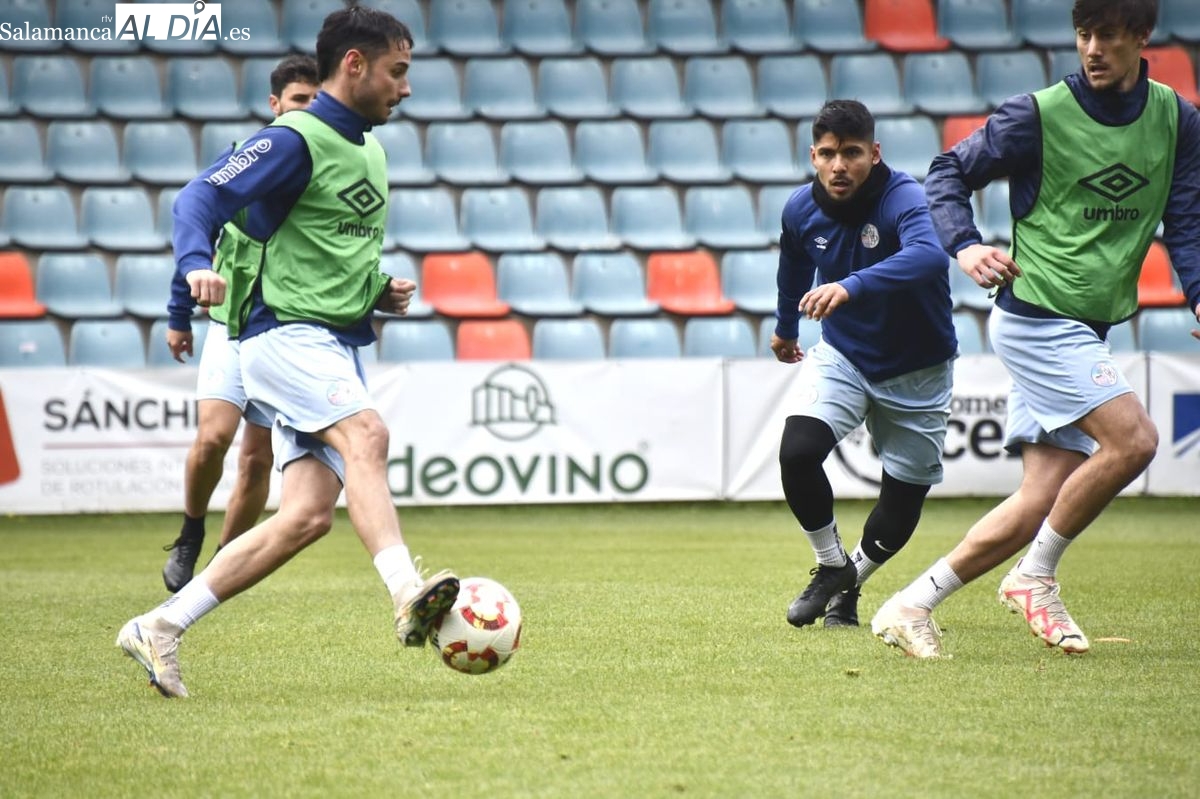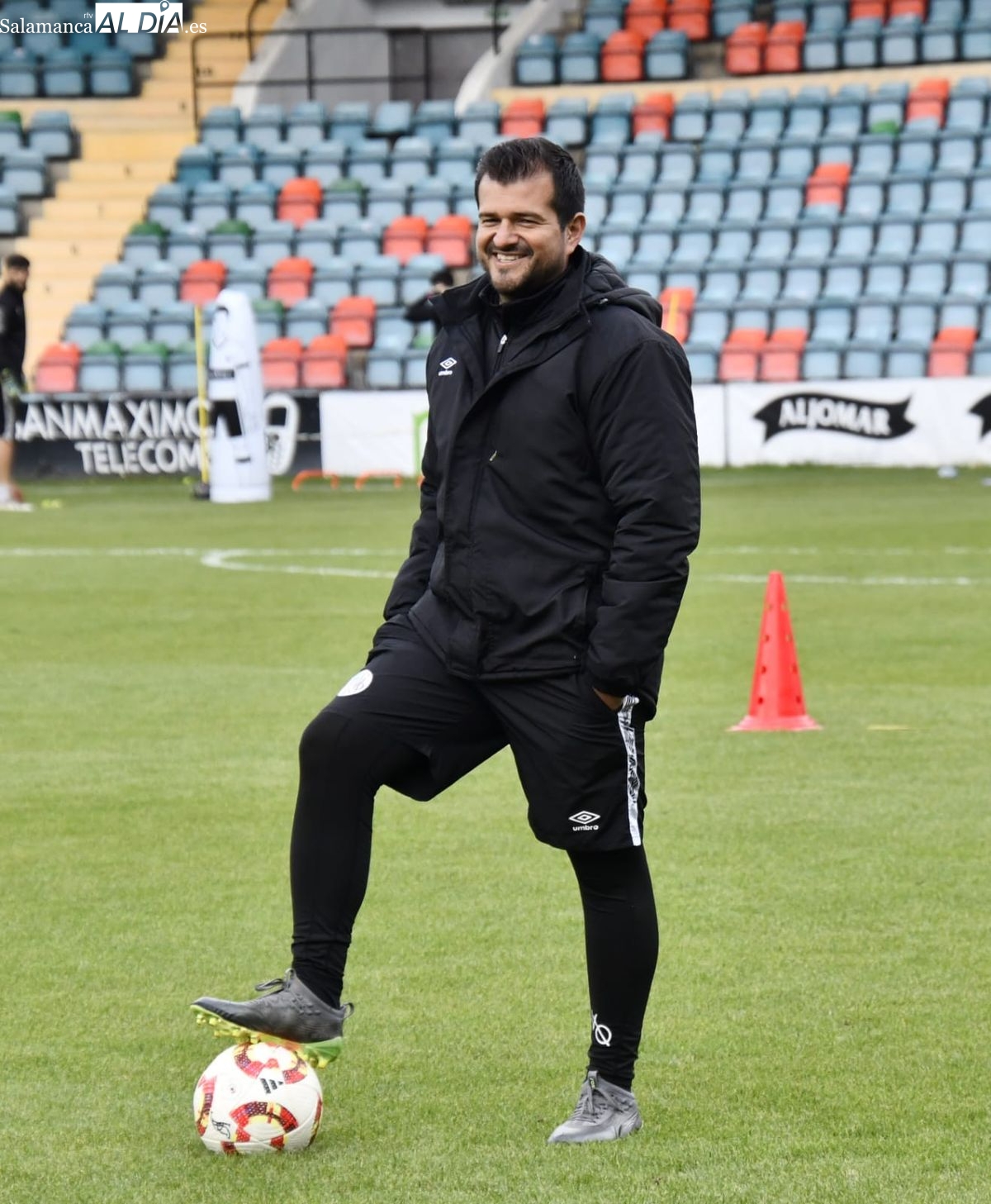 La primera sesión de la semana ha estado marcada por un intenso trabajo con balón. Los jugadores blanquinegros han realizado diversos ejercicios técnicos para posteriormente disputar un partidillo en medio campo que ha servido para ensayar movimientos tácticos. Jorge García, técnico del conjunto charro, se ha mostrado especialmente activo durante toda la sesión, transmitiendo constantemente esa intensidad a sus pupilos de cara al trascendental duelo del fin de semana.