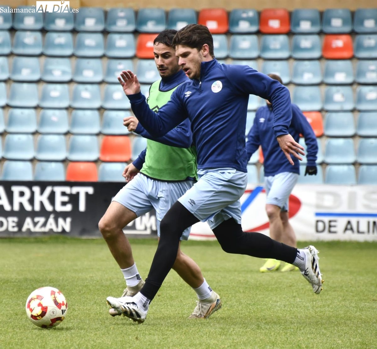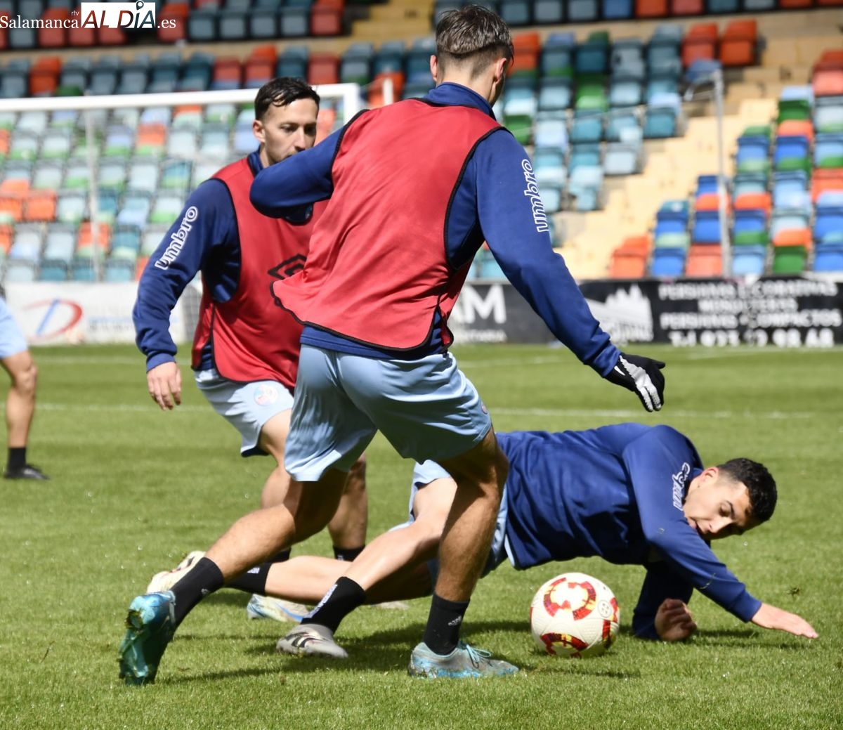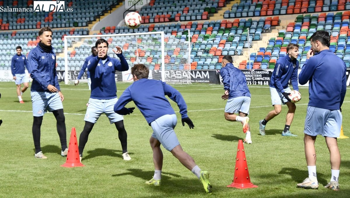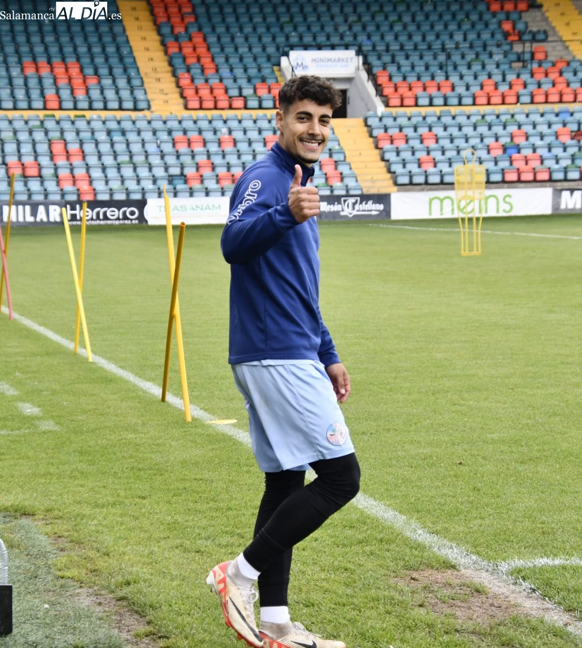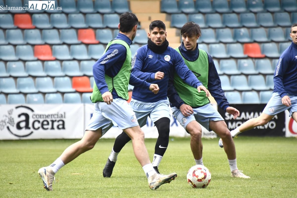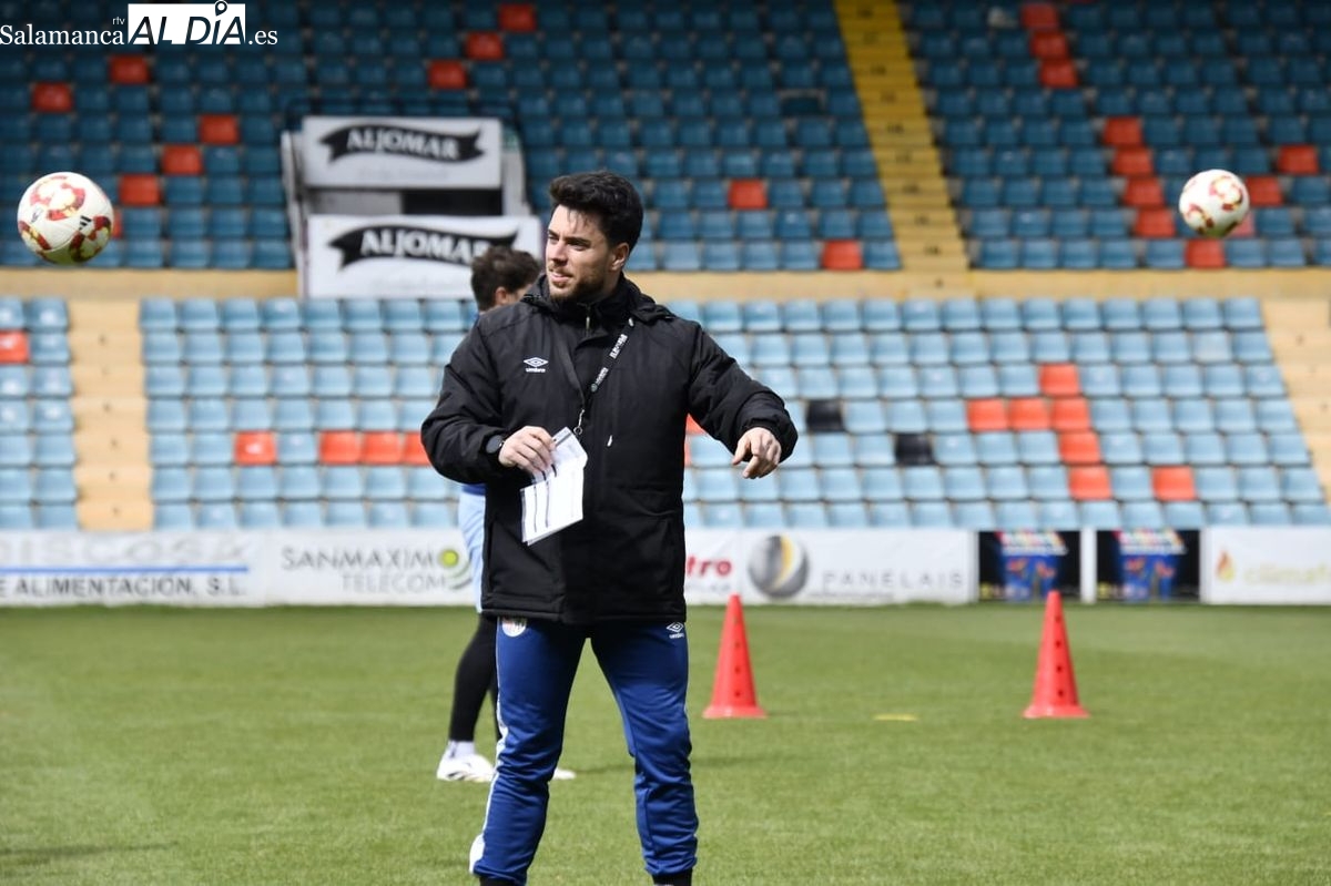 La primera sesión de la semana ha estado marcada por un intenso trabajo con balón. Los jugadores blanquinegros han realizado diversos ejercicios técnicos para posteriormente disputar un partidillo en medio campo que ha servido para ensayar movimientos tácticos. Jorge García, técnico del conjunto charro, se ha mostrado especialmente activo durante toda la sesión, transmitiendo constantemente esa intensidad a sus pupilos de cara al trascendental duelo del fin de semana.