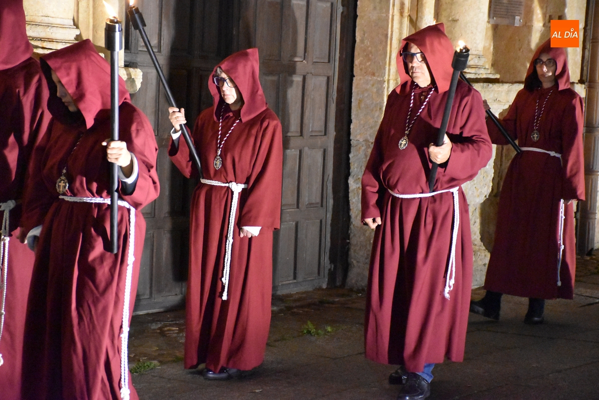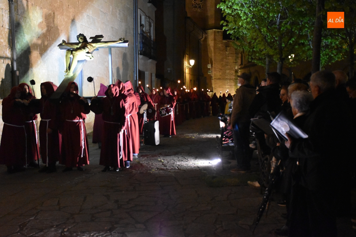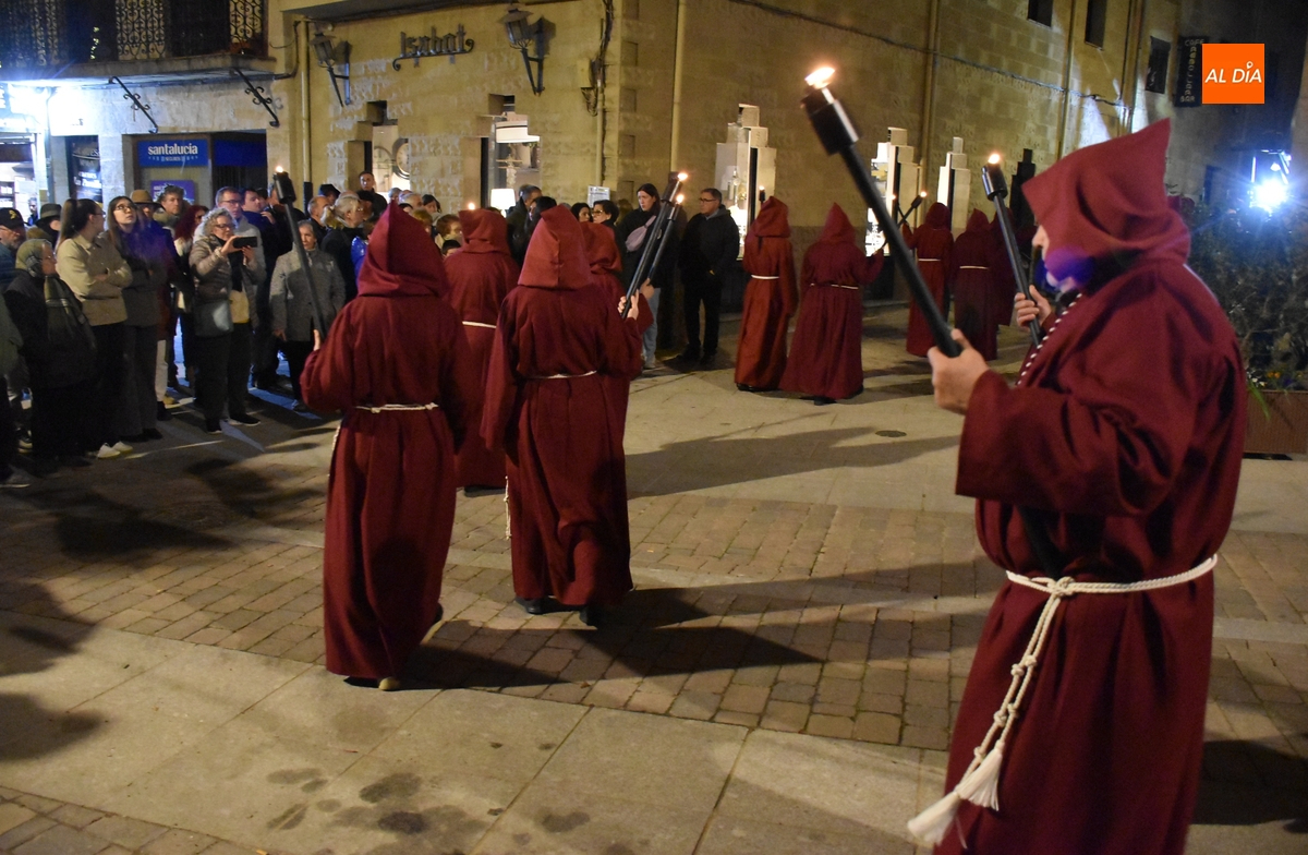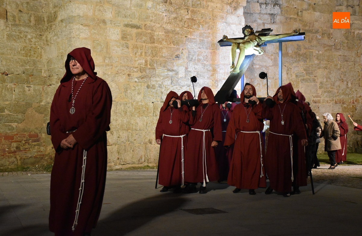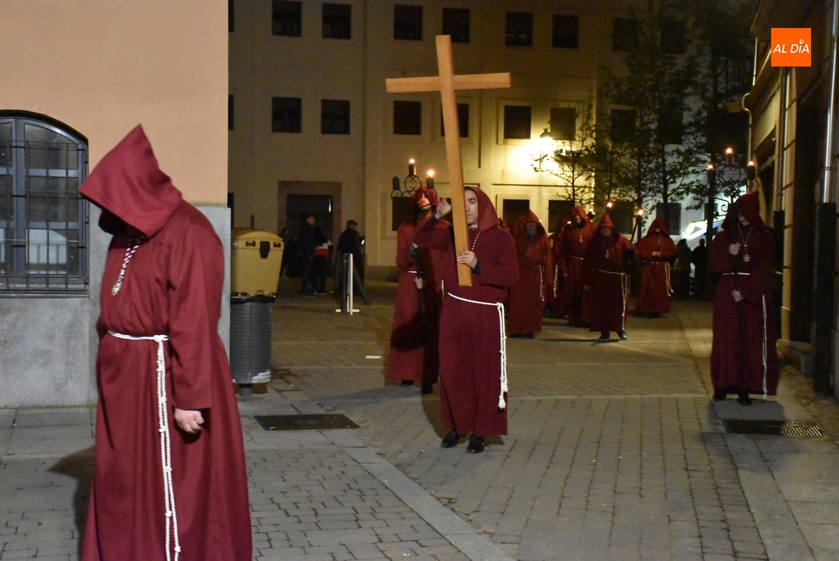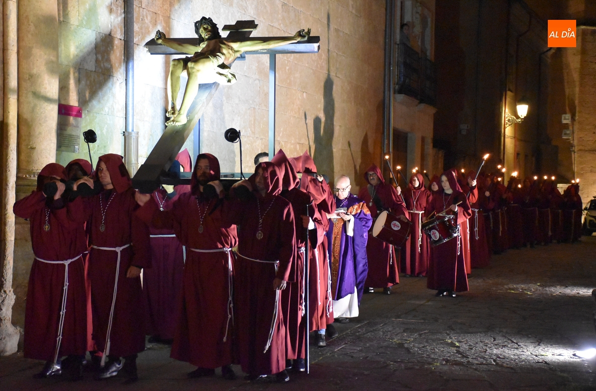 Los integrantes del Coro procesionaron tras la imagen del Cristo de la Buena Muerte, que fue en el ecuador de los cofrades, que desfilaron de dos en dos luciendo una túnica de color granate con capucha y portando cirios. La comitiva, que contó con el sonido de tres tambores de la Banda de la propia Cofradía, fue abierta por el muñidor, seguido por la Cruz de Guía de madera y dos faroles de forja.
