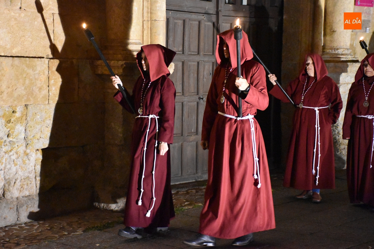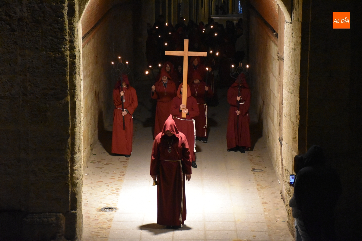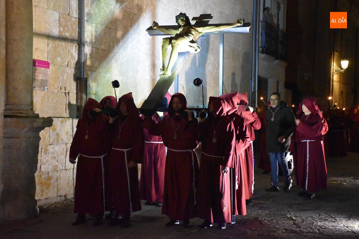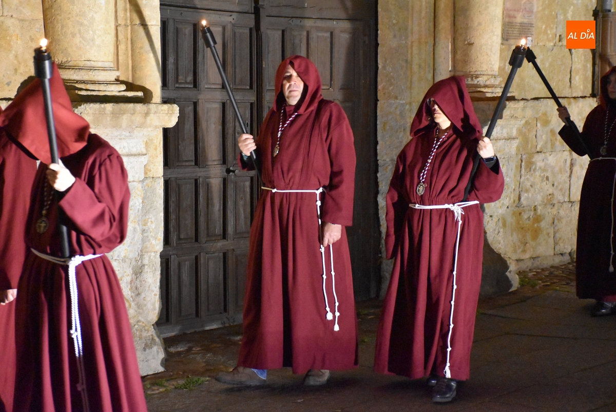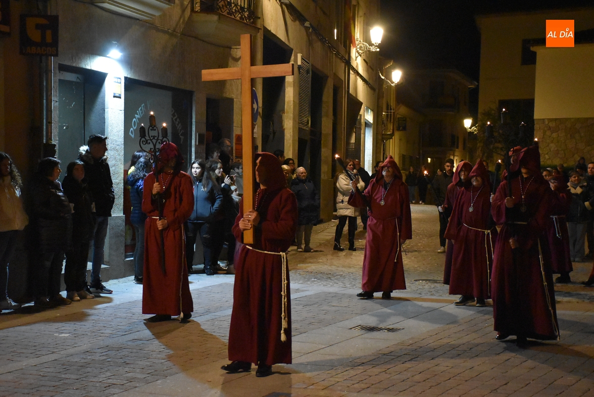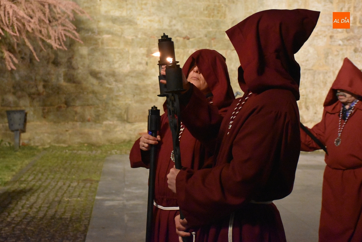 Los integrantes del Coro procesionaron tras la imagen del Cristo de la Buena Muerte, que fue en el ecuador de los cofrades, que desfilaron de dos en dos luciendo una túnica de color granate con capucha y portando cirios. La comitiva, que contó con el sonido de tres tambores de la Banda de la propia Cofradía, fue abierta por el muñidor, seguido por la Cruz de Guía de madera y dos faroles de forja.