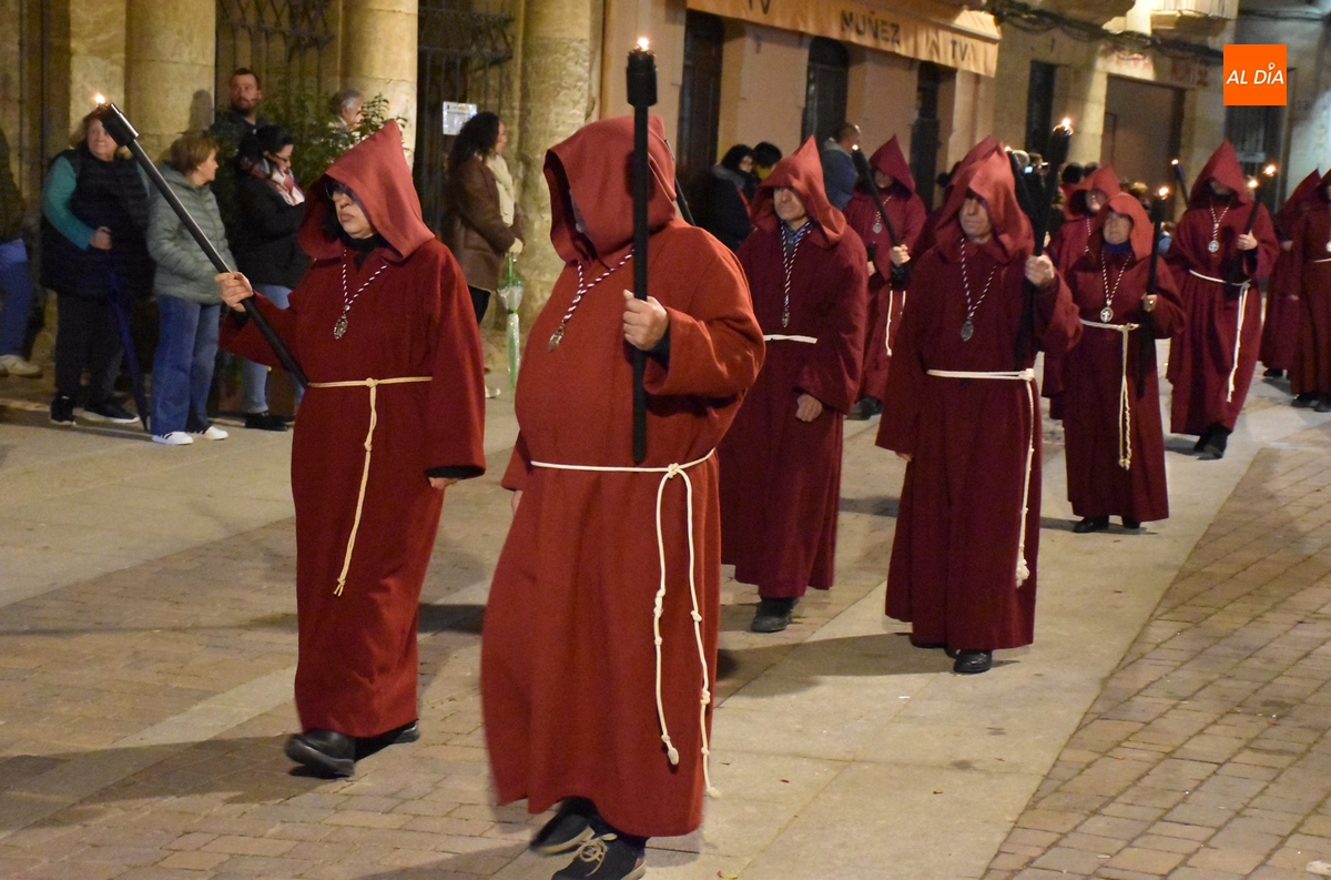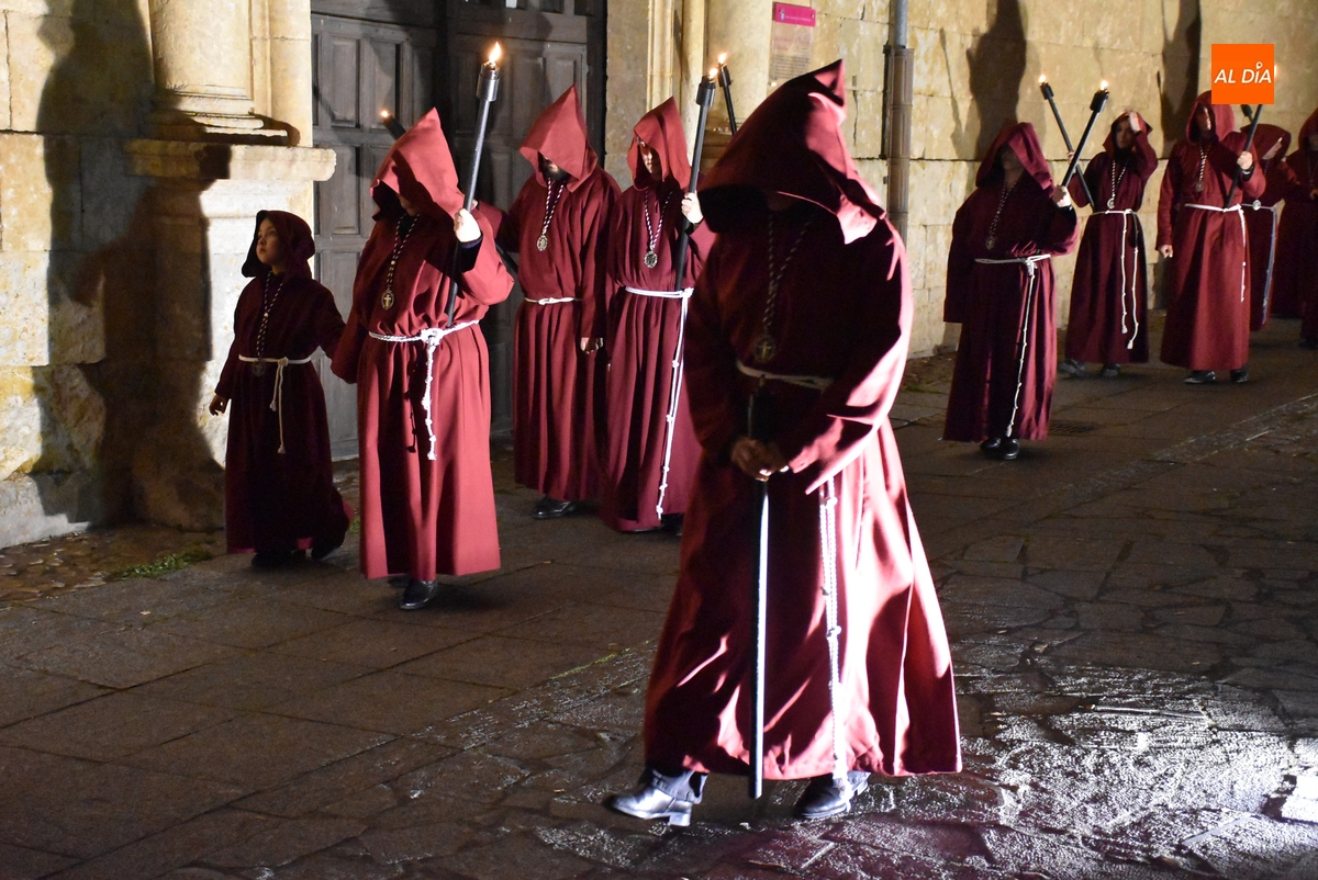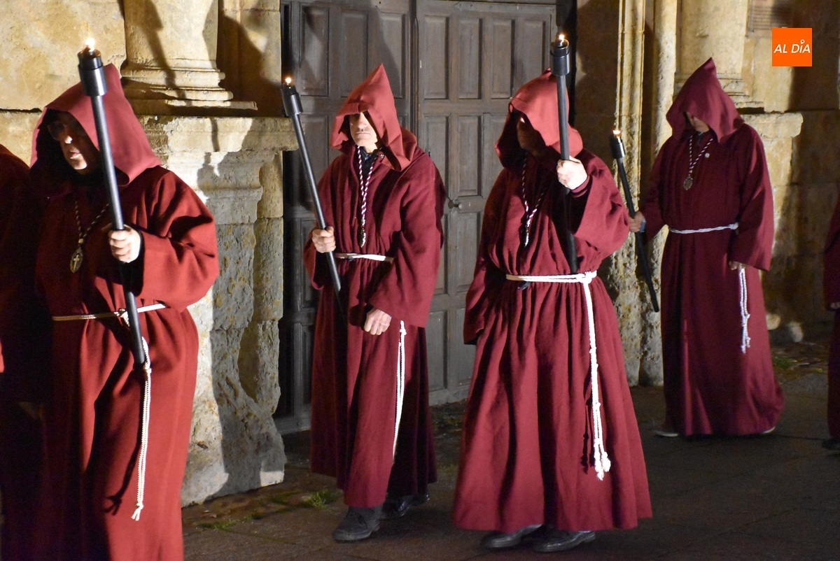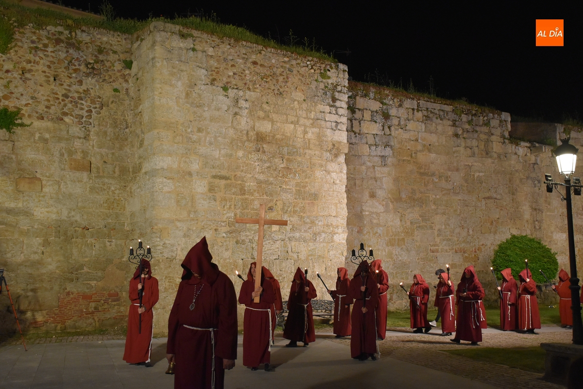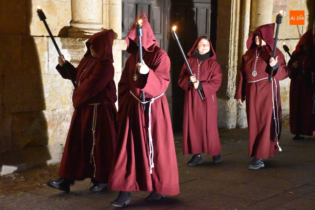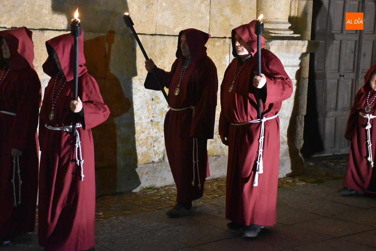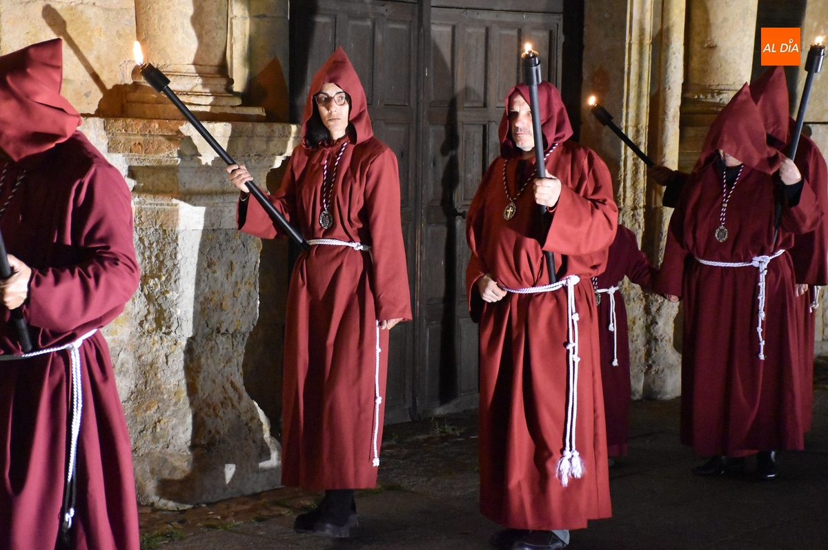 Los integrantes del Coro procesionaron tras la imagen del Cristo de la Buena Muerte, que fue en el ecuador de los cofrades, que desfilaron de dos en dos luciendo una túnica de color granate con capucha y portando cirios. La comitiva, que contó con el sonido de tres tambores de la Banda de la propia Cofradía, fue abierta por el muñidor, seguido por la Cruz de Guía de madera y dos faroles de forja.