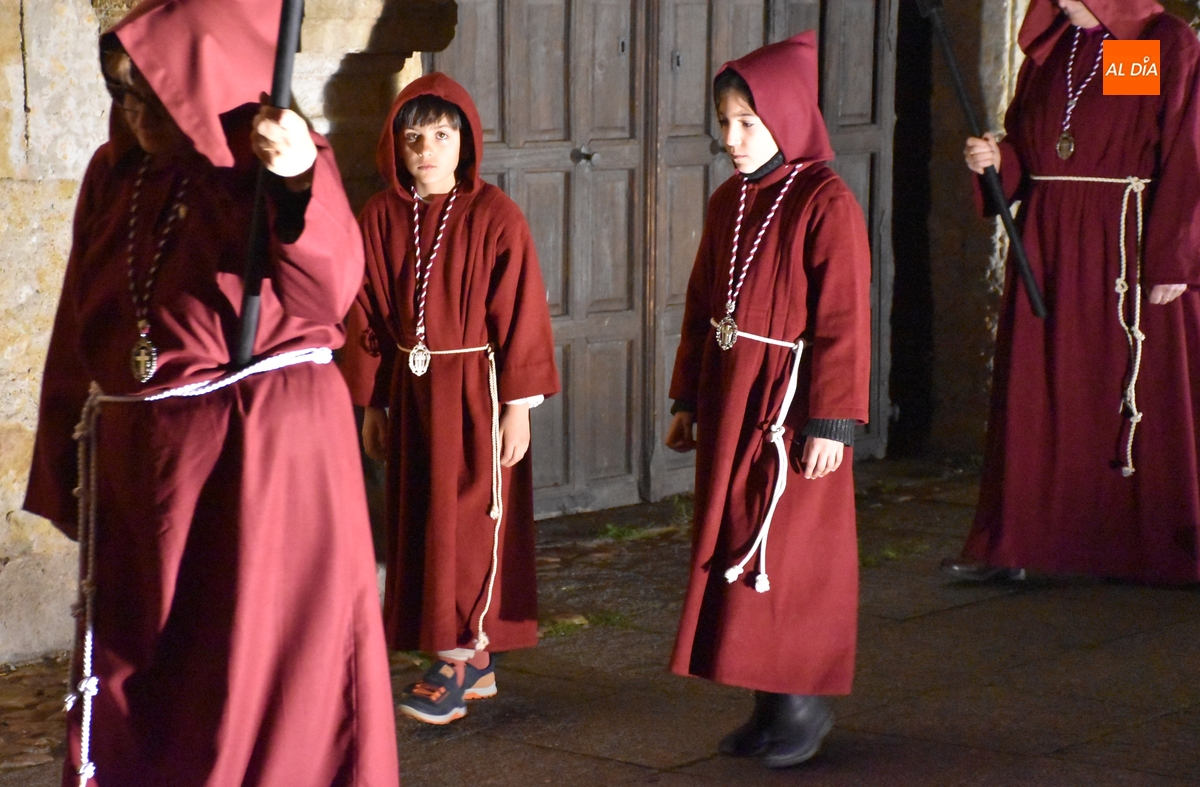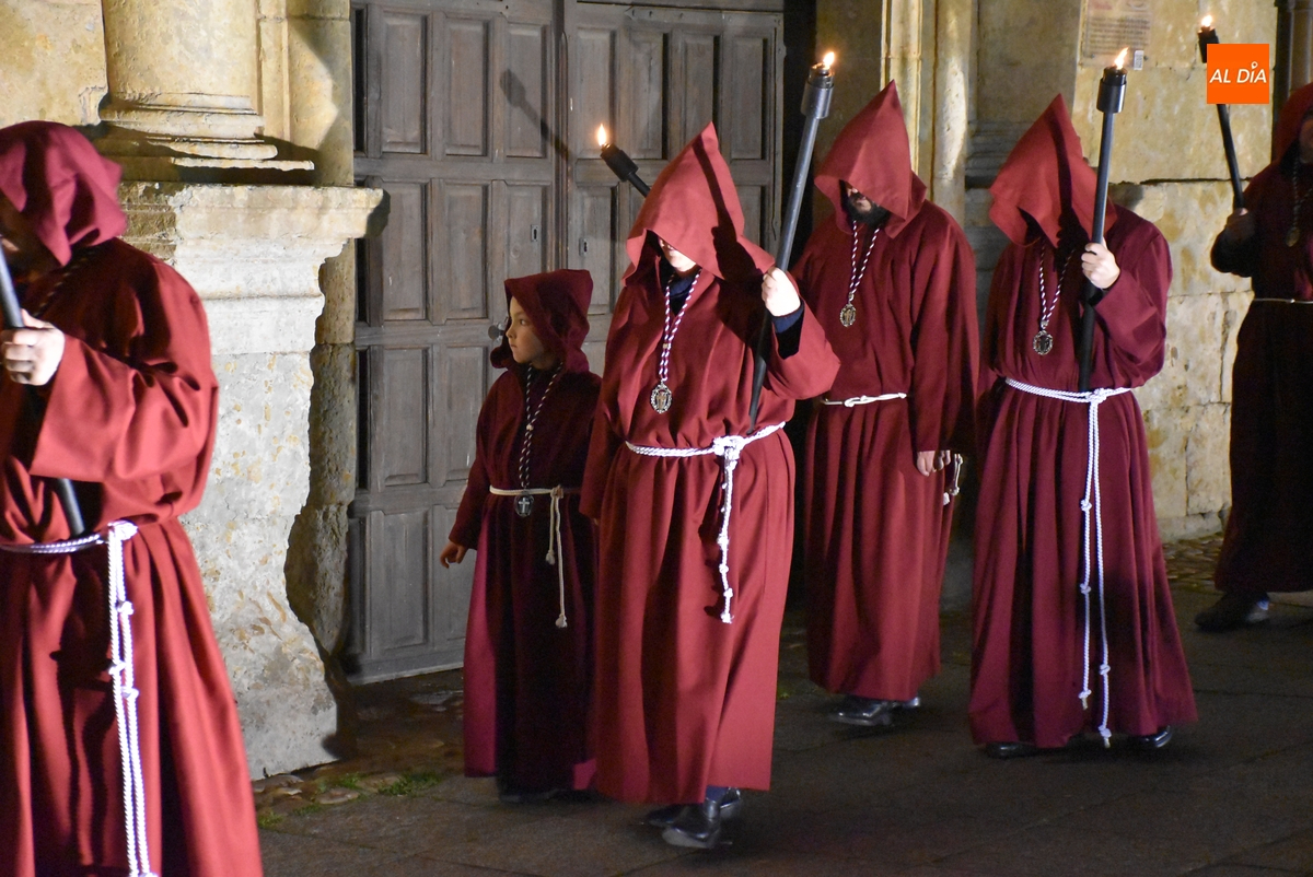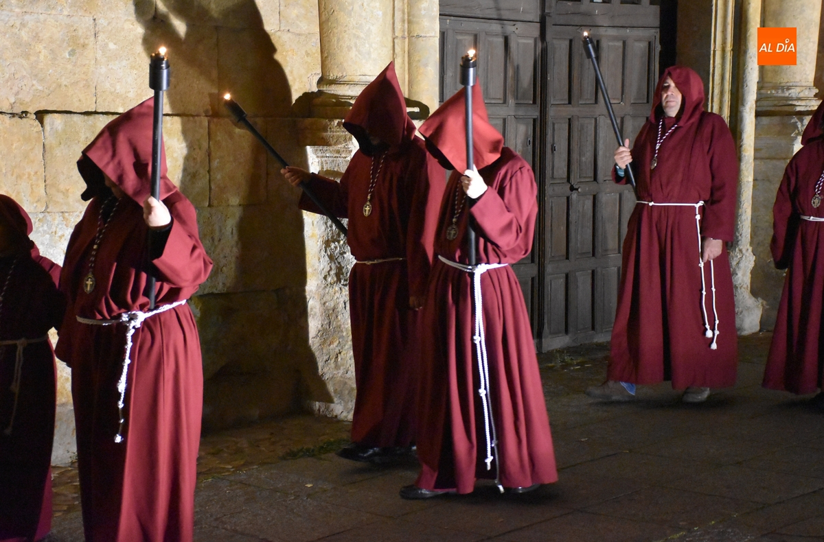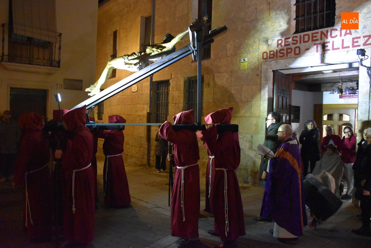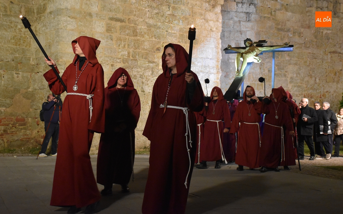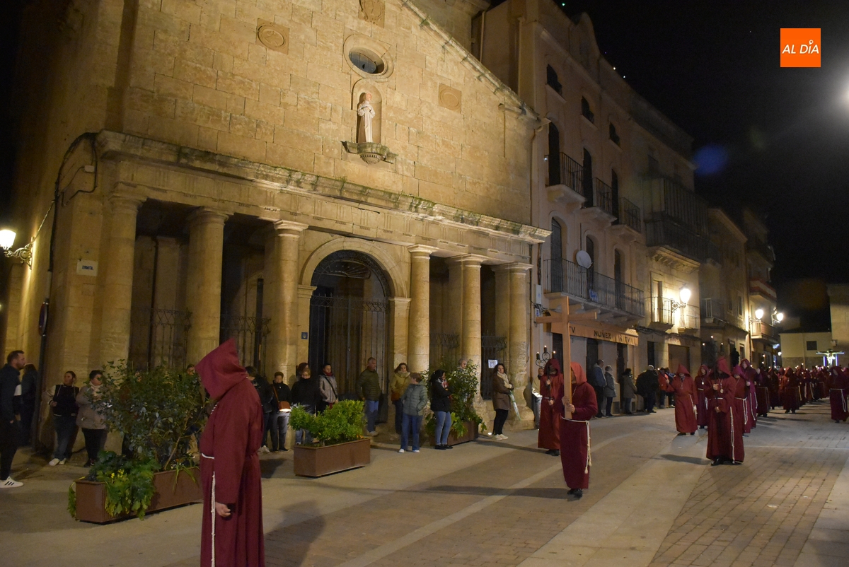 Los integrantes del Coro procesionaron tras la imagen del Cristo de la Buena Muerte, que fue en el ecuador de los cofrades, que desfilaron de dos en dos luciendo una túnica de color granate con capucha y portando cirios. La comitiva, que contó con el sonido de tres tambores de la Banda de la propia Cofradía, fue abierta por el muñidor, seguido por la Cruz de Guía de madera y dos faroles de forja.