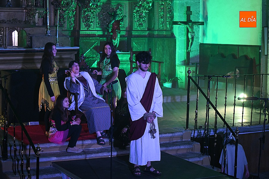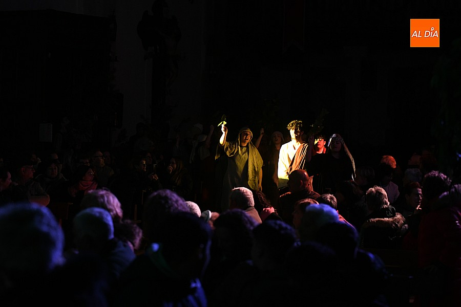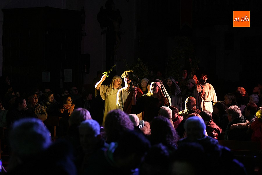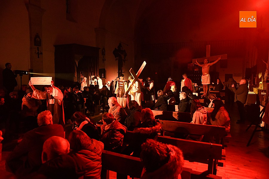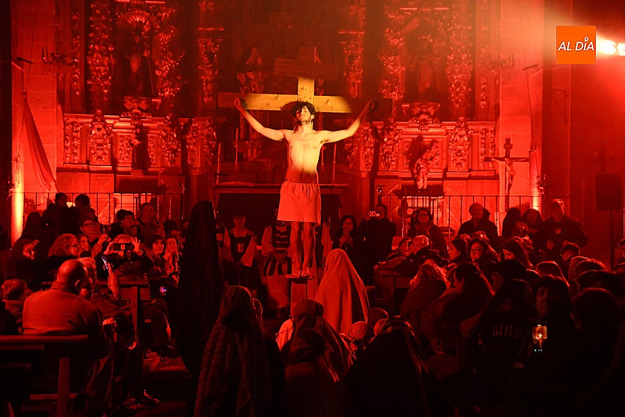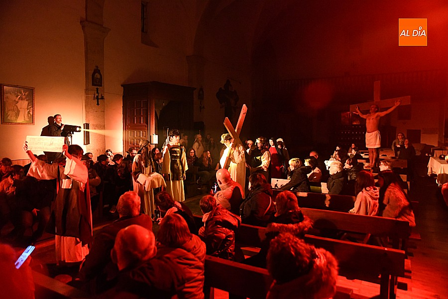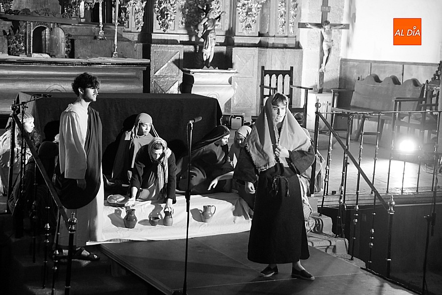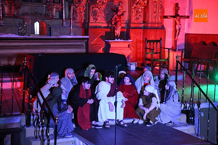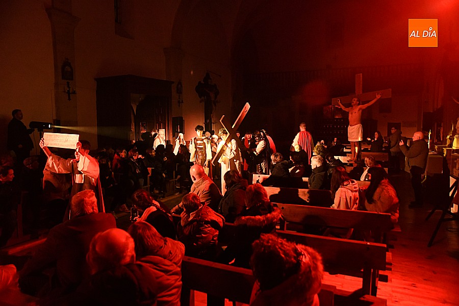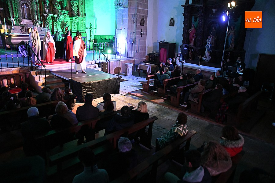 La iglesia parroquial de San Lorenzo se convirtió en un escenario excepcional y a la vez en refugio frente al frío para acoger la penúltima representación del grupo teatral El Manantial en esta Semana Santa 2025.