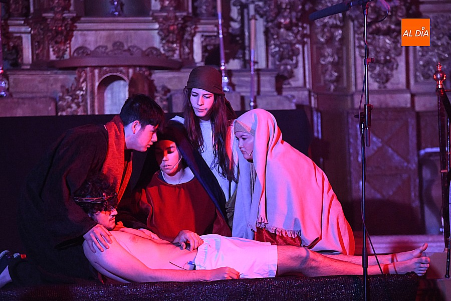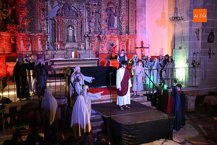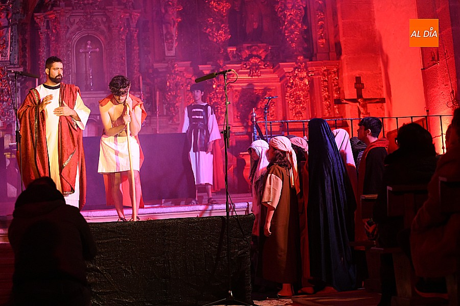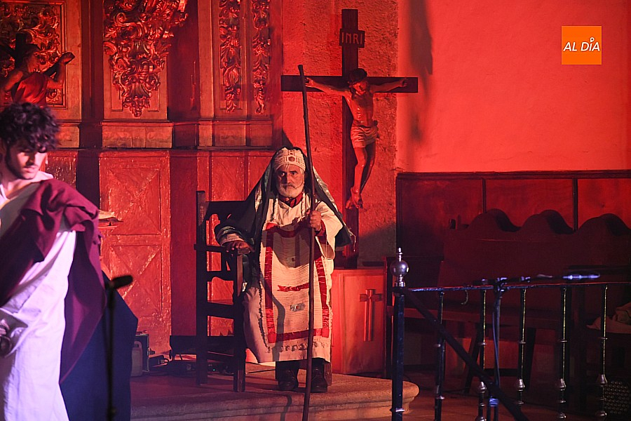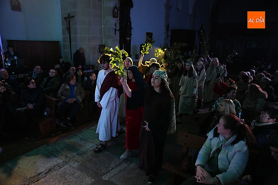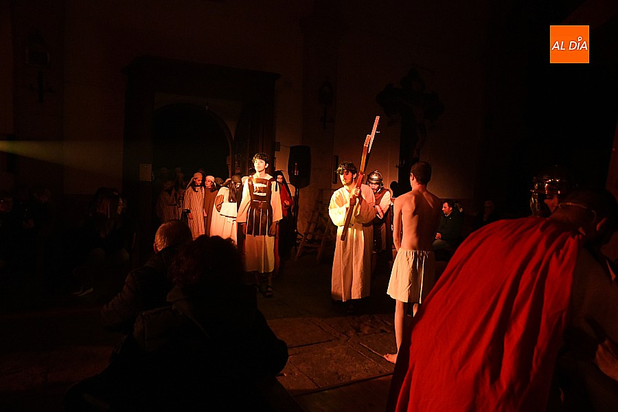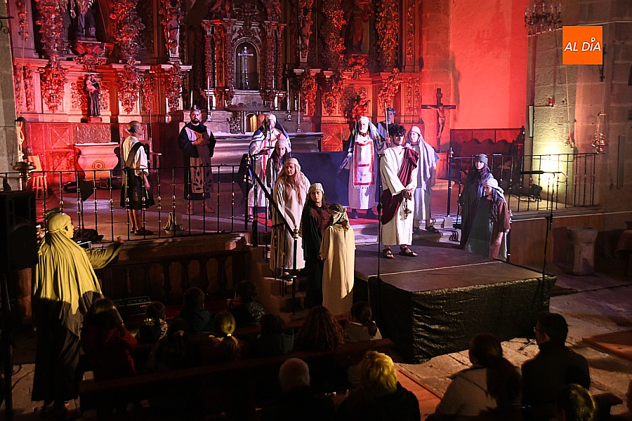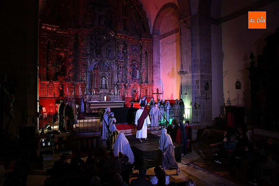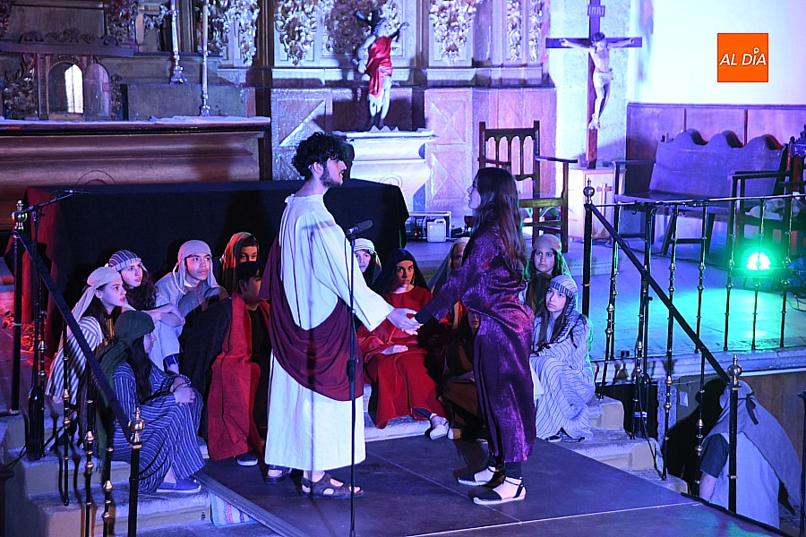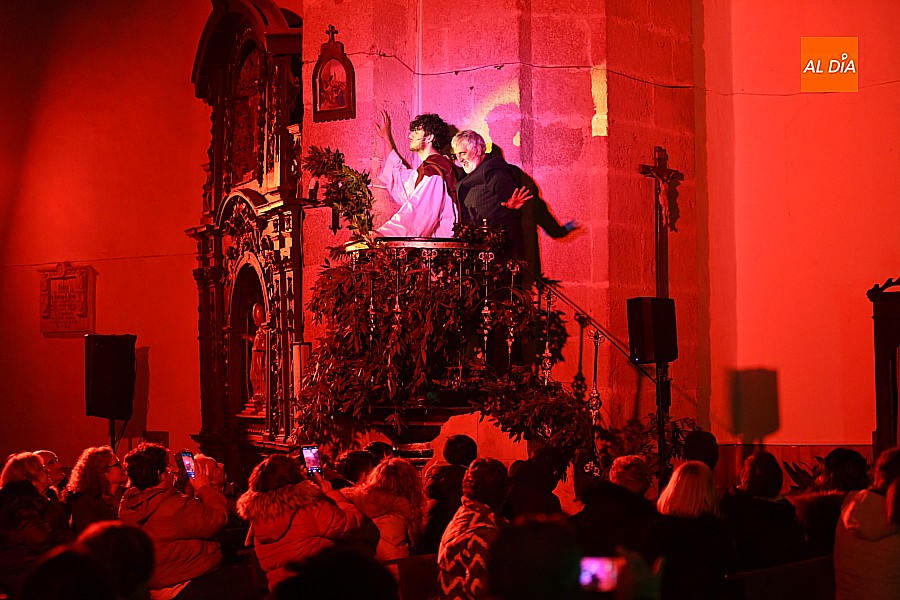 La iglesia parroquial de San Lorenzo se convirtió en un escenario excepcional y a la vez en refugio frente al frío para acoger la penúltima representación del grupo teatral El Manantial en esta Semana Santa 2025.