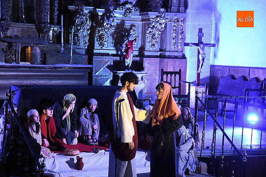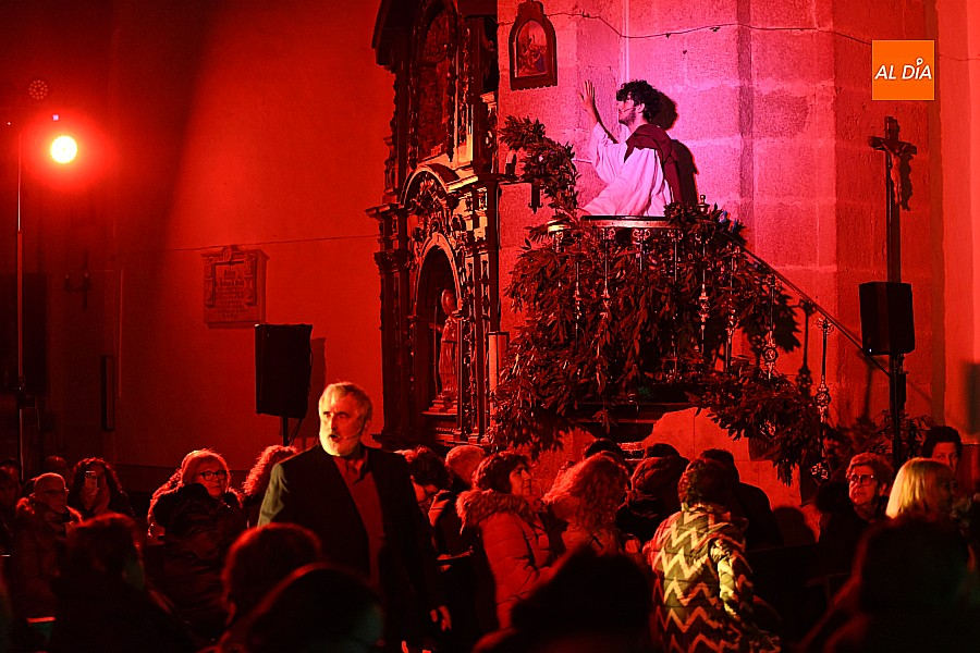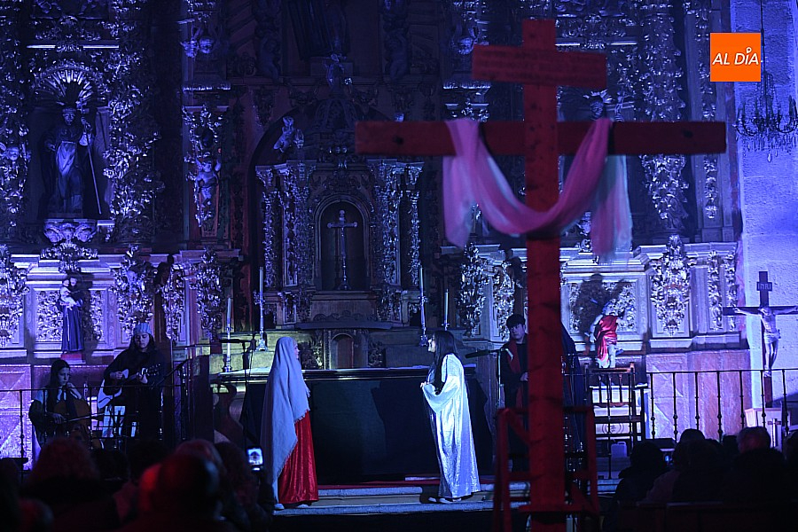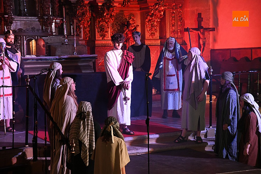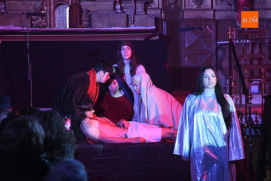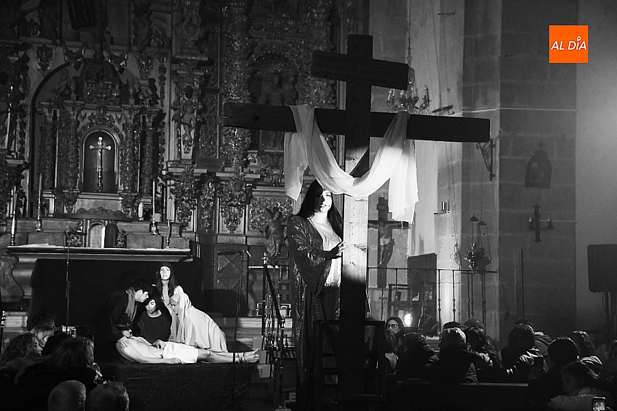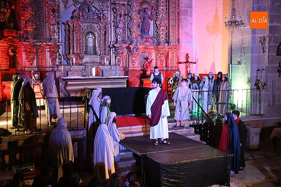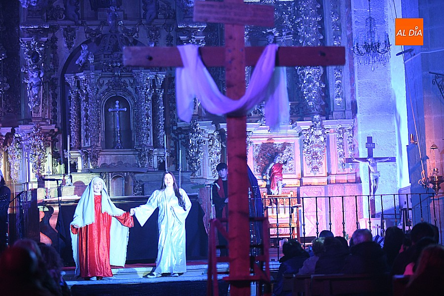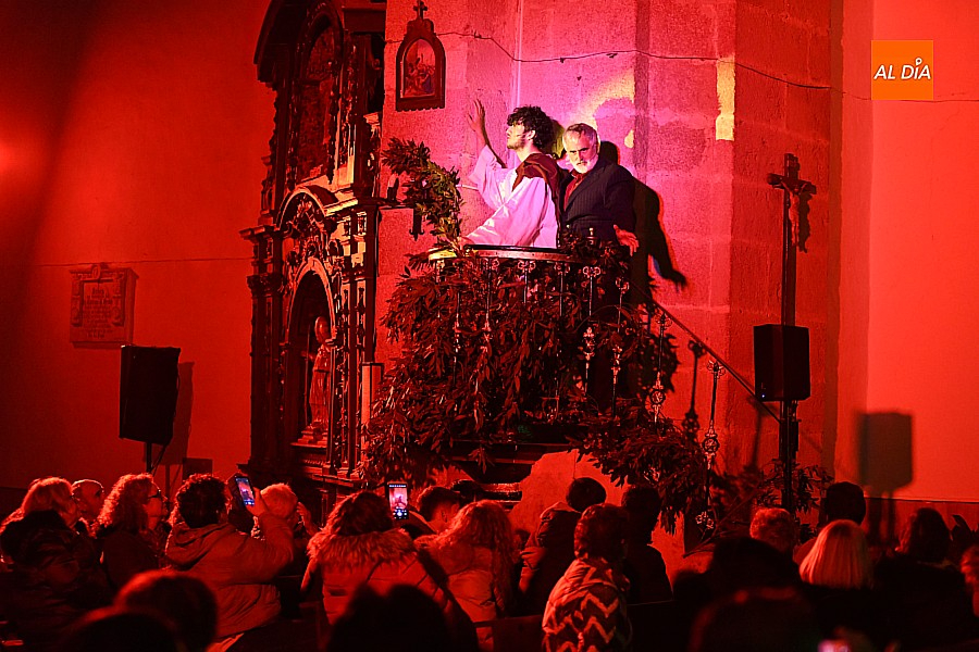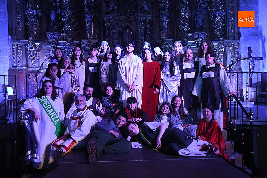 La iglesia parroquial de San Lorenzo se convirtió en un escenario excepcional y a la vez en refugio frente al frío para acoger la penúltima representación del grupo teatral El Manantial en esta Semana Santa 2025.