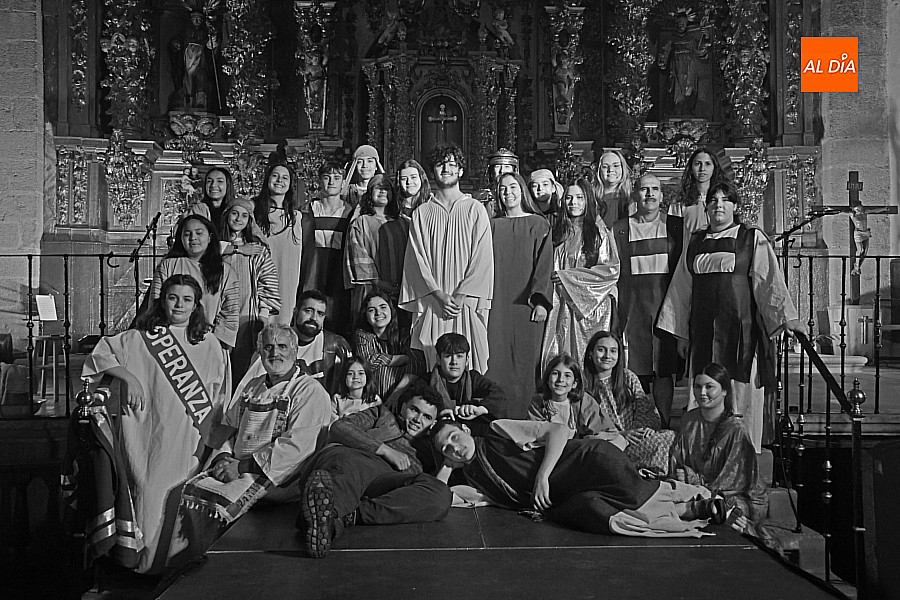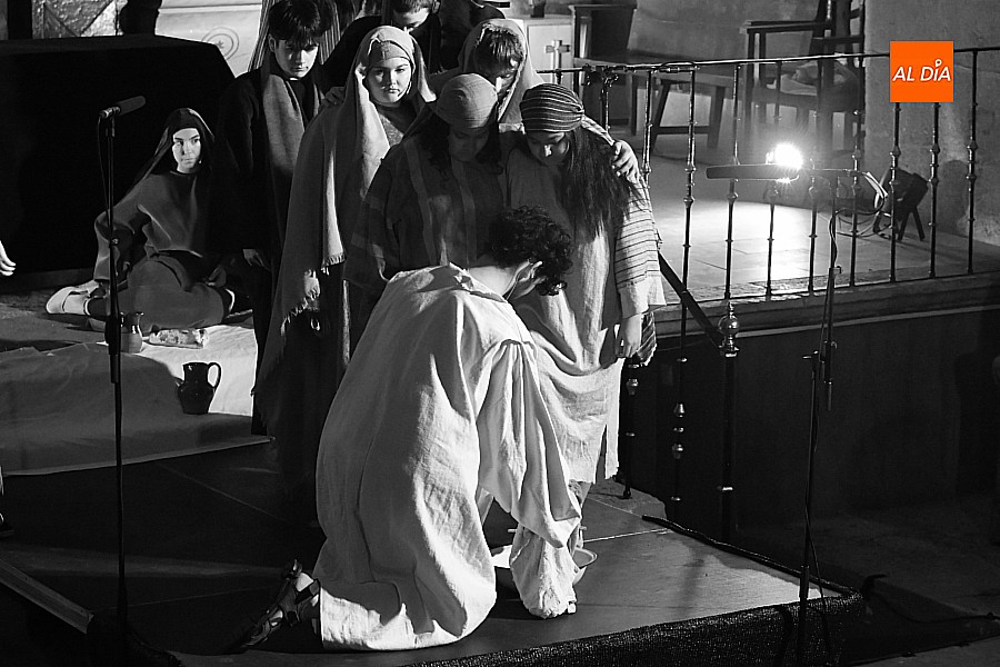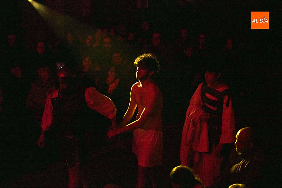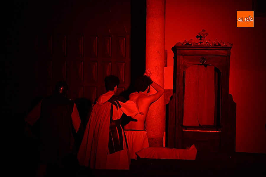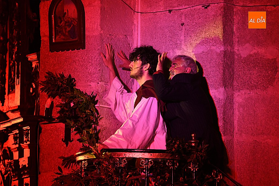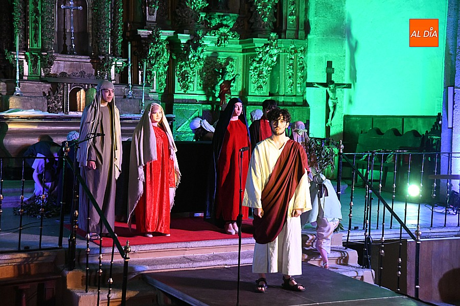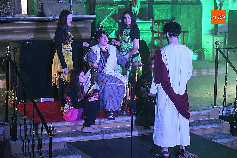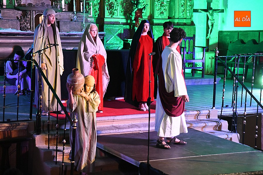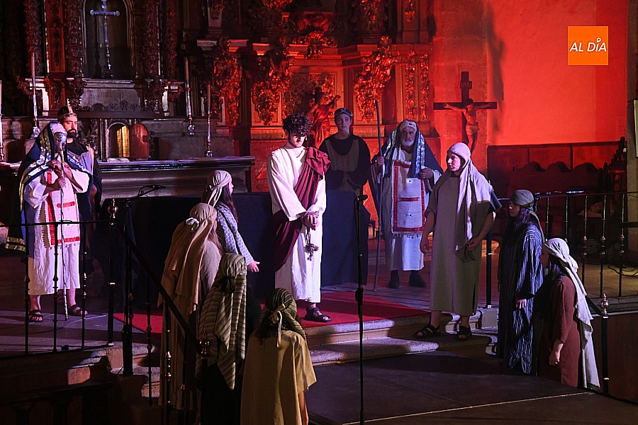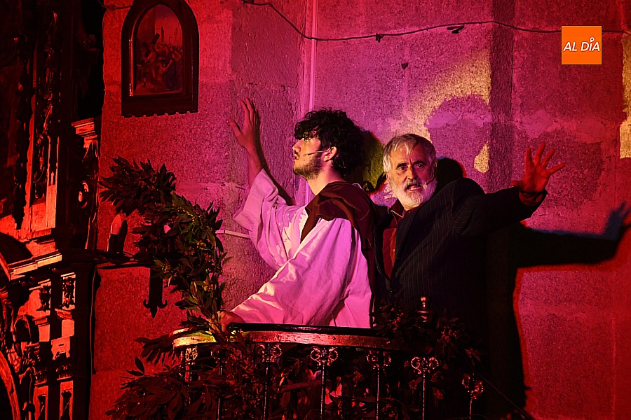 La iglesia parroquial de San Lorenzo se convirtió en un escenario excepcional y a la vez en refugio frente al frío para acoger la penúltima representación del grupo teatral El Manantial en esta Semana Santa 2025.