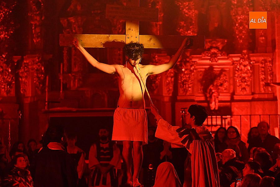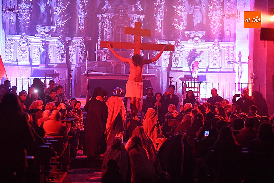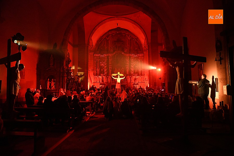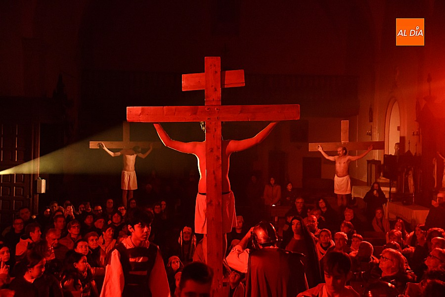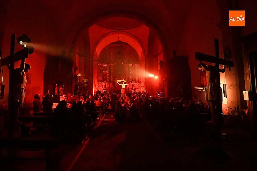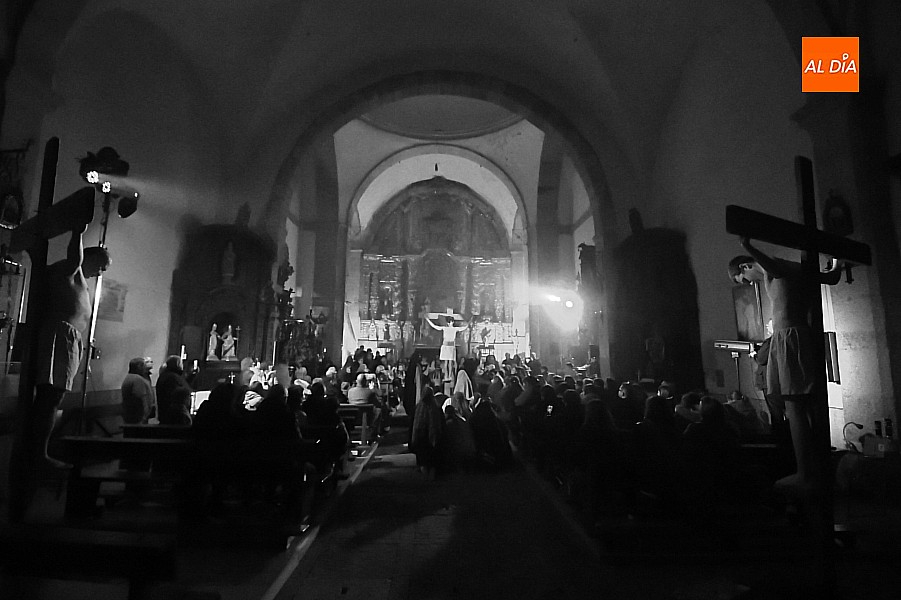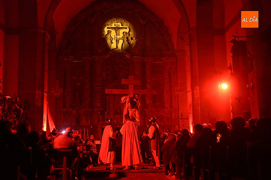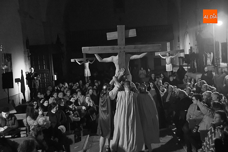 Después de recorrer distintos municipios de la diócesis, el grupo se acerca al final de su recorrido este Martes Santo en la localidad de El Bodón. La representación tuvo lugar en el interior del templo parroquial, una acertada decisión por parte de la organización, no solo por los 6ºgrados que marcaban los termómetros al inicio, sino también por los 4,5ºC que acompañaron el momento más sobrecogedor de la obra: la Crucifixión.