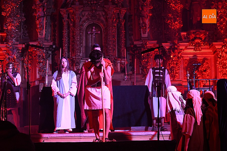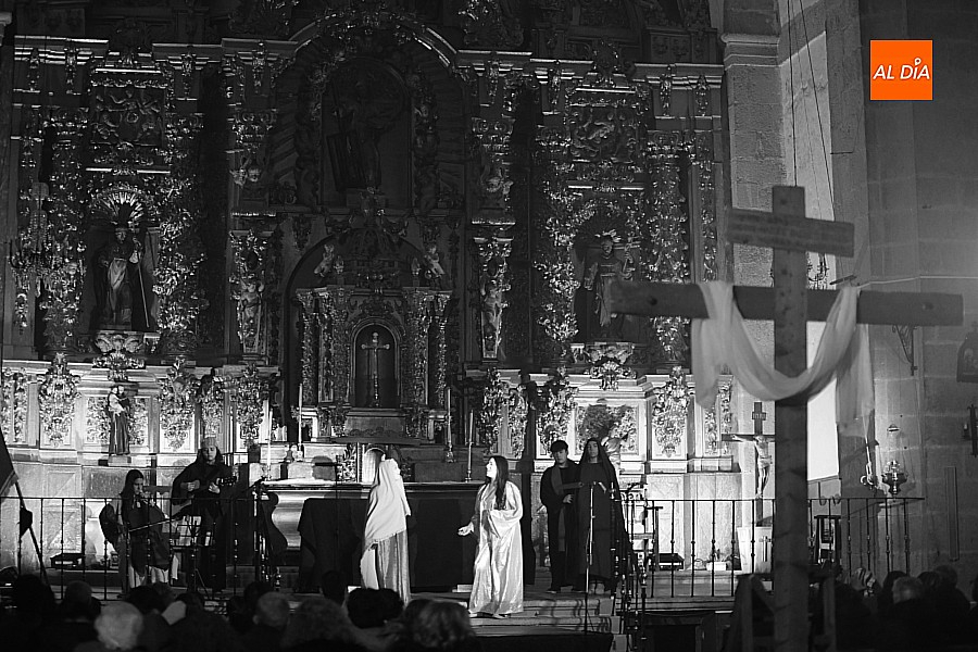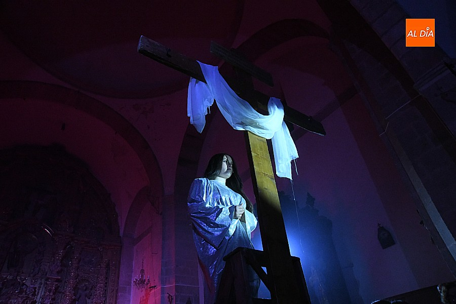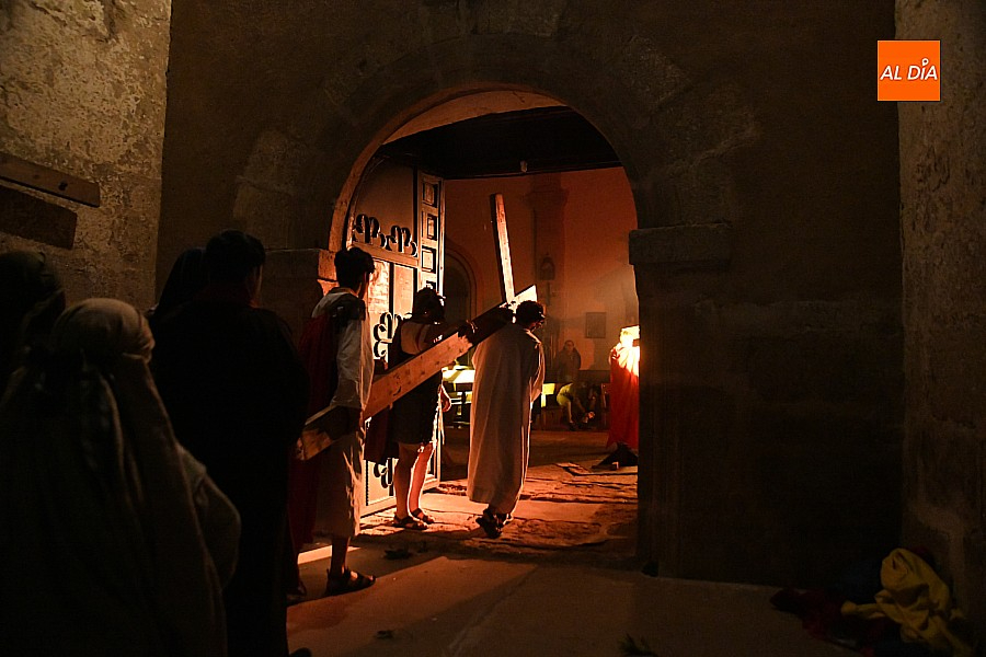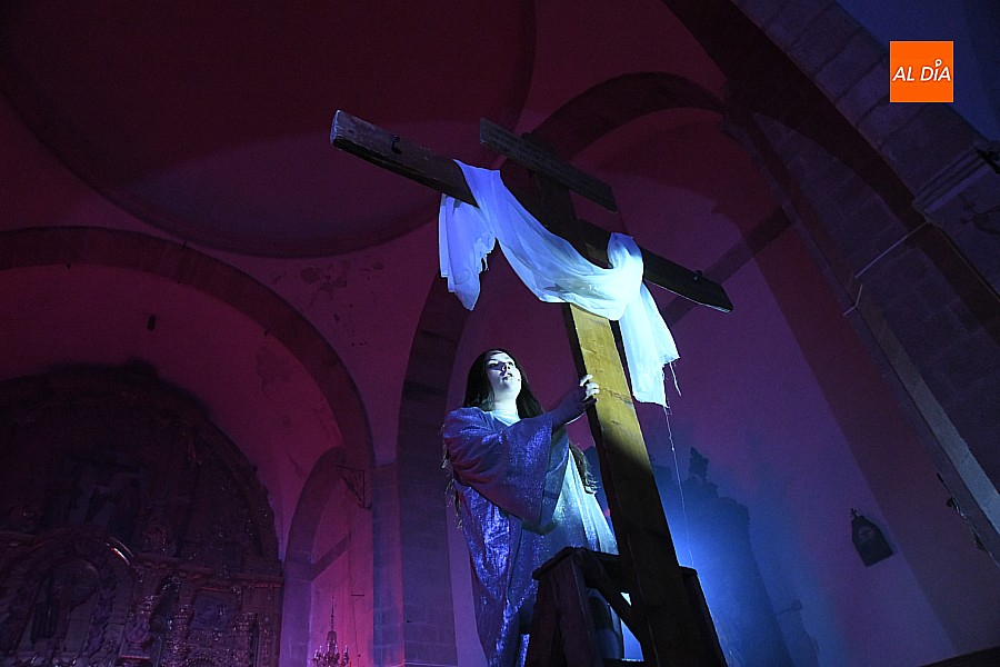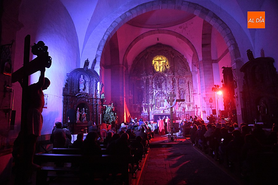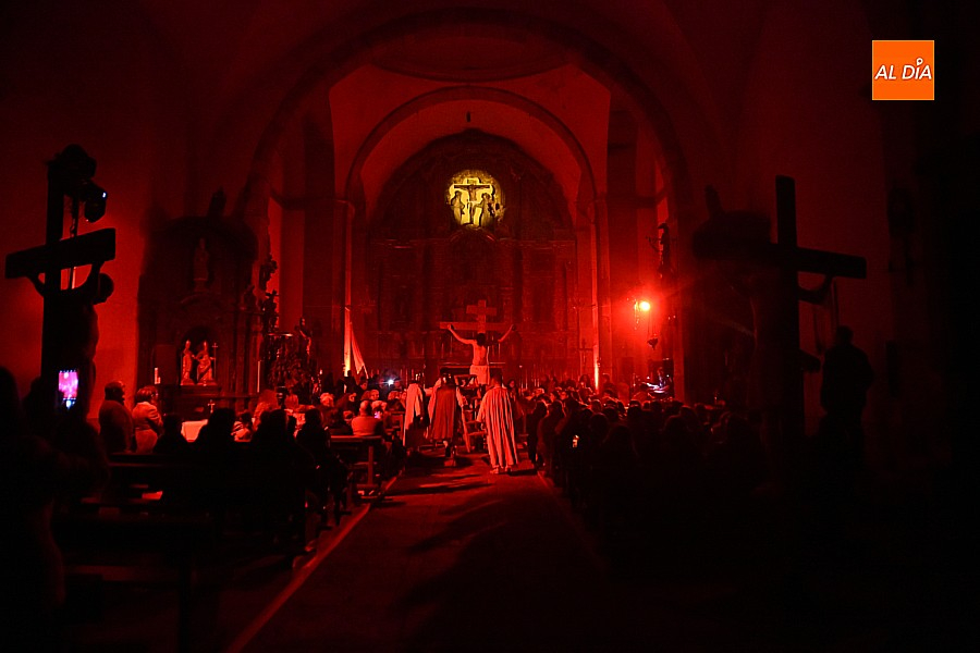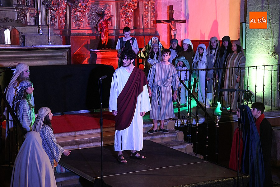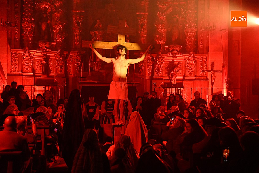 Después de recorrer distintos municipios de la diócesis, el grupo se acerca al final de su recorrido este Martes Santo en la localidad de El Bodón. La representación tuvo lugar en el interior del templo parroquial, una acertada decisión por parte de la organización, no solo por los 6ºgrados que marcaban los termómetros al inicio, sino también por los 4,5ºC que acompañaron el momento más sobrecogedor de la obra: la Crucifixión.