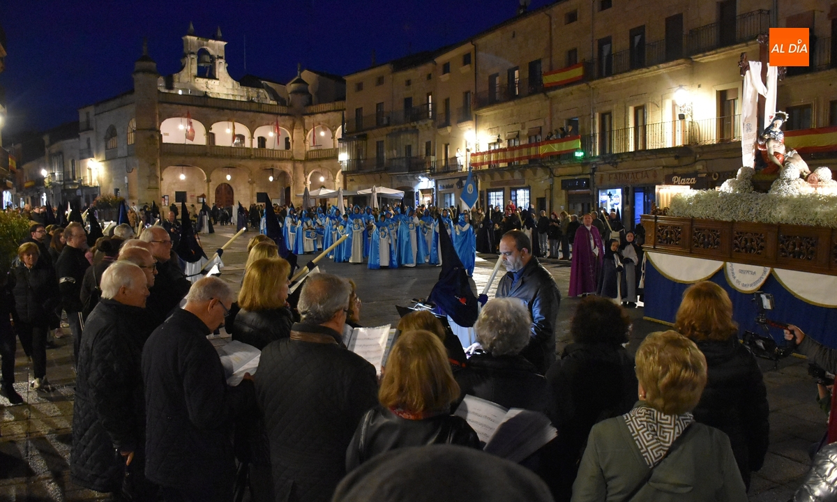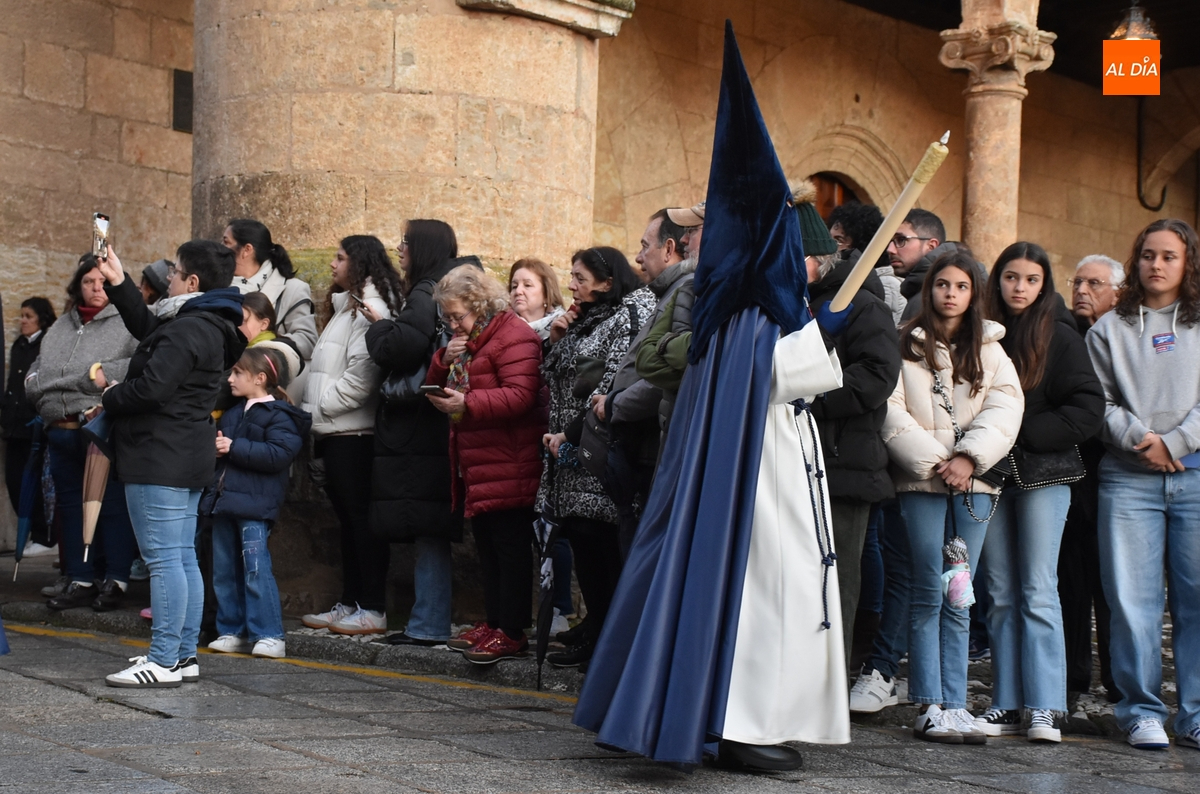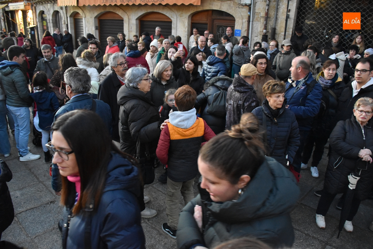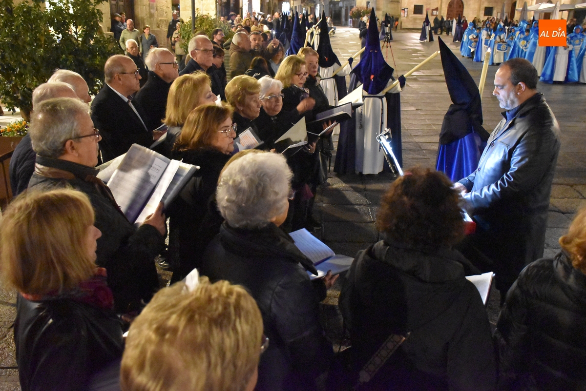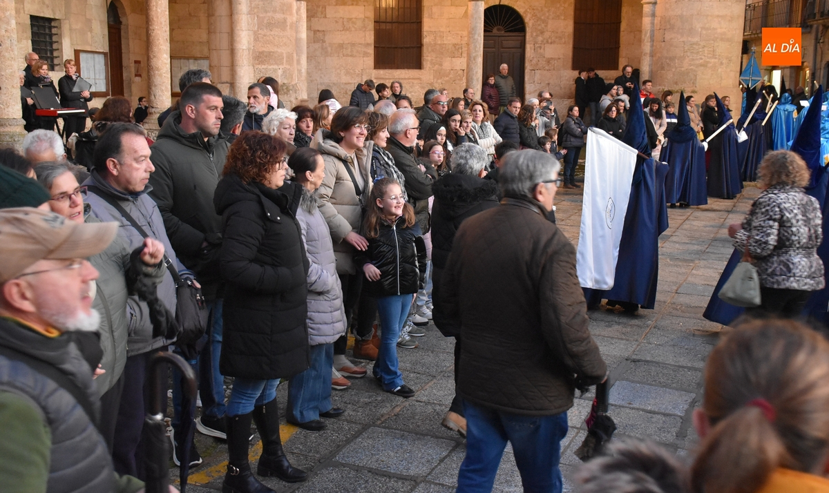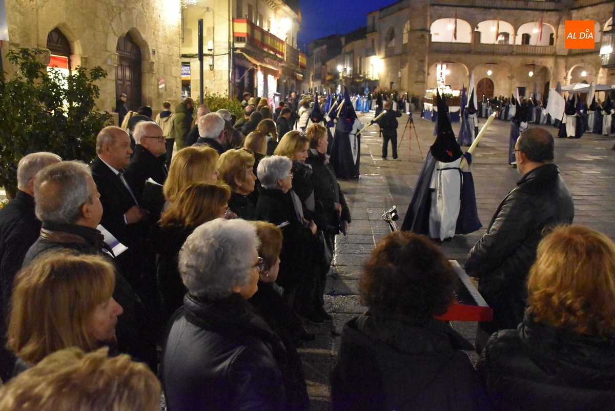 Tras recorrer la Plazuela Cristóbal de Castillejo, unos metros del Campo del Pozo y de la calle Arco, la calle Gigantes y la Rúa del Sol, volvió a la Plaza (donde hacía 11ºC), que descendió al completo, realizando una parada junto a la calle Julián Sánchez para disfrutar de otra pieza de la Coral Mirobrigense Dámaso Ledesma. Junto a estas canciones, la procesión tuvo la animación musical continua de la Banda de Cornetas y Tambores de la Cofradía de Jesús Amigo de los Niños.