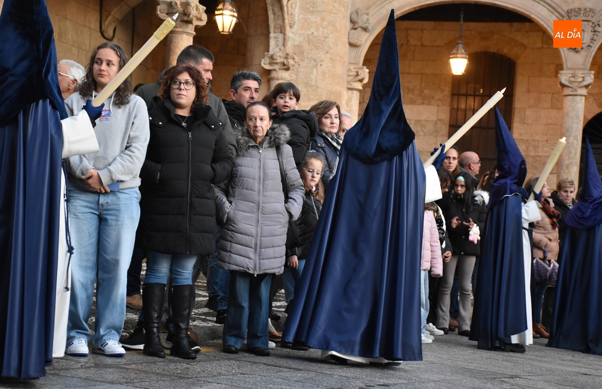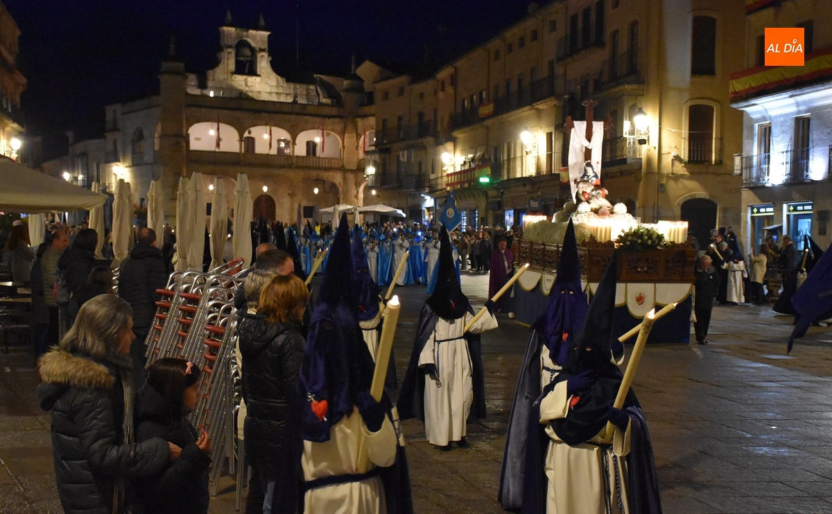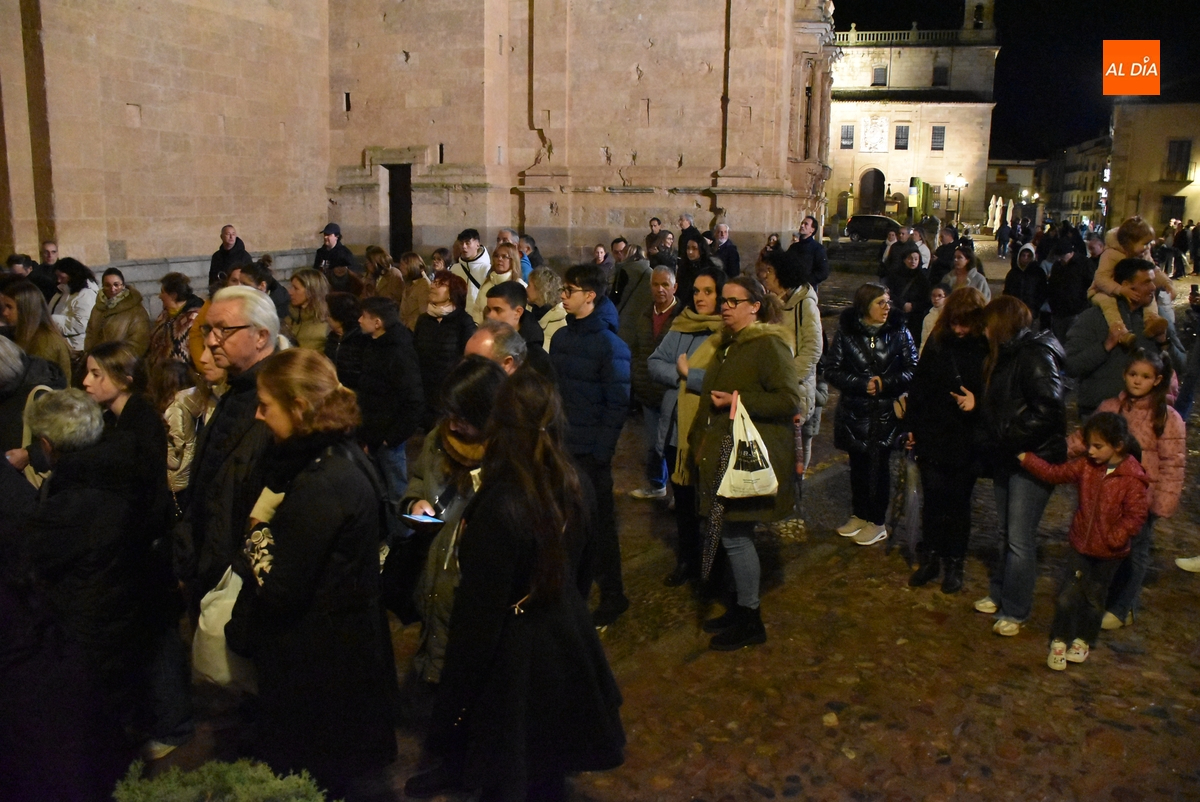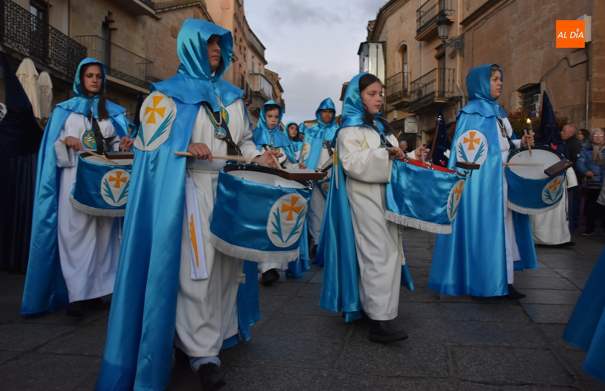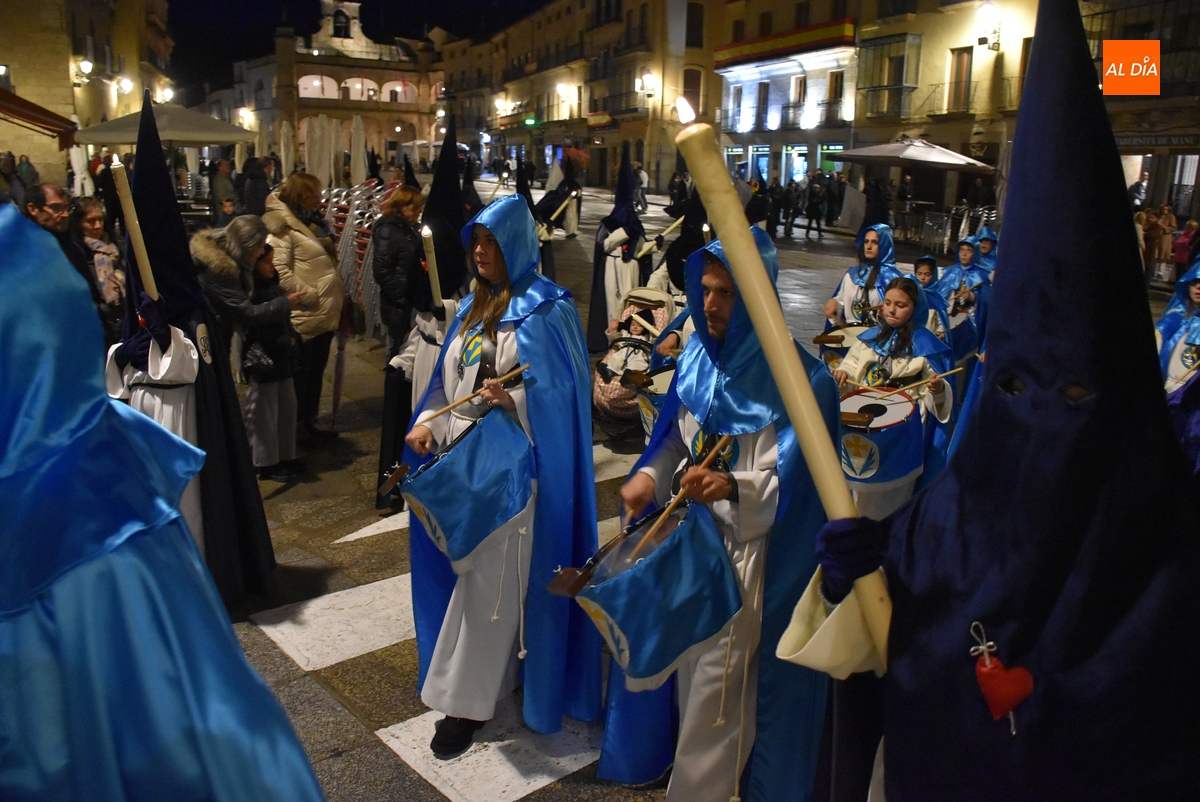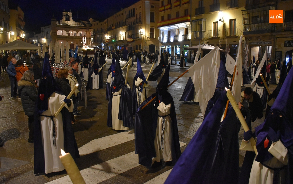 Tras recorrer la Plazuela Cristóbal de Castillejo, unos metros del Campo del Pozo y de la calle Arco, la calle Gigantes y la Rúa del Sol, volvió a la Plaza (donde hacía 11ºC), que descendió al completo, realizando una parada junto a la calle Julián Sánchez para disfrutar de otra pieza de la Coral Mirobrigense Dámaso Ledesma. Junto a estas canciones, la procesión tuvo la animación musical continua de la Banda de Cornetas y Tambores de la Cofradía de Jesús Amigo de los Niños.