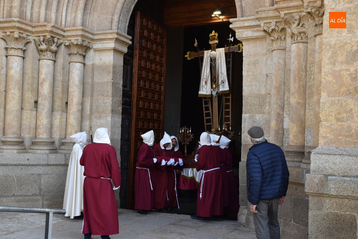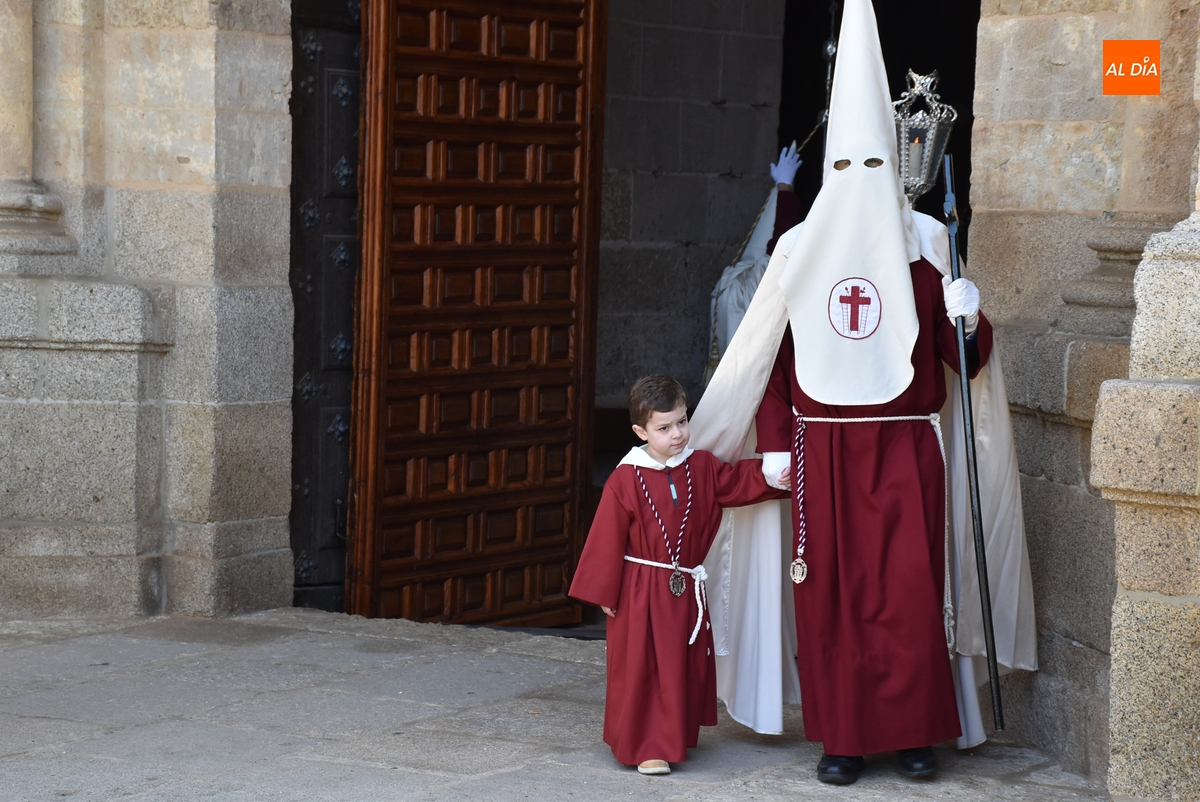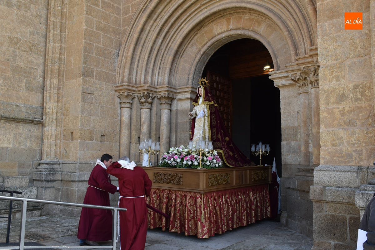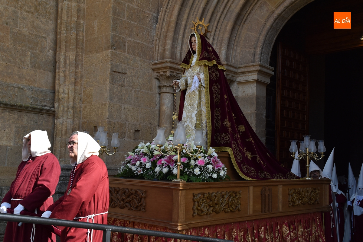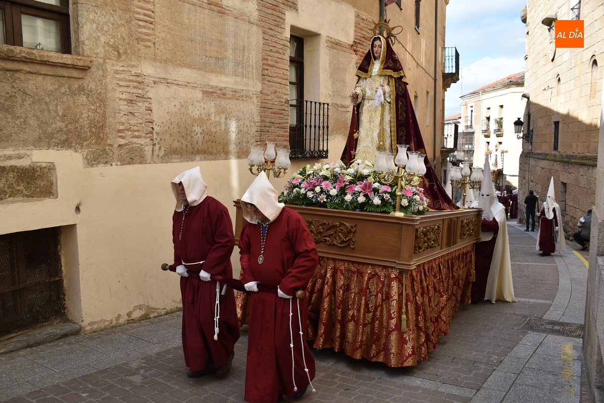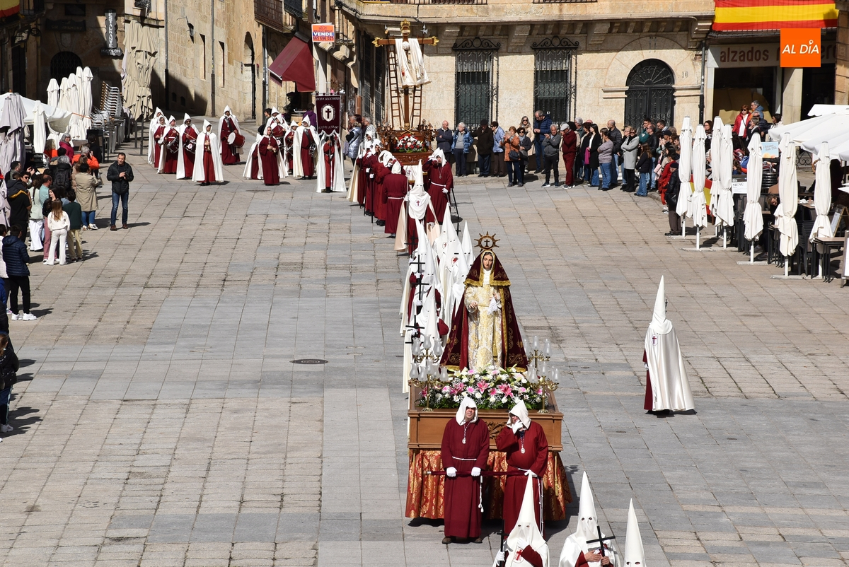 Con los sones de la Banda de Cornetas y Tambores de la propia entidad, la procesión continuó por la Rúa del Sol, Gigantes, Arco, Campo del Pozo, Cristóbal de Castillejo, San Juan, Colegios, Velayos, Sánchez Arjona, Plaza Mayor, Julián Sánchez y Cardenal Pacheco, para entrar de nuevo en la Catedral, de nuevo con bastante seguimiento de público.