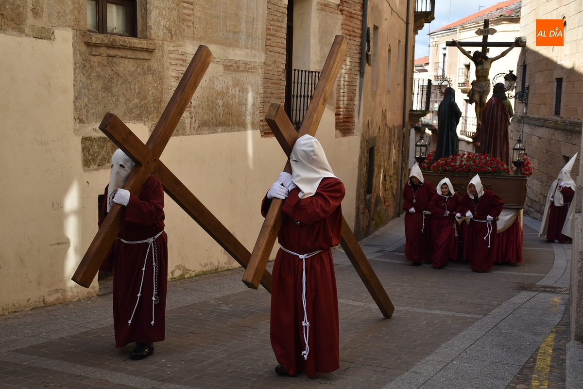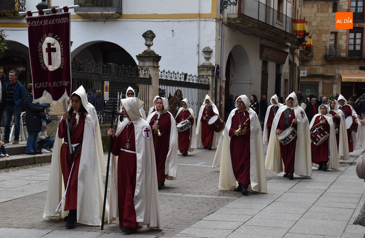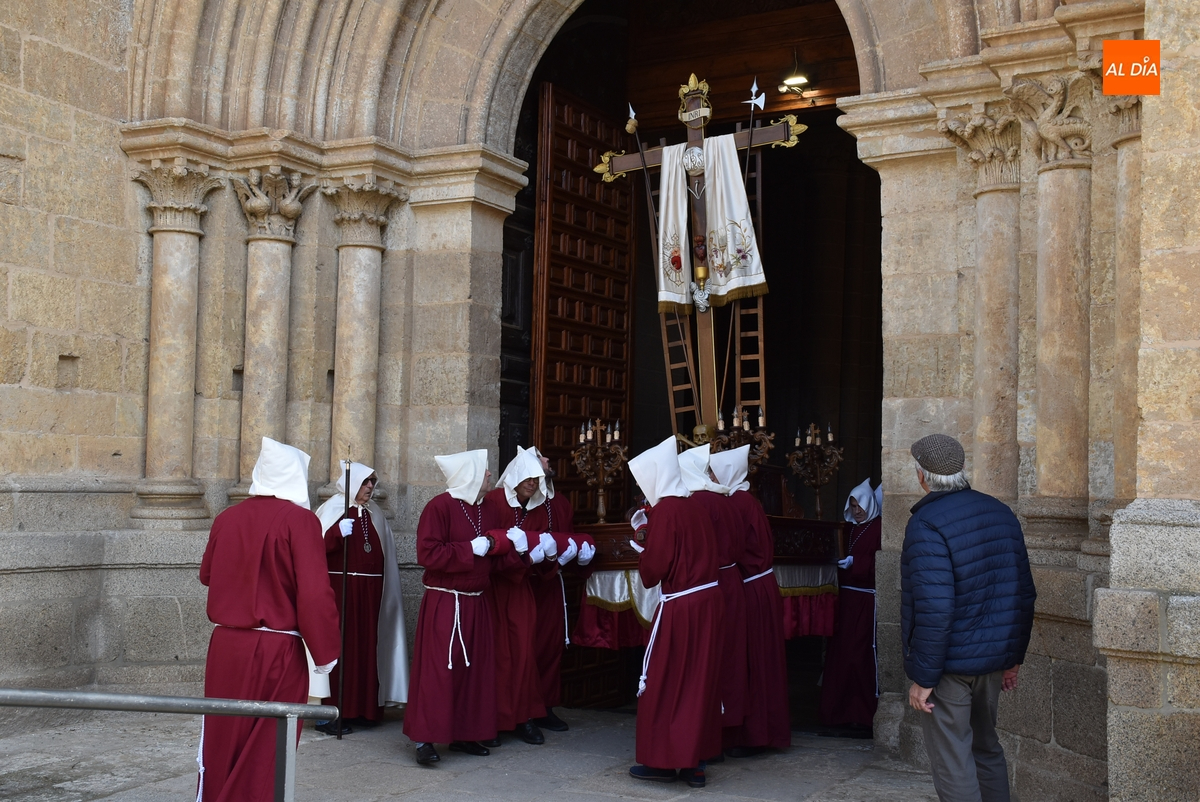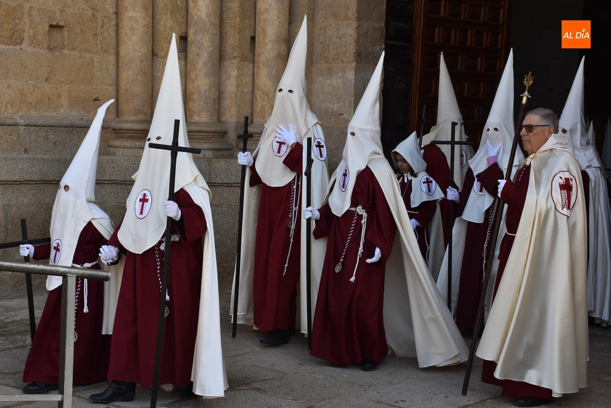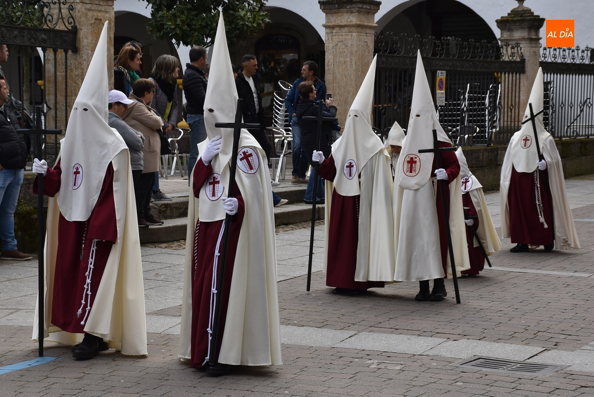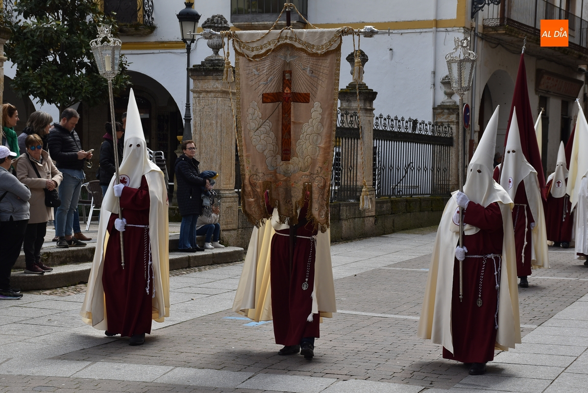 La larguísima jornada del Jueves Santo en Ciudad Rodrigo se abrió con la procesión de La Cruz a cargo de la Ilustre Cofradía de la Santa Cruz, que volvía a pisar las calles dos años después, ya que en 2024 la entidad no lo llegó a hacer al tener que suspenderse tanto su desfile como la procesión del Santo Entierro por las malas condiciones meteorológicas.
