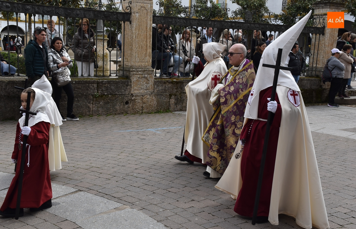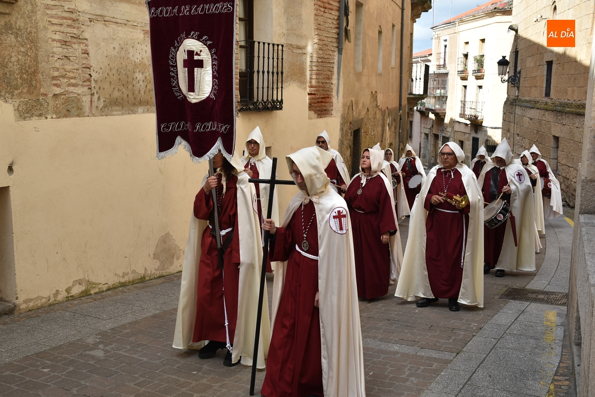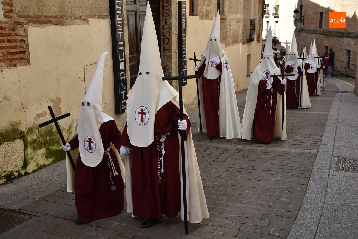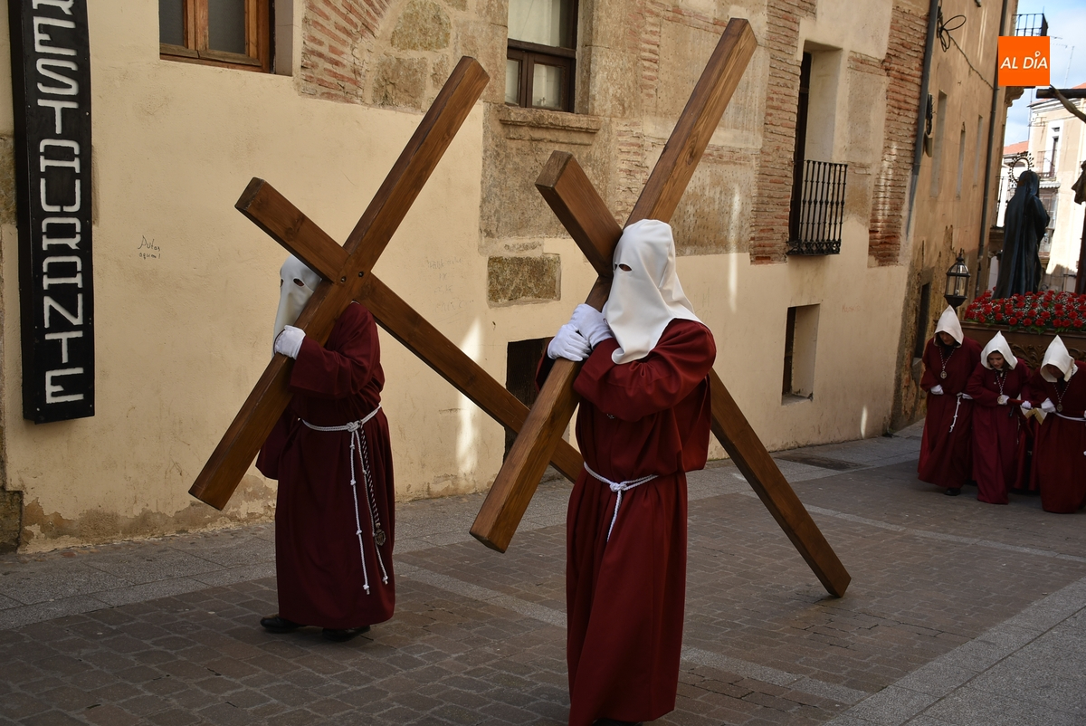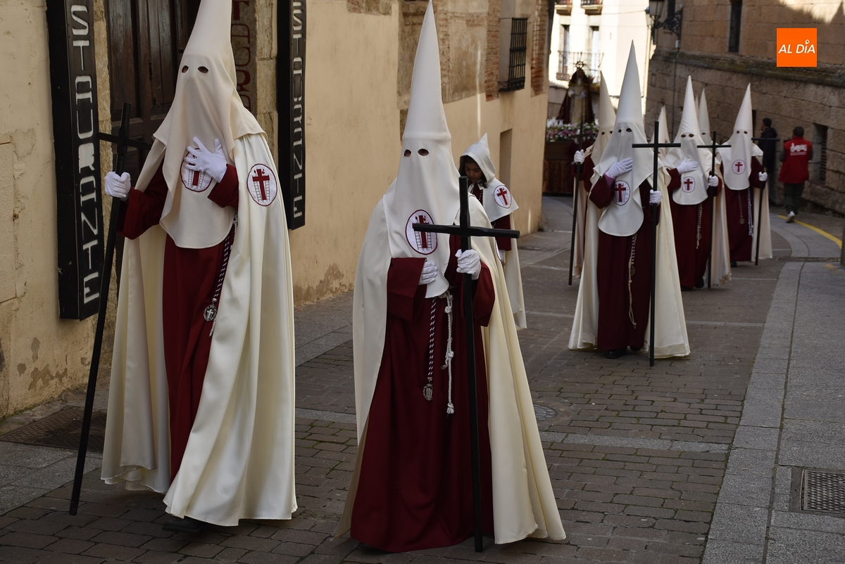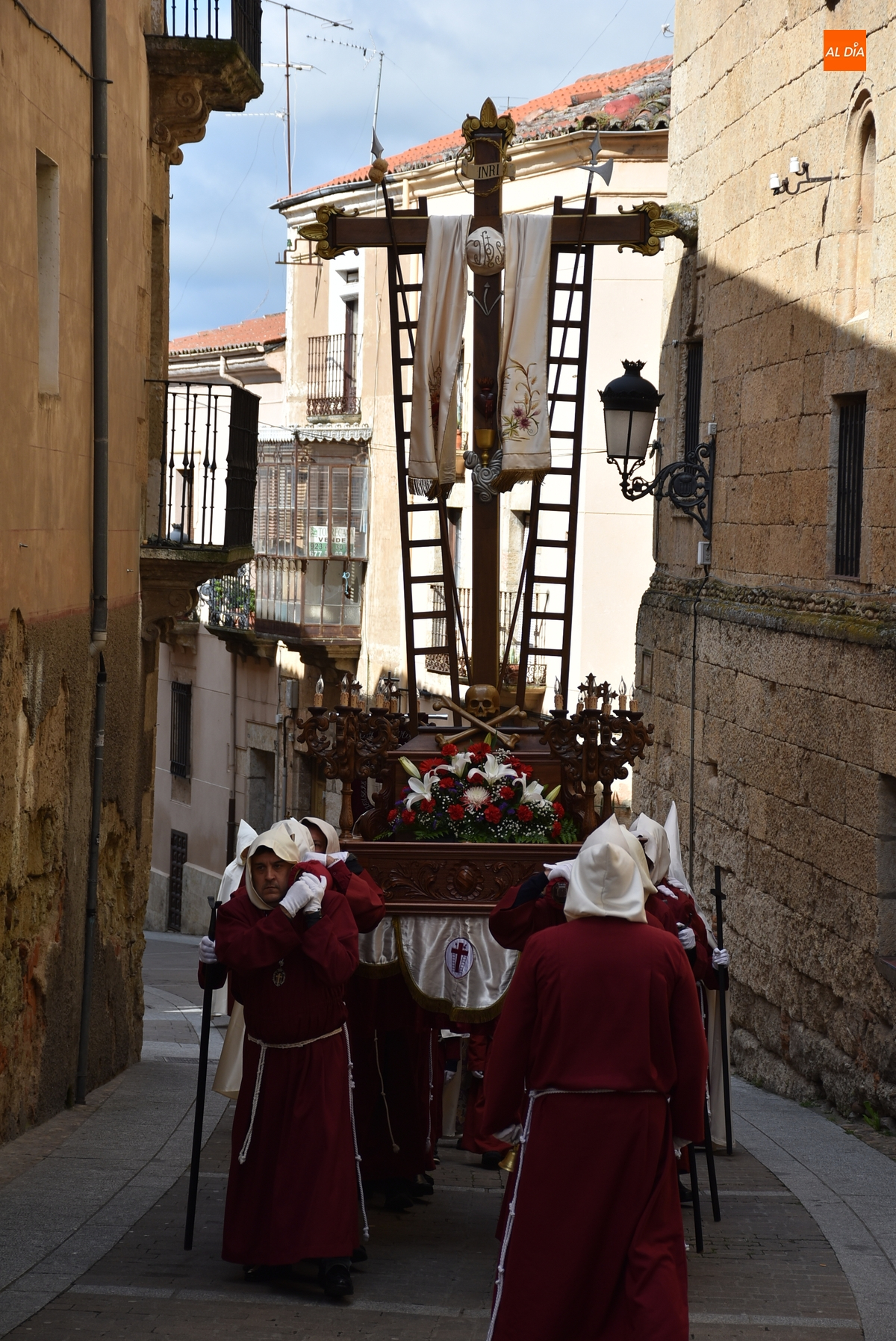 La larguísima jornada del Jueves Santo en Ciudad Rodrigo se abrió con la procesión de La Cruz a cargo de la Ilustre Cofradía de la Santa Cruz, que volvía a pisar las calles dos años después, ya que en 2024 la entidad no lo llegó a hacer al tener que suspenderse tanto su desfile como la procesión del Santo Entierro por las malas condiciones meteorológicas.