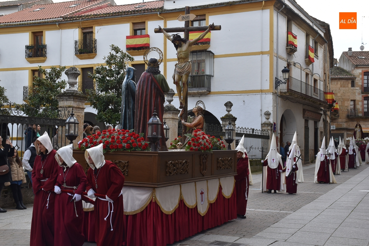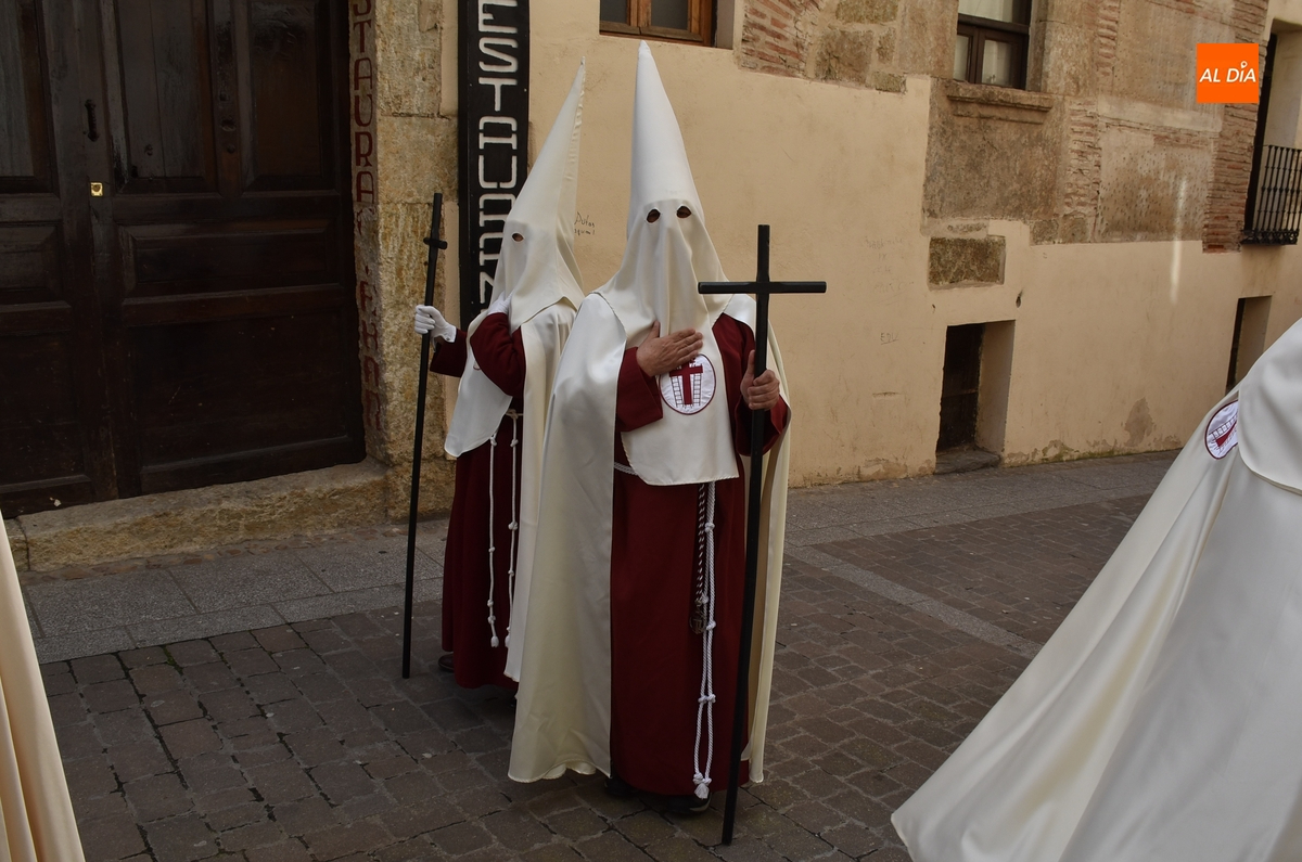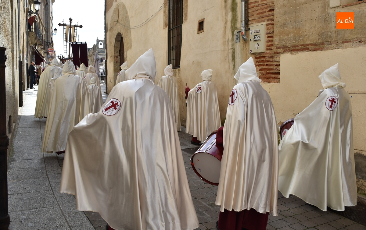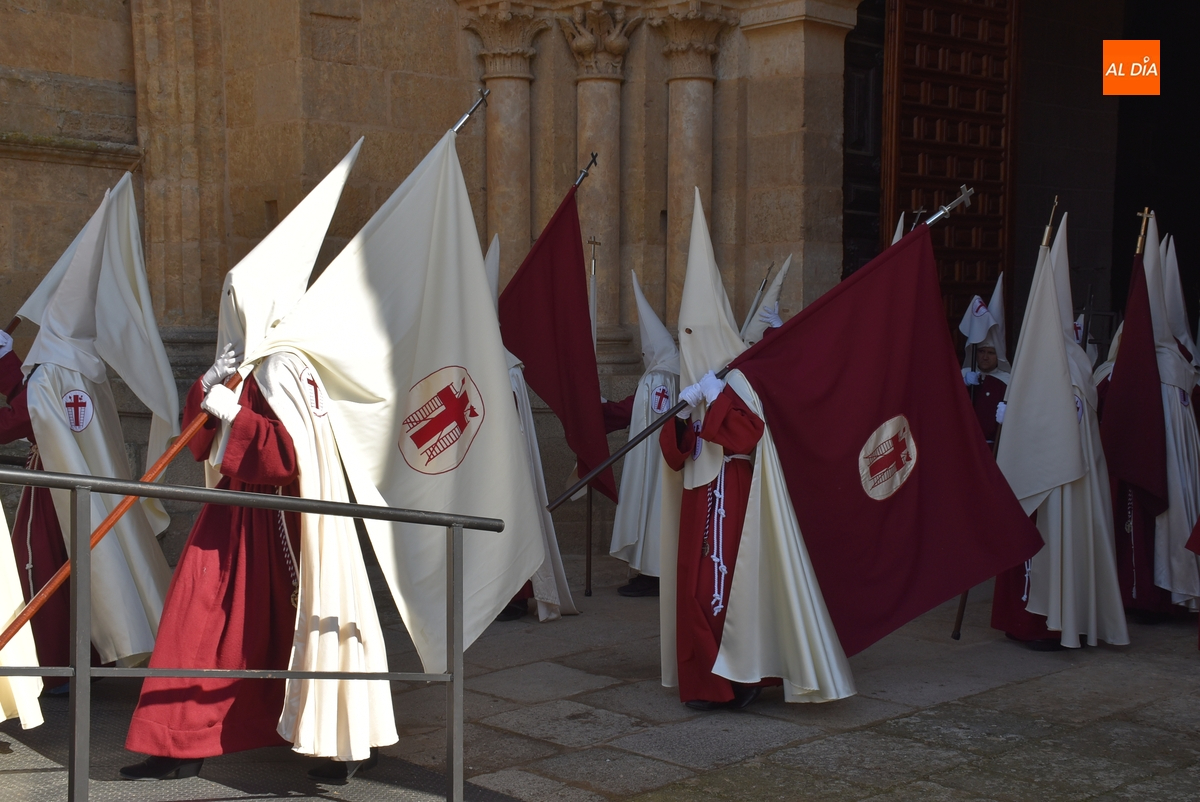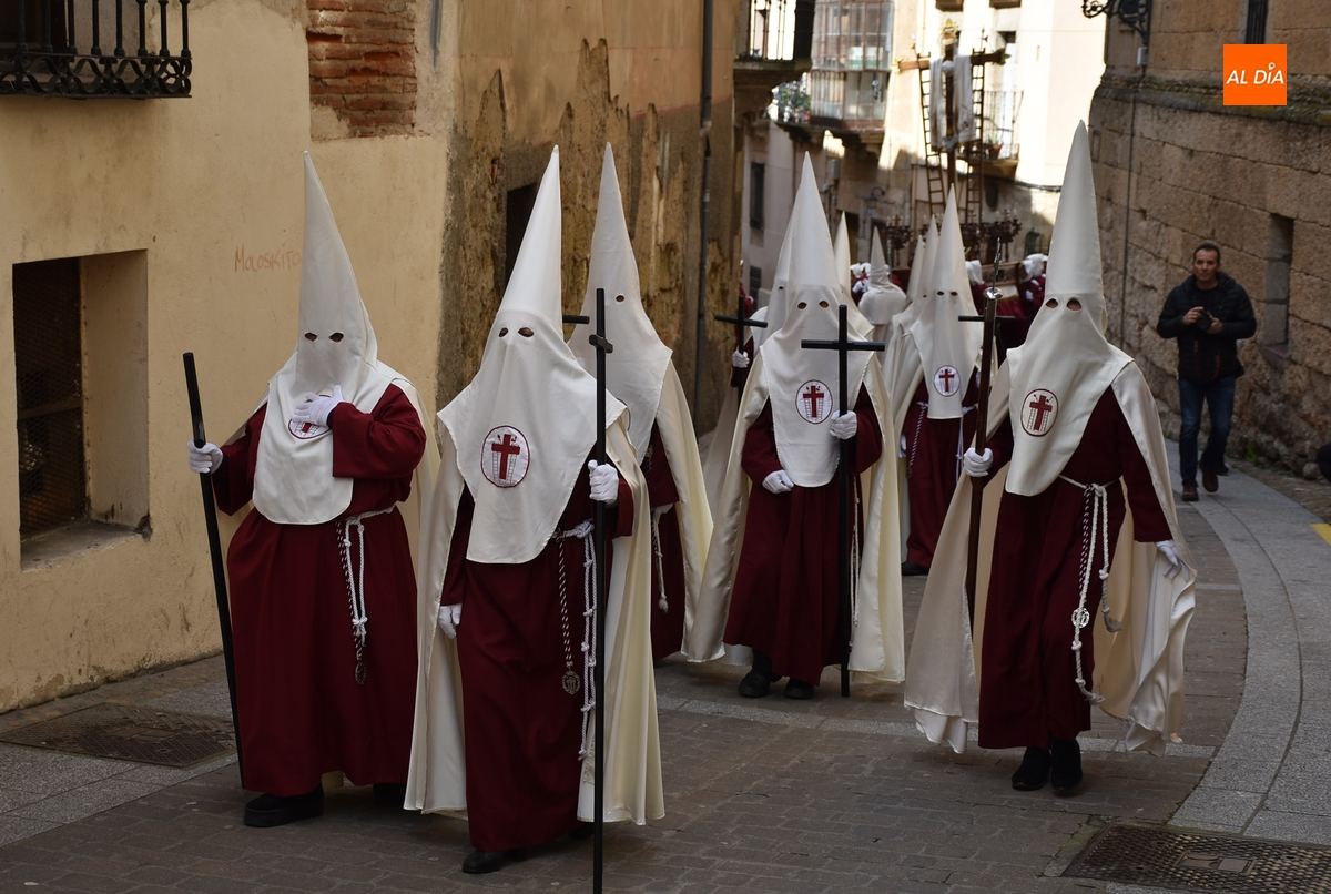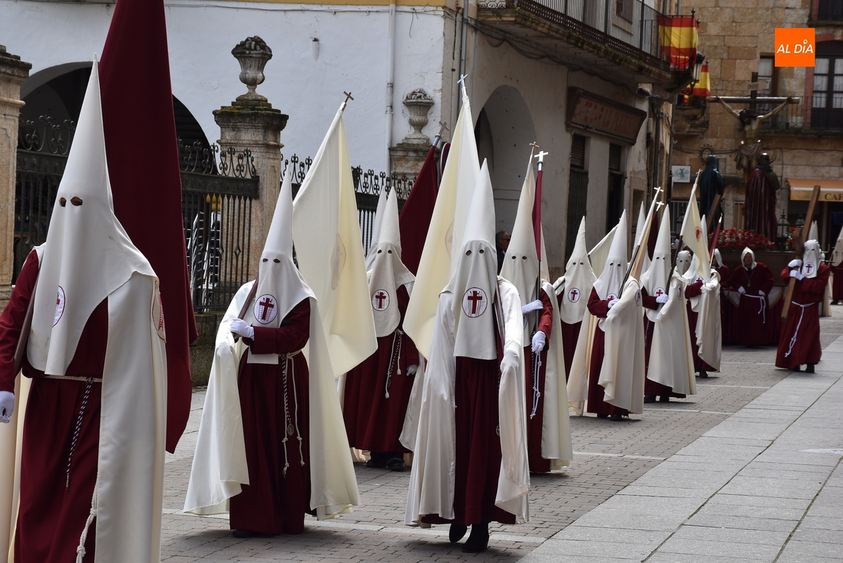 La larguísima jornada del Jueves Santo en Ciudad Rodrigo se abrió con la procesión de La Cruz a cargo de la Ilustre Cofradía de la Santa Cruz, que volvía a pisar las calles dos años después, ya que en 2024 la entidad no lo llegó a hacer al tener que suspenderse tanto su desfile como la procesión del Santo Entierro por las malas condiciones meteorológicas.