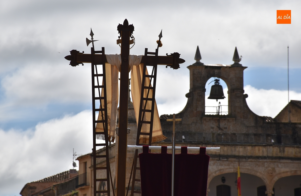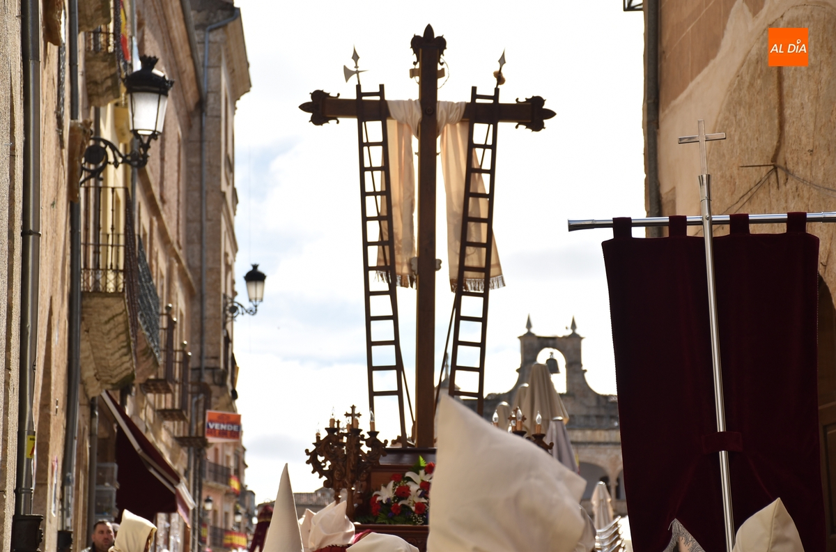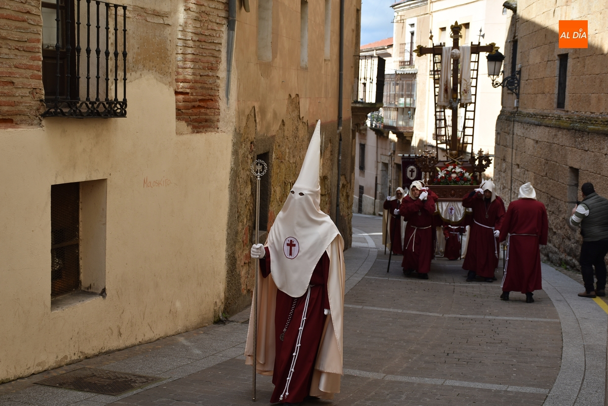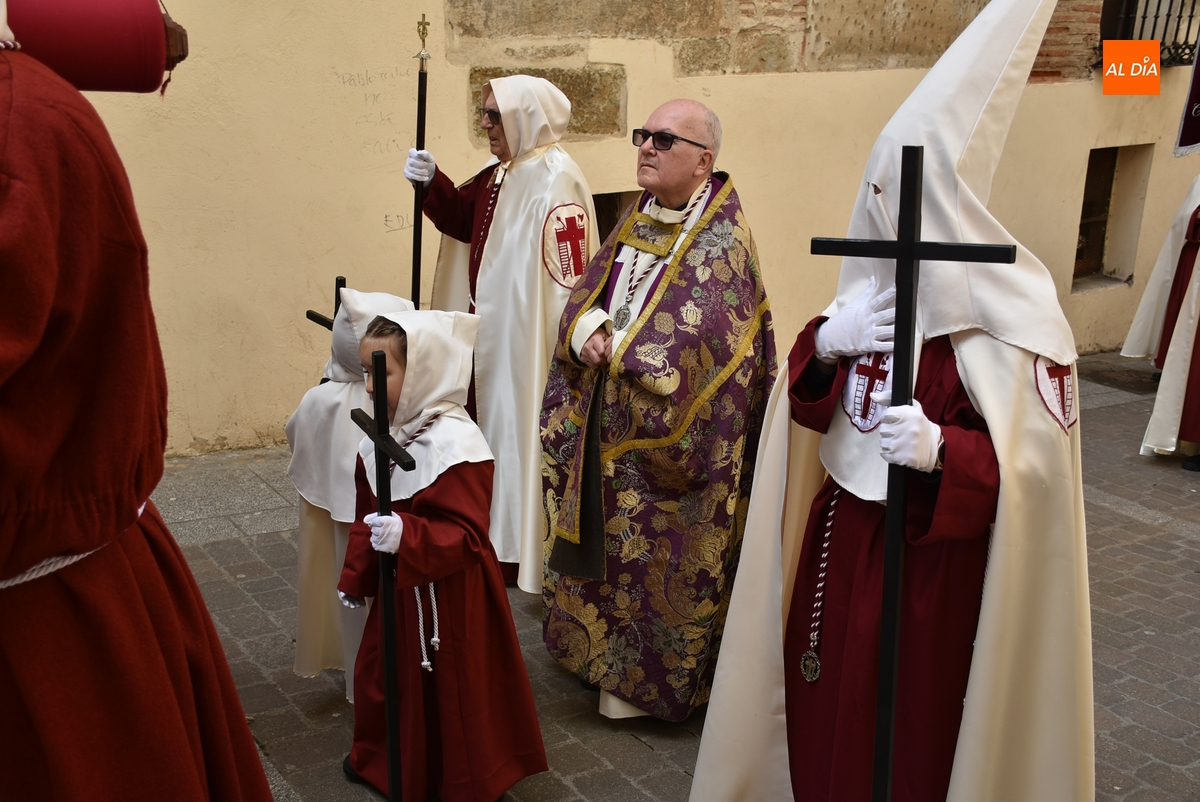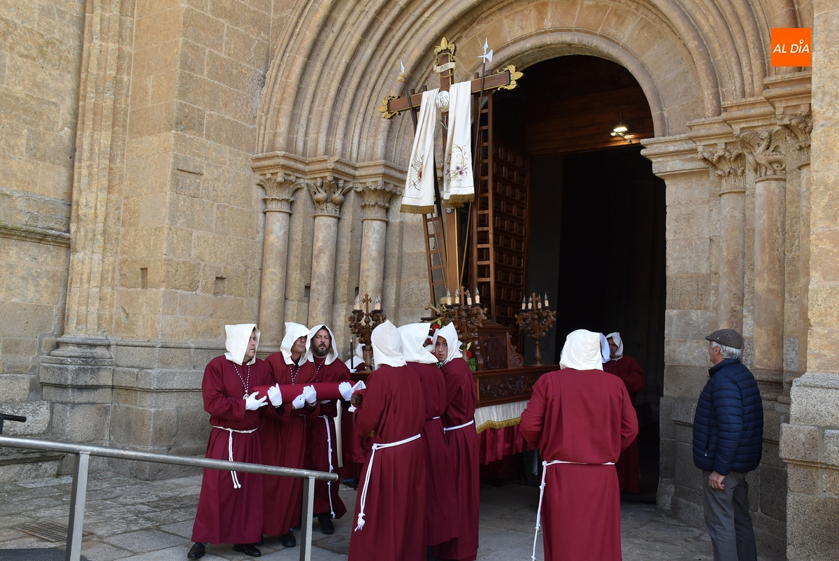 La larguísima jornada del Jueves Santo en Ciudad Rodrigo se abrió con la procesión de La Cruz a cargo de la Ilustre Cofradía de la Santa Cruz, que volvía a pisar las calles dos años después, ya que en 2024 la entidad no lo llegó a hacer al tener que suspenderse tanto su desfile como la procesión del Santo Entierro por las malas condiciones meteorológicas.