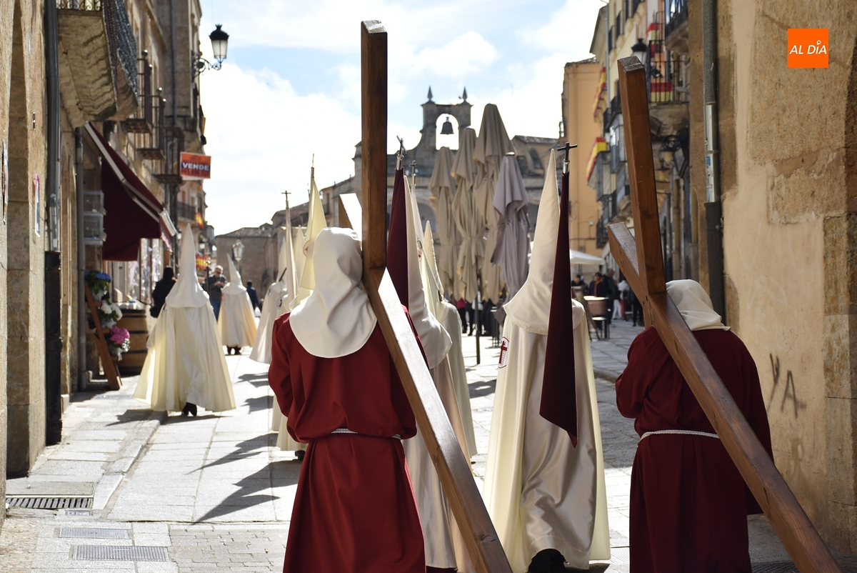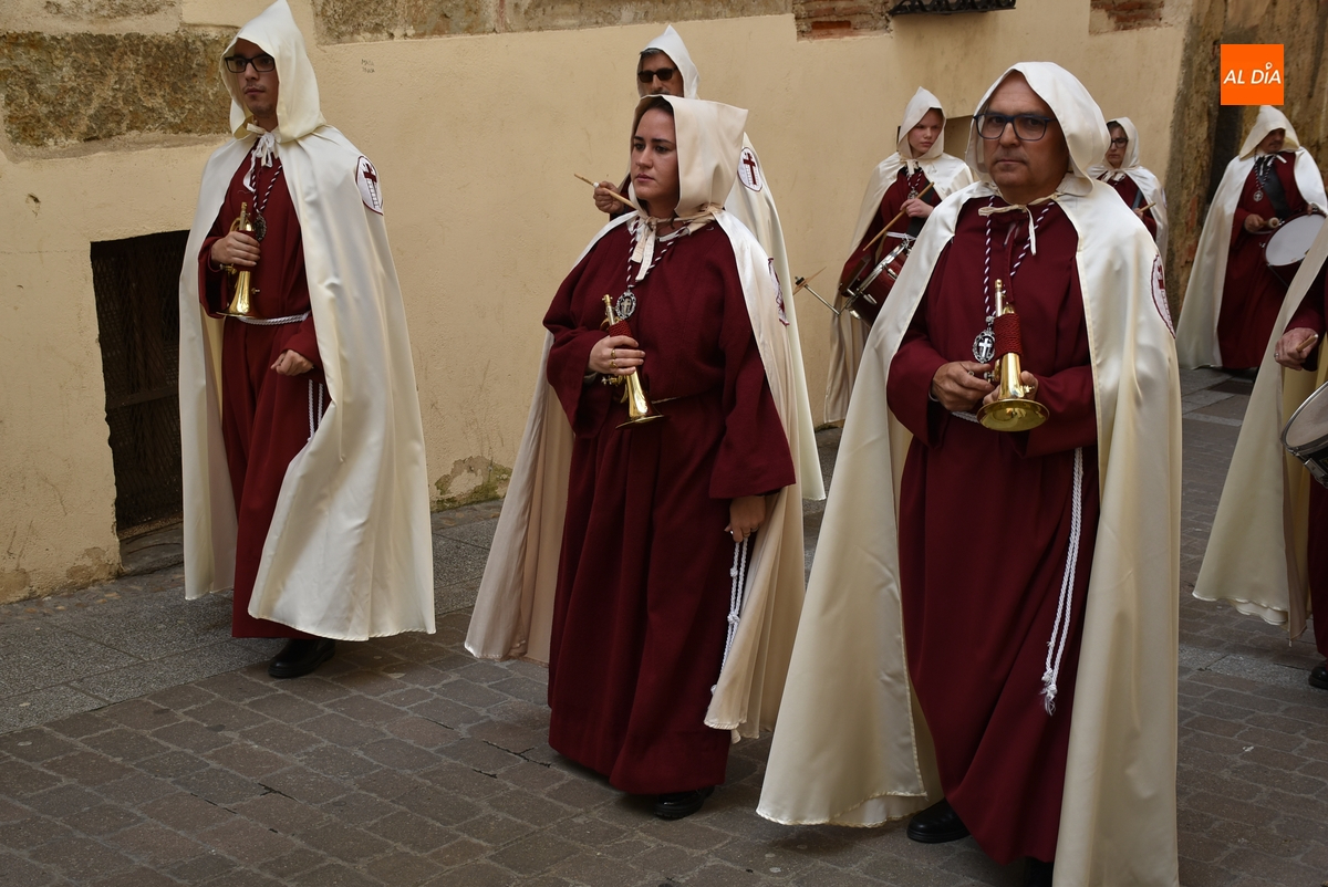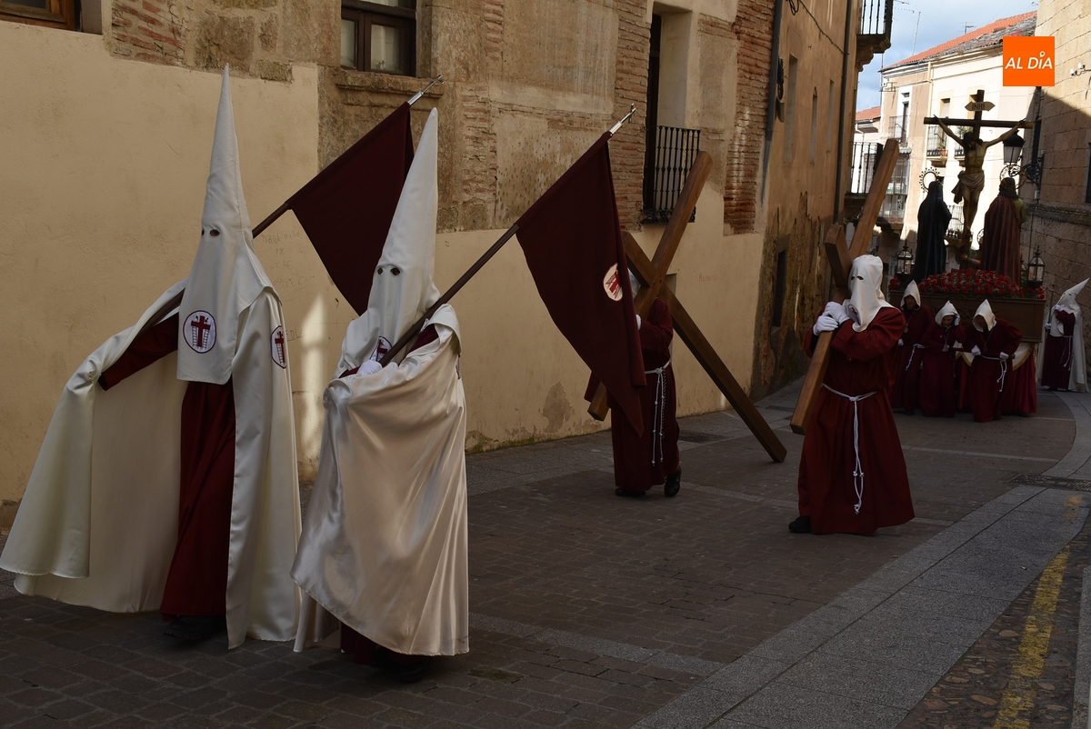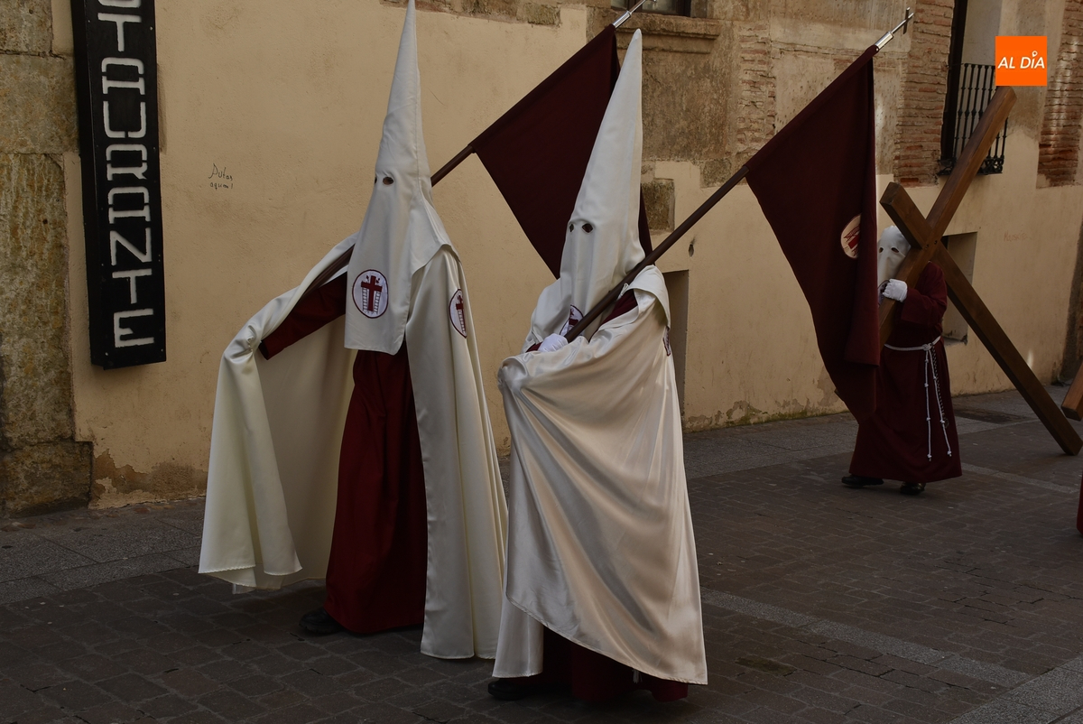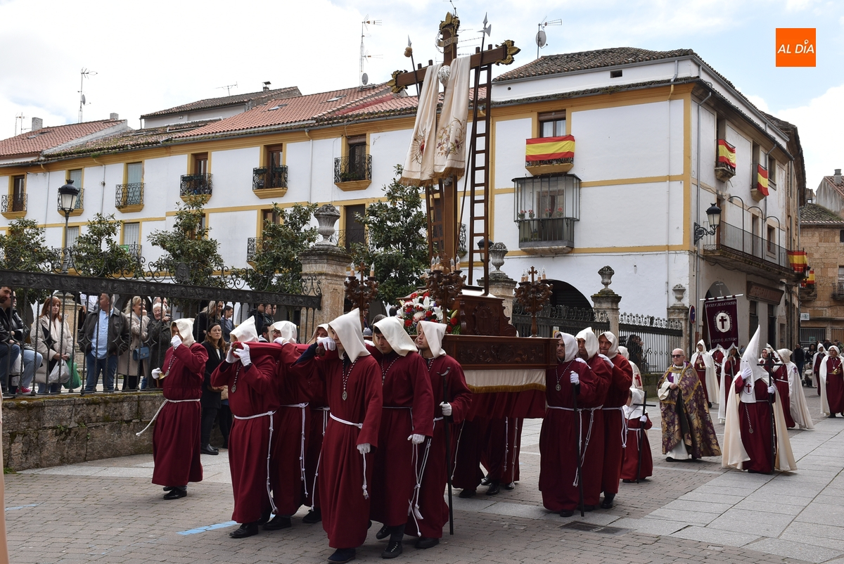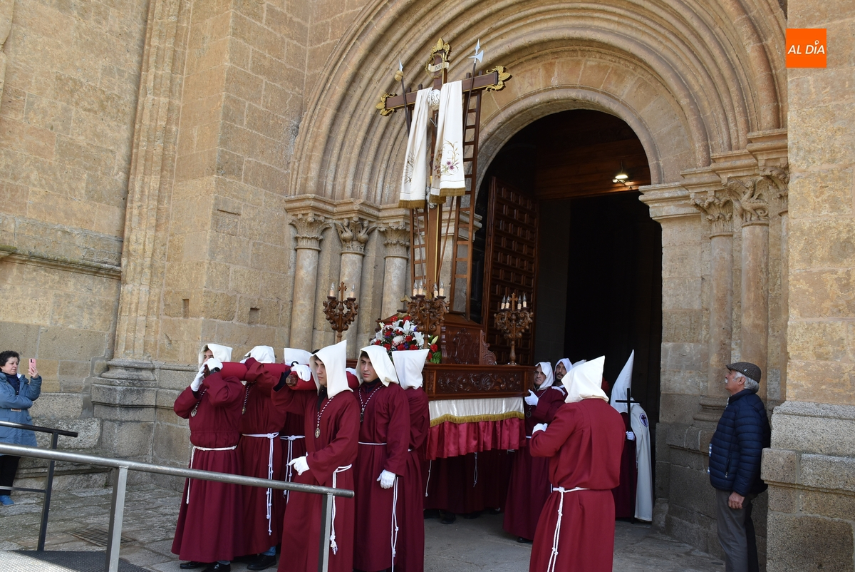 La larguísima jornada del Jueves Santo en Ciudad Rodrigo se abrió con la procesión de La Cruz a cargo de la Ilustre Cofradía de la Santa Cruz, que volvía a pisar las calles dos años después, ya que en 2024 la entidad no lo llegó a hacer al tener que suspenderse tanto su desfile como la procesión del Santo Entierro por las malas condiciones meteorológicas.