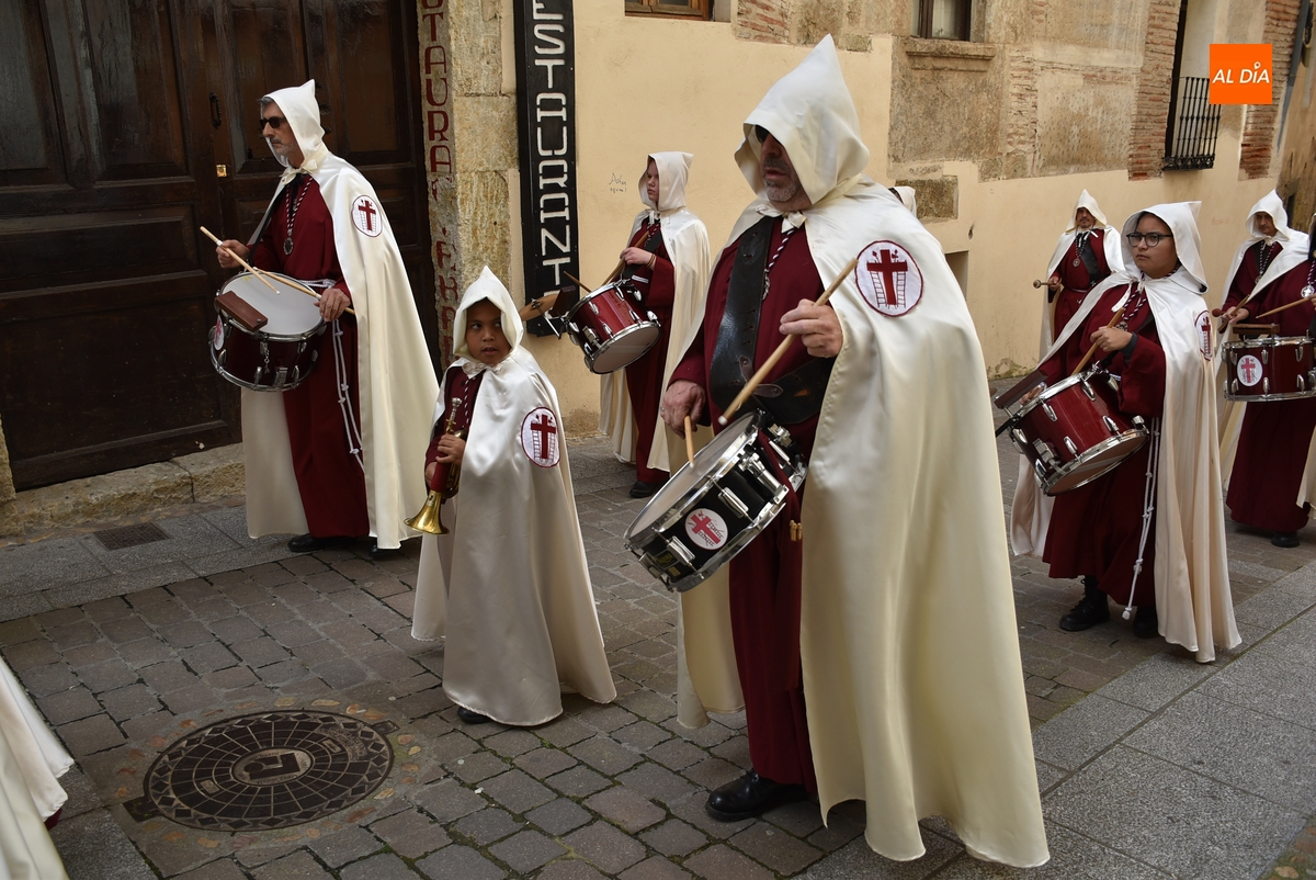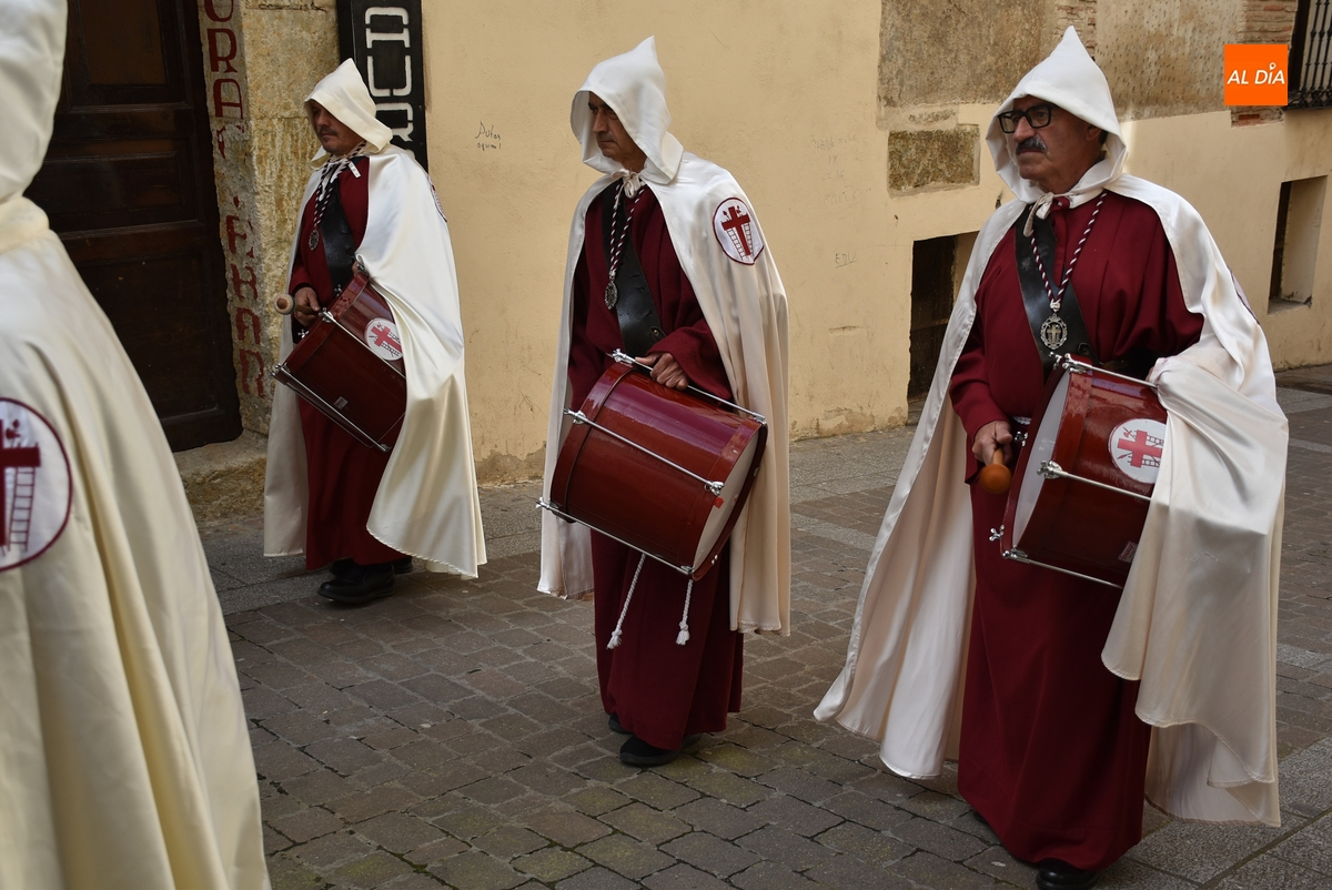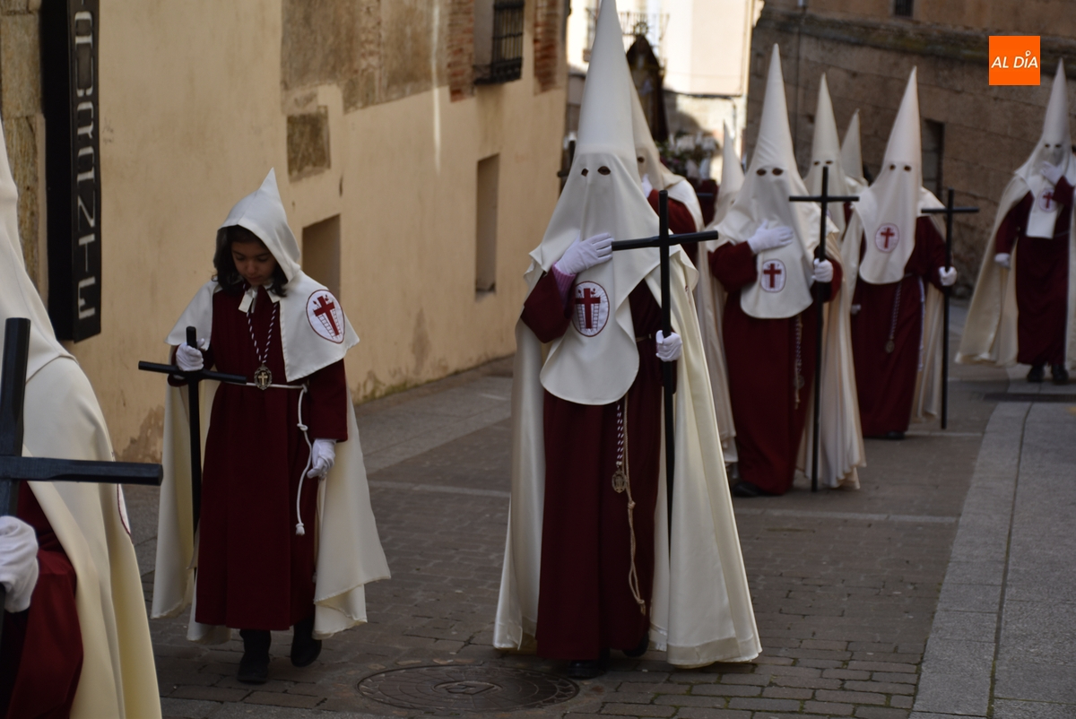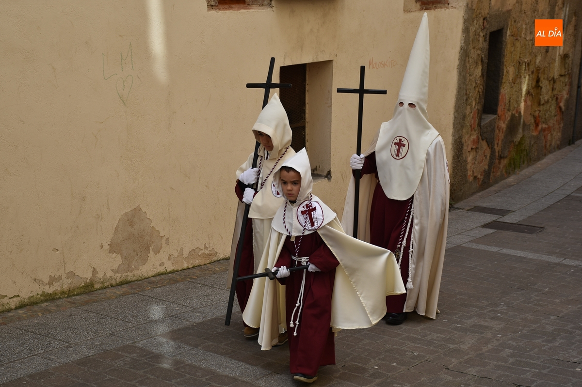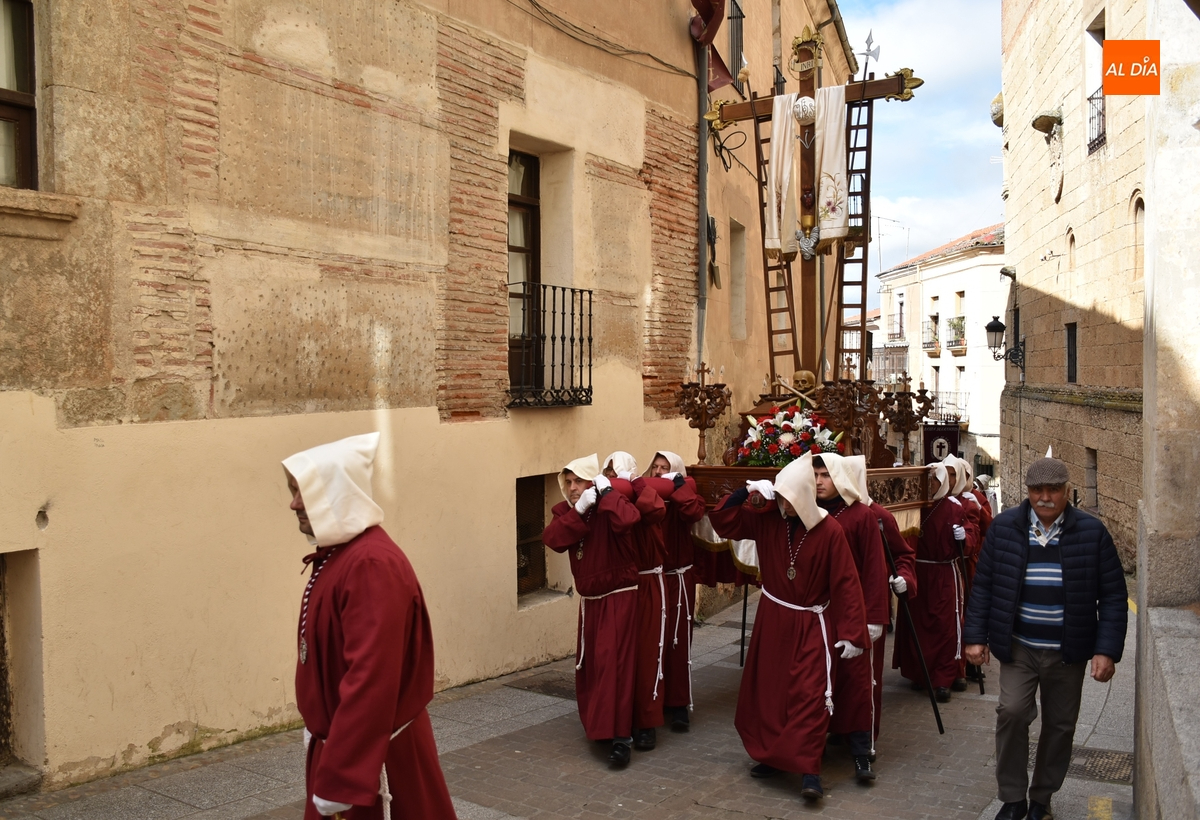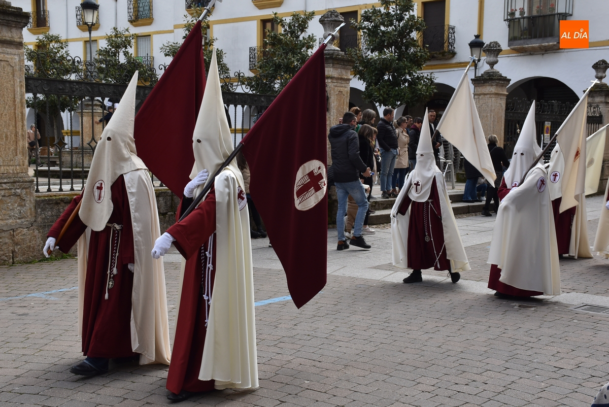 La larguísima jornada del Jueves Santo en Ciudad Rodrigo se abrió con la procesión de La Cruz a cargo de la Ilustre Cofradía de la Santa Cruz, que volvía a pisar las calles dos años después, ya que en 2024 la entidad no lo llegó a hacer al tener que suspenderse tanto su desfile como la procesión del Santo Entierro por las malas condiciones meteorológicas.