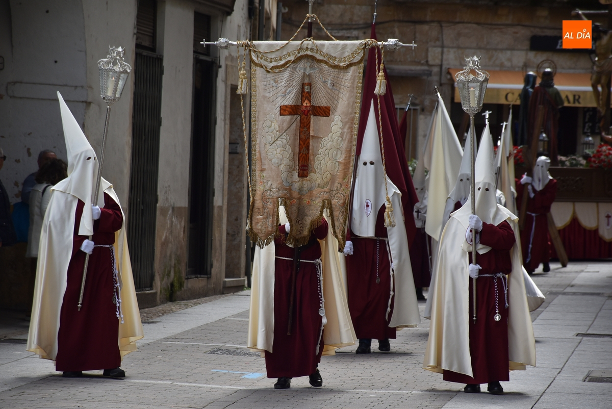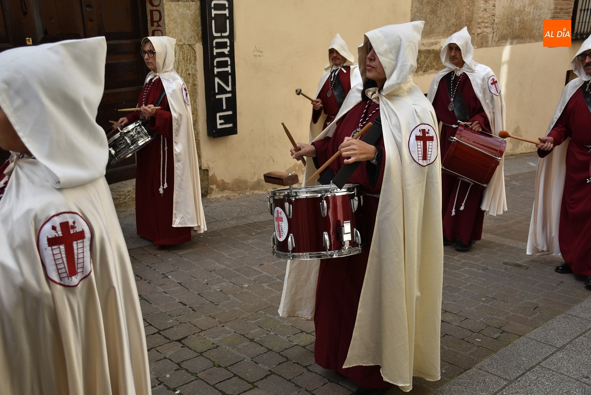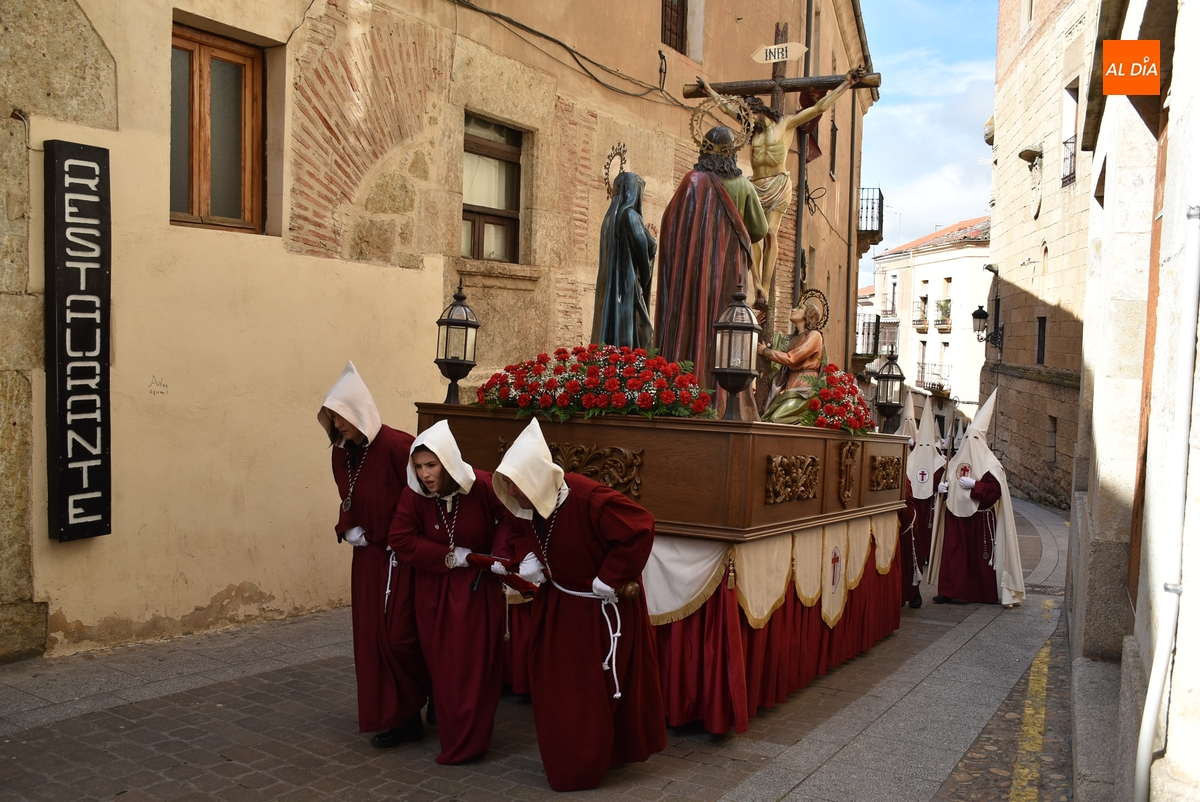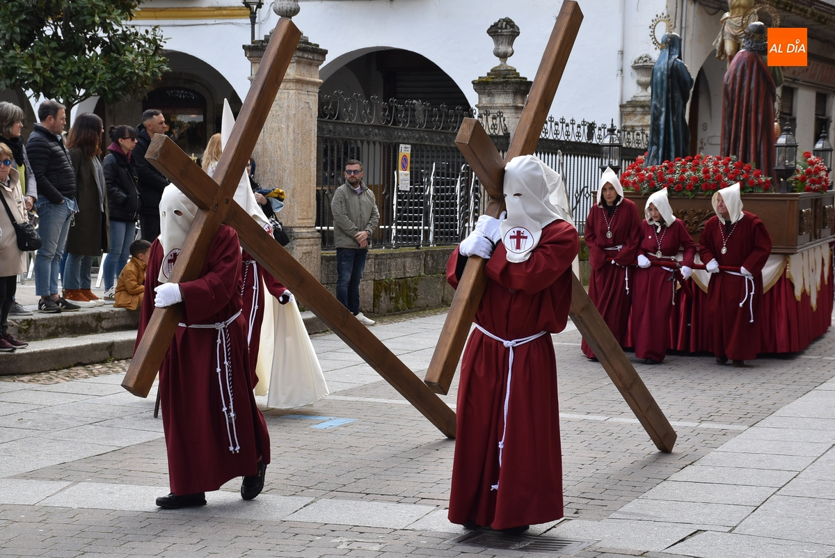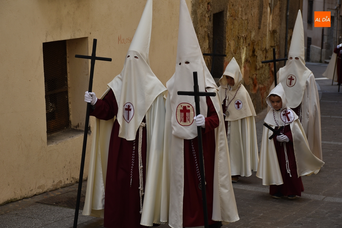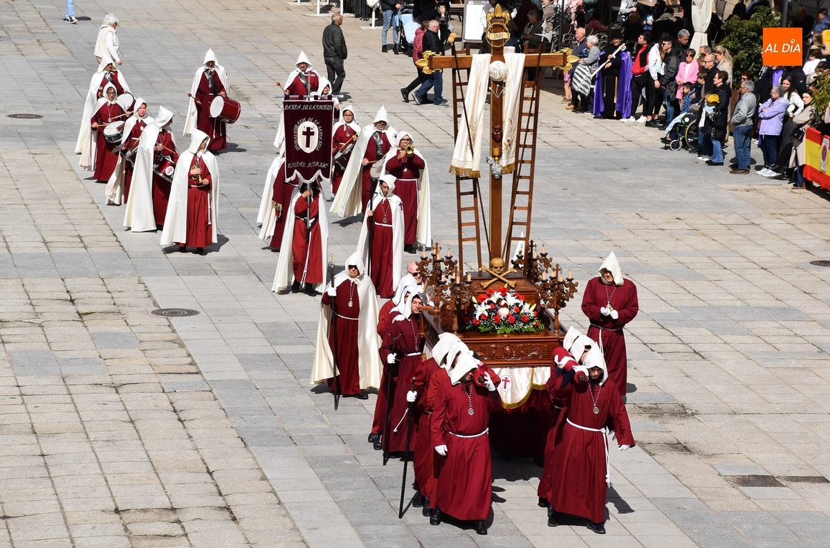 La larguísima jornada del Jueves Santo en Ciudad Rodrigo se abrió con la procesión de La Cruz a cargo de la Ilustre Cofradía de la Santa Cruz, que volvía a pisar las calles dos años después, ya que en 2024 la entidad no lo llegó a hacer al tener que suspenderse tanto su desfile como la procesión del Santo Entierro por las malas condiciones meteorológicas.
