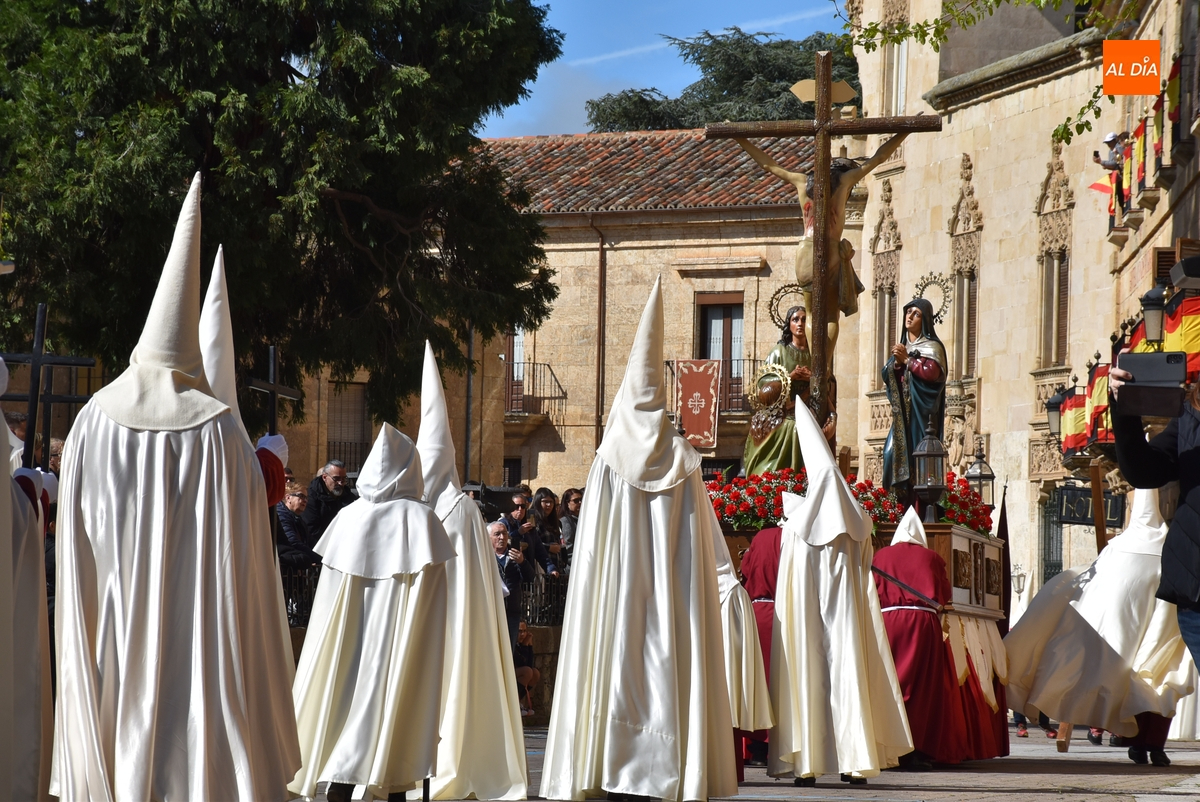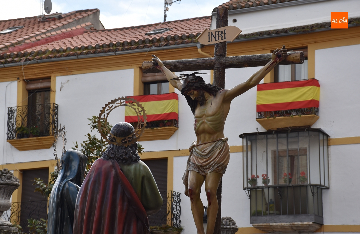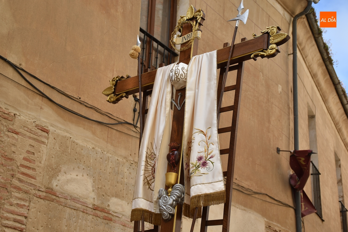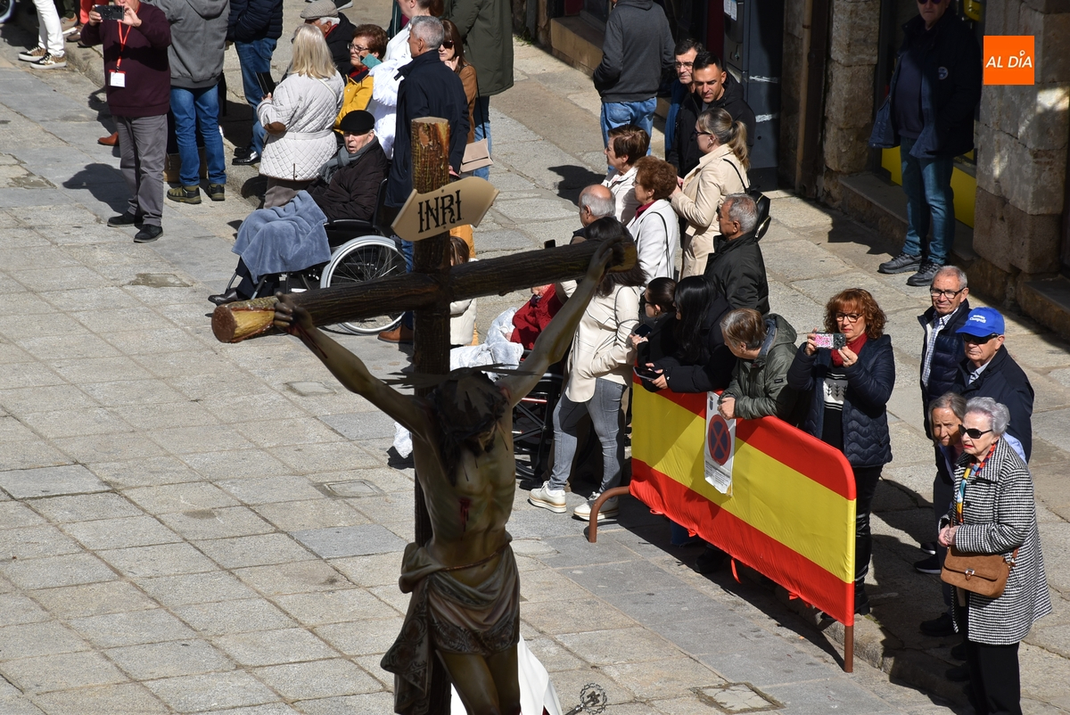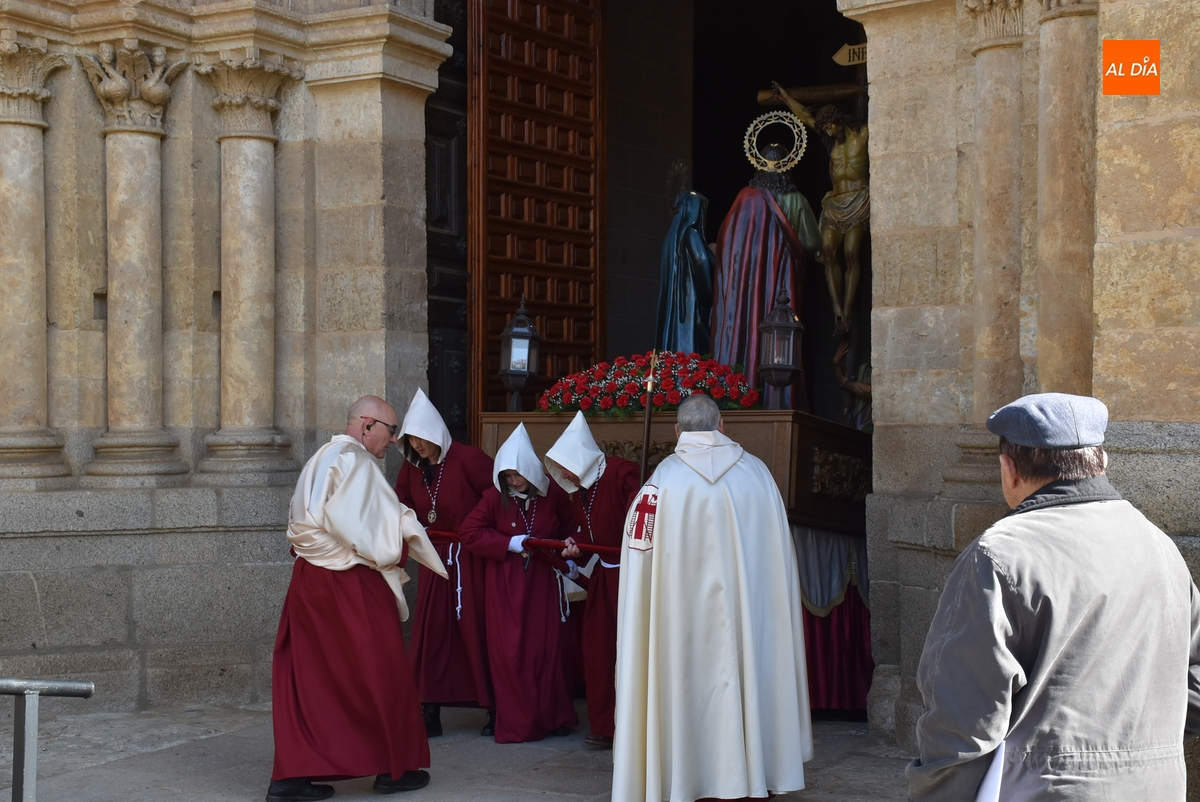 Asimismo, se demoró unos minutos por su complejidad la salida de los tres pasos de la Catedral: El Calvario y Nuestra Señora de la Cruz, al tener que cuadrar sus ruedas con las rampas de salida, y La Cruz, al tener que ser bajada en brazos para superar la bóveda de la Puerta de las Cadenas. Eso sí, una vez se puso en marcha, la procesión fue muy ágil, completando a muy buen ritmo el trayecto, cuya parte inicial transcurrió por la Plazuela de San Salvador, Díez Taravilla, Colada y la Plaza Mayor, donde habló desde la balconada de la Casa Consistorial el capellán de la entidad, Fernando Dias-Bailón.