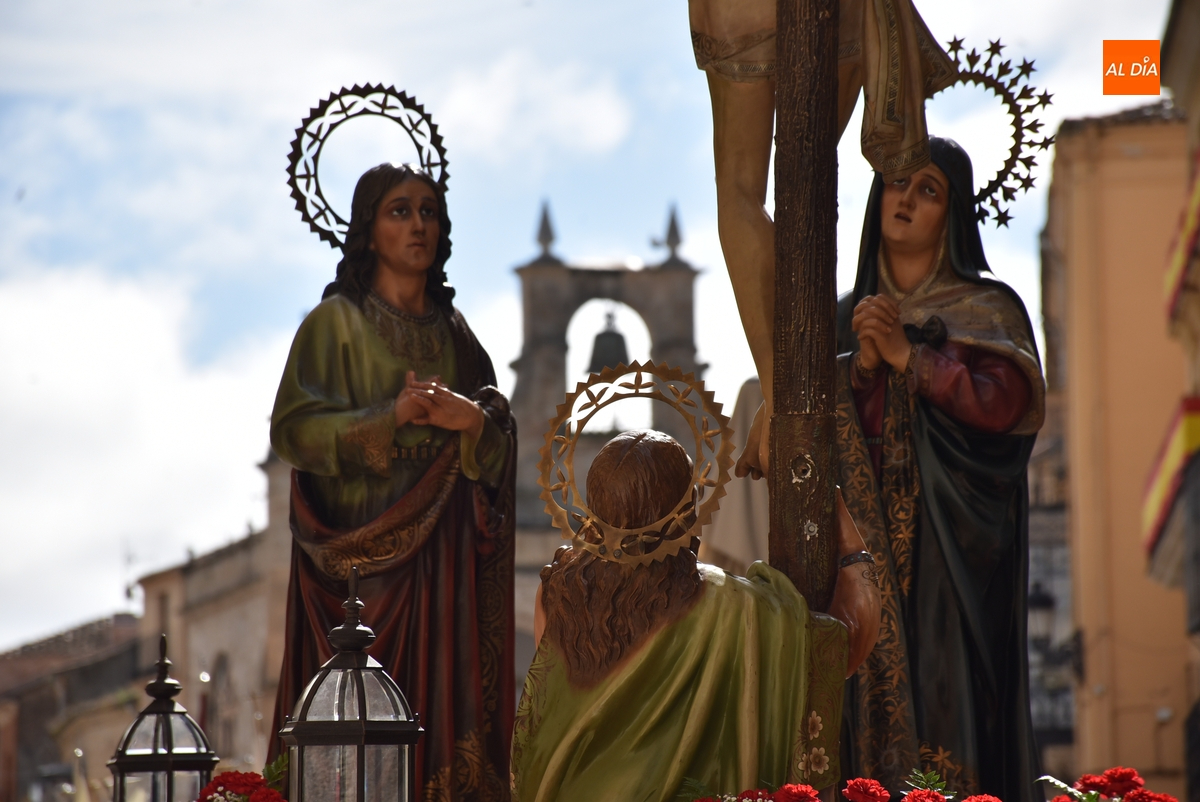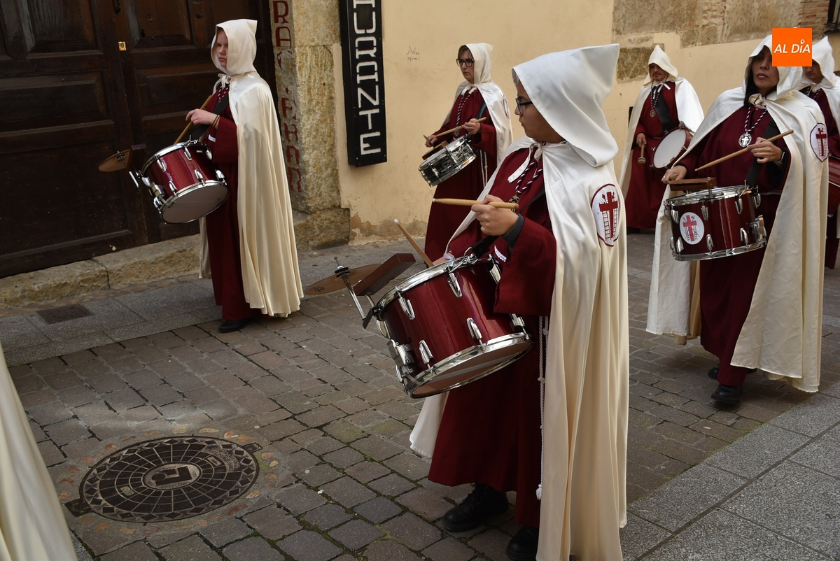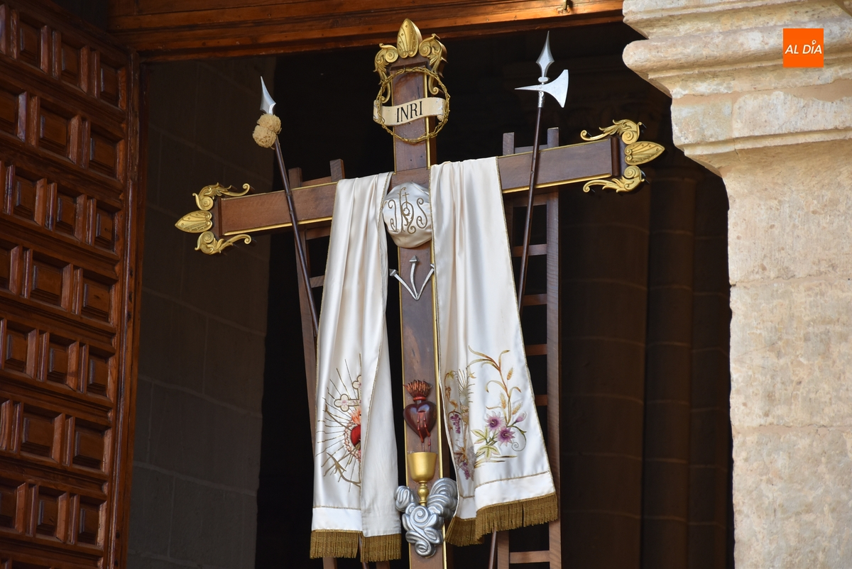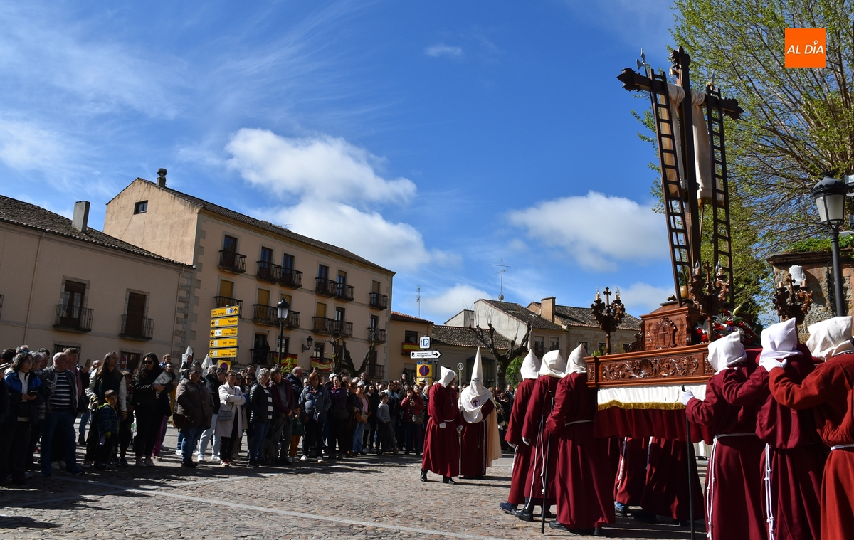 Asimismo, se demoró unos minutos por su complejidad la salida de los tres pasos de la Catedral: El Calvario y Nuestra Señora de la Cruz, al tener que cuadrar sus ruedas con las rampas de salida, y La Cruz, al tener que ser bajada en brazos para superar la bóveda de la Puerta de las Cadenas. Eso sí, una vez se puso en marcha, la procesión fue muy ágil, completando a muy buen ritmo el trayecto, cuya parte inicial transcurrió por la Plazuela de San Salvador, Díez Taravilla, Colada y la Plaza Mayor, donde habló desde la balconada de la Casa Consistorial el capellán de la entidad, Fernando Dias-Bailón.