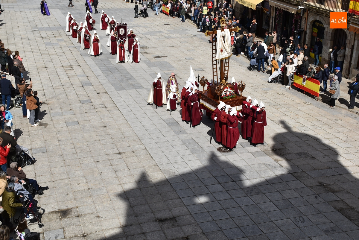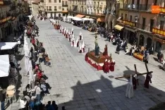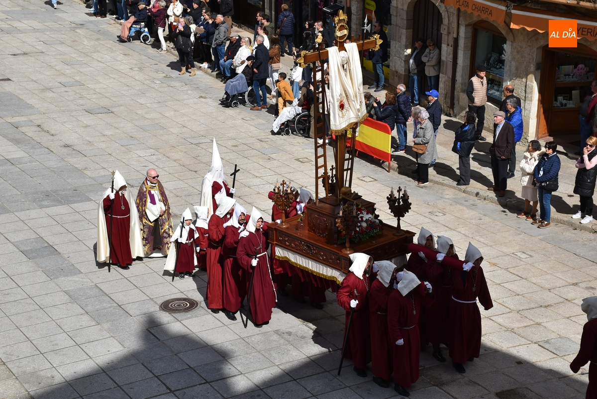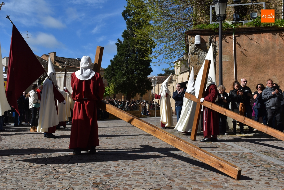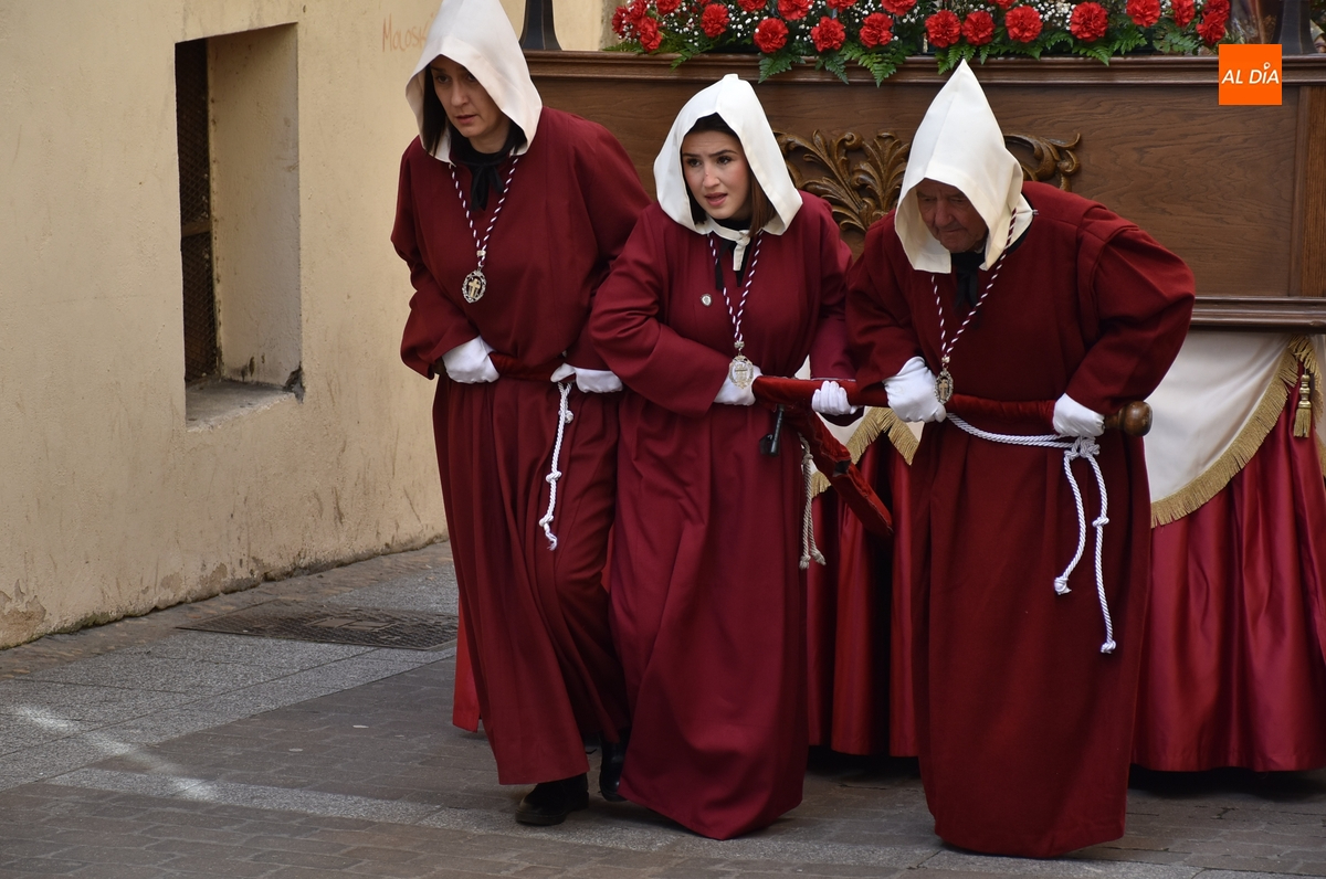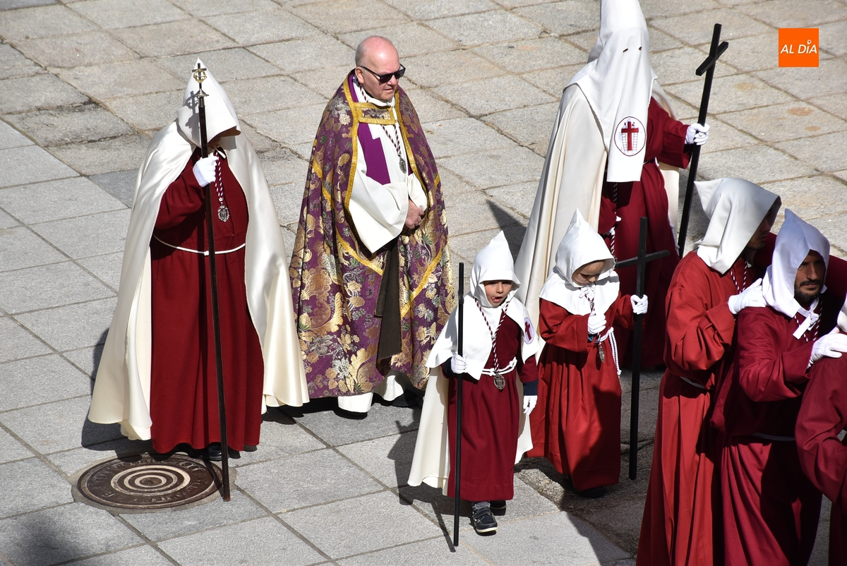 Asimismo, se demoró unos minutos por su complejidad la salida de los tres pasos de la Catedral: El Calvario y Nuestra Señora de la Cruz, al tener que cuadrar sus ruedas con las rampas de salida, y La Cruz, al tener que ser bajada en brazos para superar la bóveda de la Puerta de las Cadenas. Eso sí, una vez se puso en marcha, la procesión fue muy ágil, completando a muy buen ritmo el trayecto, cuya parte inicial transcurrió por la Plazuela de San Salvador, Díez Taravilla, Colada y la Plaza Mayor, donde habló desde la balconada de la Casa Consistorial el capellán de la entidad, Fernando Dias-Bailón.