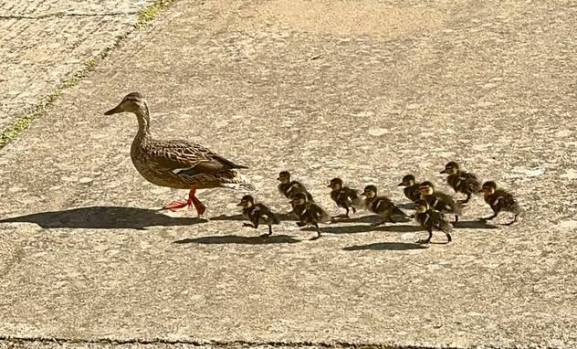 La calle Colonia Los Almendros fue escenario de una procesión a cargo de una mamá pato y sus patitos