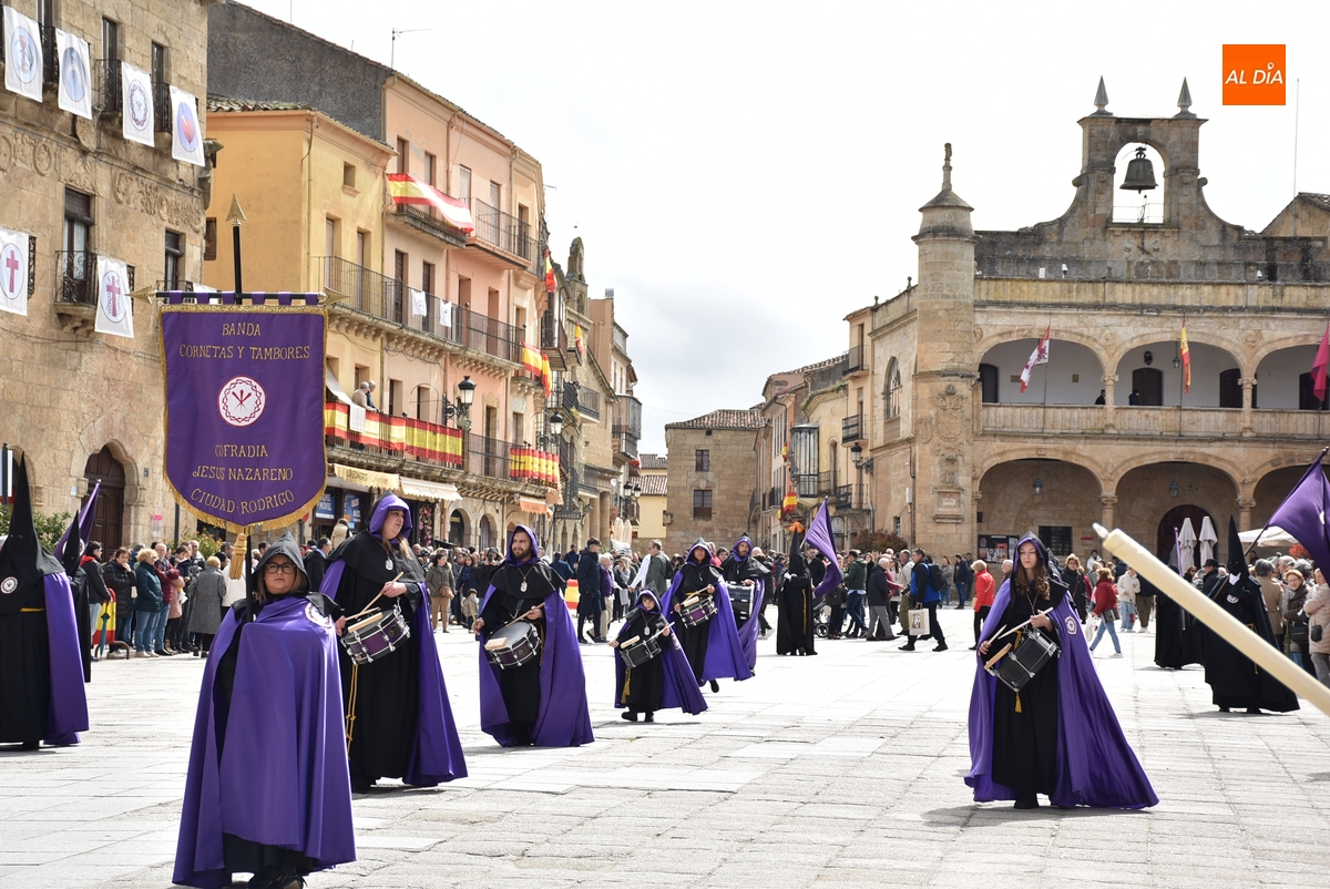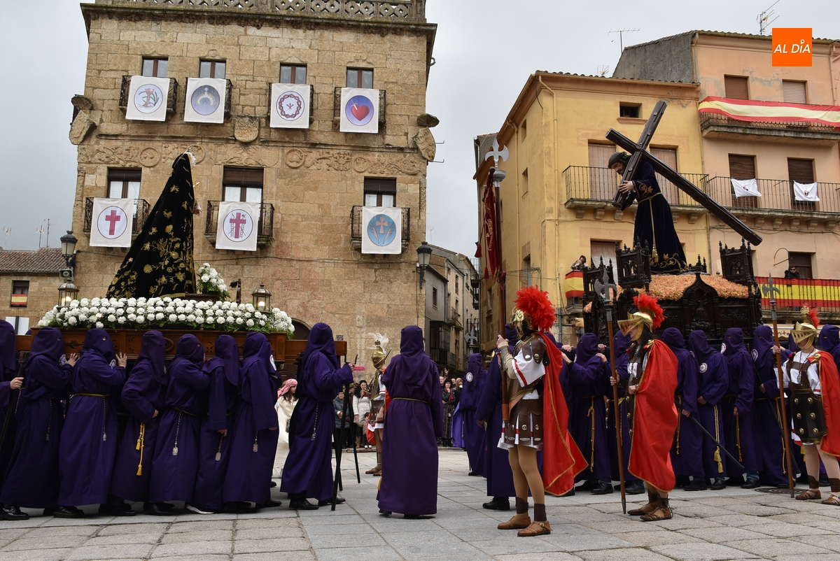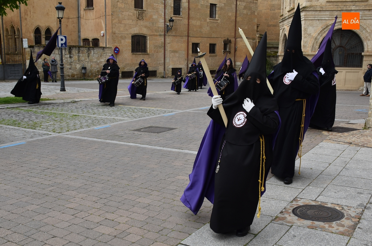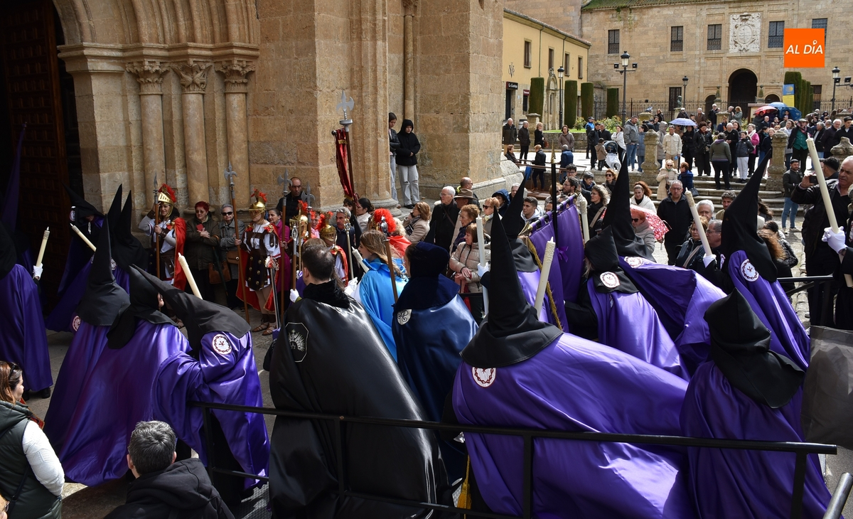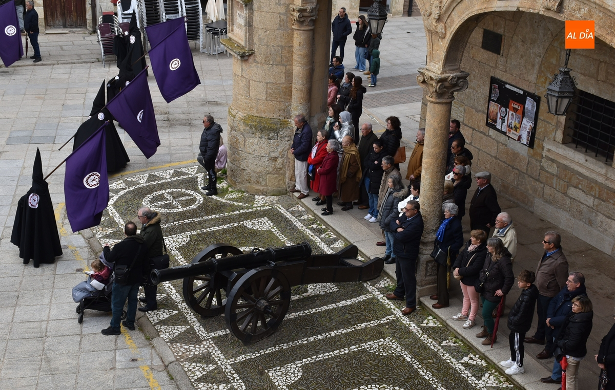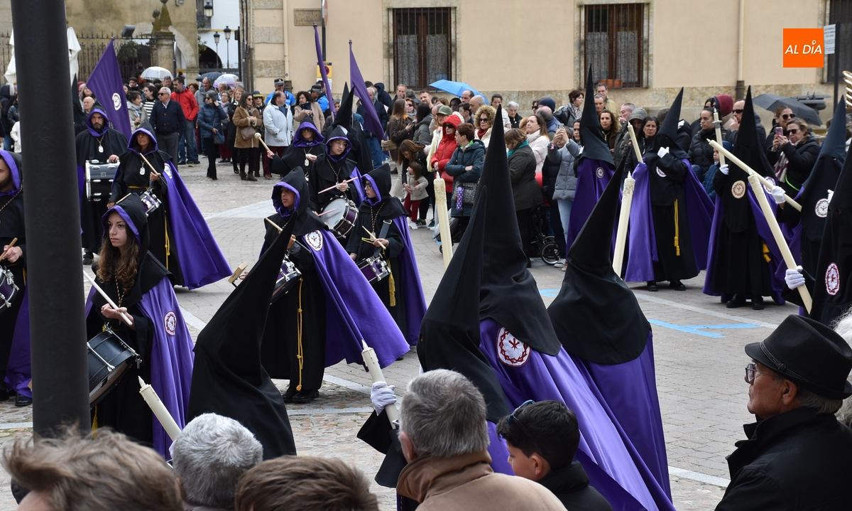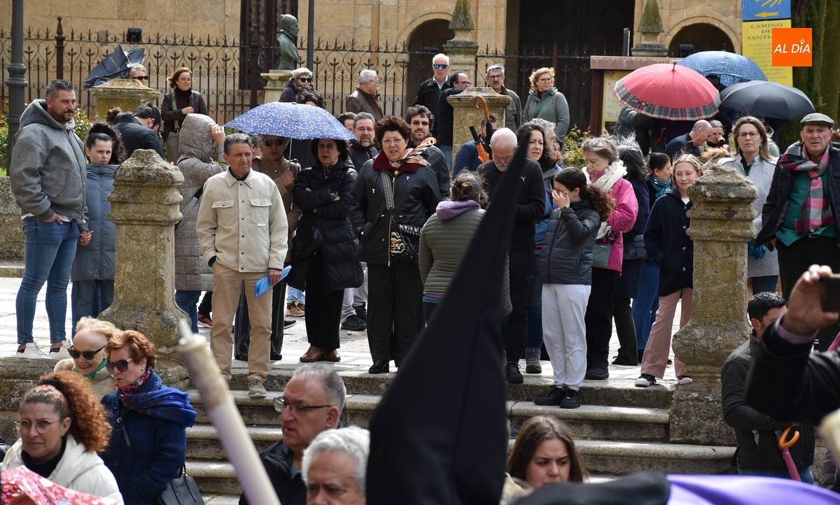 La jornada del Viernes Santo promete ser en su conjunto bastante complicada en el apartado meteorológico (como ya se pudo comprobar en el segundo tramo de la mañana), pero al menos Ciudad Rodrigo pudo disfrutar de la primera procesión del día, el histórico Encuentro a cargo de la Cofradía de Jesús Nazareno, que acabó realizando un cambio de trayecto para estar menos tiempo en la calle ante la amenaza de lluvia (que acabó cayendo).