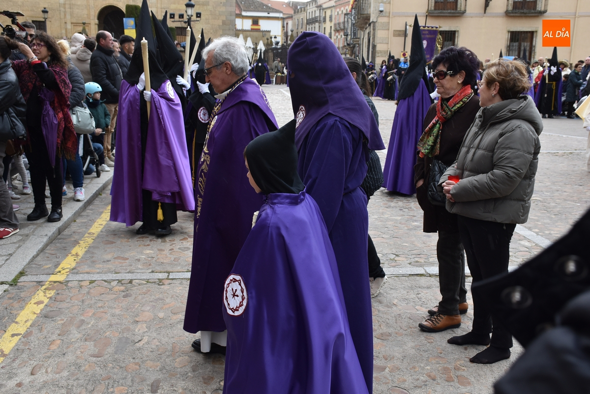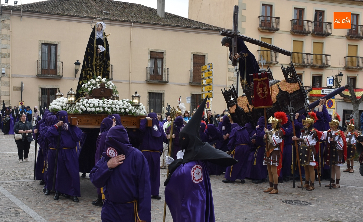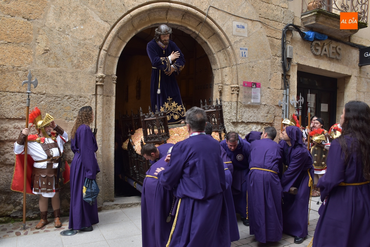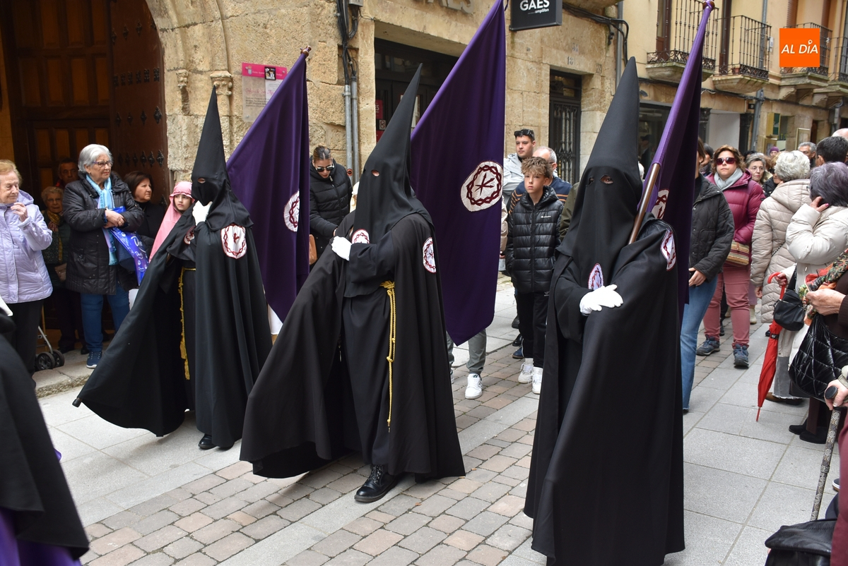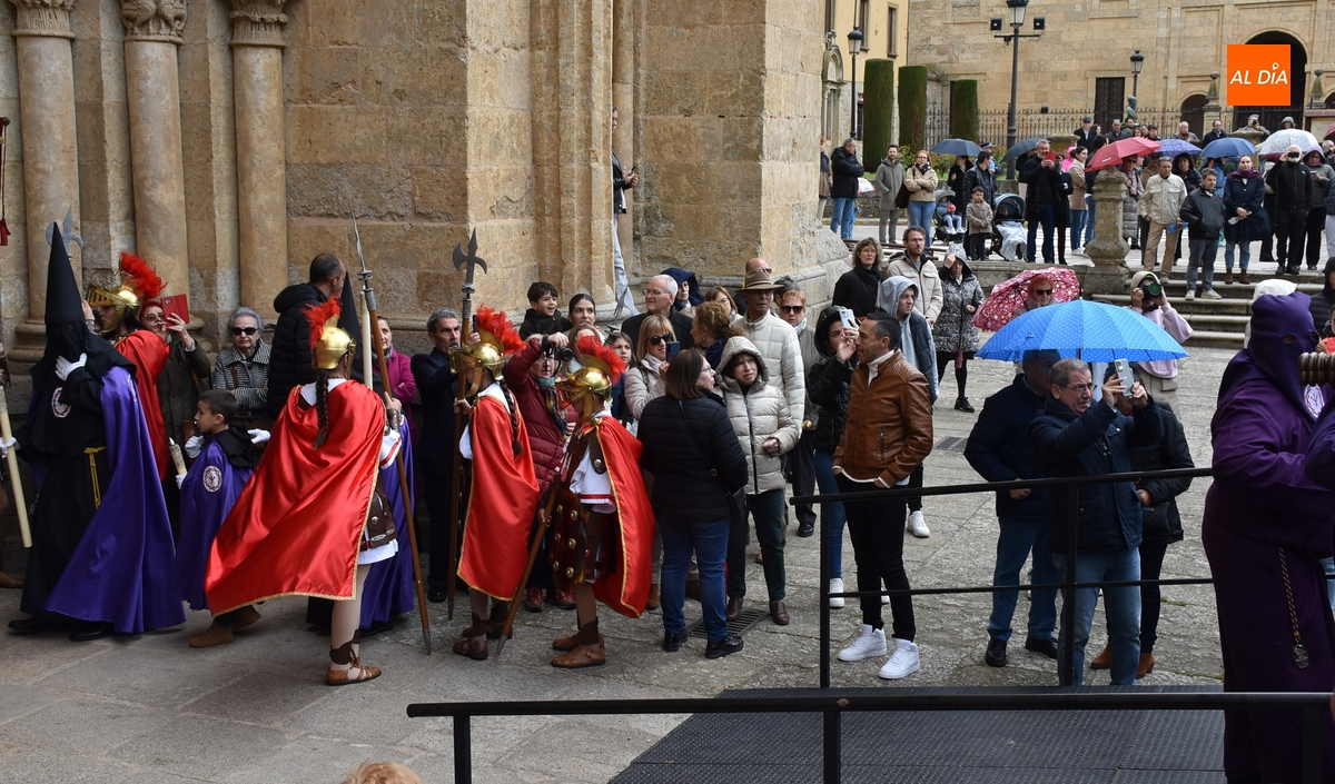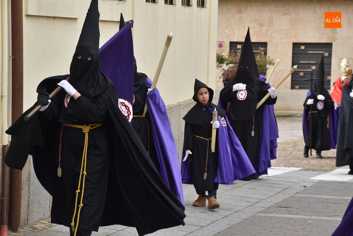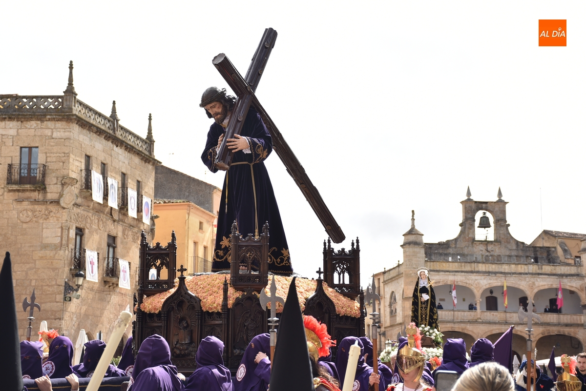 La jornada del Viernes Santo promete ser en su conjunto bastante complicada en el apartado meteorológico (como ya se pudo comprobar en el segundo tramo de la mañana), pero al menos Ciudad Rodrigo pudo disfrutar de la primera procesión del día, el histórico Encuentro a cargo de la Cofradía de Jesús Nazareno, que acabó realizando un cambio de trayecto para estar menos tiempo en la calle ante la amenaza de lluvia (que acabó cayendo).