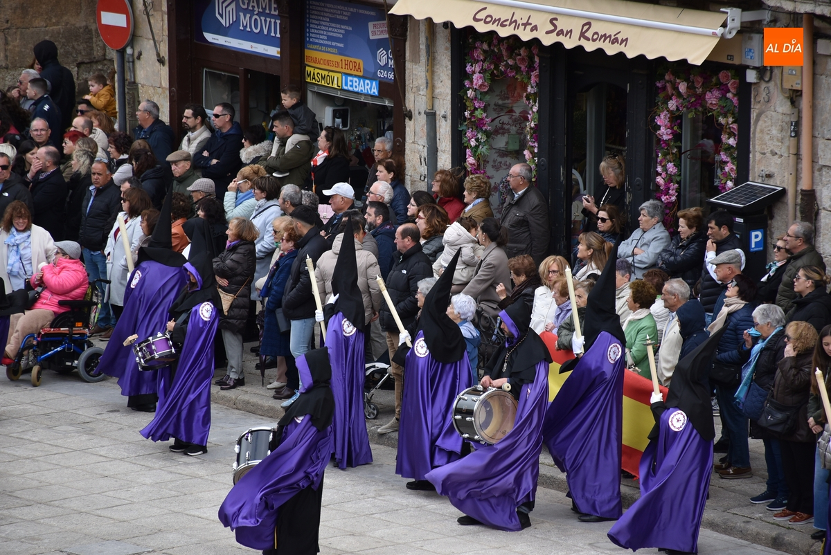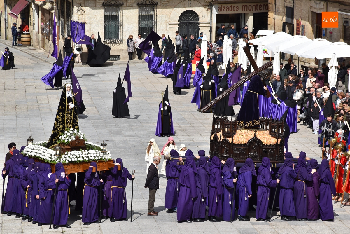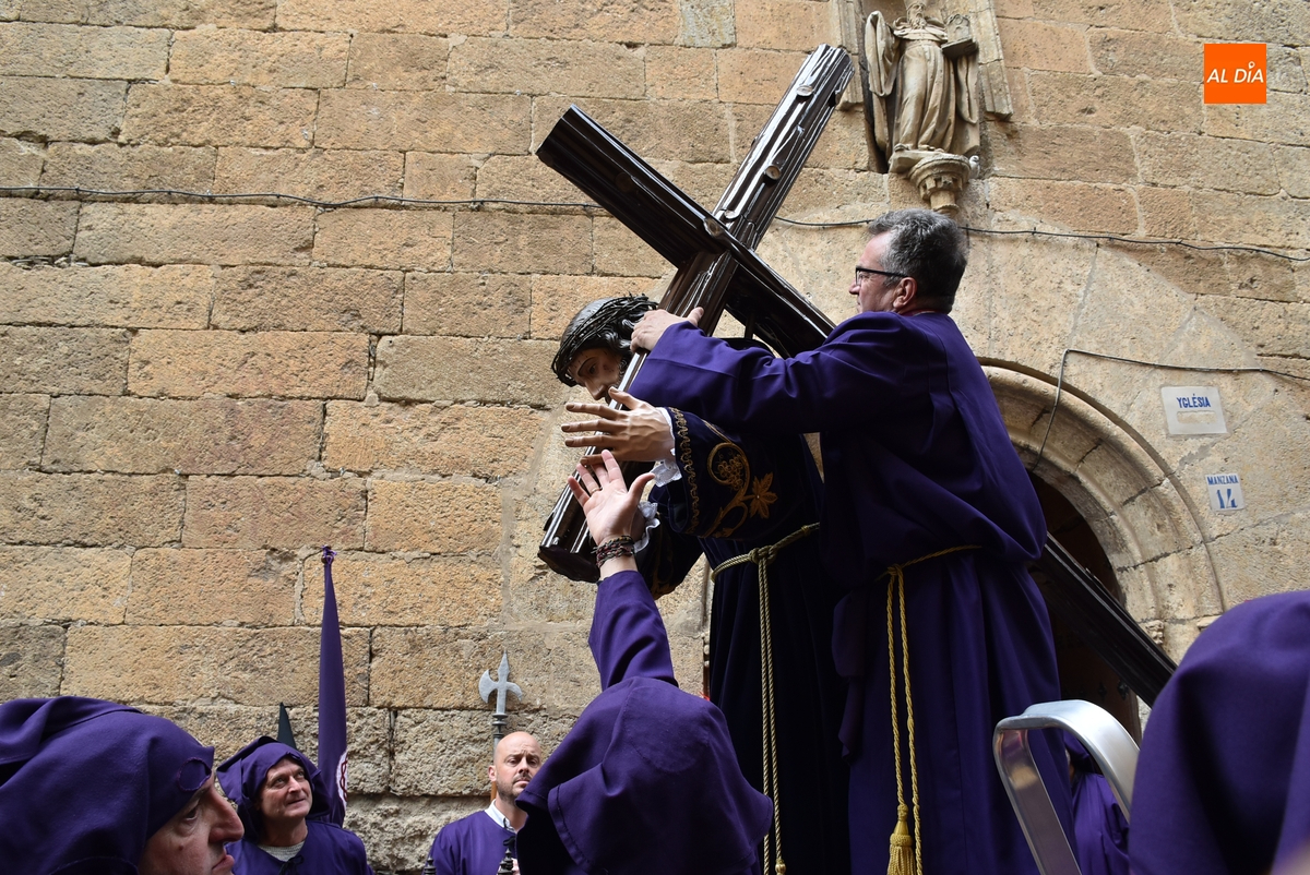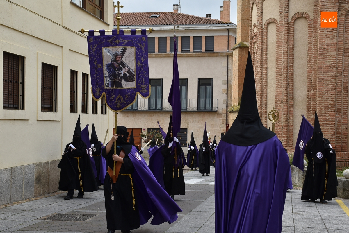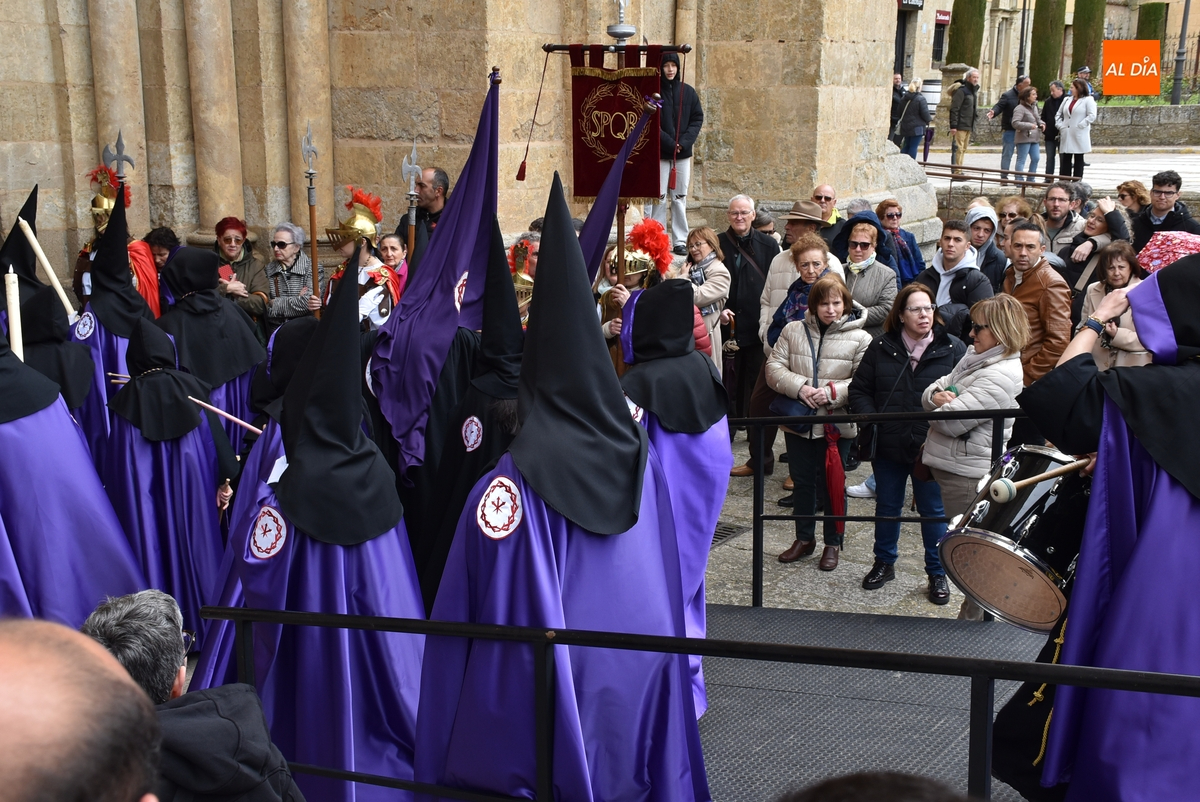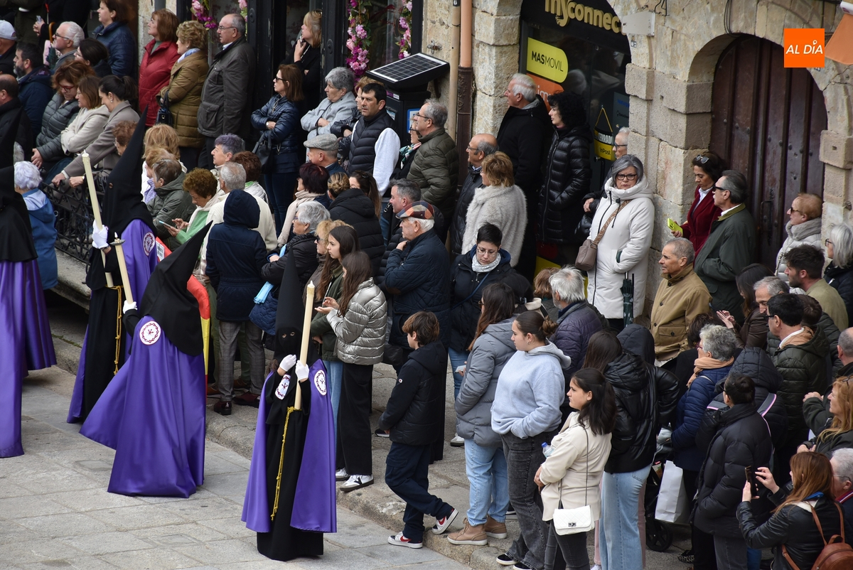 La jornada del Viernes Santo promete ser en su conjunto bastante complicada en el apartado meteorológico (como ya se pudo comprobar en el segundo tramo de la mañana), pero al menos Ciudad Rodrigo pudo disfrutar de la primera procesión del día, el histórico Encuentro a cargo de la Cofradía de Jesús Nazareno, que acabó realizando un cambio de trayecto para estar menos tiempo en la calle ante la amenaza de lluvia (que acabó cayendo).
