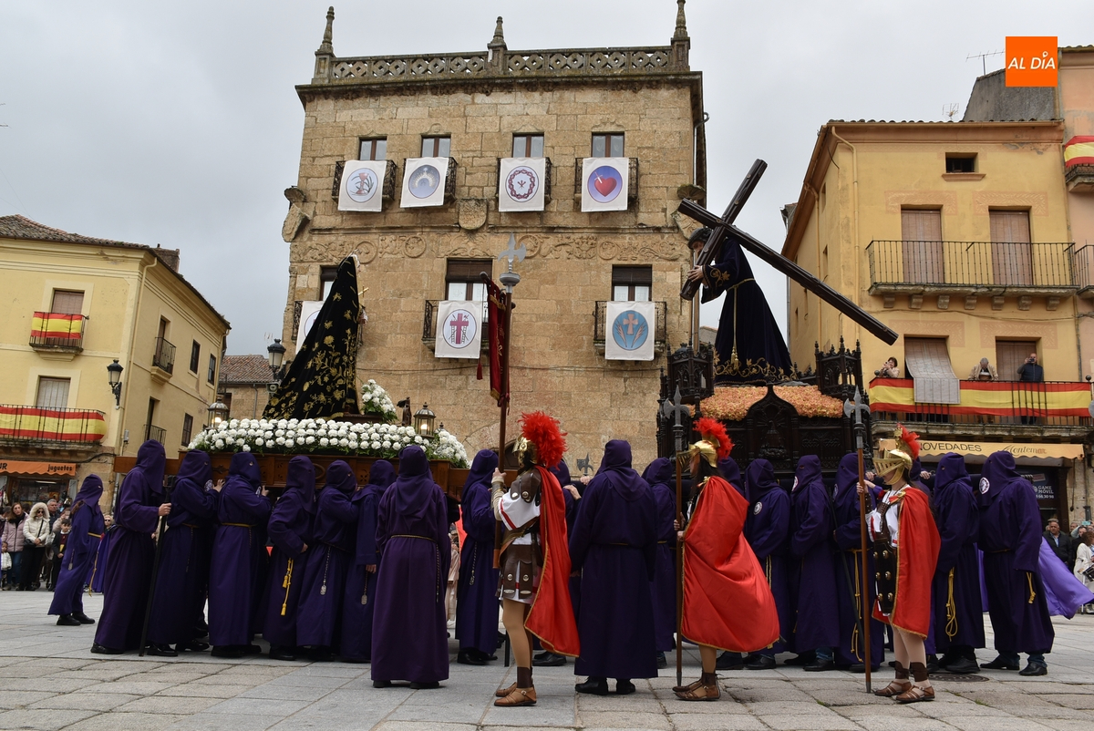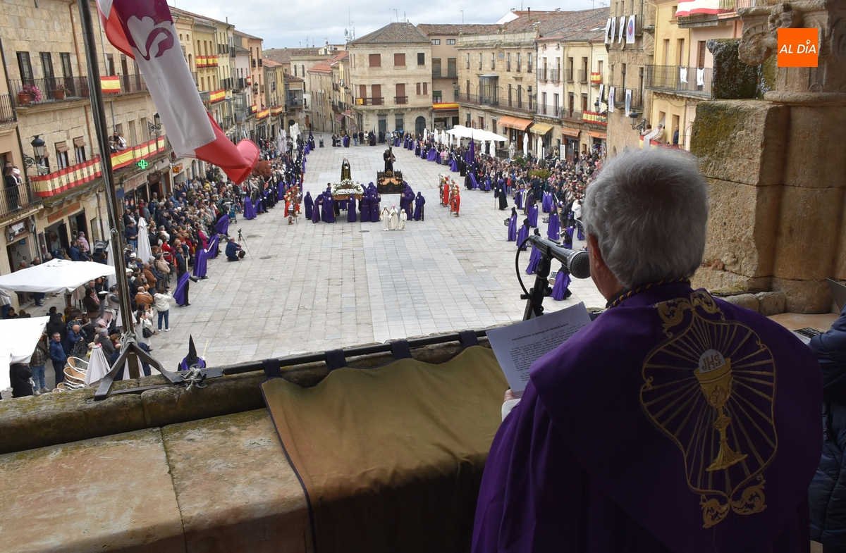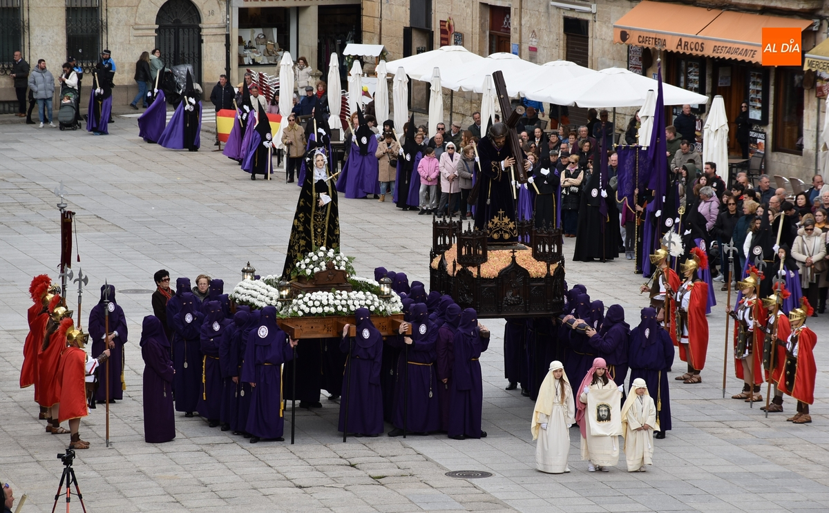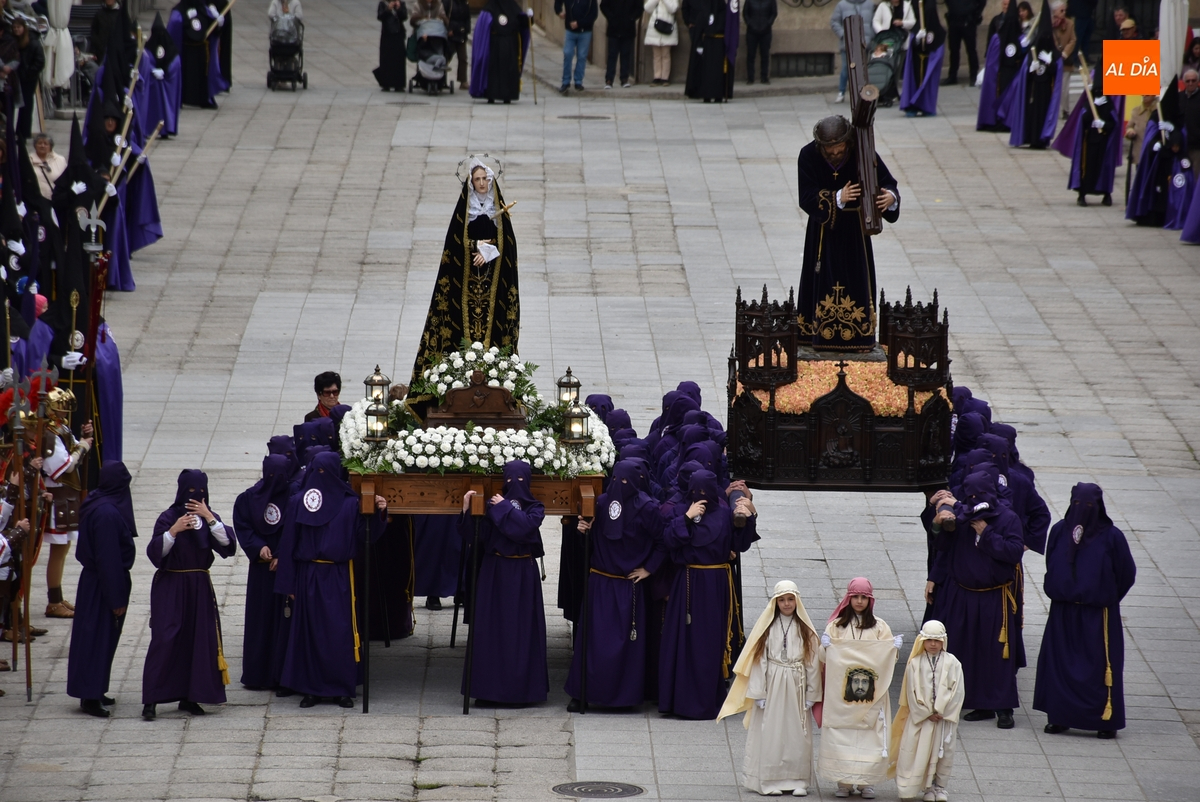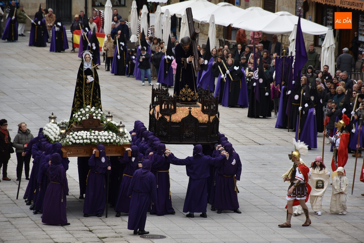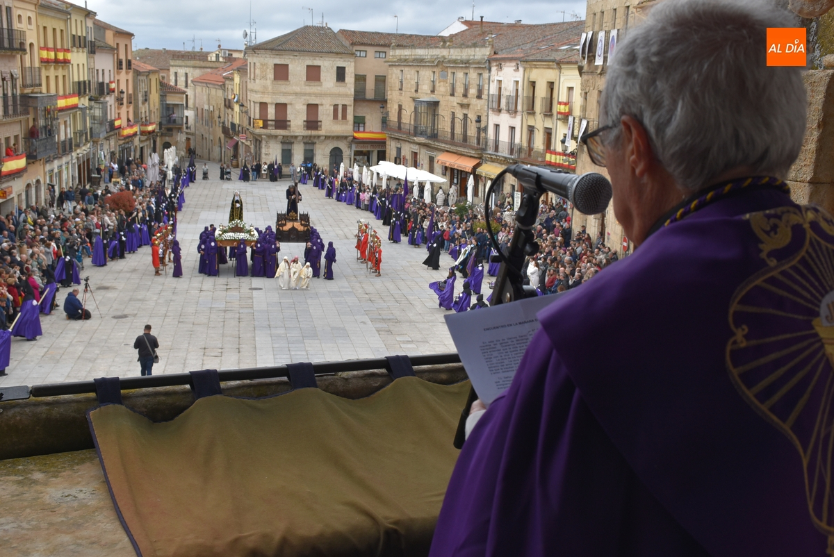 Con el cielo ya bastante oscuro, ambos pasos hicieron su entrada en la Plaza Mayor, haciendo el Nazareno una primera parada en la parte superior para que la Verónica le limpiase el rostro, tras lo cual se incorporaron al desfile tres niñas. Mientras caía un ligero chispeo durante algunos segundos, el Nazareno avanzó hasta encontrarse en el centro del ágora con La Dolorosa, mirando ambos hacia la Casa Consistorial para escuchar la reflexión (en torno a las madres) del capellán de la Cofradía, Manolo Peláez.