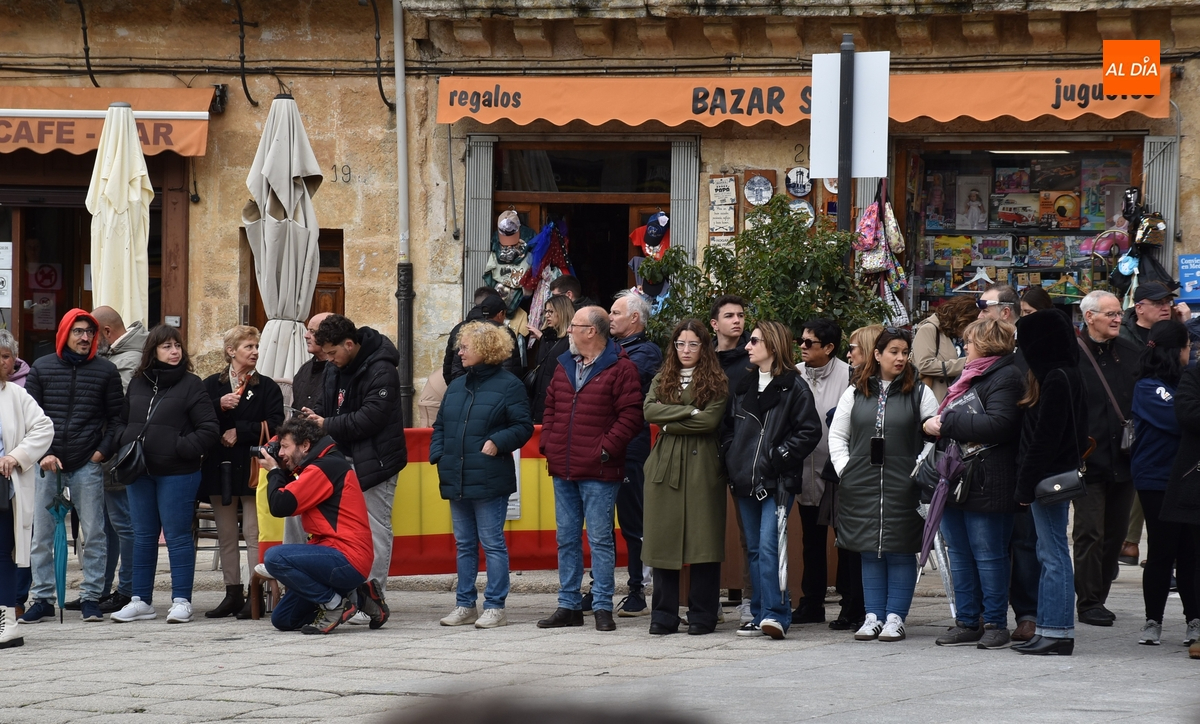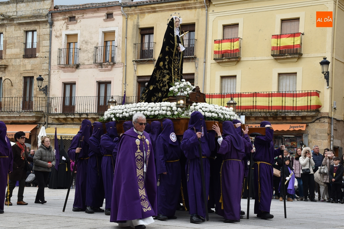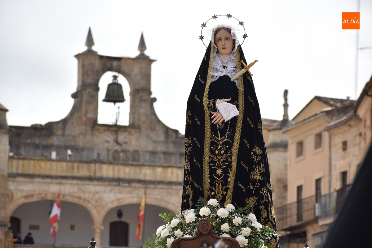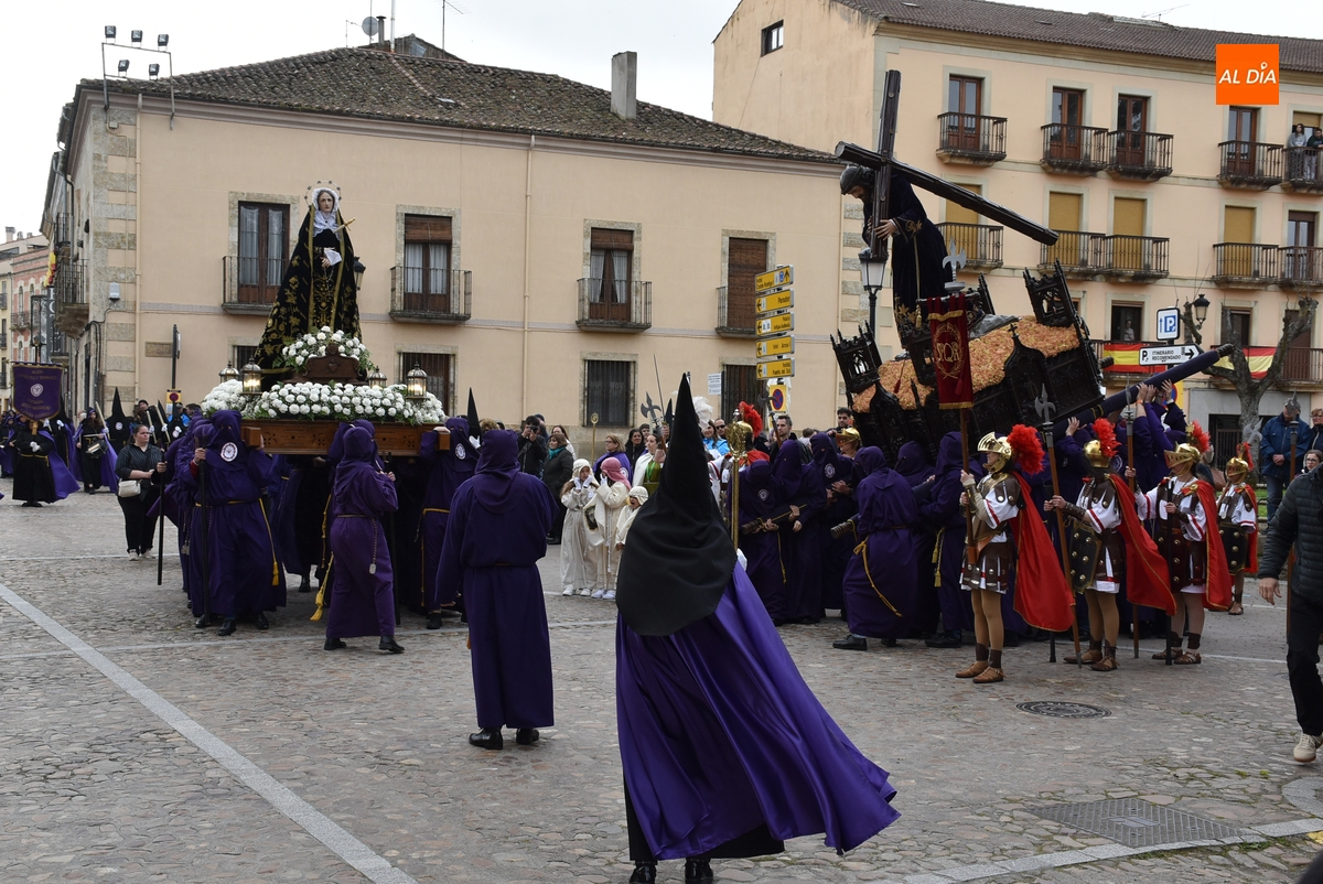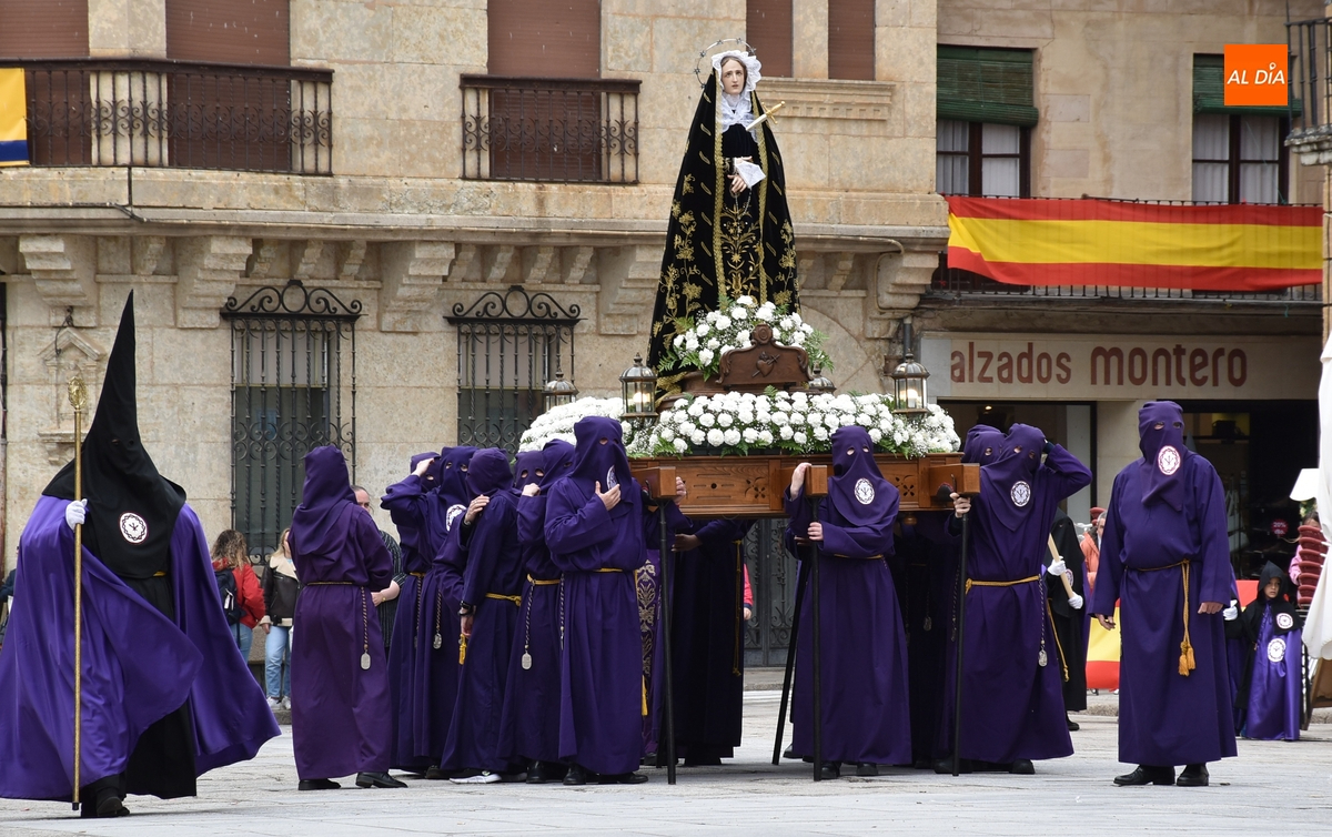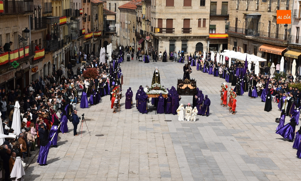 Con el cielo ya bastante oscuro, ambos pasos hicieron su entrada en la Plaza Mayor, haciendo el Nazareno una primera parada en la parte superior para que la Verónica le limpiase el rostro, tras lo cual se incorporaron al desfile tres niñas. Mientras caía un ligero chispeo durante algunos segundos, el Nazareno avanzó hasta encontrarse en el centro del ágora con La Dolorosa, mirando ambos hacia la Casa Consistorial para escuchar la reflexión (en torno a las madres) del capellán de la Cofradía, Manolo Peláez.