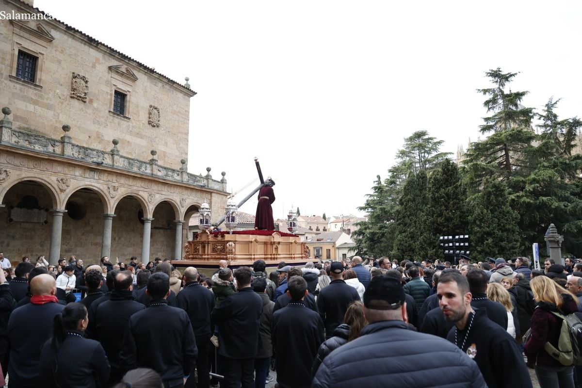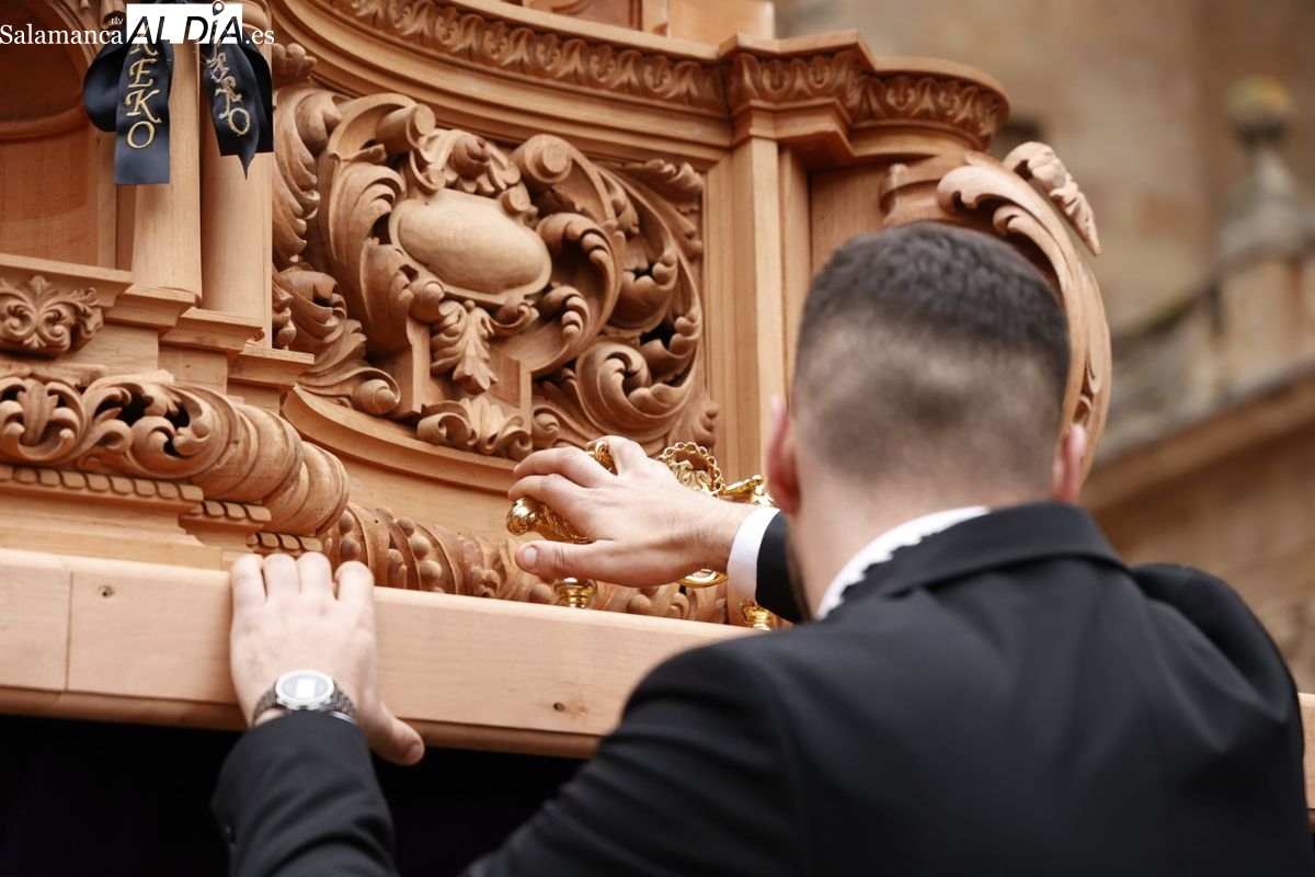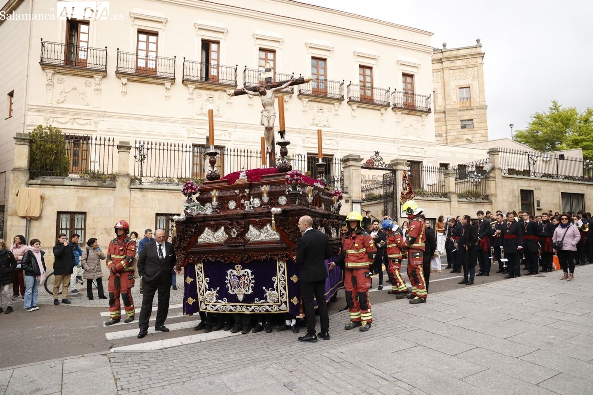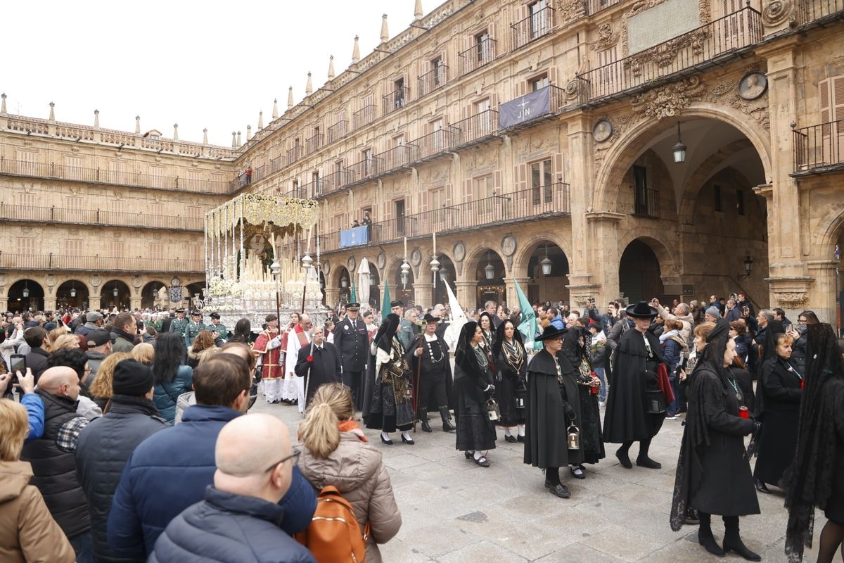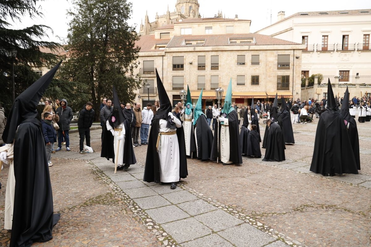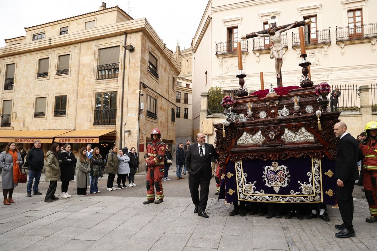 El Santísimo Cristo de la Buena Muerte, Nuestro Padre Jesús de la Pasión, Nuestra Señora de los Dolores y Nuestra Señora de la Esperanza han regresado esta mañana a su templo, el Convento de San Esteban, tras un recorrido solemne de seis horas por el casco histórico salmantino: Plaza del Concilio de Trento, Calle San Pablo, Calle Palominos, Rúa Mayor, Plaza de Anaya, S.I.B Catedral Nueva (entrada por la puerta de Ramos, salida por la puerta del Obispo), Calle Calderón de la Barca, Calle Libreros, Plaza de San Isidro, Calle de la Compañía, Calle Meléndez, Plaza del Corrillo, Plaza Mayor, Plaza del Poeta Iglesias, Calle San Pablo, Plaza Concilio de Trento y Atrio de San Esteban.