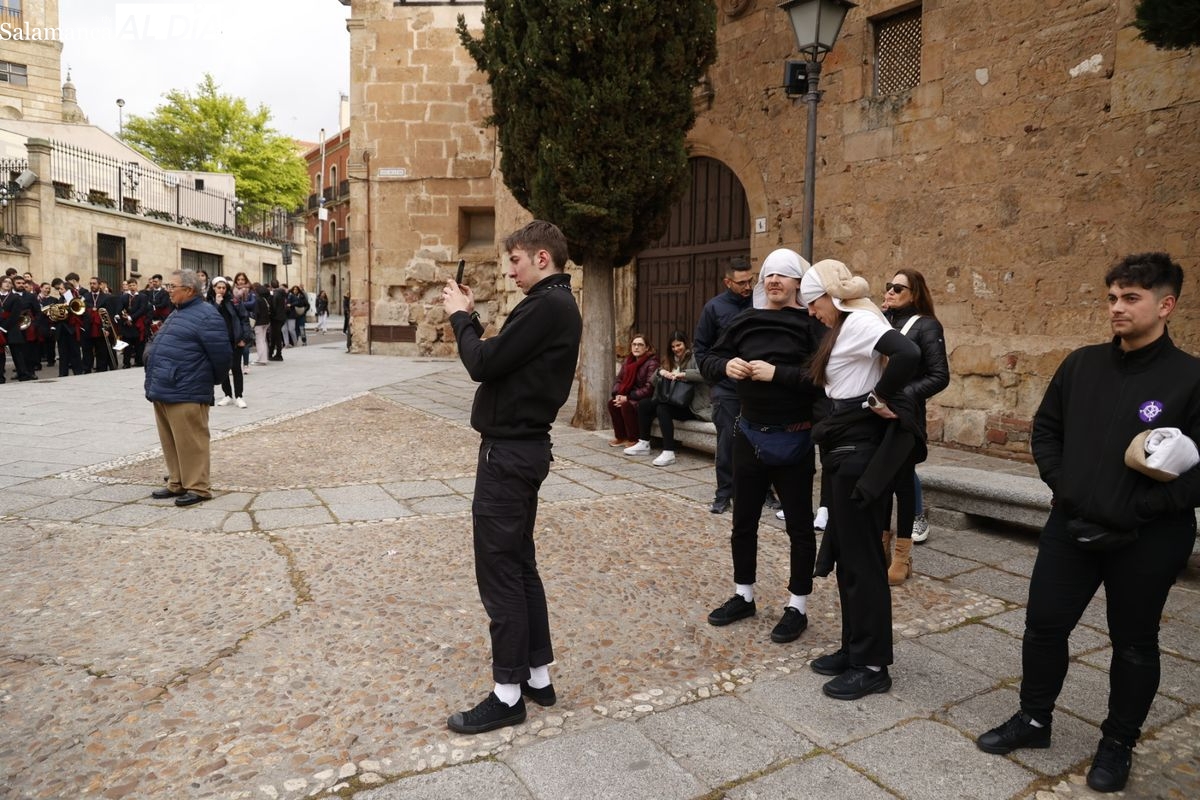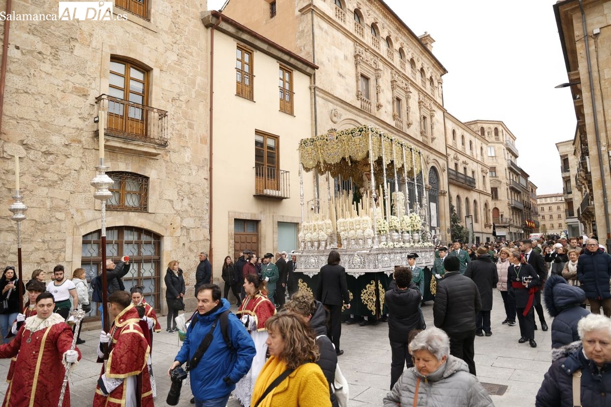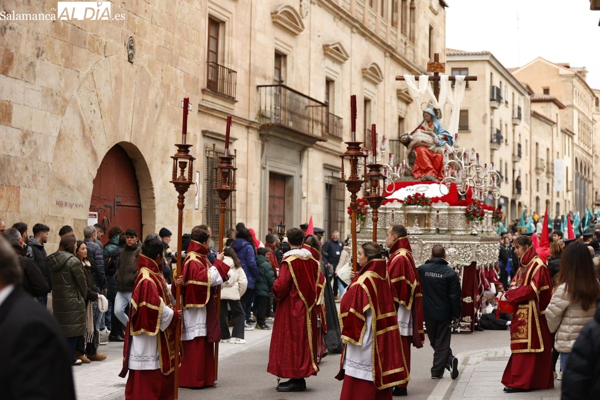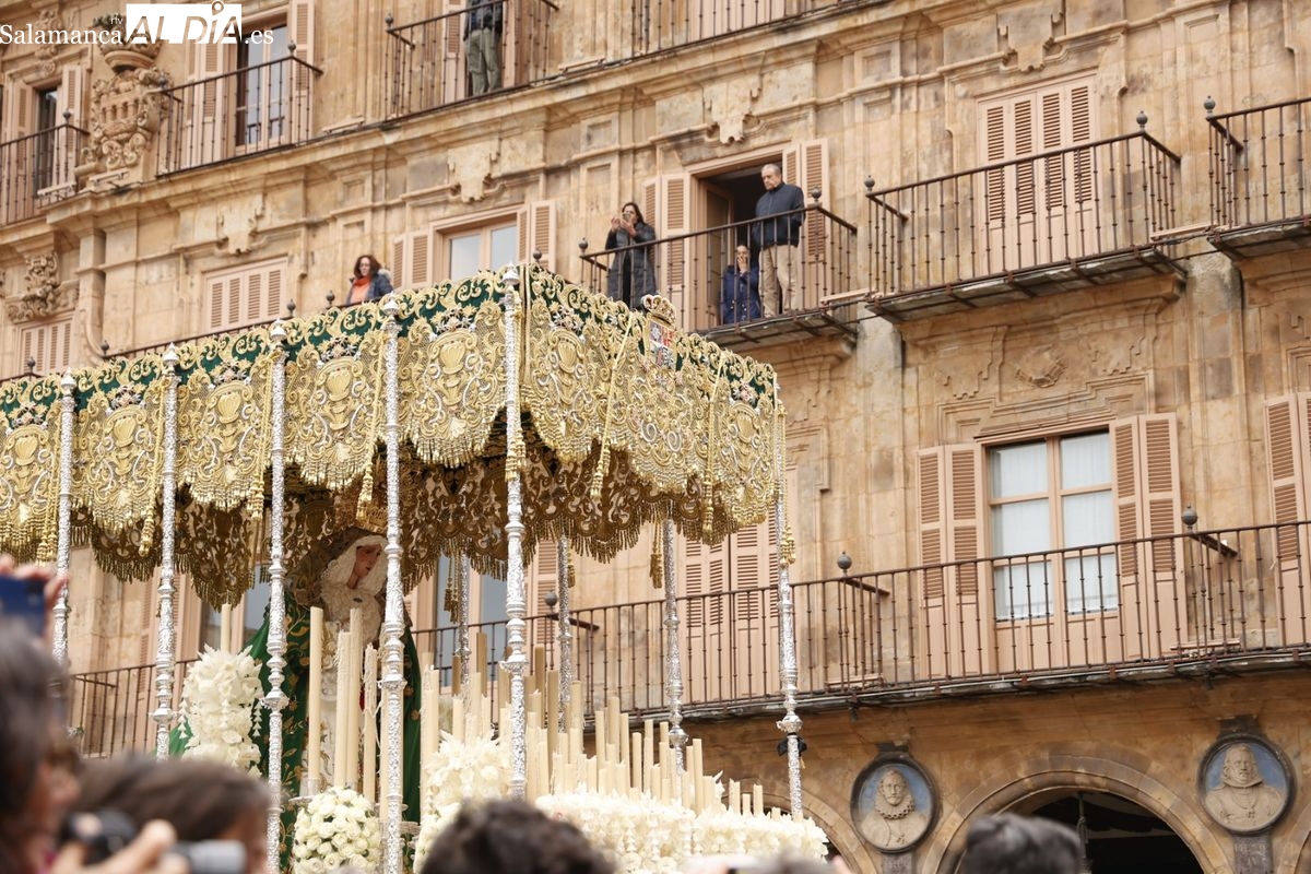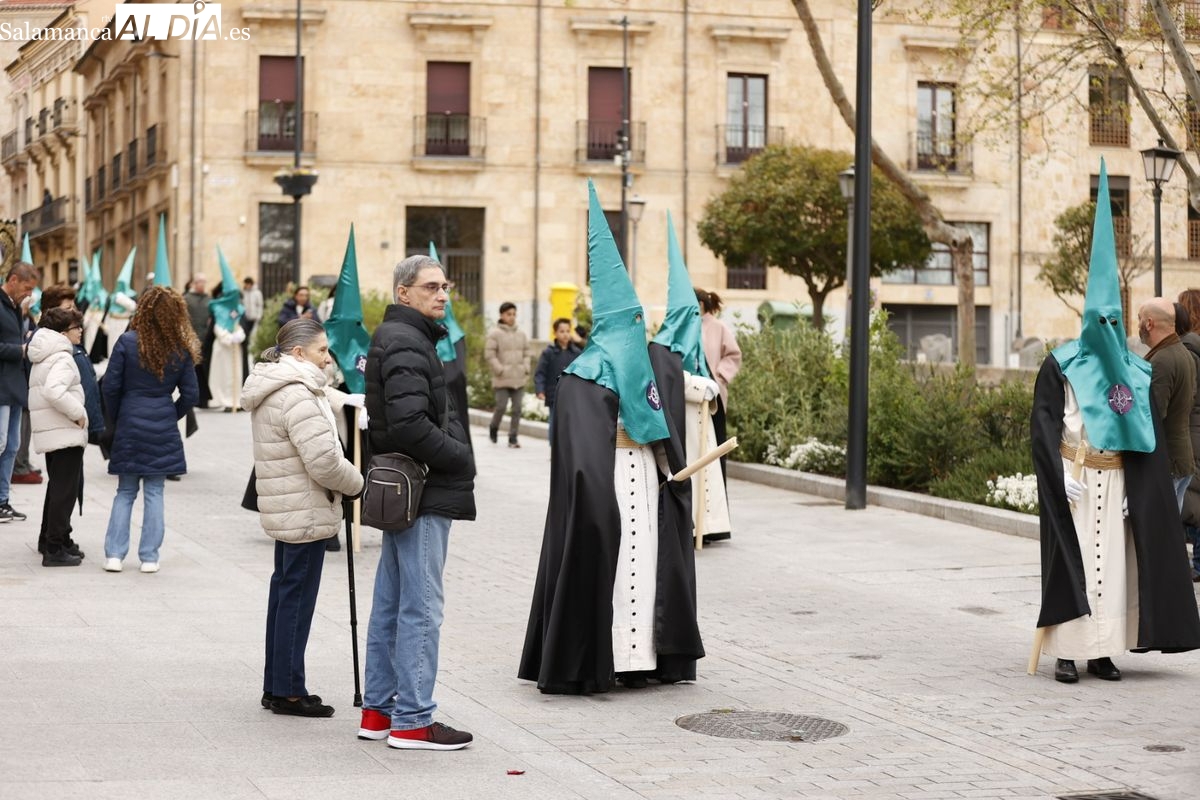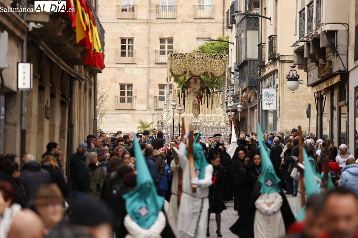 El Santísimo Cristo de la Buena Muerte, Nuestro Padre Jesús de la Pasión, Nuestra Señora de los Dolores y Nuestra Señora de la Esperanza han regresado esta mañana a su templo, el Convento de San Esteban, tras un recorrido solemne de seis horas por el casco histórico salmantino: Plaza del Concilio de Trento, Calle San Pablo, Calle Palominos, Rúa Mayor, Plaza de Anaya, S.I.B Catedral Nueva (entrada por la puerta de Ramos, salida por la puerta del Obispo), Calle Calderón de la Barca, Calle Libreros, Plaza de San Isidro, Calle de la Compañía, Calle Meléndez, Plaza del Corrillo, Plaza Mayor, Plaza del Poeta Iglesias, Calle San Pablo, Plaza Concilio de Trento y Atrio de San Esteban.