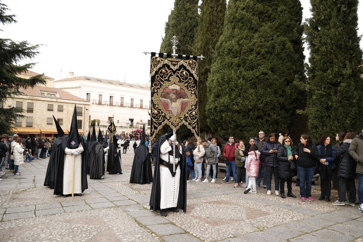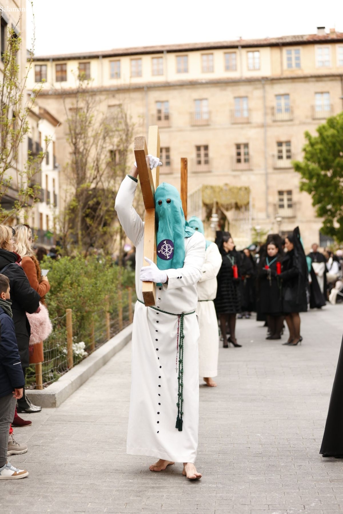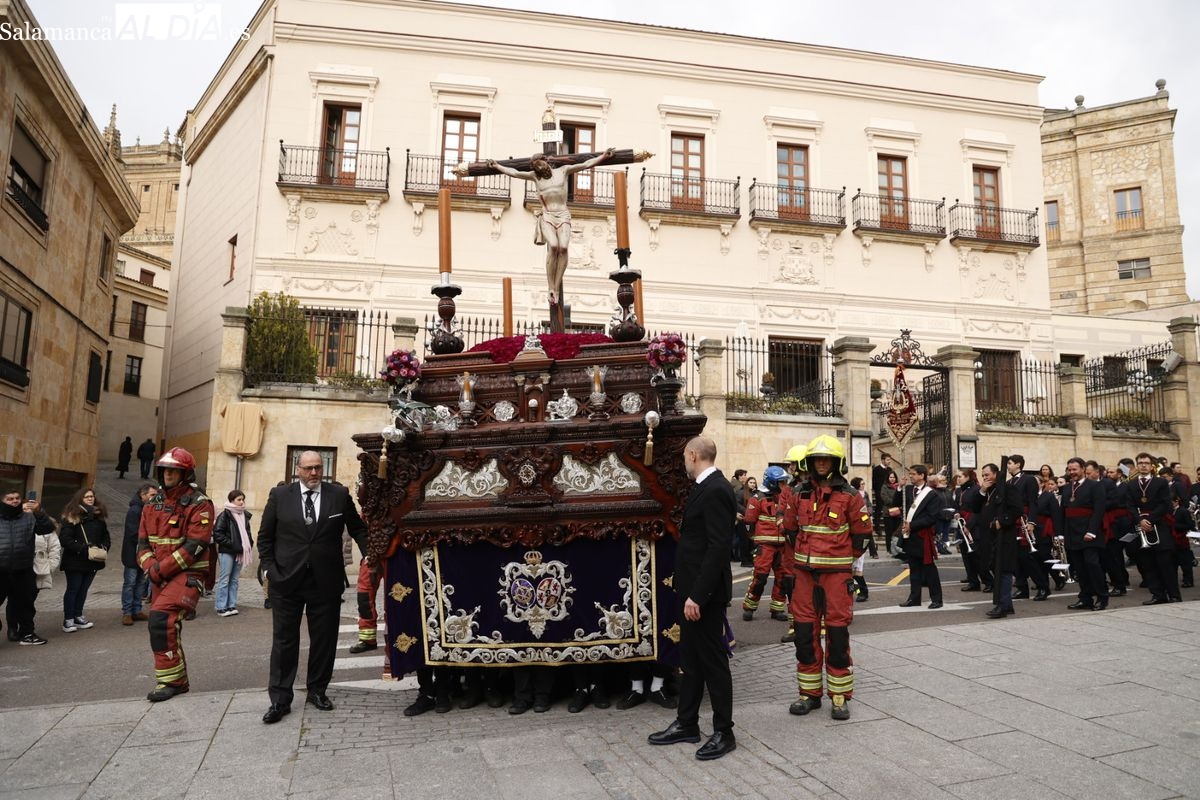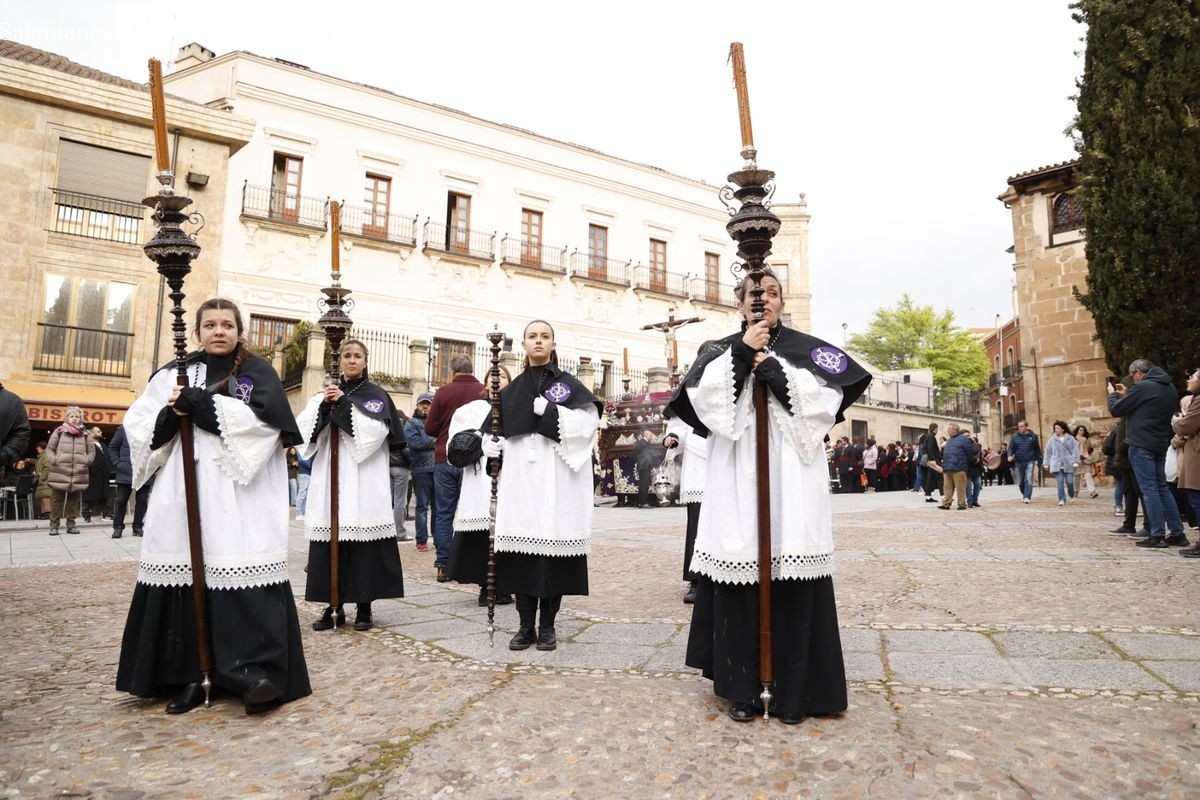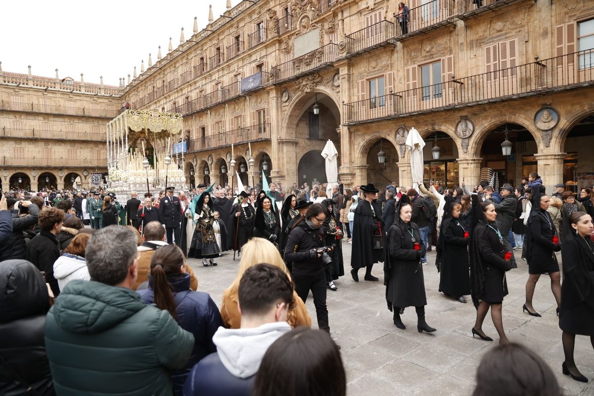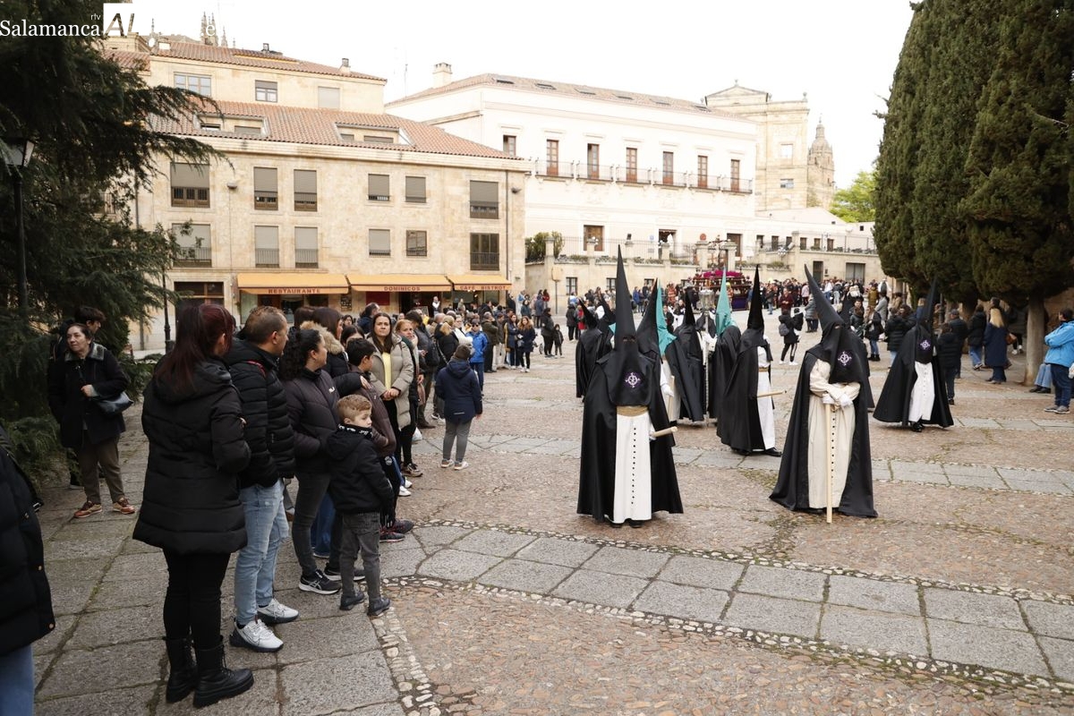 El Santísimo Cristo de la Buena Muerte, Nuestro Padre Jesús de la Pasión, Nuestra Señora de los Dolores y Nuestra Señora de la Esperanza han regresado esta mañana a su templo, el Convento de San Esteban, tras un recorrido solemne de seis horas por el casco histórico salmantino: Plaza del Concilio de Trento, Calle San Pablo, Calle Palominos, Rúa Mayor, Plaza de Anaya, S.I.B Catedral Nueva (entrada por la puerta de Ramos, salida por la puerta del Obispo), Calle Calderón de la Barca, Calle Libreros, Plaza de San Isidro, Calle de la Compañía, Calle Meléndez, Plaza del Corrillo, Plaza Mayor, Plaza del Poeta Iglesias, Calle San Pablo, Plaza Concilio de Trento y Atrio de San Esteban.