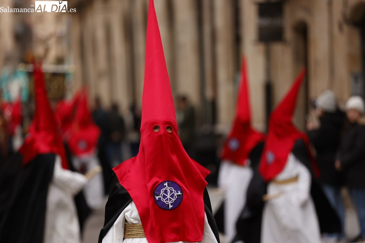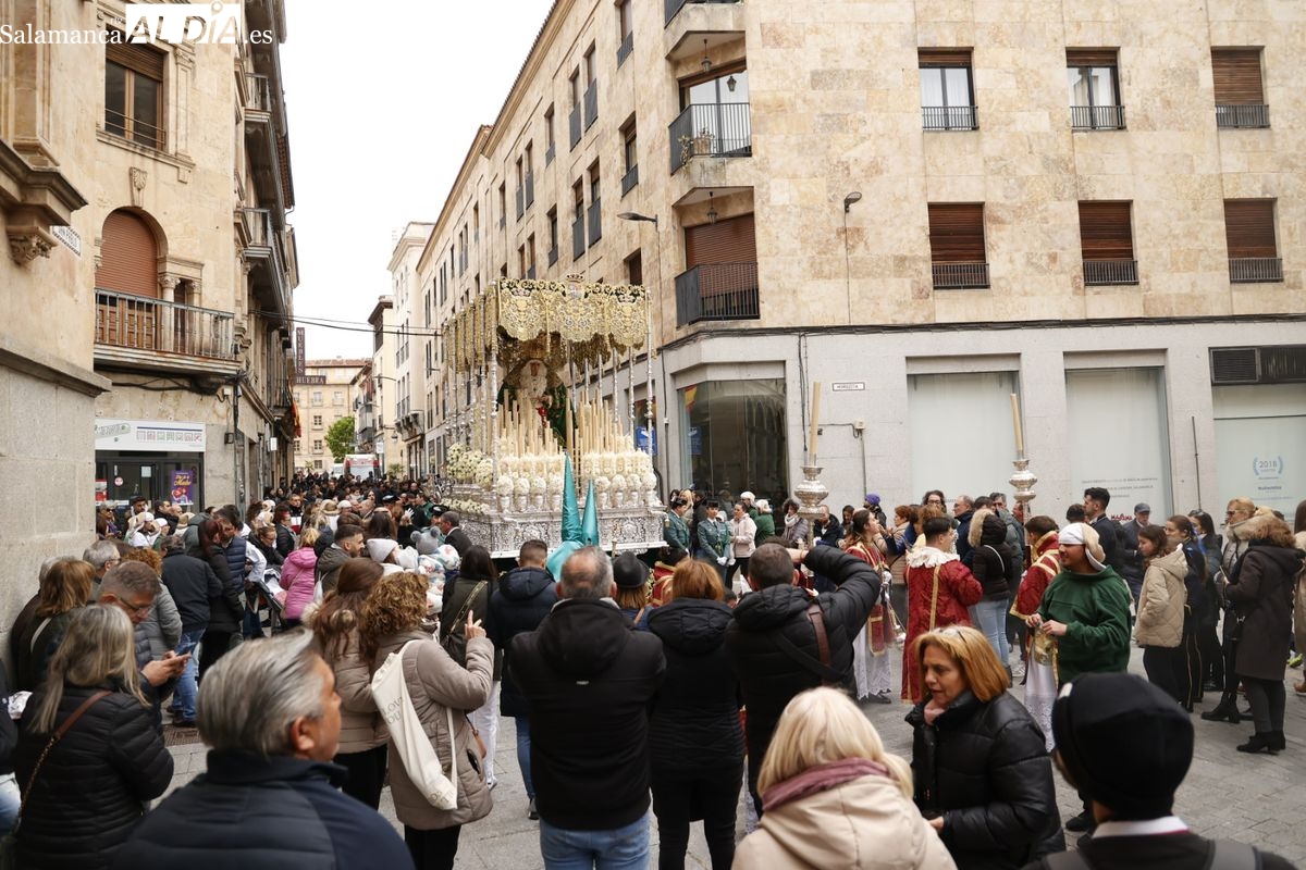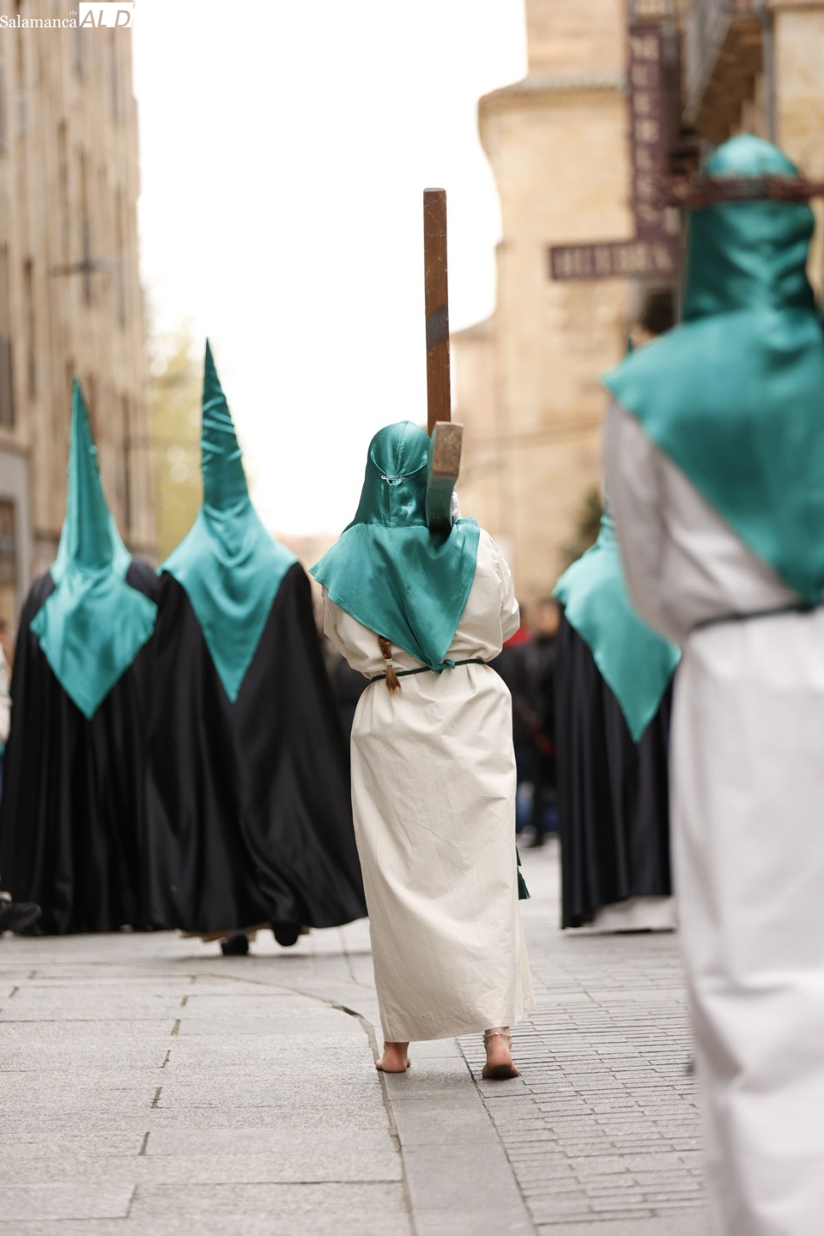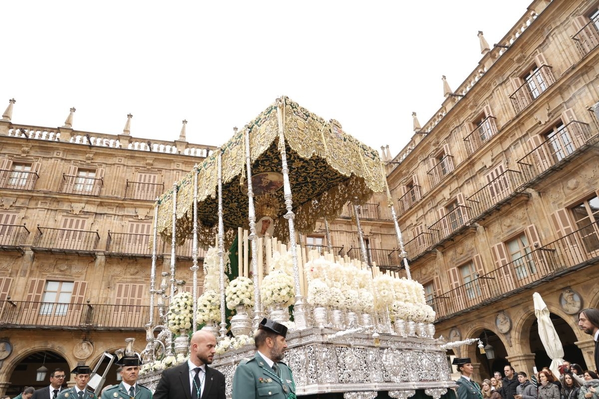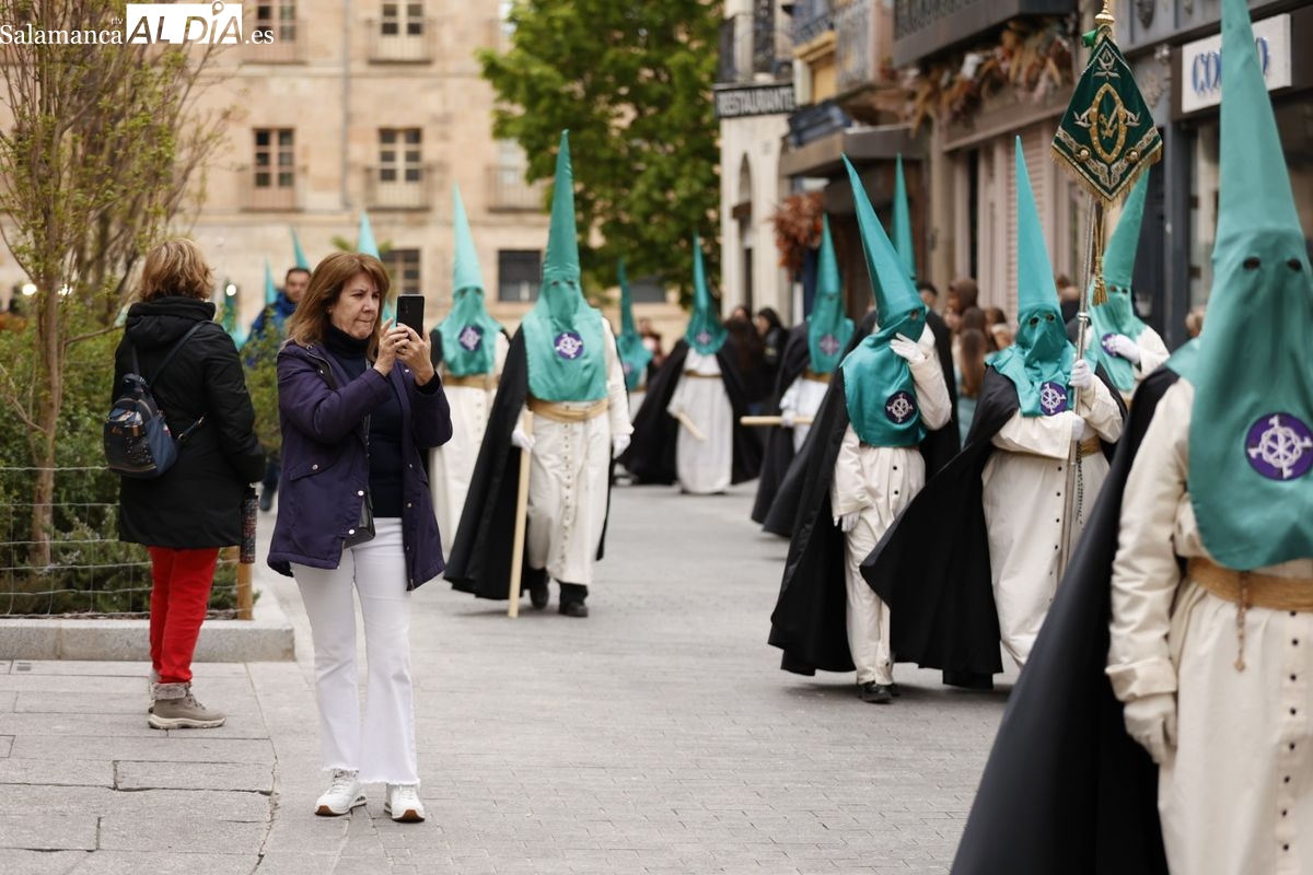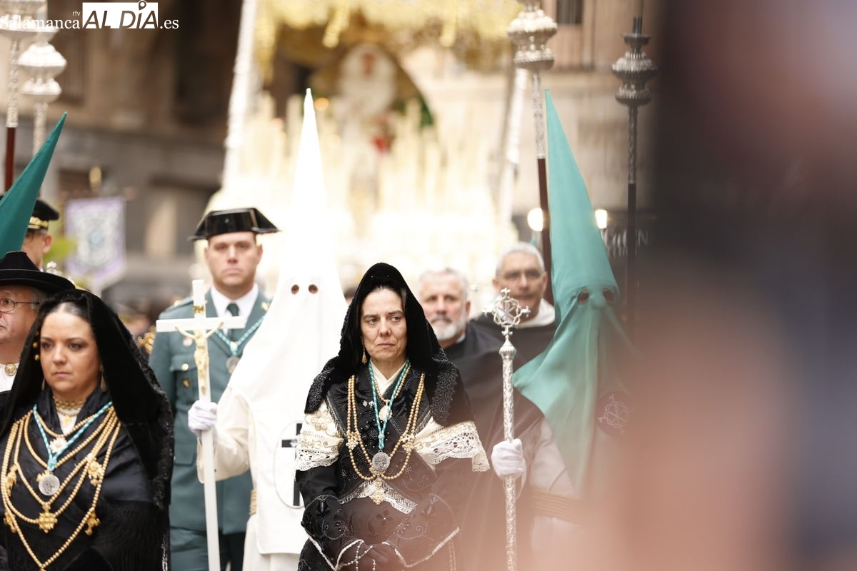 El Santísimo Cristo de la Buena Muerte, Nuestro Padre Jesús de la Pasión, Nuestra Señora de los Dolores y Nuestra Señora de la Esperanza han regresado esta mañana a su templo, el Convento de San Esteban, tras un recorrido solemne de seis horas por el casco histórico salmantino: Plaza del Concilio de Trento, Calle San Pablo, Calle Palominos, Rúa Mayor, Plaza de Anaya, S.I.B Catedral Nueva (entrada por la puerta de Ramos, salida por la puerta del Obispo), Calle Calderón de la Barca, Calle Libreros, Plaza de San Isidro, Calle de la Compañía, Calle Meléndez, Plaza del Corrillo, Plaza Mayor, Plaza del Poeta Iglesias, Calle San Pablo, Plaza Concilio de Trento y Atrio de San Esteban.