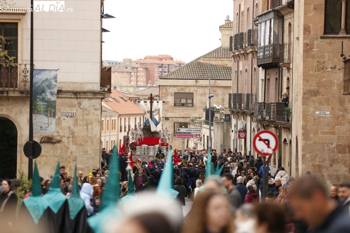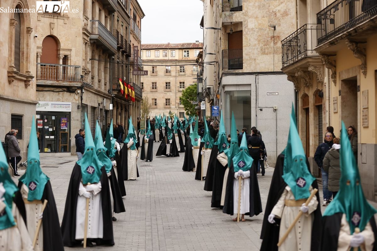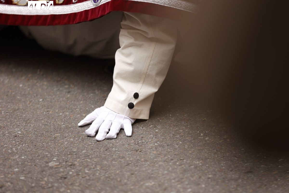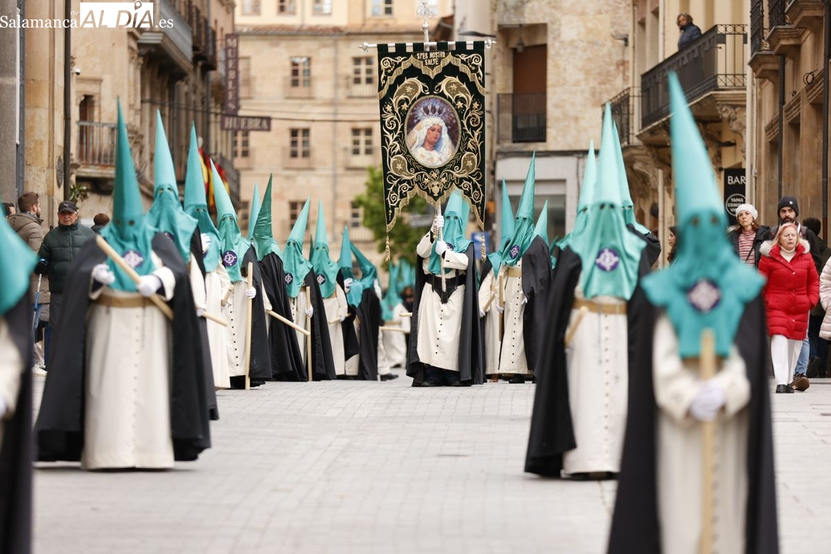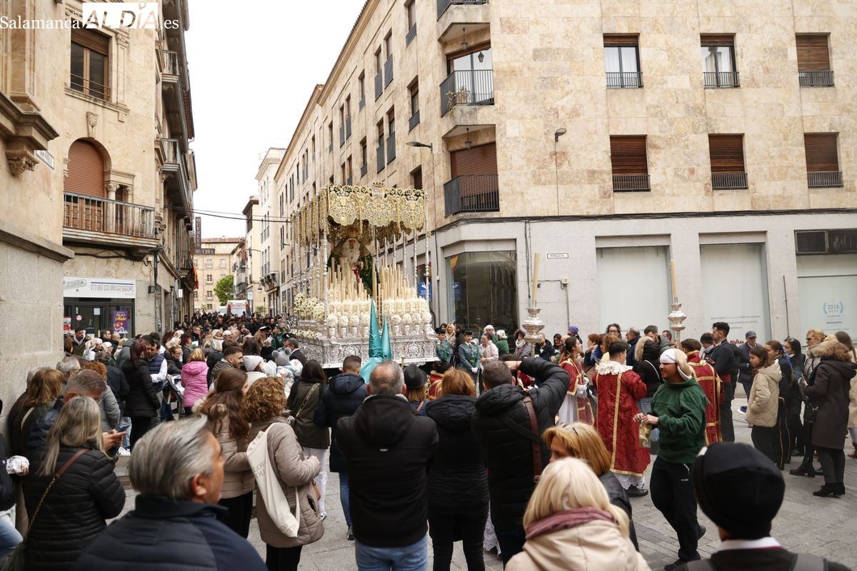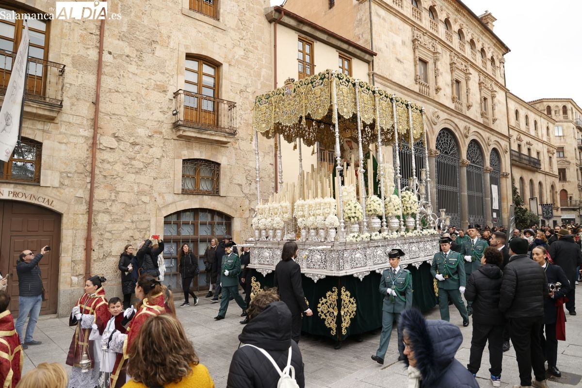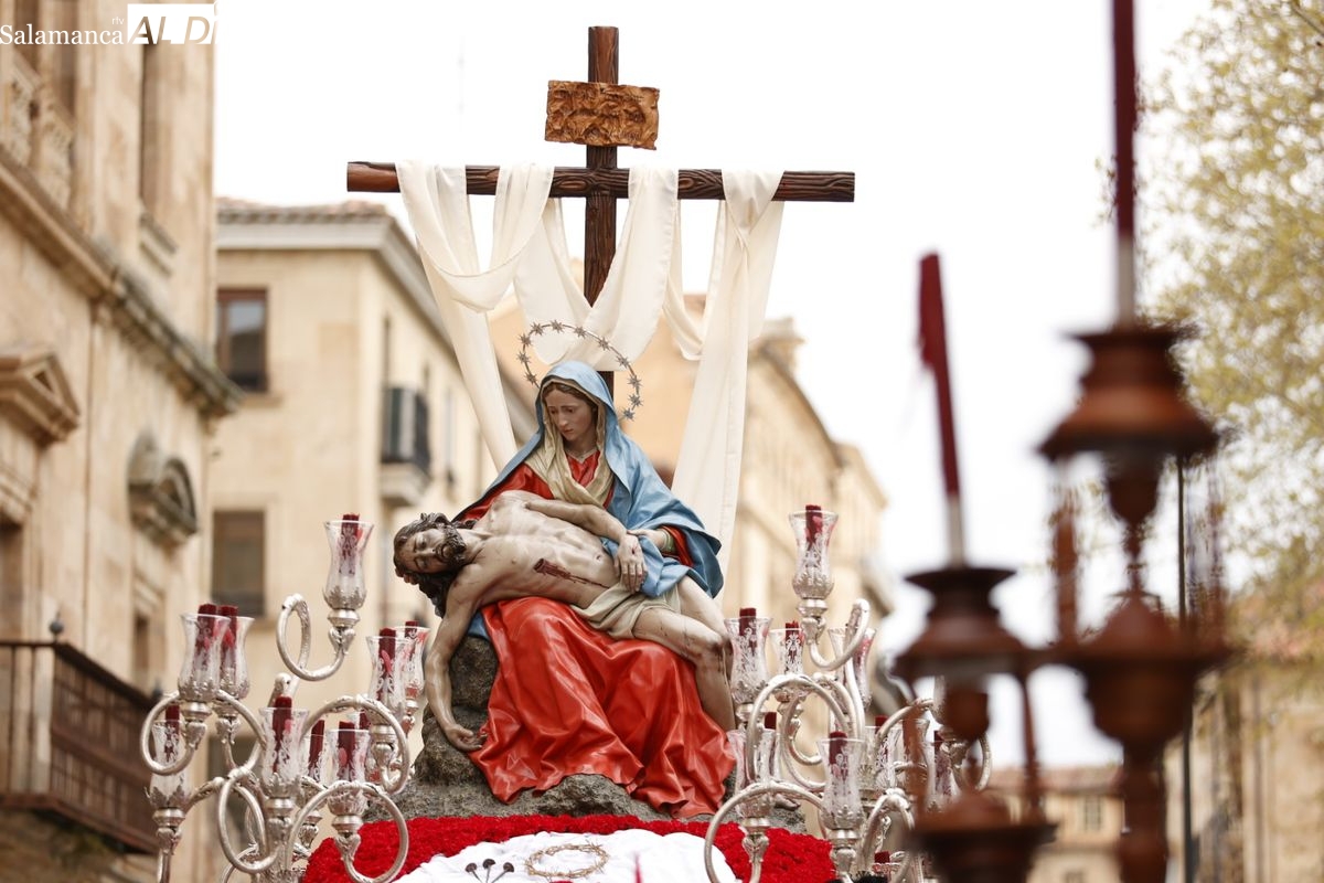 El Santísimo Cristo de la Buena Muerte, Nuestro Padre Jesús de la Pasión, Nuestra Señora de los Dolores y Nuestra Señora de la Esperanza han regresado esta mañana a su templo, el Convento de San Esteban, tras un recorrido solemne de seis horas por el casco histórico salmantino: Plaza del Concilio de Trento, Calle San Pablo, Calle Palominos, Rúa Mayor, Plaza de Anaya, S.I.B Catedral Nueva (entrada por la puerta de Ramos, salida por la puerta del Obispo), Calle Calderón de la Barca, Calle Libreros, Plaza de San Isidro, Calle de la Compañía, Calle Meléndez, Plaza del Corrillo, Plaza Mayor, Plaza del Poeta Iglesias, Calle San Pablo, Plaza Concilio de Trento y Atrio de San Esteban.