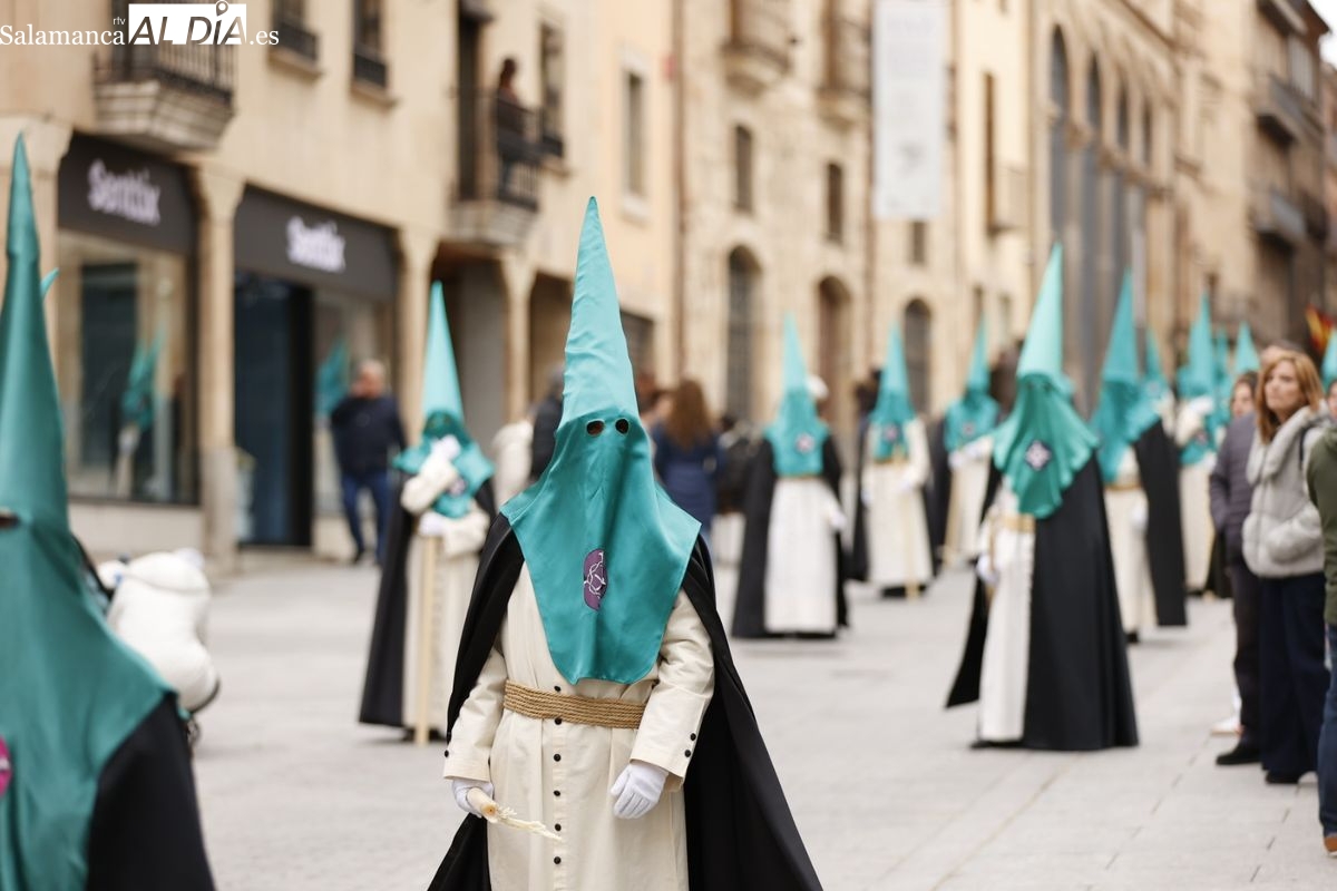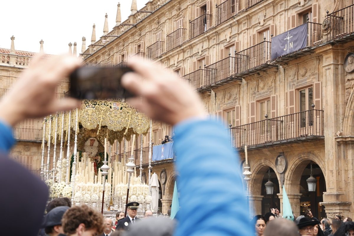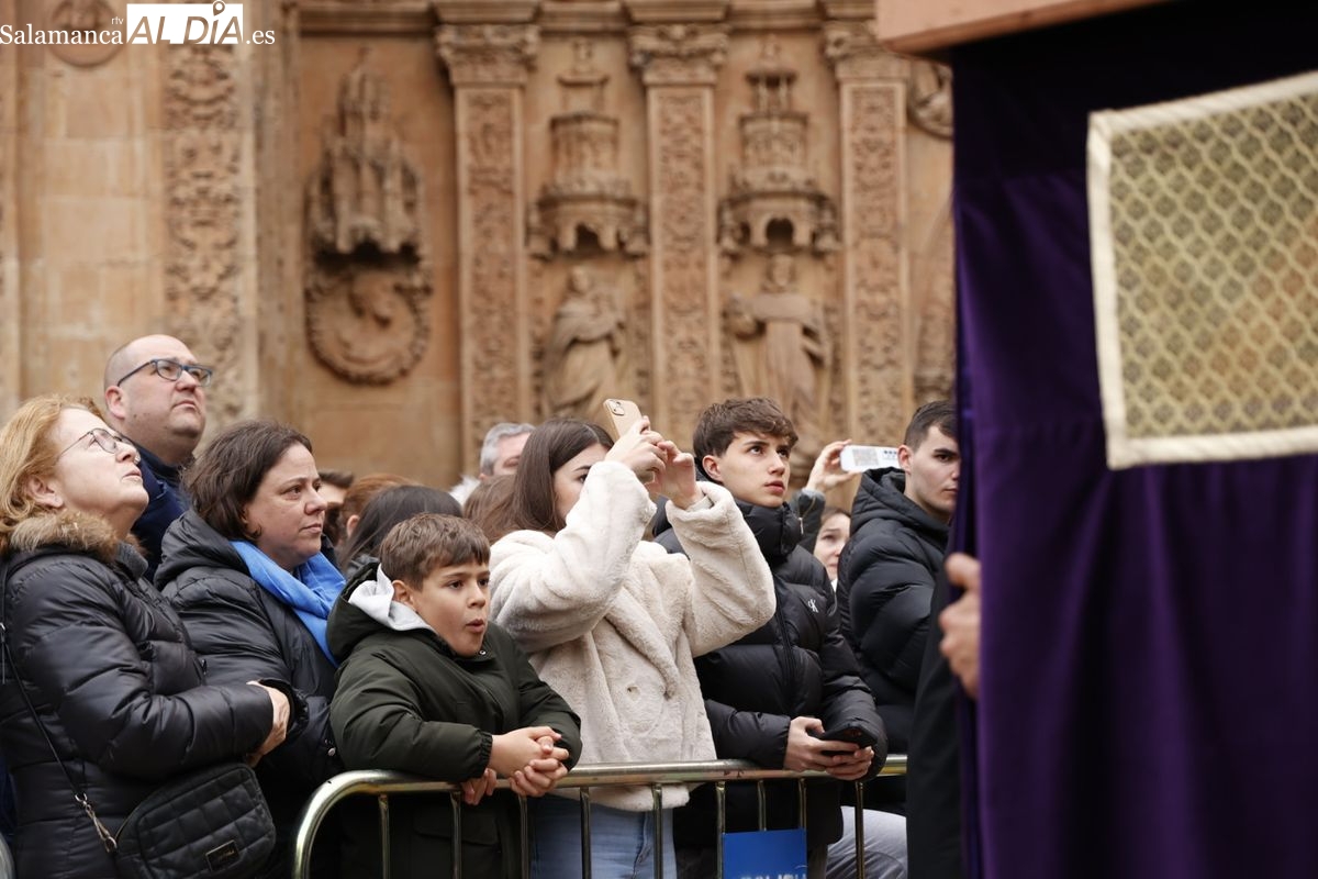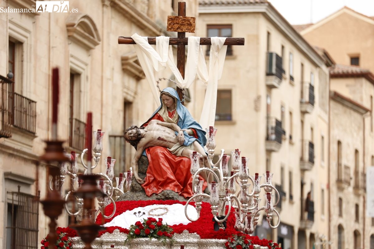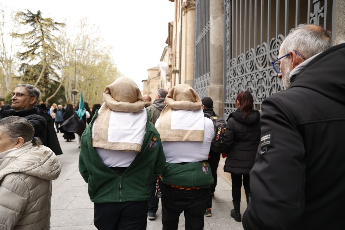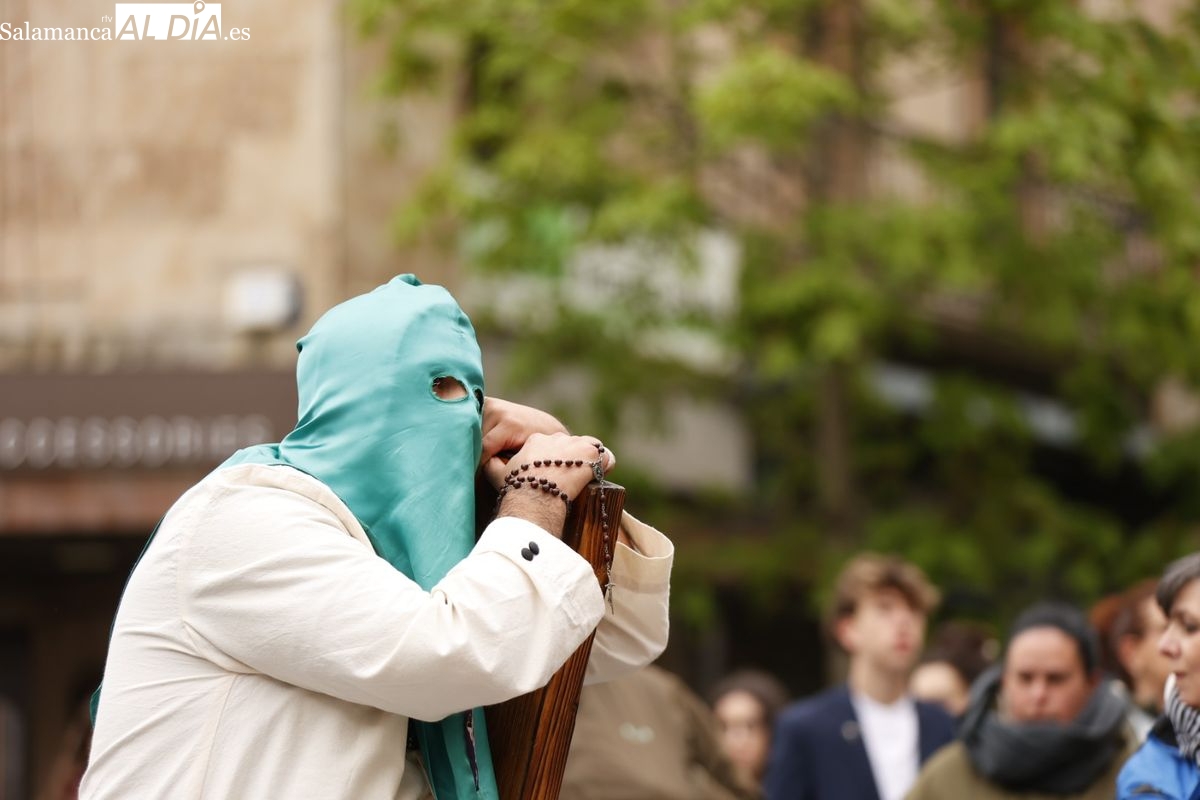 El Santísimo Cristo de la Buena Muerte, Nuestro Padre Jesús de la Pasión, Nuestra Señora de los Dolores y Nuestra Señora de la Esperanza han regresado esta mañana a su templo, el Convento de San Esteban, tras un recorrido solemne de seis horas por el casco histórico salmantino: Plaza del Concilio de Trento, Calle San Pablo, Calle Palominos, Rúa Mayor, Plaza de Anaya, S.I.B Catedral Nueva (entrada por la puerta de Ramos, salida por la puerta del Obispo), Calle Calderón de la Barca, Calle Libreros, Plaza de San Isidro, Calle de la Compañía, Calle Meléndez, Plaza del Corrillo, Plaza Mayor, Plaza del Poeta Iglesias, Calle San Pablo, Plaza Concilio de Trento y Atrio de San Esteban.