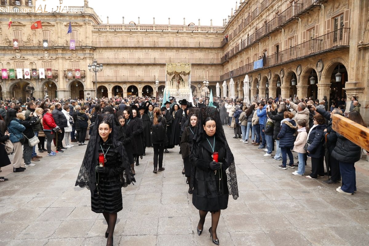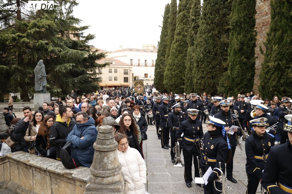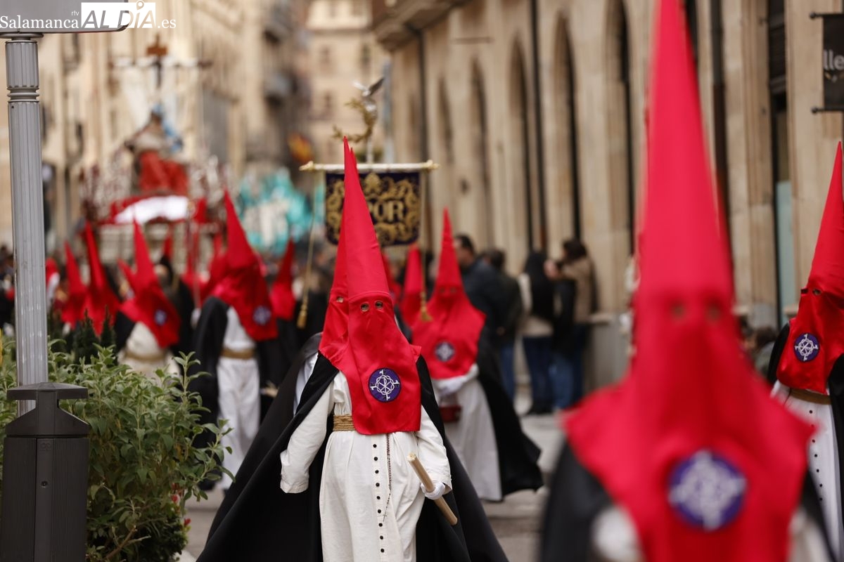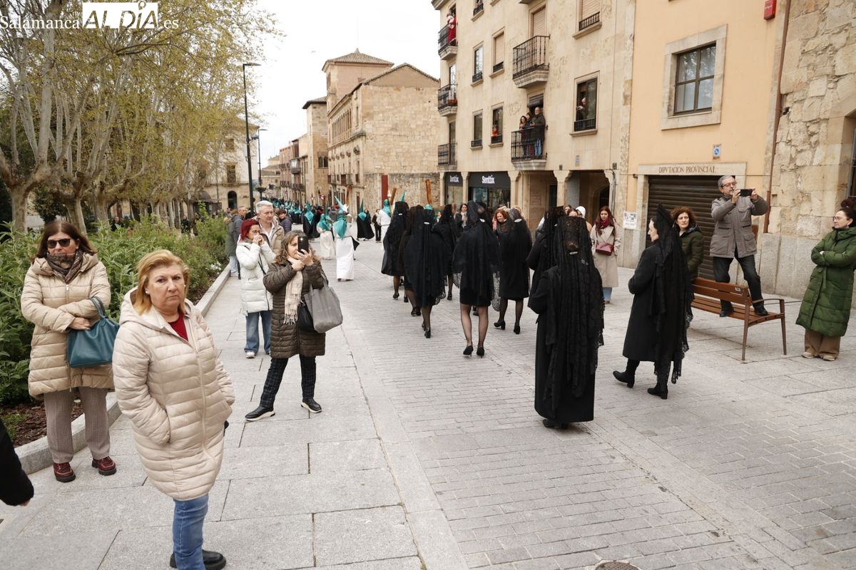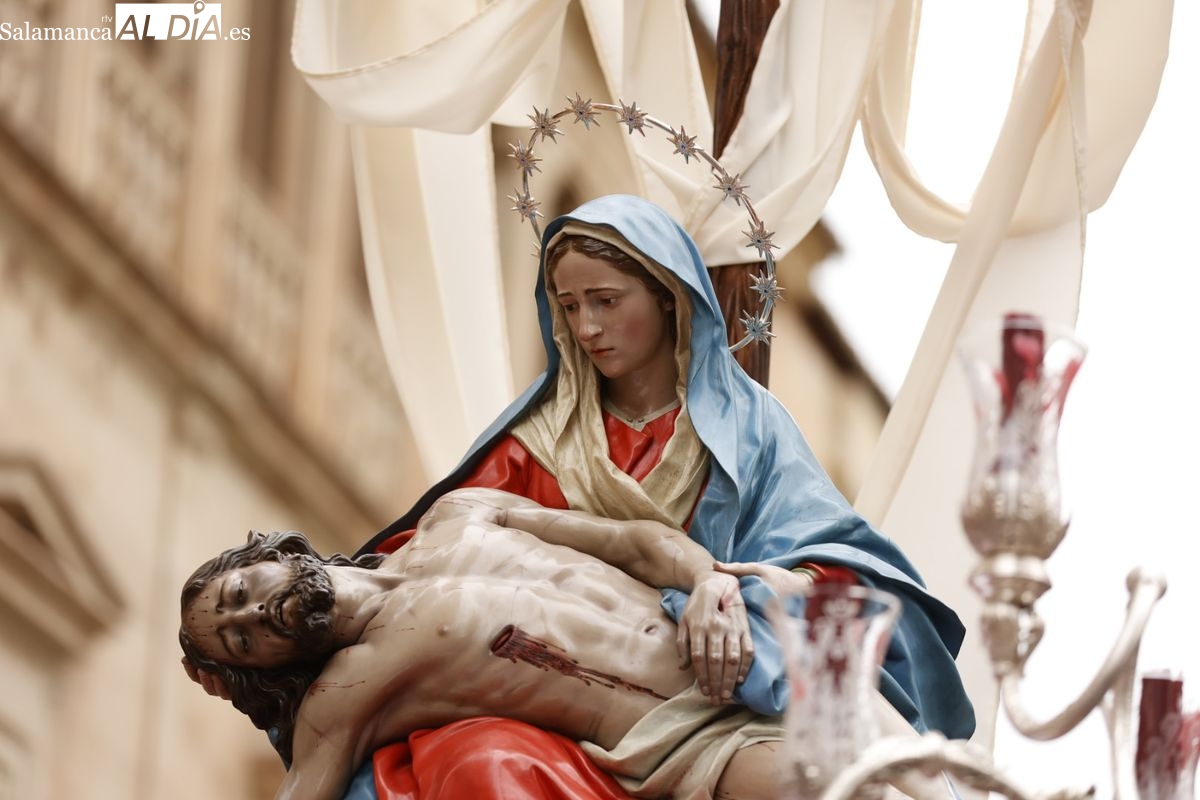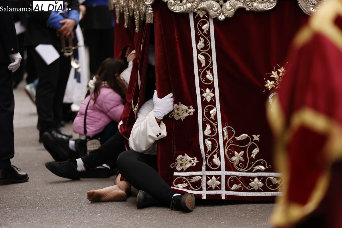 El Santísimo Cristo de la Buena Muerte, Nuestro Padre Jesús de la Pasión, Nuestra Señora de los Dolores y Nuestra Señora de la Esperanza han regresado esta mañana a su templo, el Convento de San Esteban, tras un recorrido solemne de seis horas por el casco histórico salmantino: Plaza del Concilio de Trento, Calle San Pablo, Calle Palominos, Rúa Mayor, Plaza de Anaya, S.I.B Catedral Nueva (entrada por la puerta de Ramos, salida por la puerta del Obispo), Calle Calderón de la Barca, Calle Libreros, Plaza de San Isidro, Calle de la Compañía, Calle Meléndez, Plaza del Corrillo, Plaza Mayor, Plaza del Poeta Iglesias, Calle San Pablo, Plaza Concilio de Trento y Atrio de San Esteban.