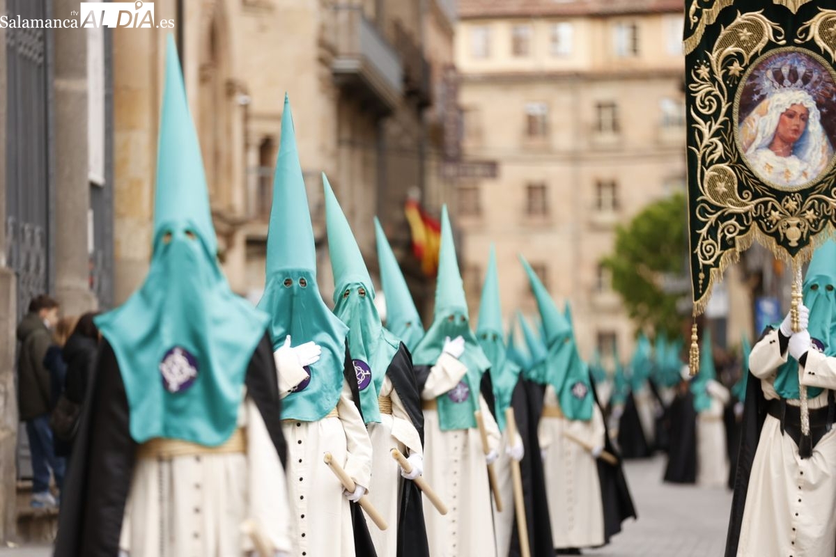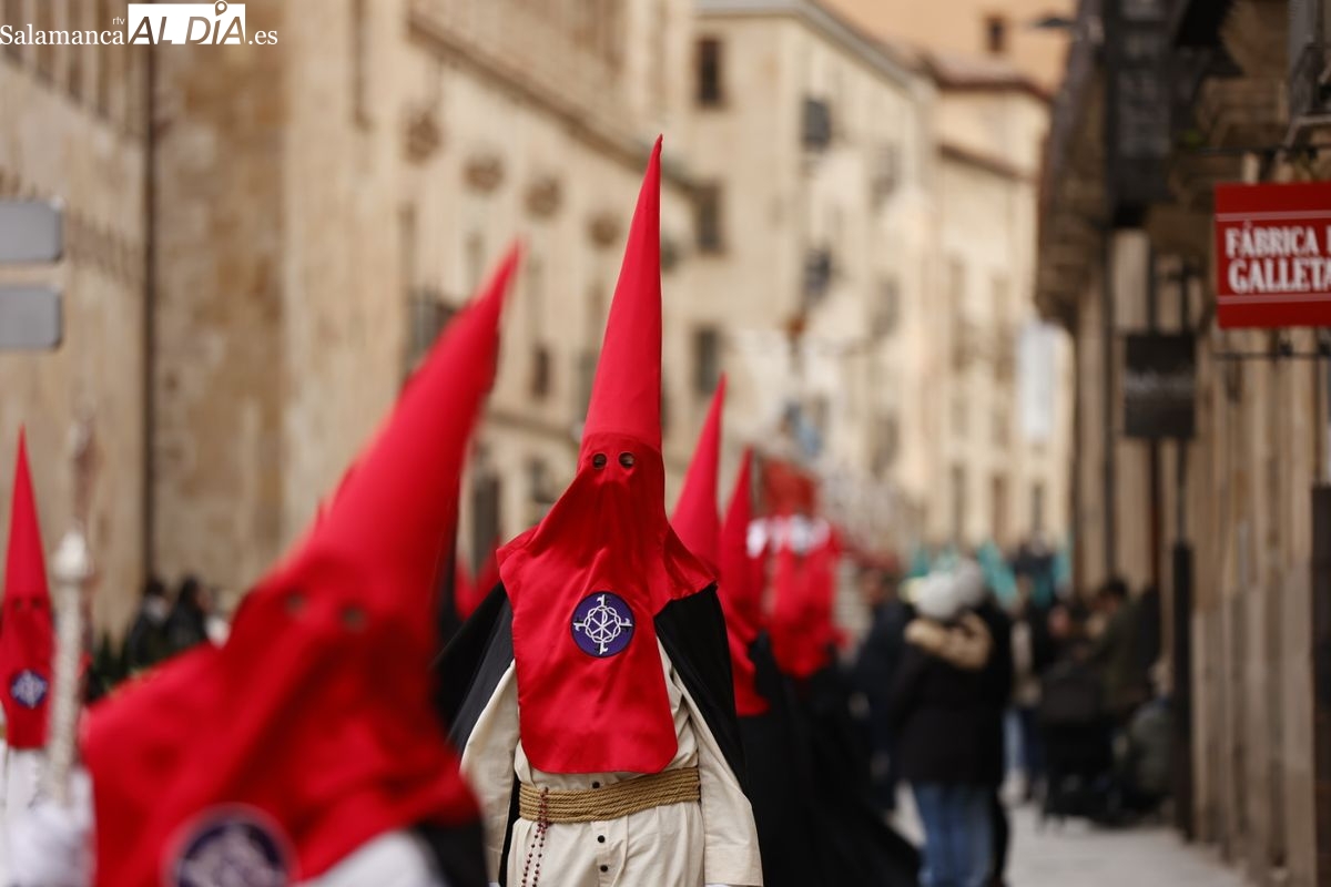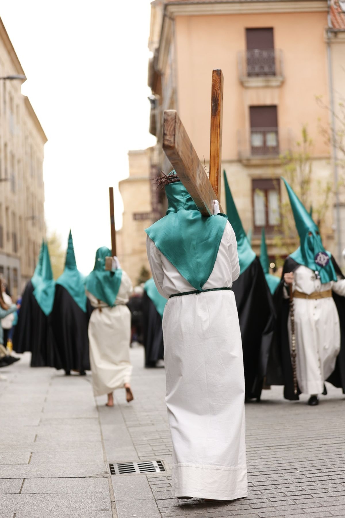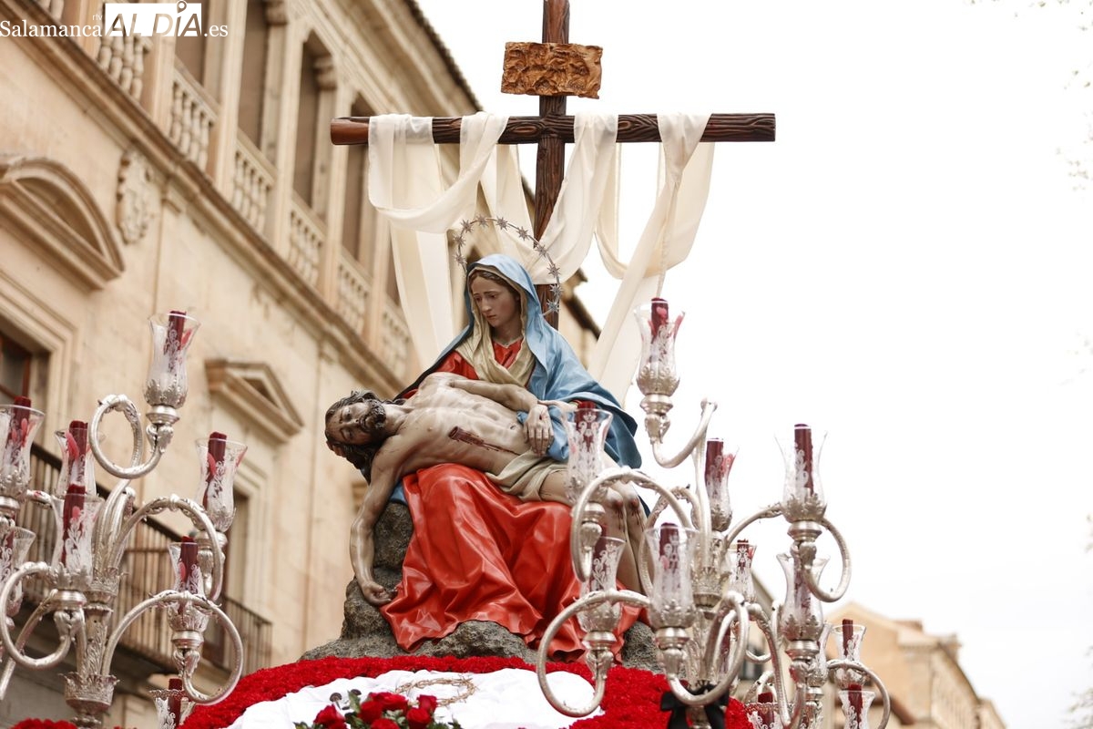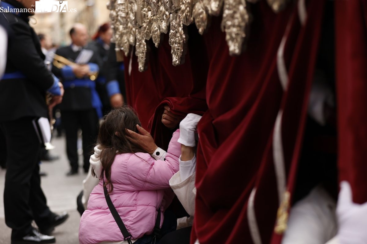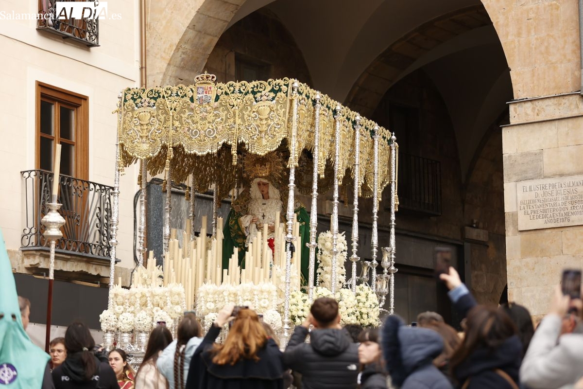 El Santísimo Cristo de la Buena Muerte, Nuestro Padre Jesús de la Pasión, Nuestra Señora de los Dolores y Nuestra Señora de la Esperanza han regresado esta mañana a su templo, el Convento de San Esteban, tras un recorrido solemne de seis horas por el casco histórico salmantino: Plaza del Concilio de Trento, Calle San Pablo, Calle Palominos, Rúa Mayor, Plaza de Anaya, S.I.B Catedral Nueva (entrada por la puerta de Ramos, salida por la puerta del Obispo), Calle Calderón de la Barca, Calle Libreros, Plaza de San Isidro, Calle de la Compañía, Calle Meléndez, Plaza del Corrillo, Plaza Mayor, Plaza del Poeta Iglesias, Calle San Pablo, Plaza Concilio de Trento y Atrio de San Esteban.