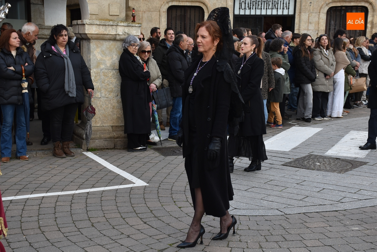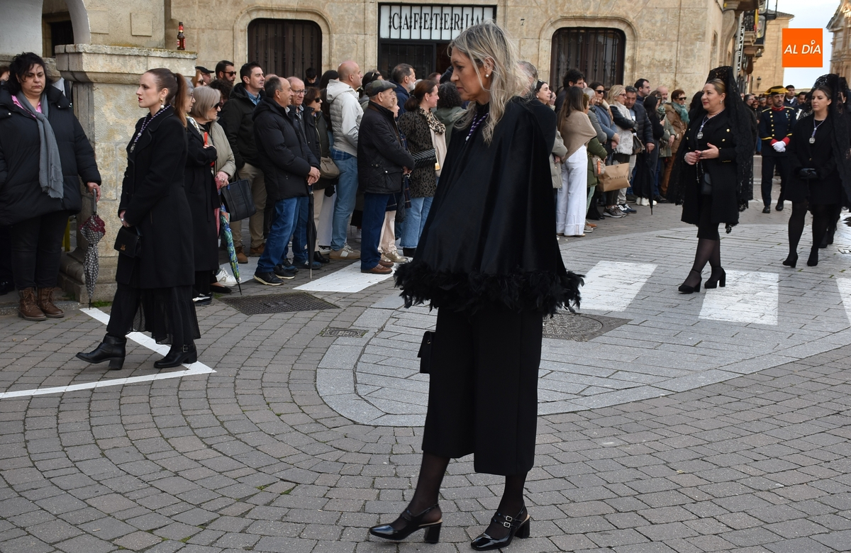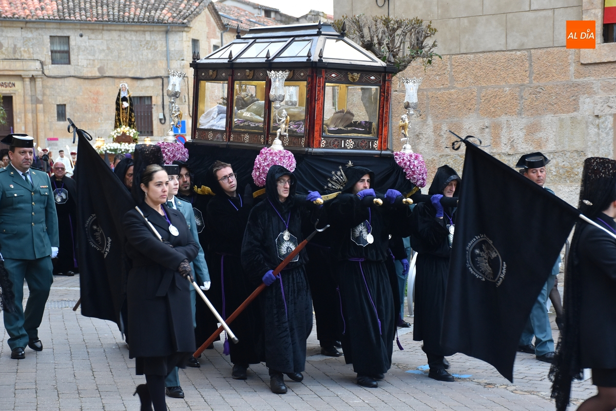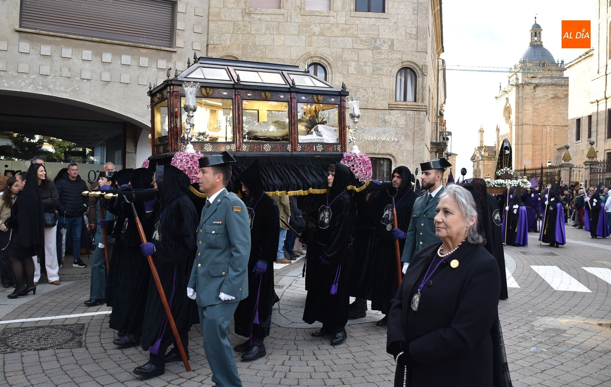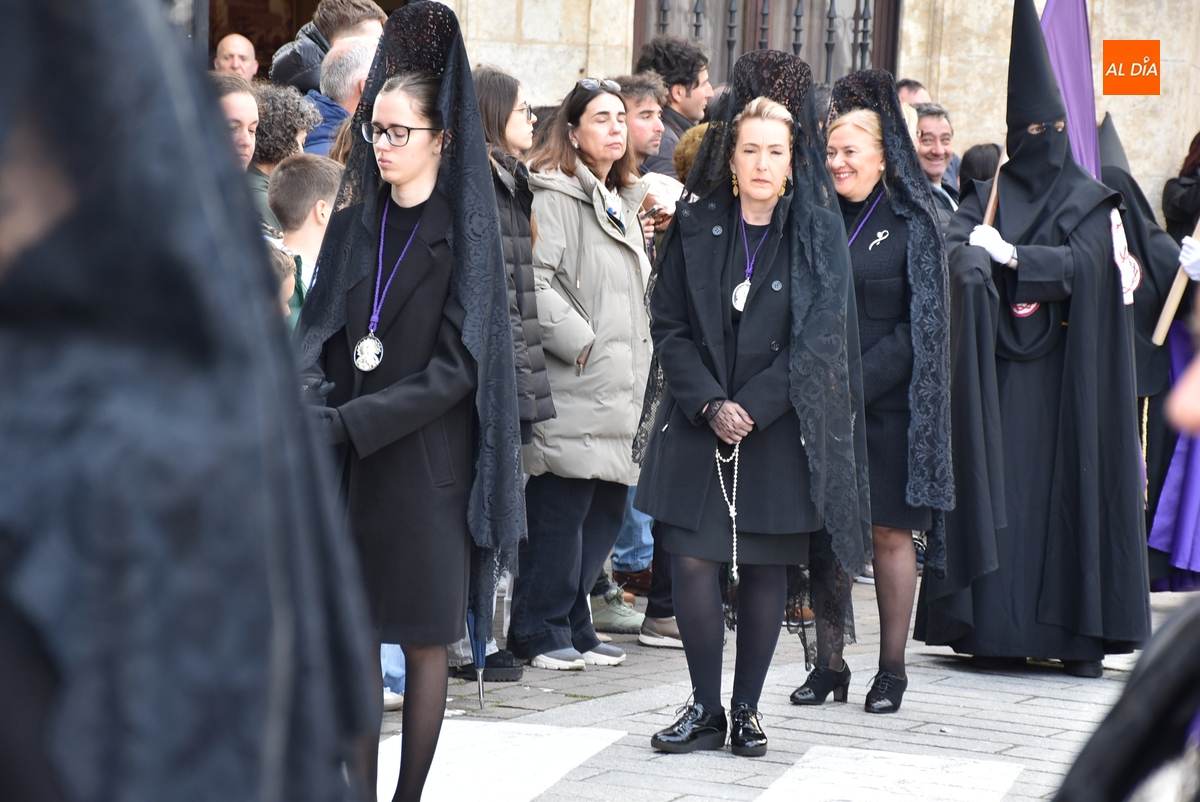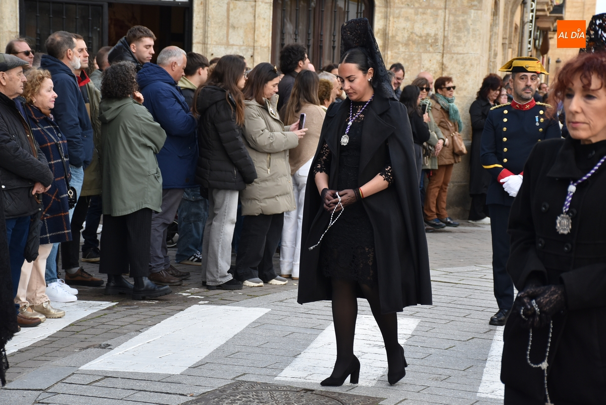 Tras esas seis cofradías, hizo su debut en esta Semana Santa 2025 la Cofradía de Nuestra Señora de La Soledad, que estrenaba las nuevas banderas de luto que han comprado, sustituyendo a las blancas que tenían (que las dejan para el Domingo de Resurrección). Con la compañía de unas 25 cofrades con mantilla, La Soledad procesionó el Santo Sepulcro, que contó como decíamos más arriba con la escolta de la Guardia Civil.