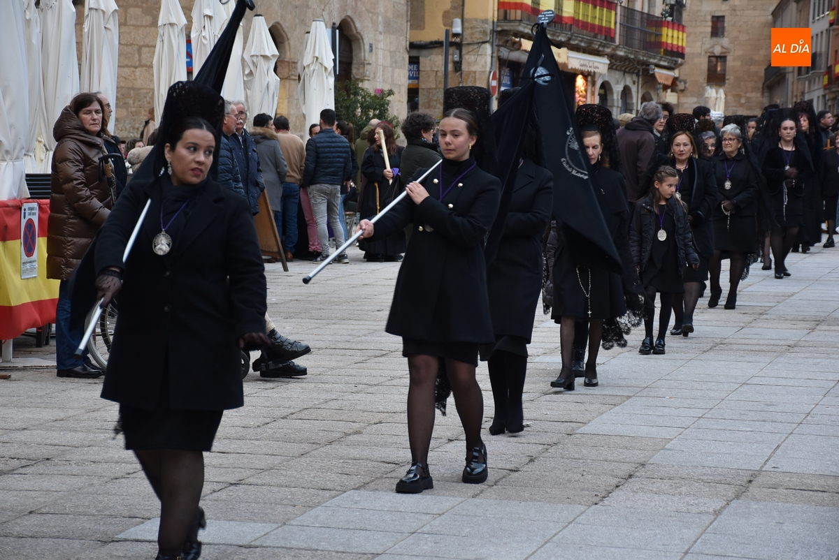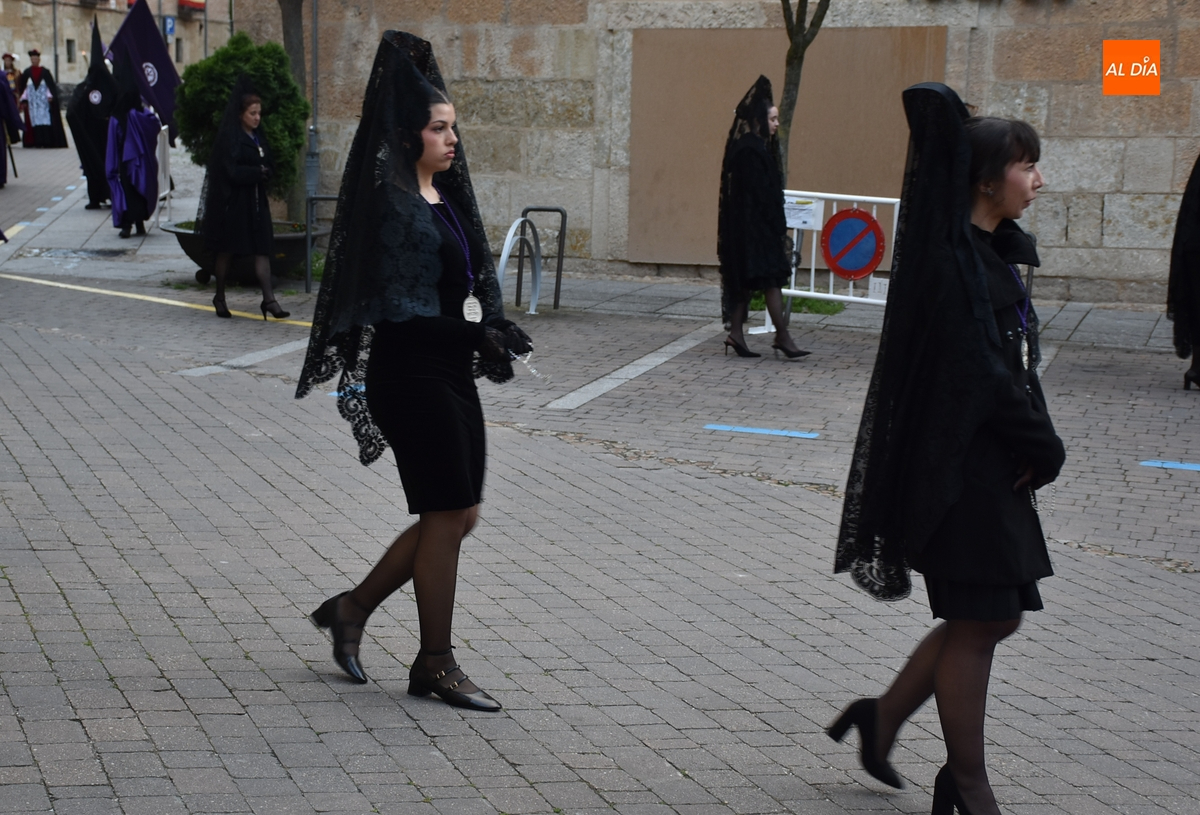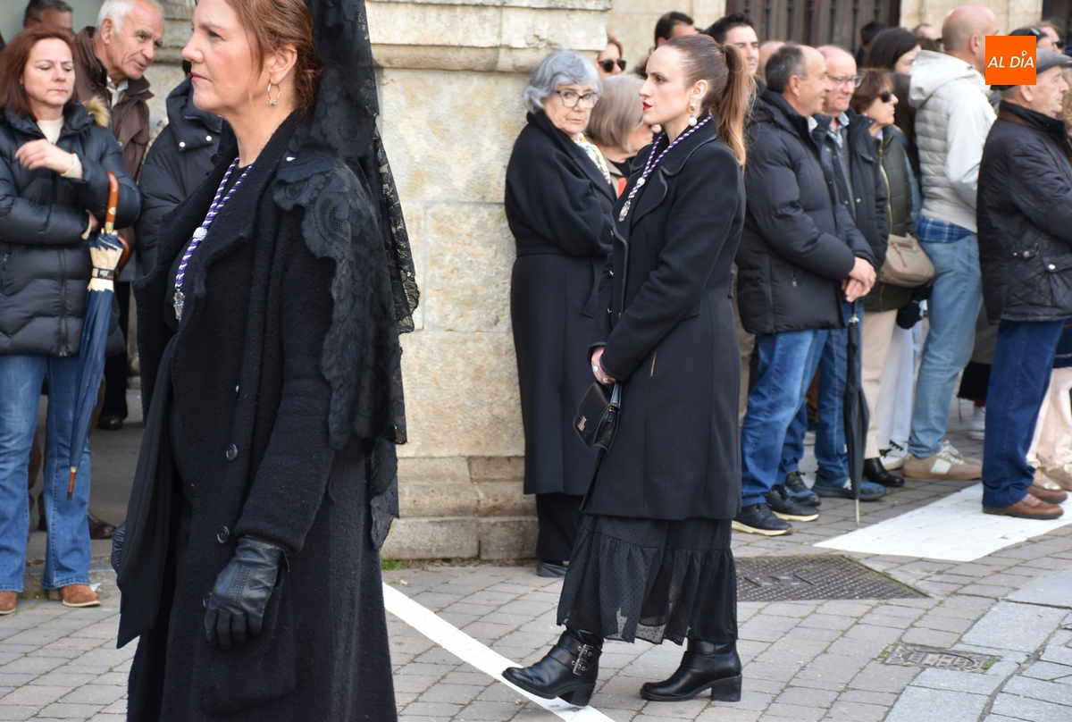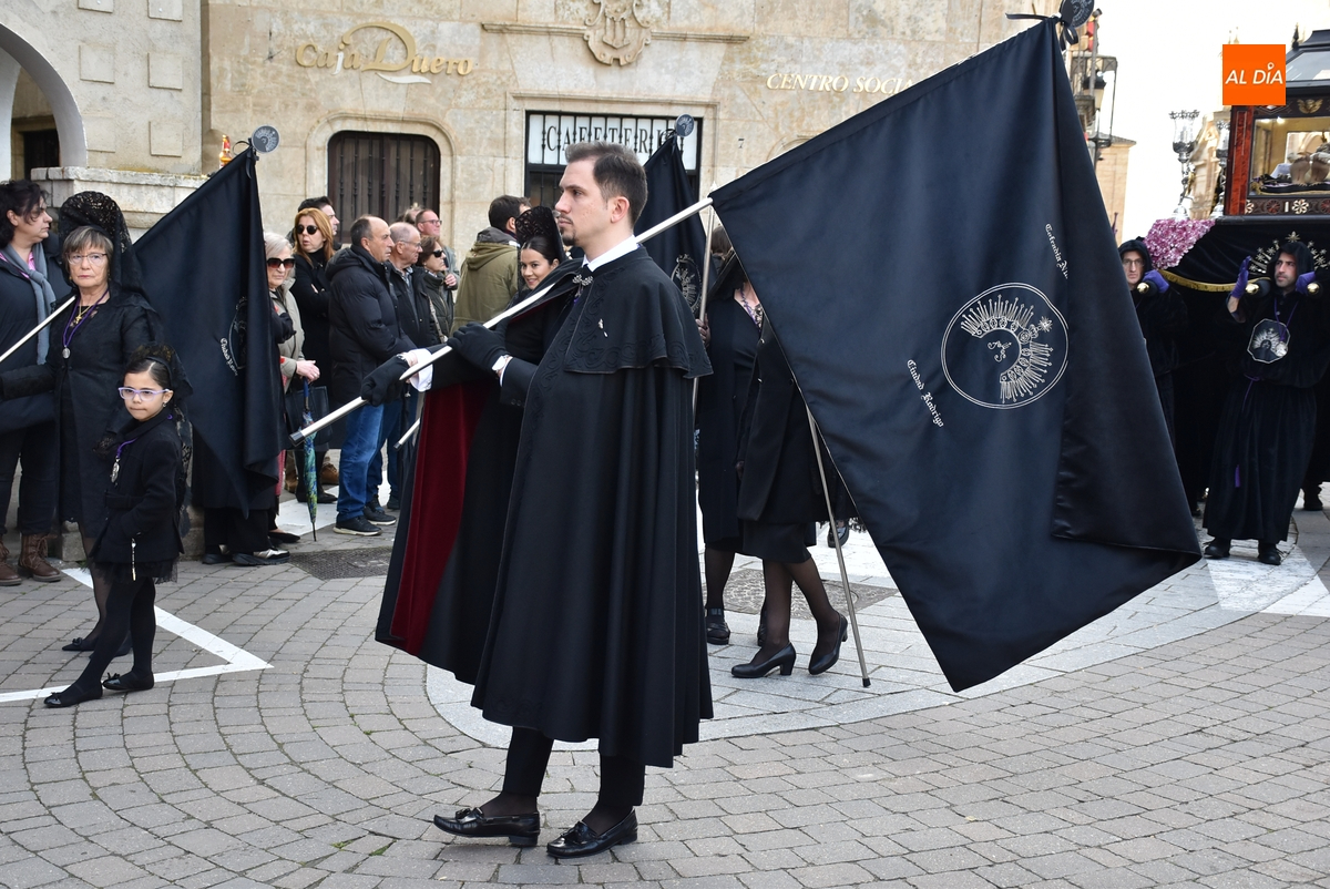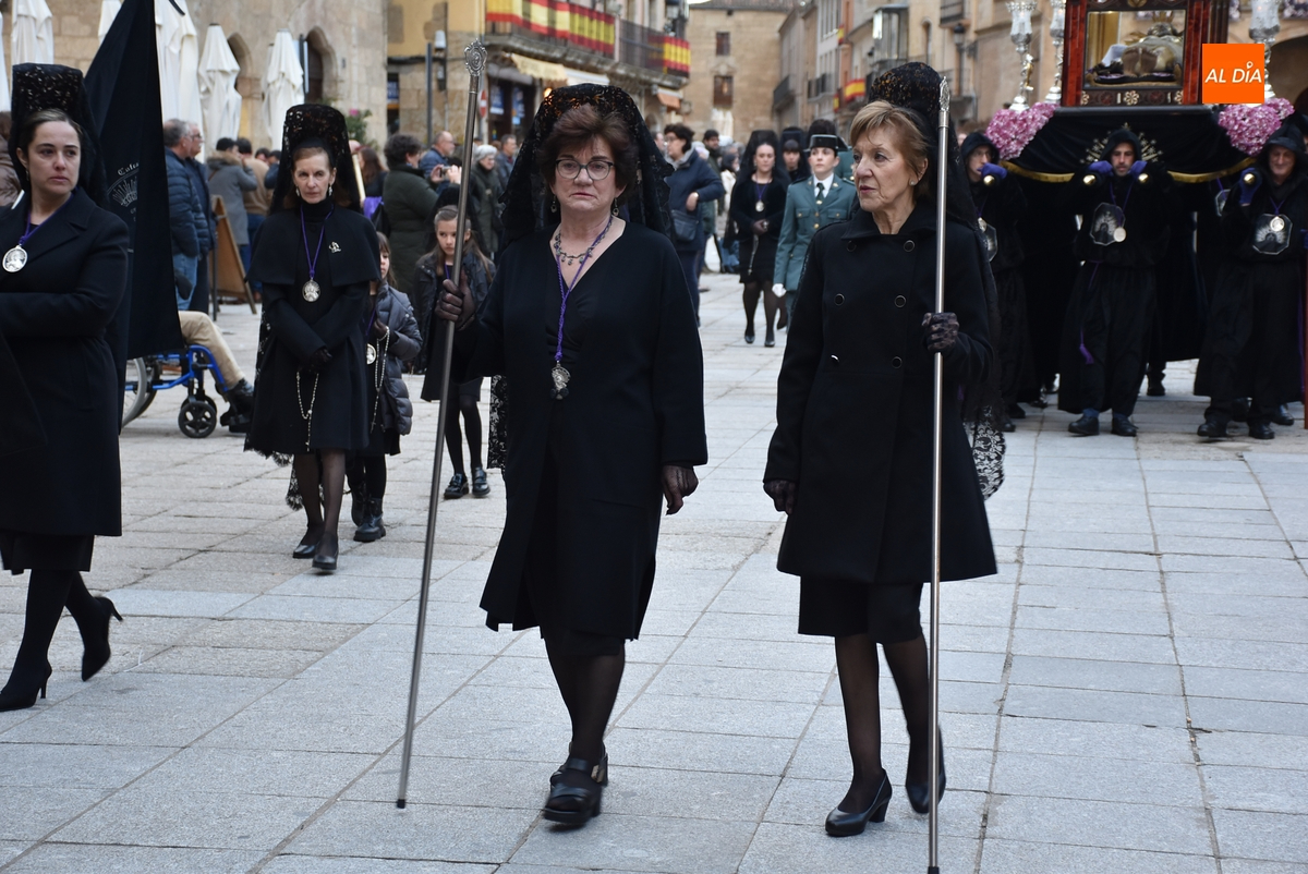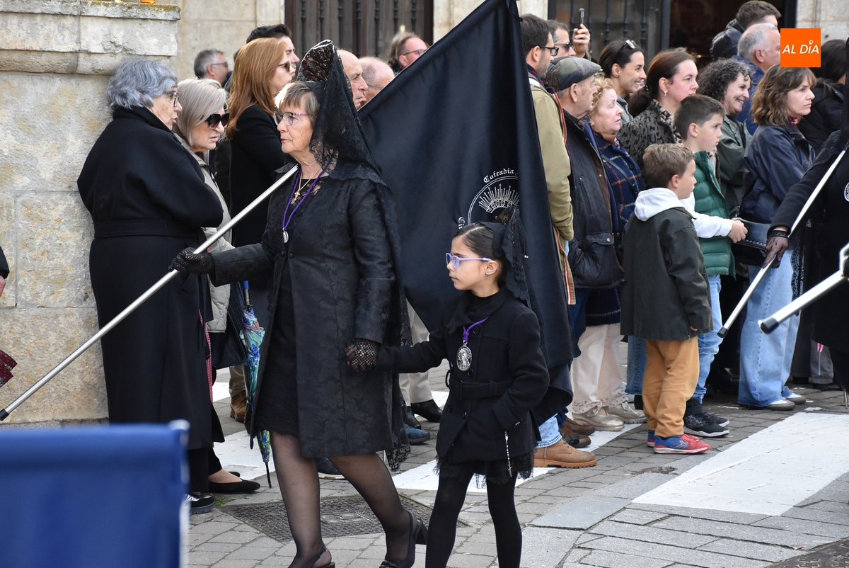 Tras esas seis cofradías, hizo su debut en esta Semana Santa 2025 la Cofradía de Nuestra Señora de La Soledad, que estrenaba las nuevas banderas de luto que han comprado, sustituyendo a las blancas que tenían (que las dejan para el Domingo de Resurrección). Con la compañía de unas 25 cofrades con mantilla, La Soledad procesionó el Santo Sepulcro, que contó como decíamos más arriba con la escolta de la Guardia Civil.