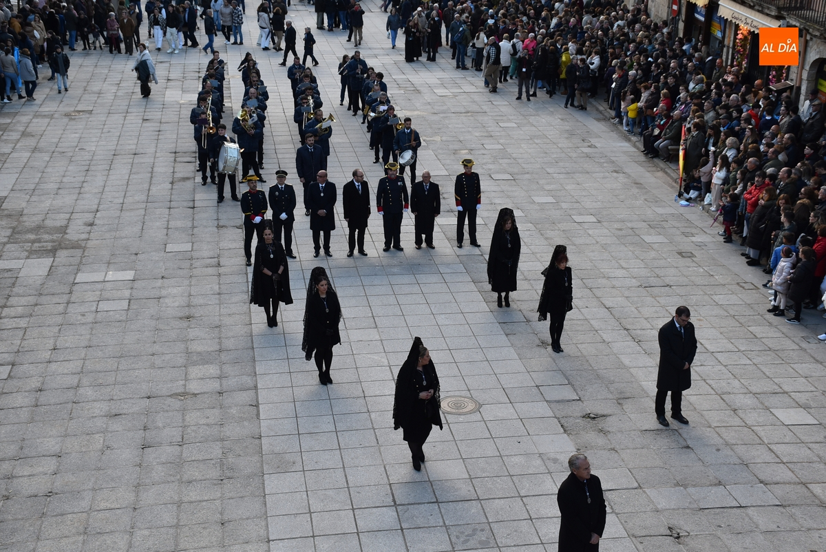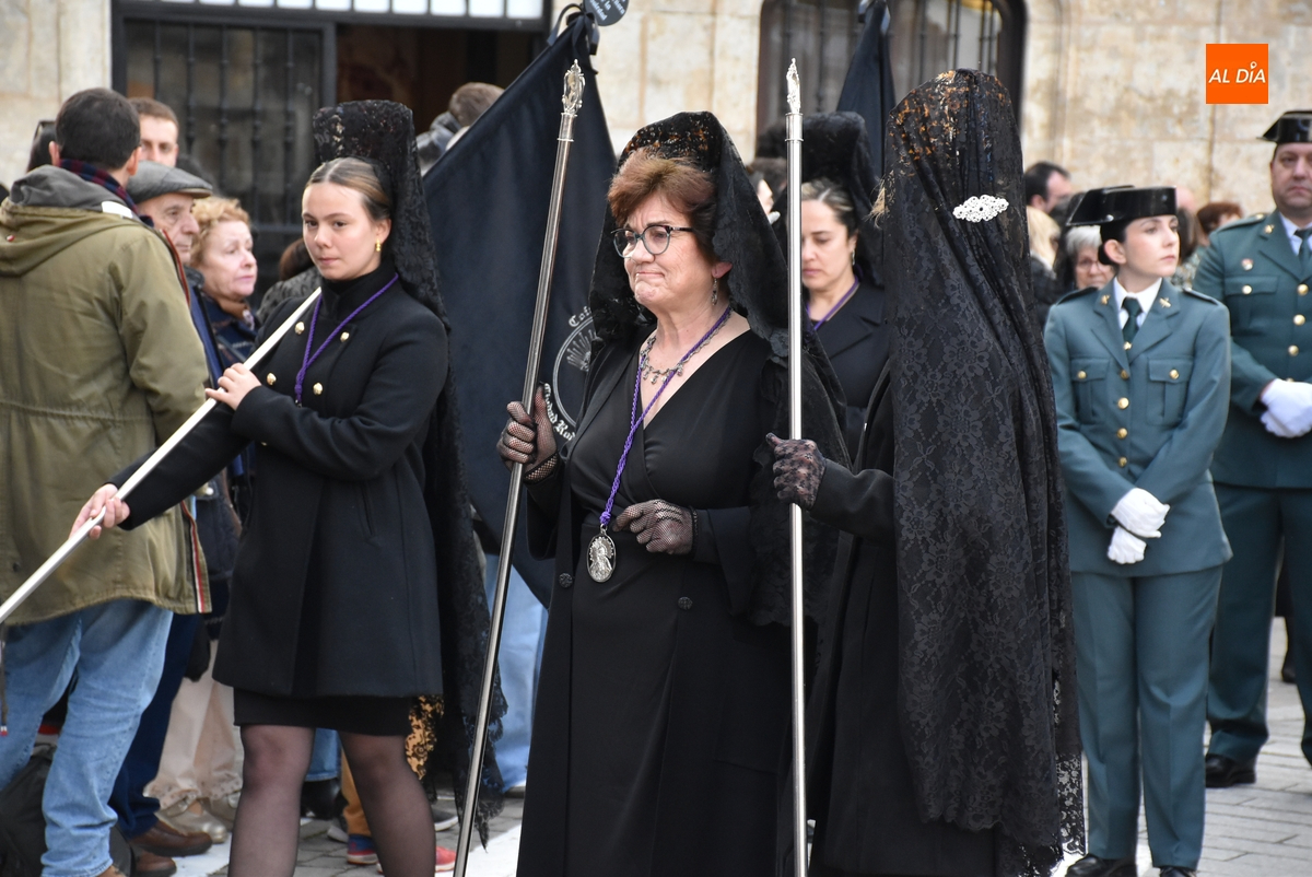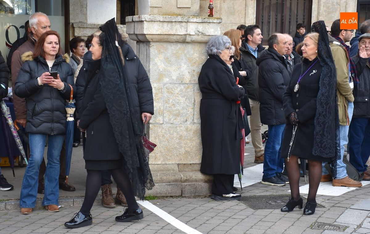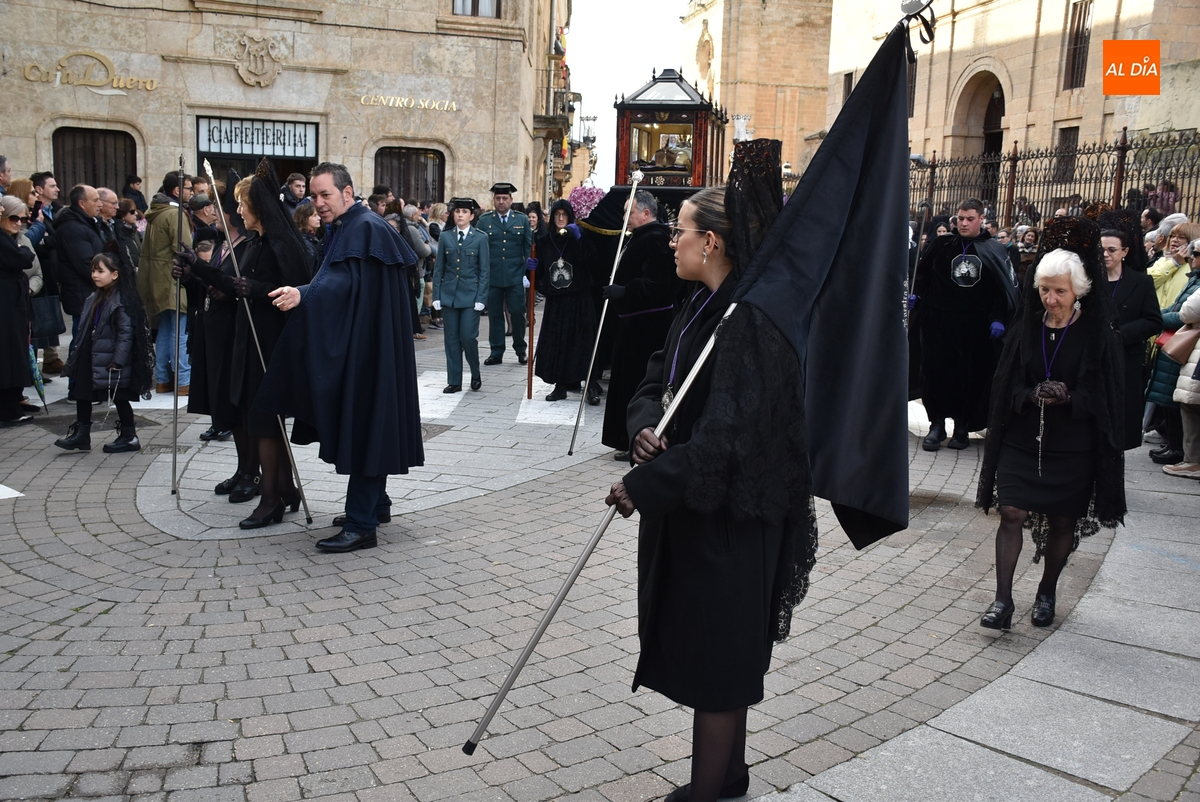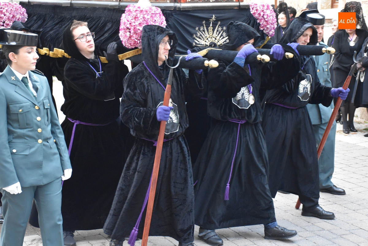 Tras esas seis cofradías, hizo su debut en esta Semana Santa 2025 la Cofradía de Nuestra Señora de La Soledad, que estrenaba las nuevas banderas de luto que han comprado, sustituyendo a las blancas que tenían (que las dejan para el Domingo de Resurrección). Con la compañía de unas 25 cofrades con mantilla, La Soledad procesionó el Santo Sepulcro, que contó como decíamos más arriba con la escolta de la Guardia Civil.