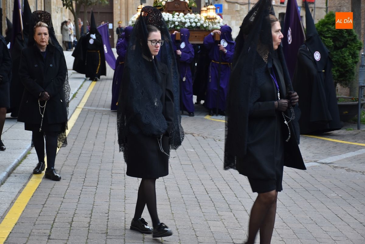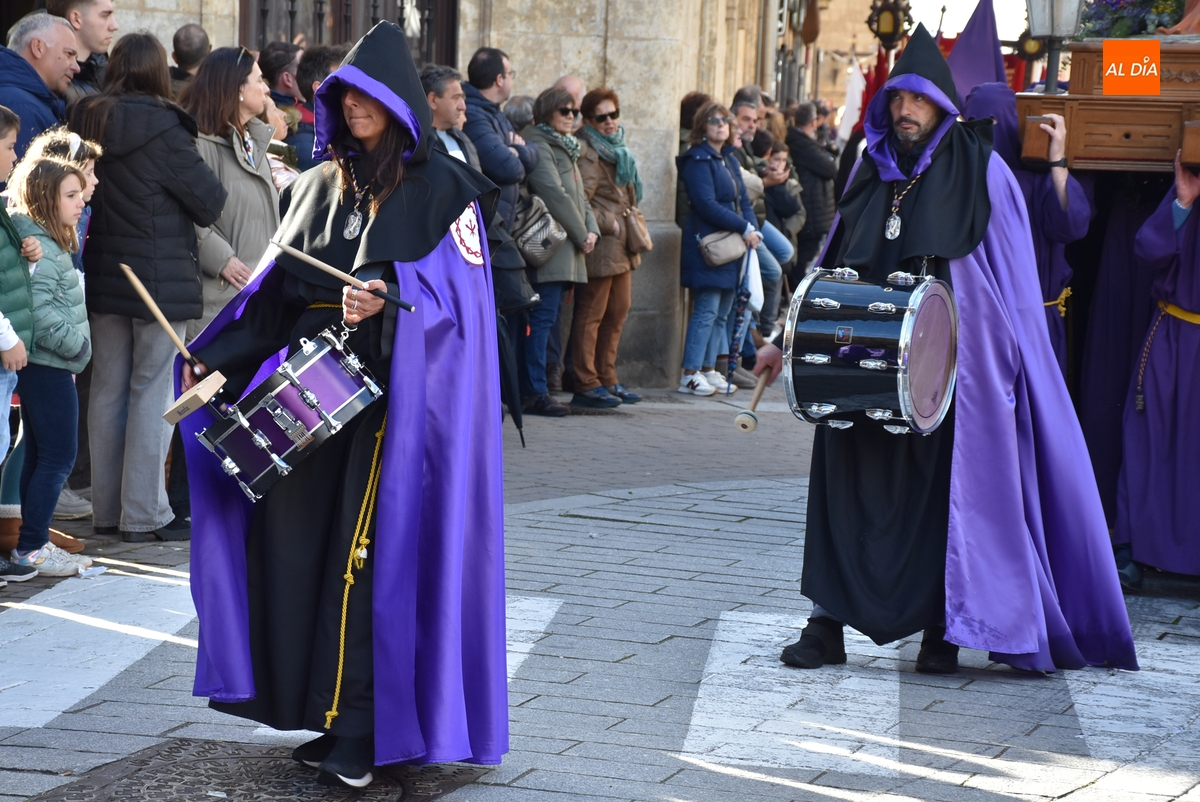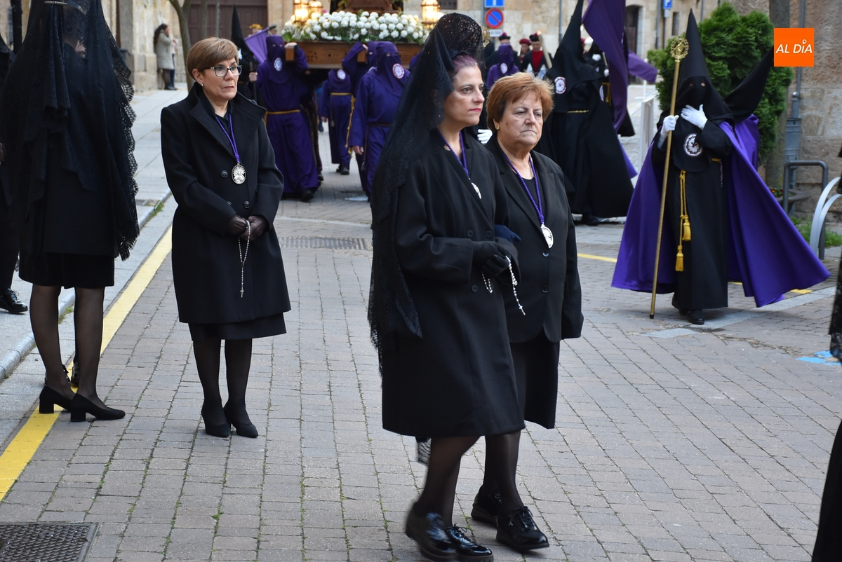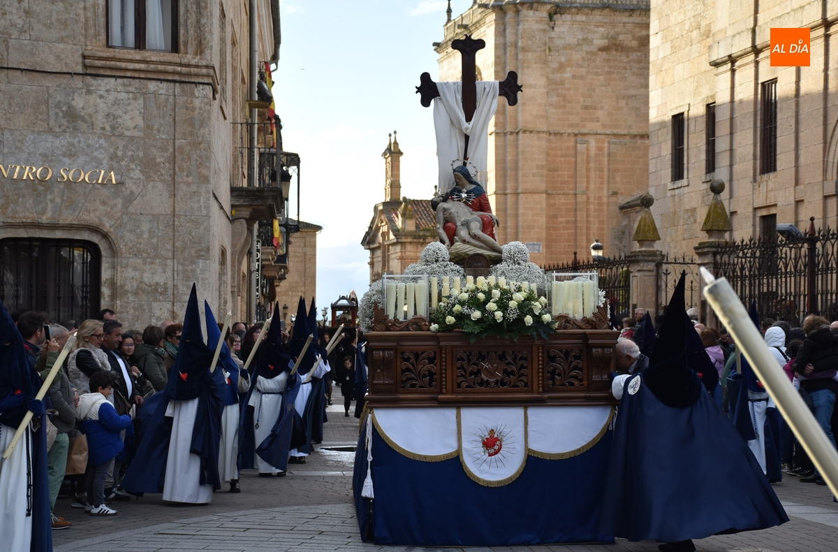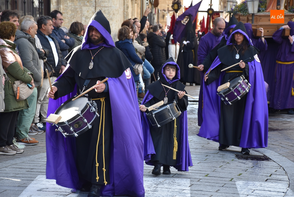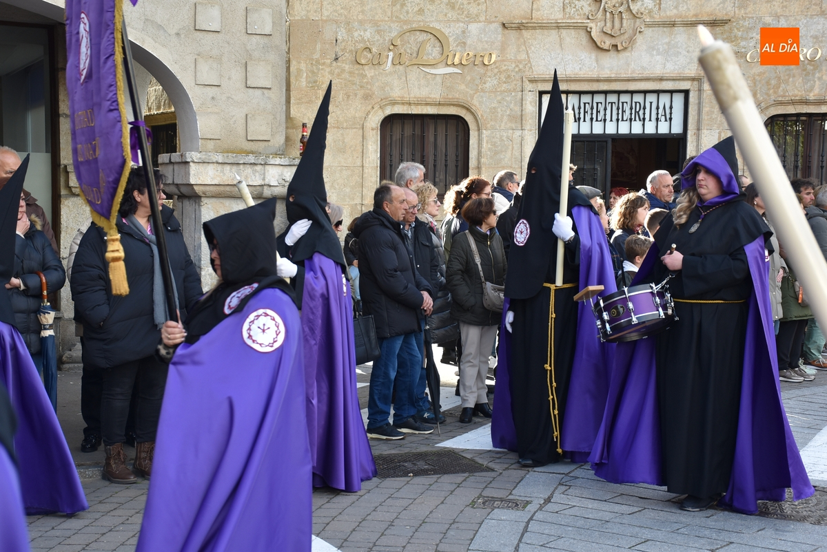 Tras esas seis cofradías, hizo su debut en esta Semana Santa 2025 la Cofradía de Nuestra Señora de La Soledad, que estrenaba las nuevas banderas de luto que han comprado, sustituyendo a las blancas que tenían (que las dejan para el Domingo de Resurrección). Con la compañía de unas 25 cofrades con mantilla, La Soledad procesionó el Santo Sepulcro, que contó como decíamos más arriba con la escolta de la Guardia Civil.