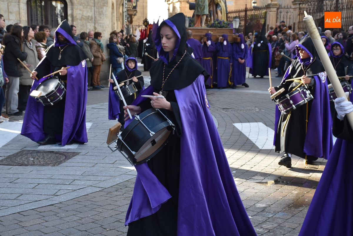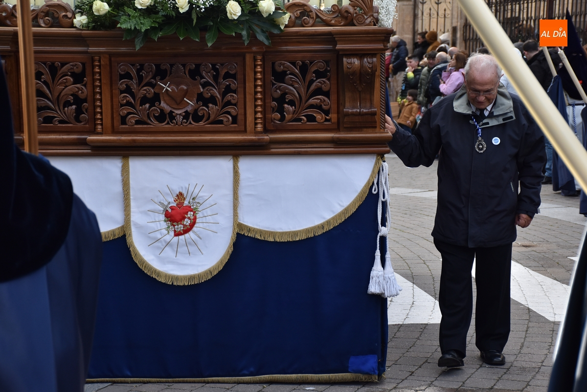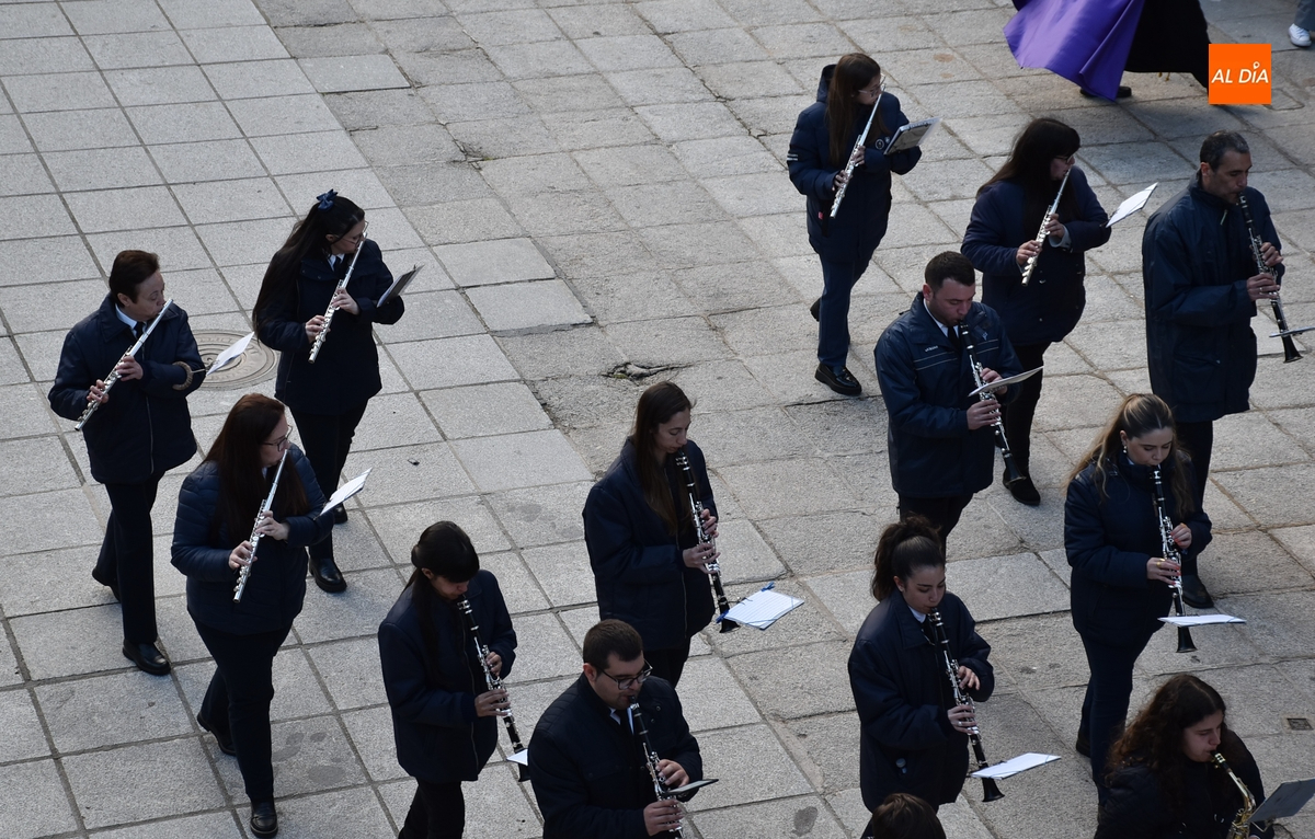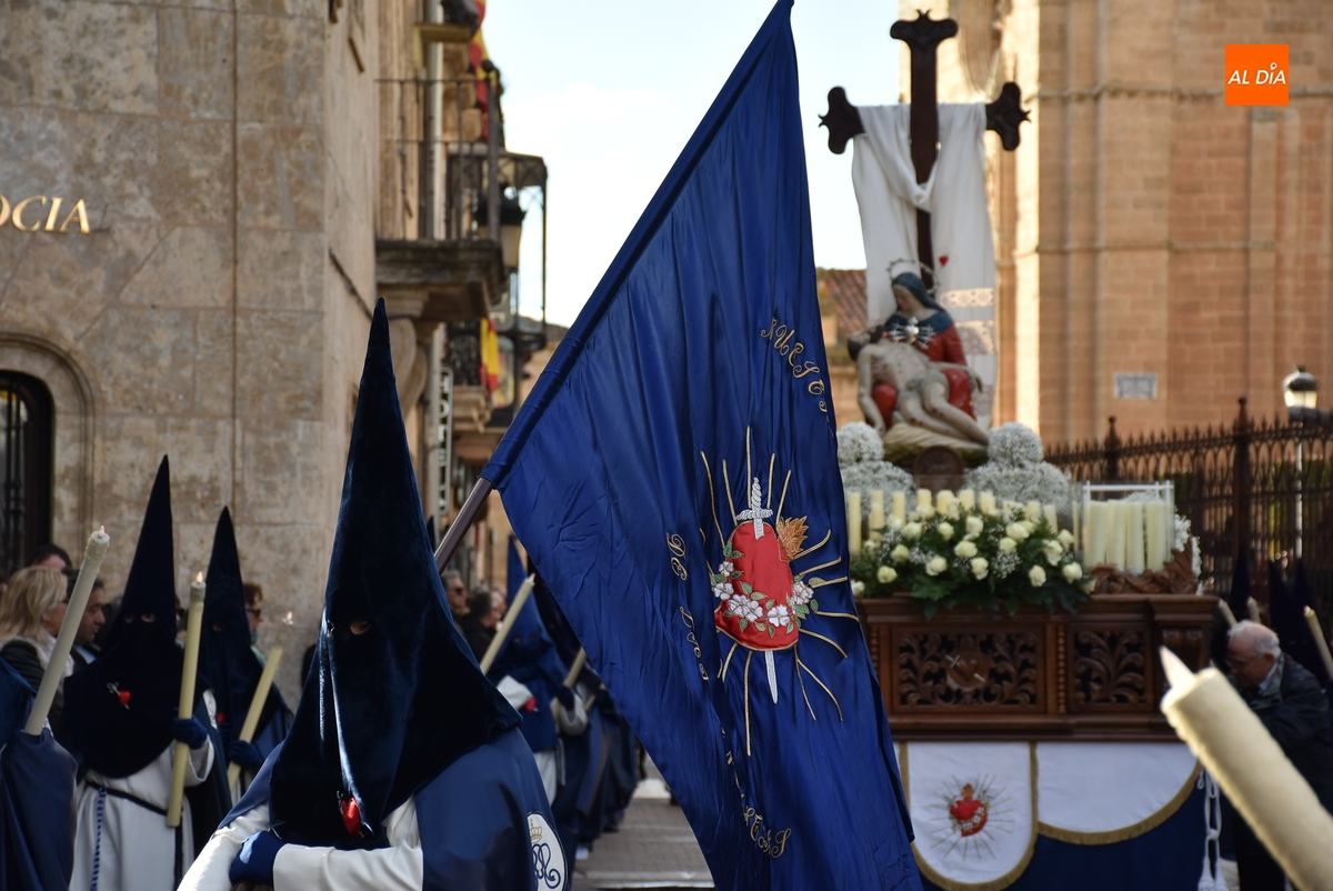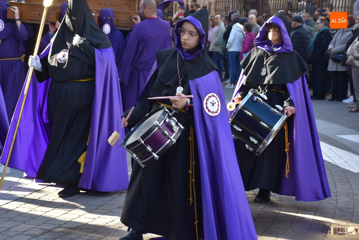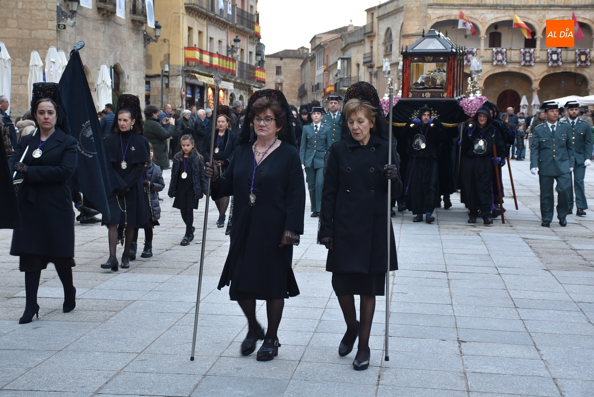 Tras esas seis cofradías, hizo su debut en esta Semana Santa 2025 la Cofradía de Nuestra Señora de La Soledad, que estrenaba las nuevas banderas de luto que han comprado, sustituyendo a las blancas que tenían (que las dejan para el Domingo de Resurrección). Con la compañía de unas 25 cofrades con mantilla, La Soledad procesionó el Santo Sepulcro, que contó como decíamos más arriba con la escolta de la Guardia Civil.