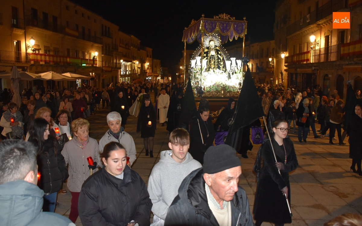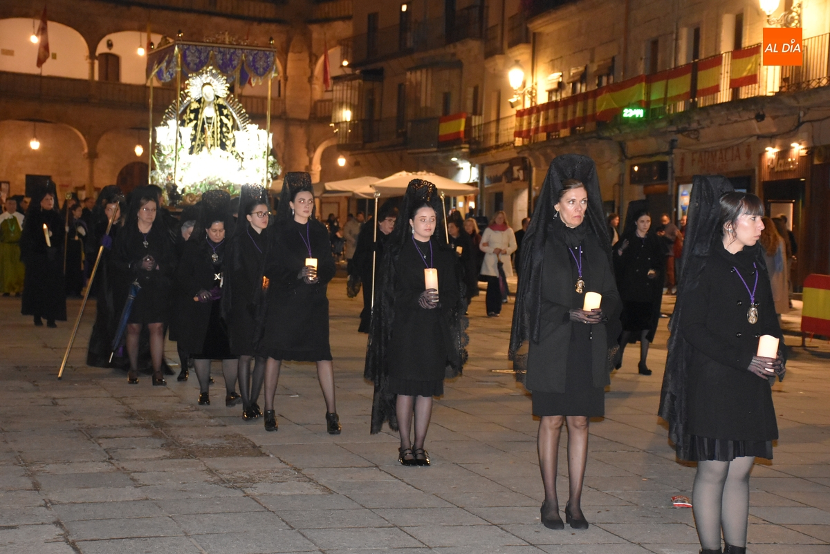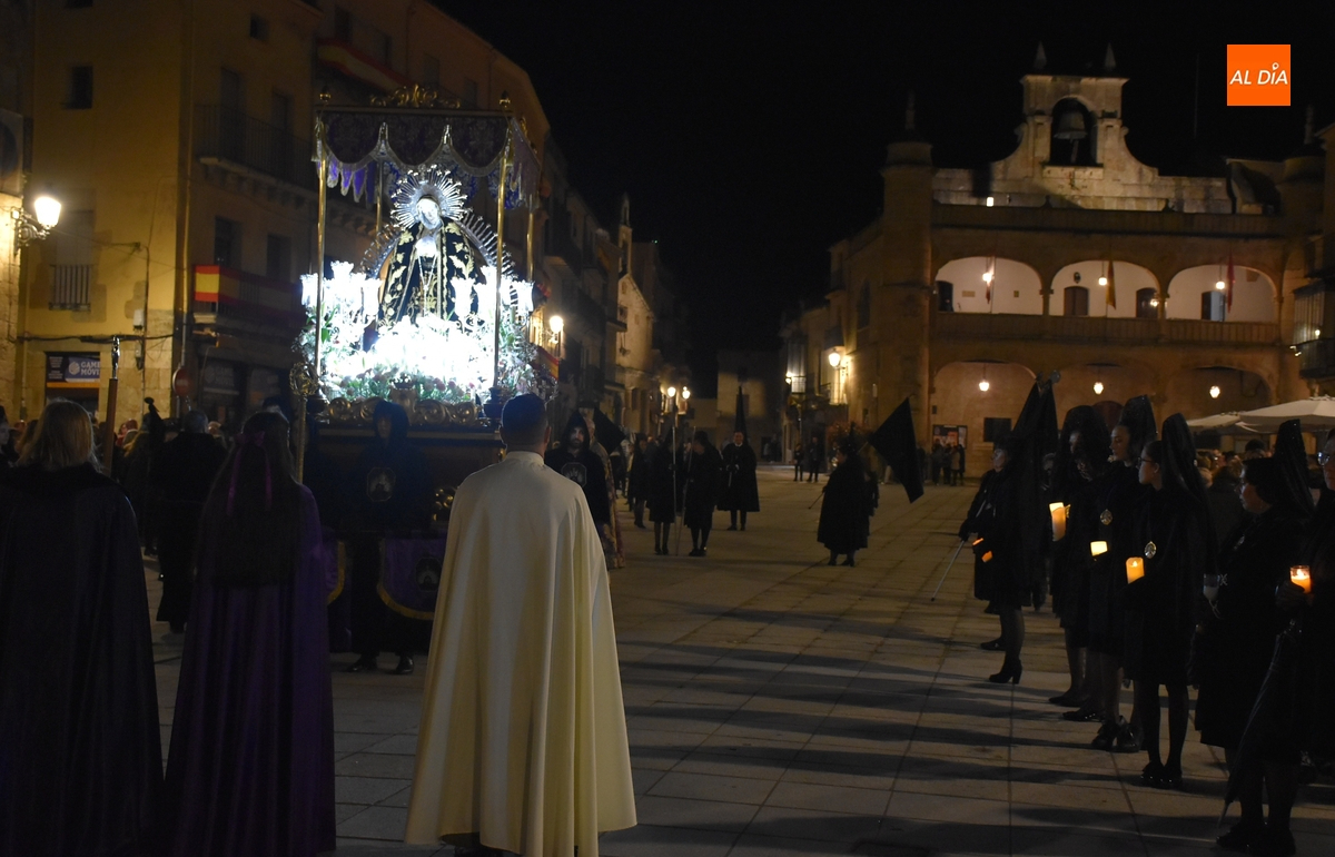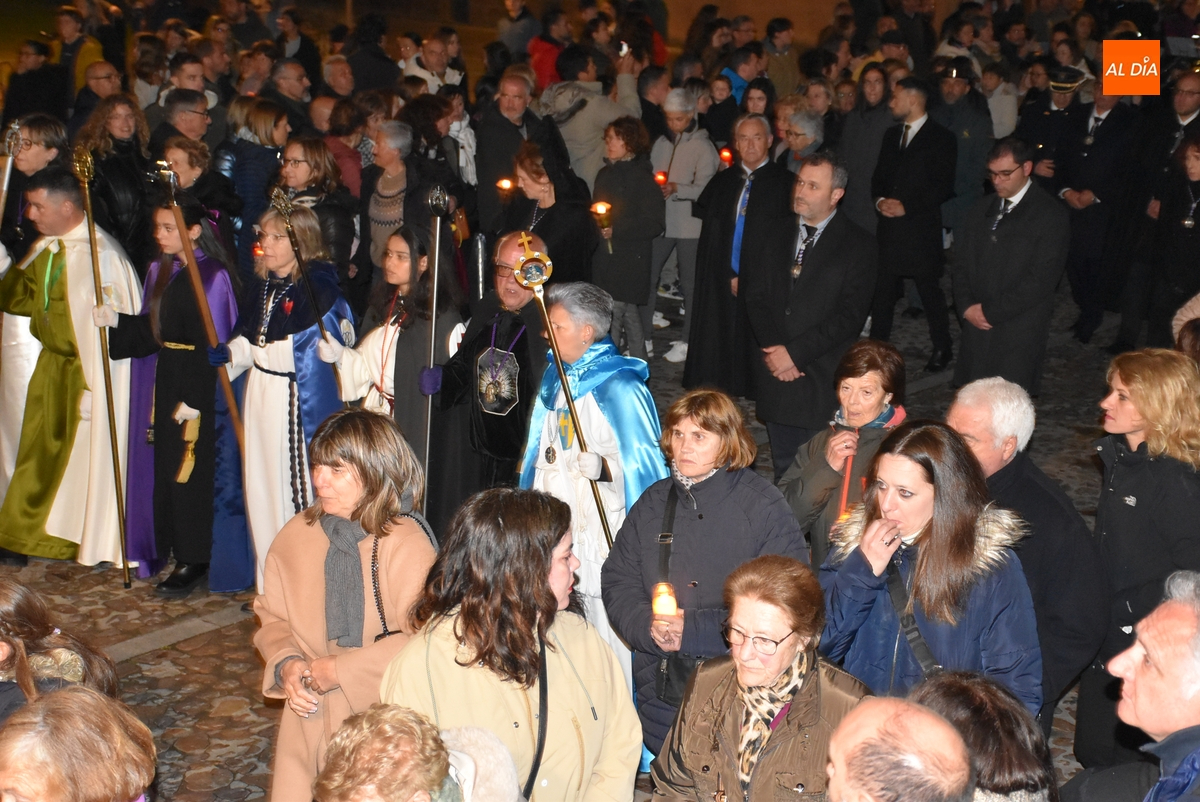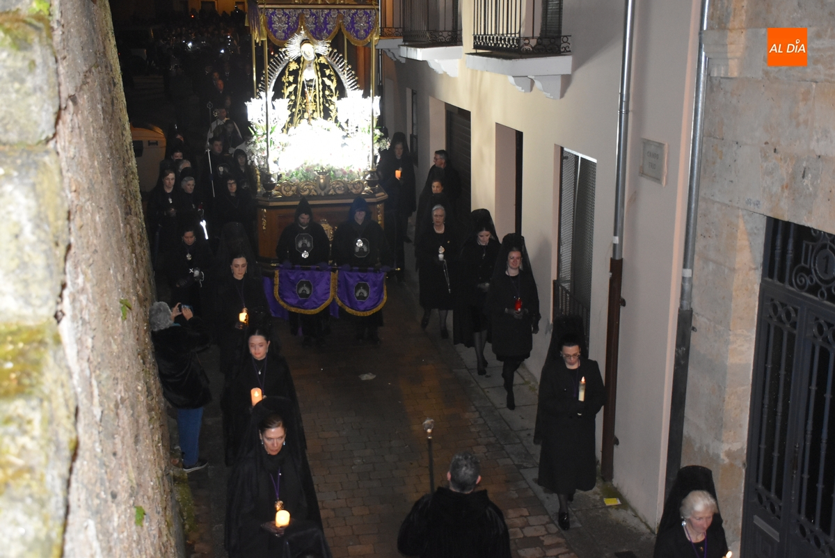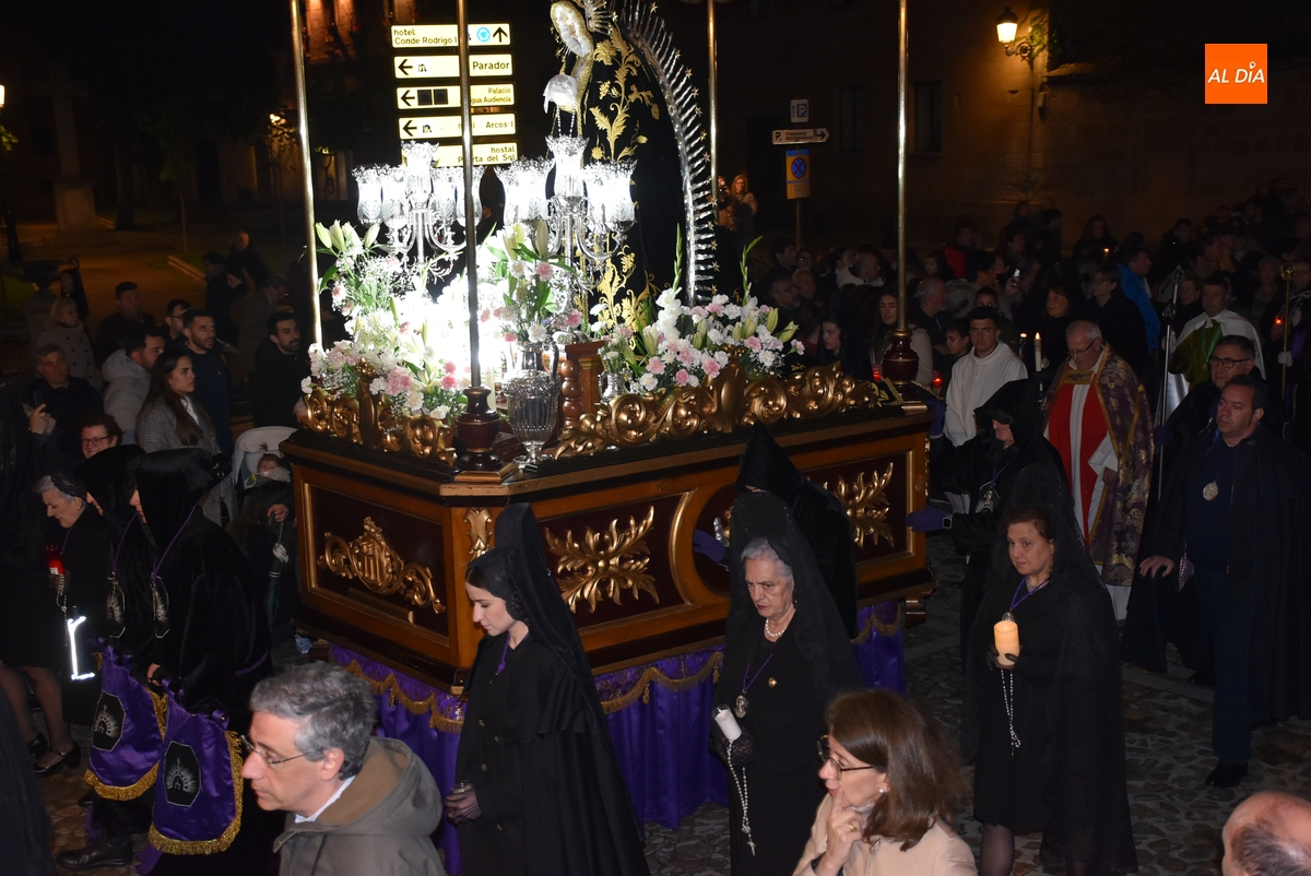 Detrás de la Virgen procesionó el capellán de La Soledad, Ángel Martín Carballo, junto al presidente de la Cofradía, Tomás Domínguez Cid, y un monaguillo; y tras ellos, representantes de las restantes cofradías de la Semana Santa Mirobrigense (excepto La Cruz), la Corporación Municipal, el Capitán de la Guardia Civil en Ciudad Rodrigo, Pablo Javier Ruiz Gatell de Gordejuela; y el Jefe de la Policía Local, Narciso Caridad. La Banda Municipal de Música cerró la comitiva, aunque en algunos momentos tras los músicos también marcharon cofrades.