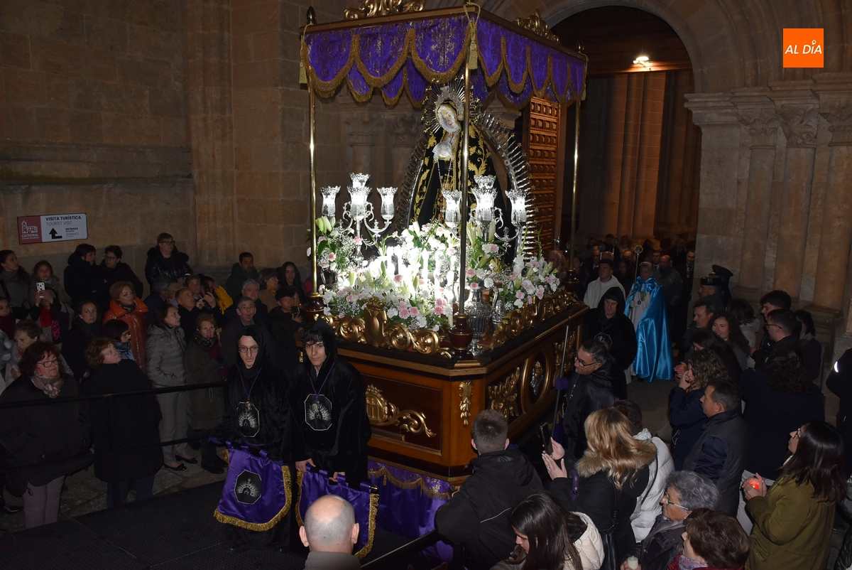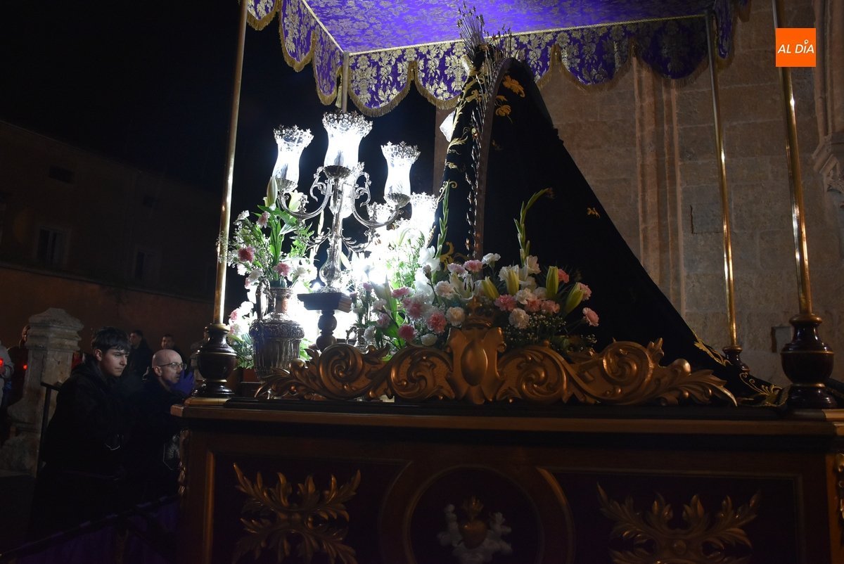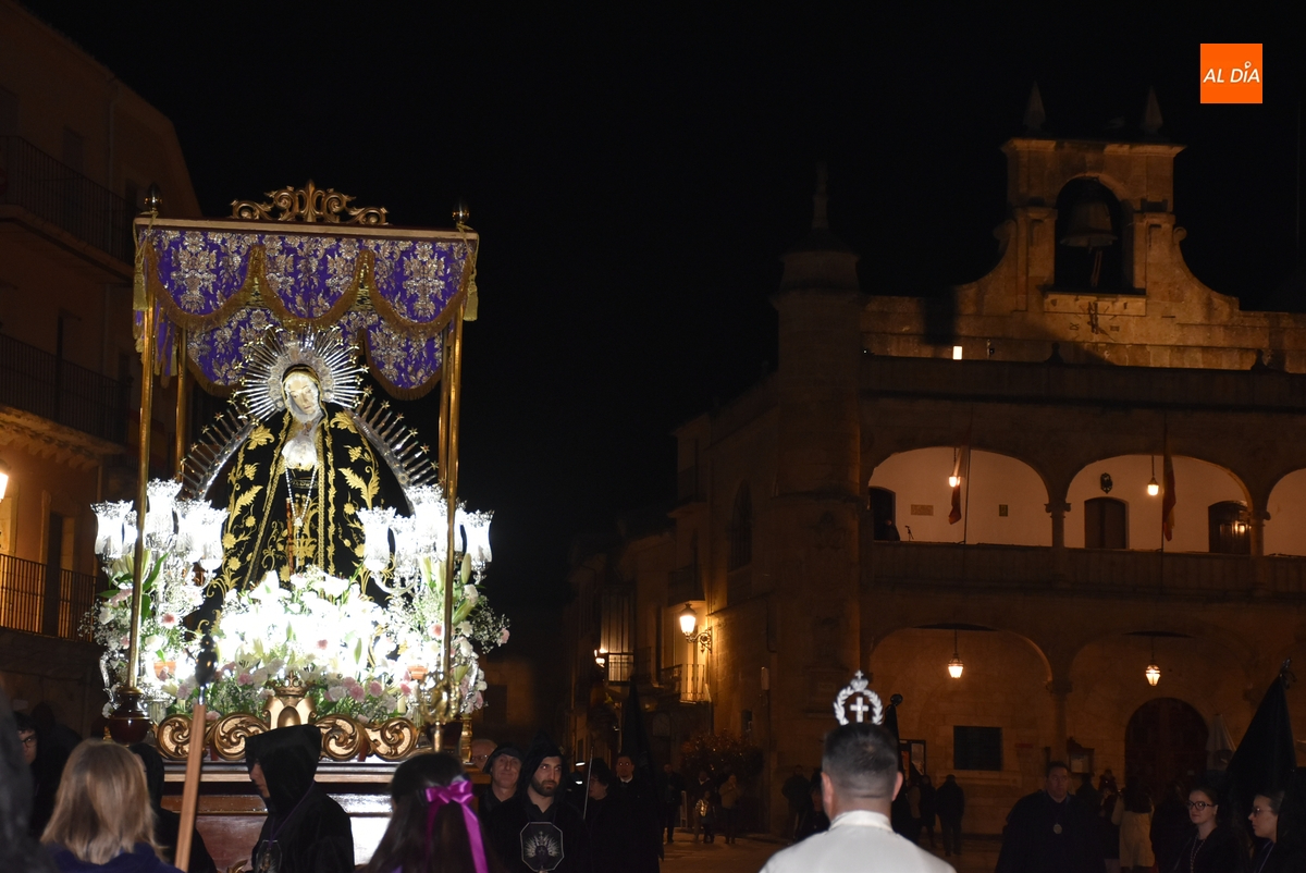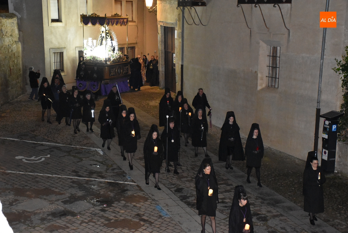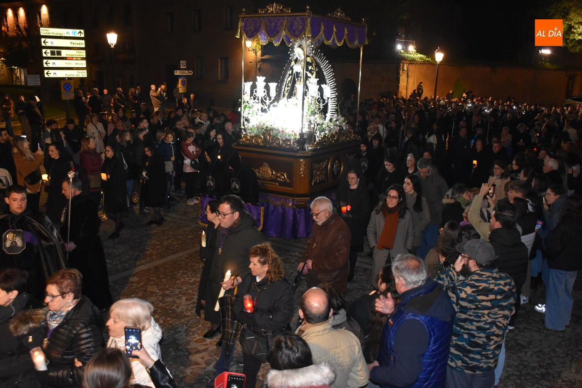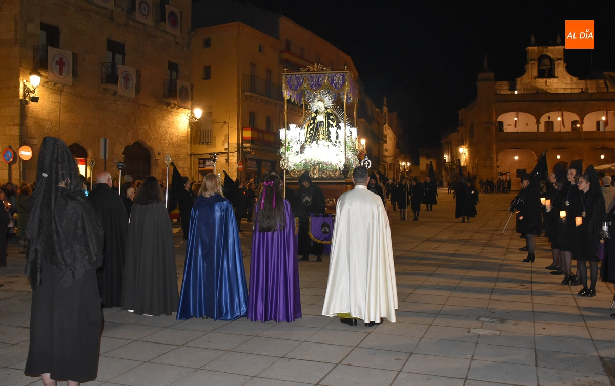 Detrás de la Virgen procesionó el capellán de La Soledad, Ángel Martín Carballo, junto al presidente de la Cofradía, Tomás Domínguez Cid, y un monaguillo; y tras ellos, representantes de las restantes cofradías de la Semana Santa Mirobrigense (excepto La Cruz), la Corporación Municipal, el Capitán de la Guardia Civil en Ciudad Rodrigo, Pablo Javier Ruiz Gatell de Gordejuela; y el Jefe de la Policía Local, Narciso Caridad. La Banda Municipal de Música cerró la comitiva, aunque en algunos momentos tras los músicos también marcharon cofrades.