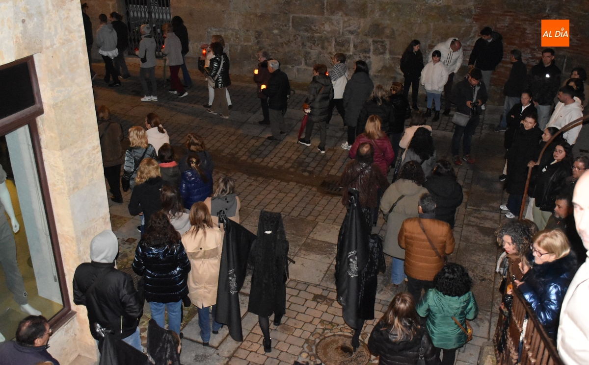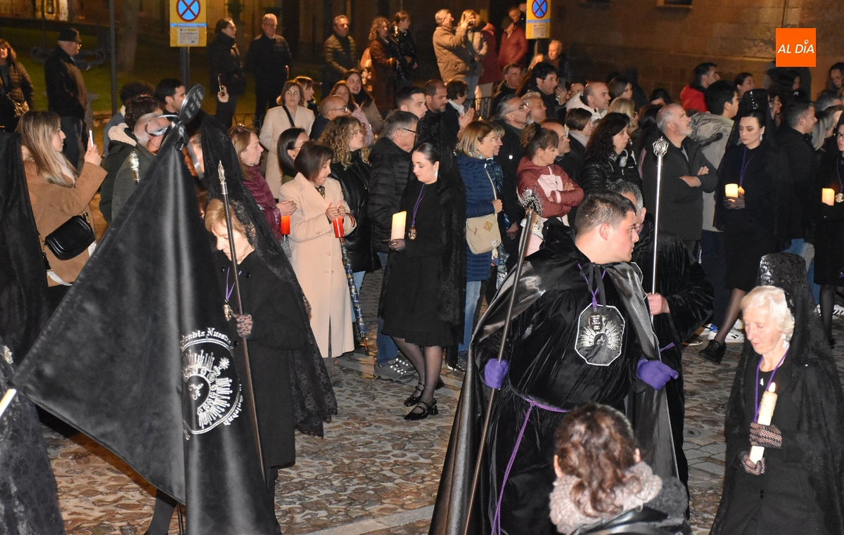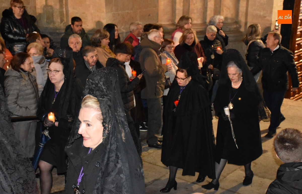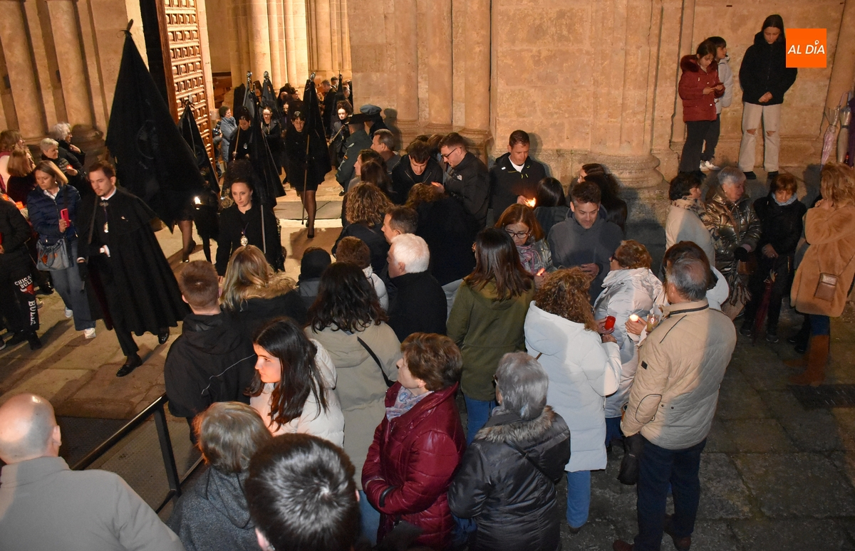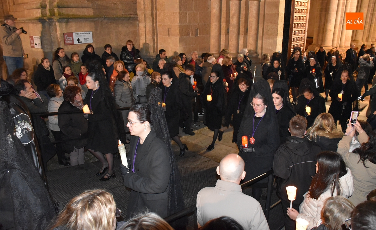 Al salir en esta dirección (y no estar el público tan repartido), se pudo apreciar de lleno la espectacular cantidad de gente que había congregada a las puertas de la Catedral para seguir el arranque de La Soledad, que contó con la compañía de unas 25 cofrades con mantilla, que fueron detrás de las banderas de luto de la Cofradía, conformando dos filas dentro de las cuales fue la imagen de la Virgen. Por fuera de estas dos filas desfilaron todos todos los fieles que decidieron sumarse a la procesión, muchos de ellos con velas.