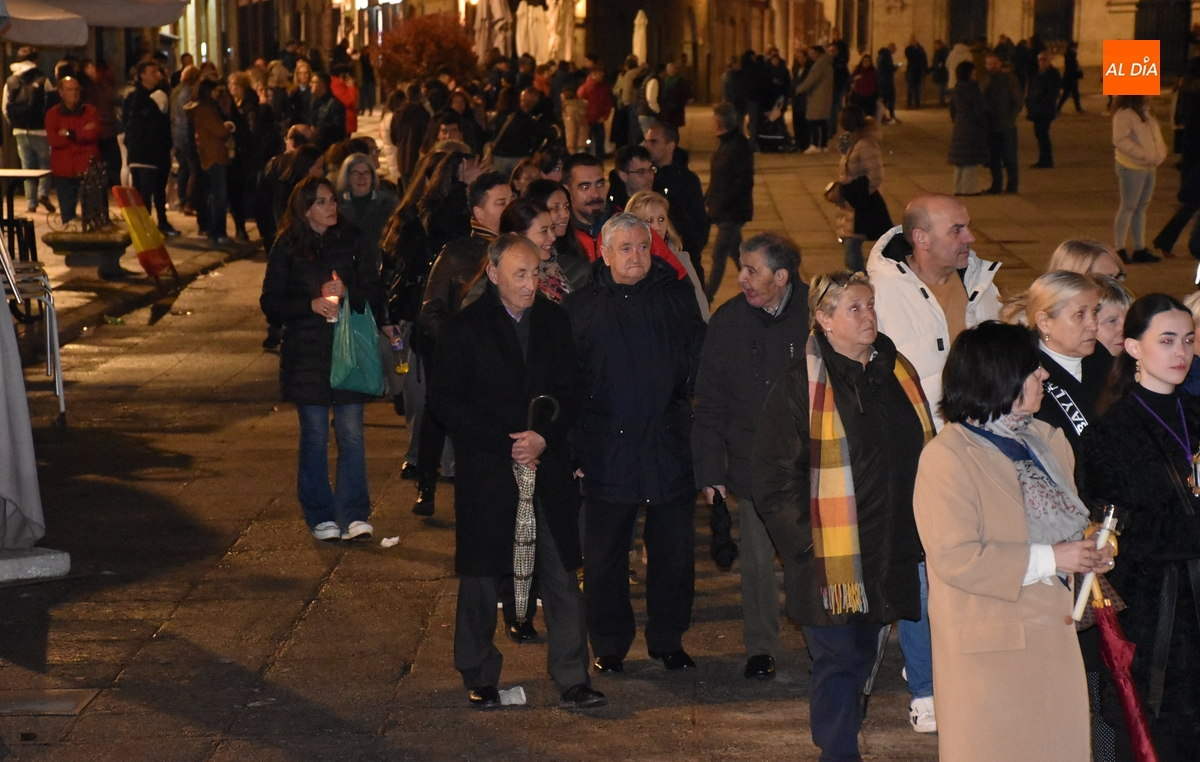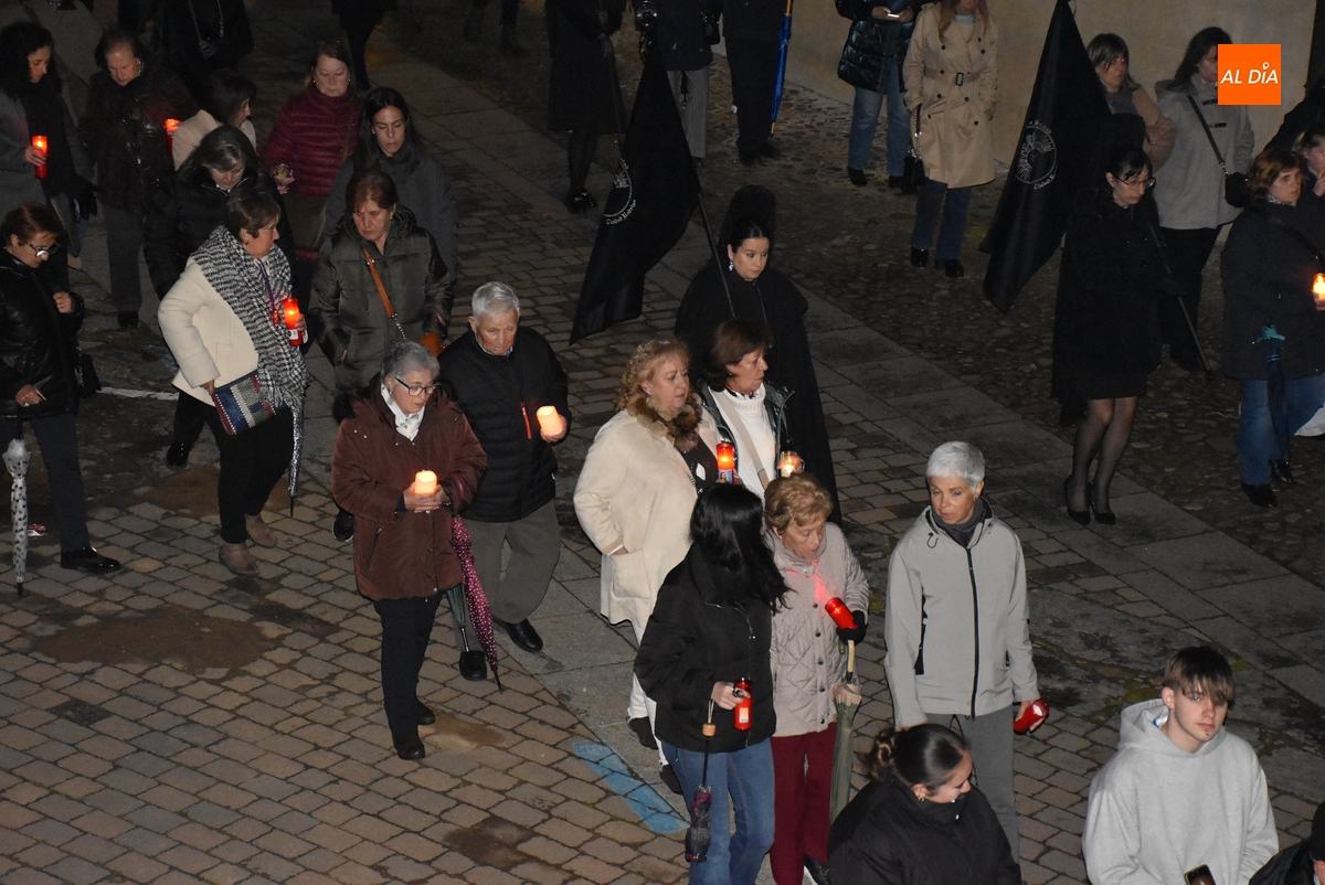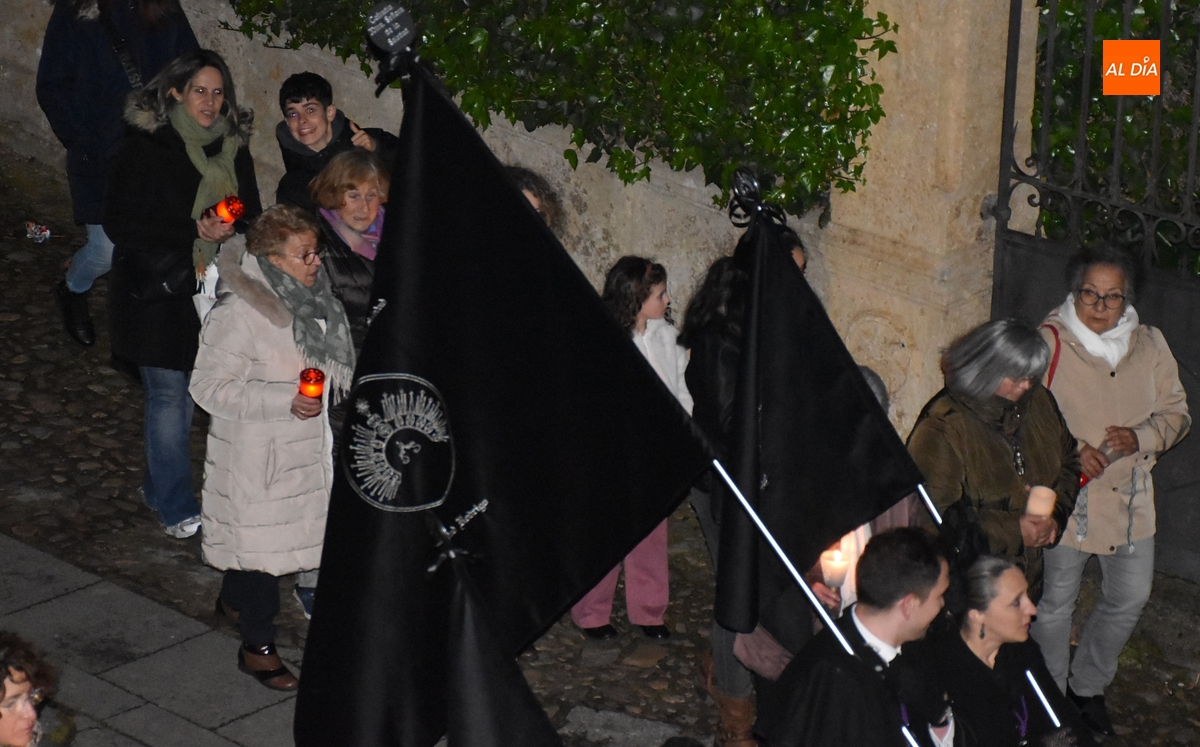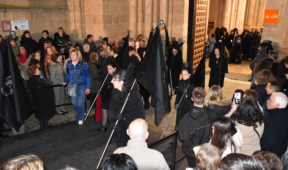Al salir en esta dirección (y no estar el público tan repartido), se pudo apreciar de lleno la espectacular cantidad de gente que había congregada a las puertas de la Catedral para seguir el arranque de La Soledad, que contó con la compañía de unas 25 cofrades con mantilla, que fueron detrás de las banderas de luto de la Cofradía, conformando dos filas dentro de las cuales fue la imagen de la Virgen. Por fuera de estas dos filas desfilaron todos todos los fieles que decidieron sumarse a la procesión, muchos de ellos con velas.